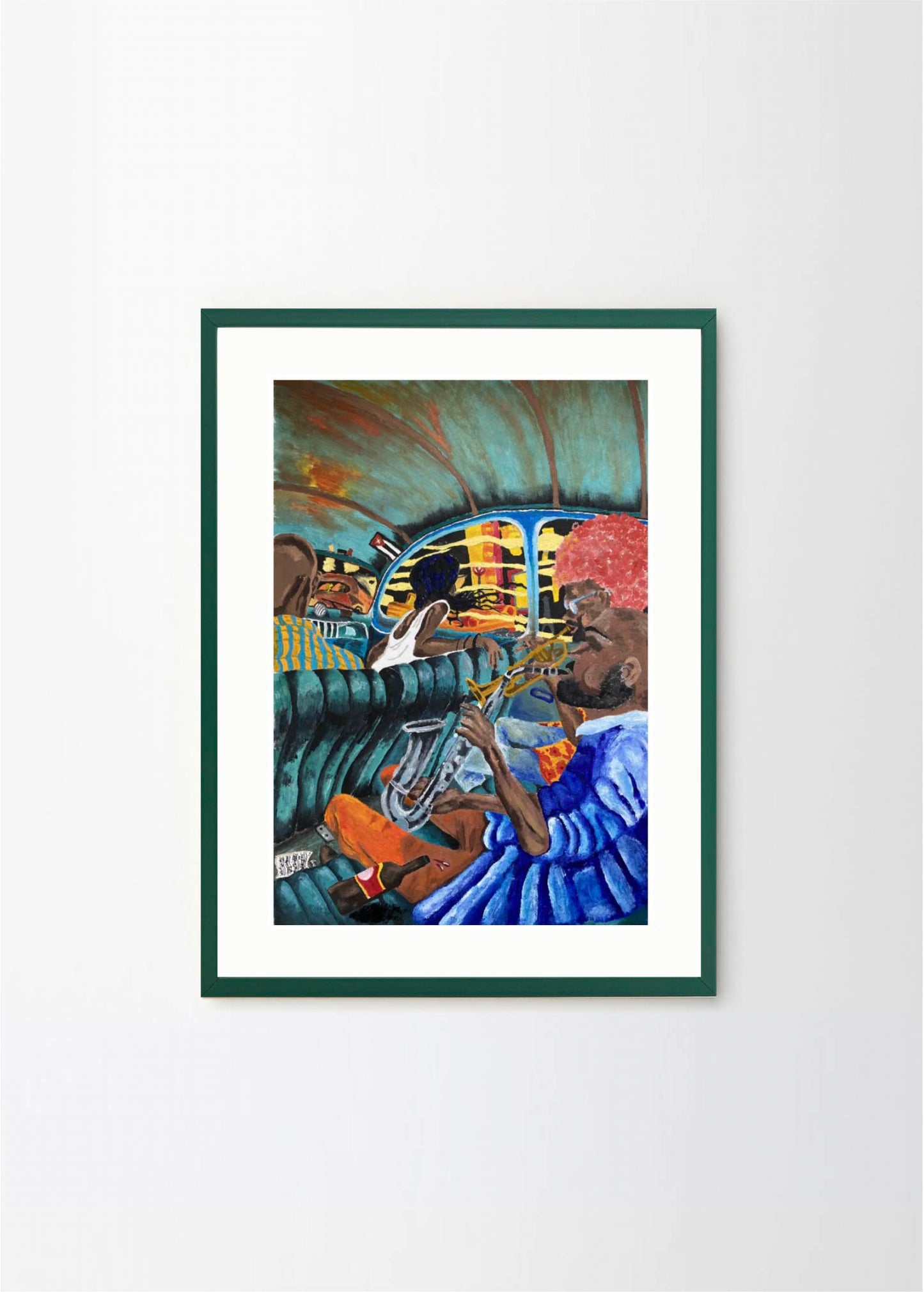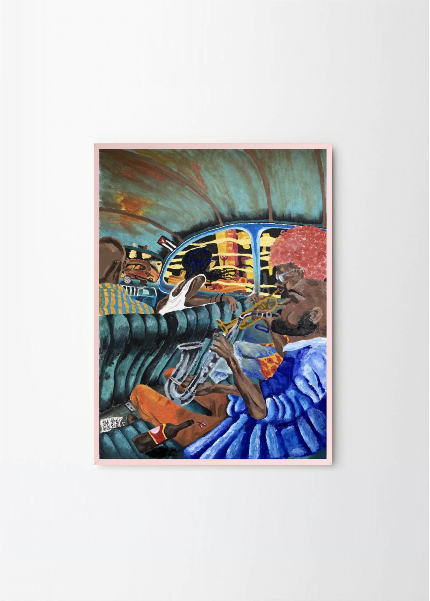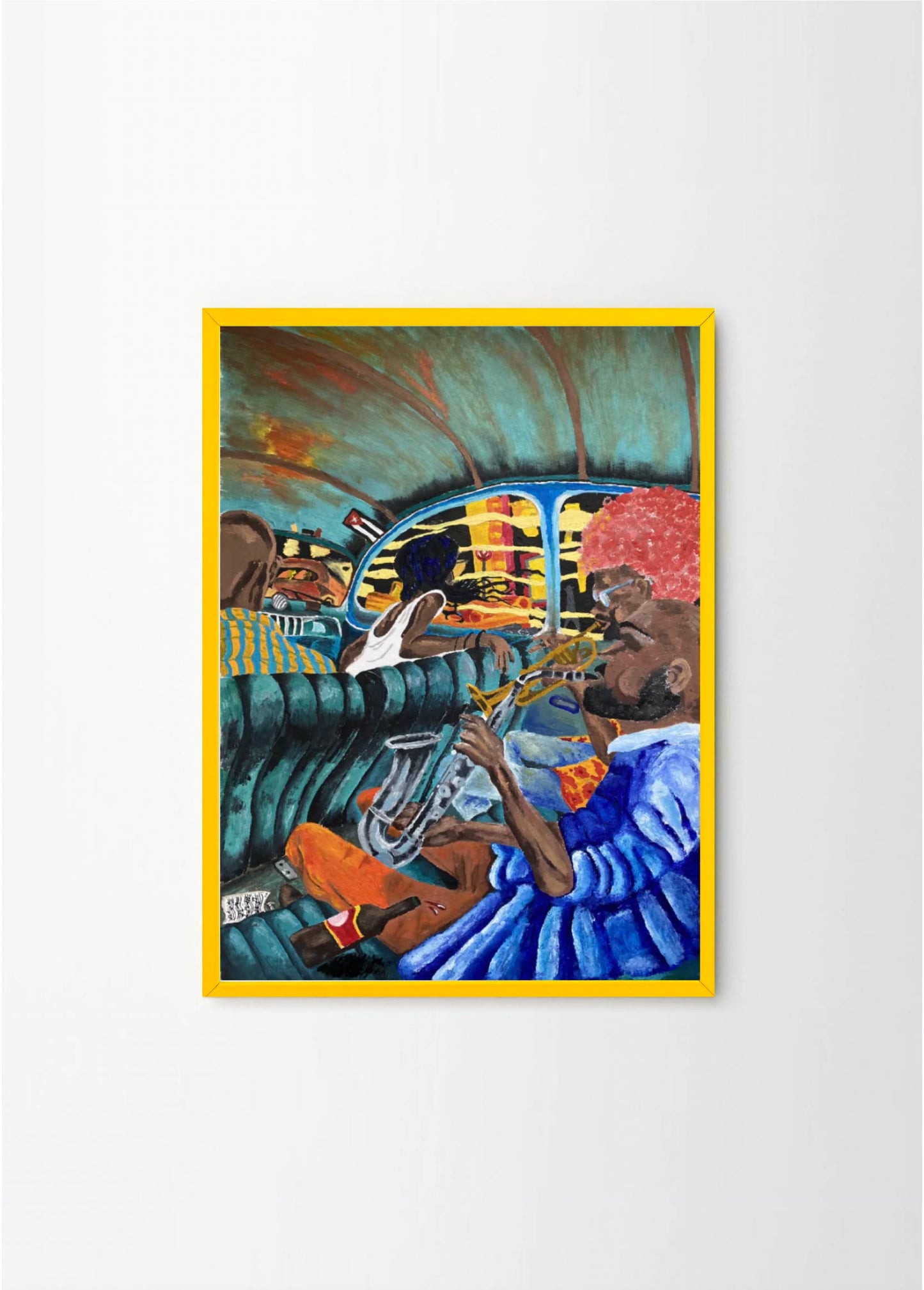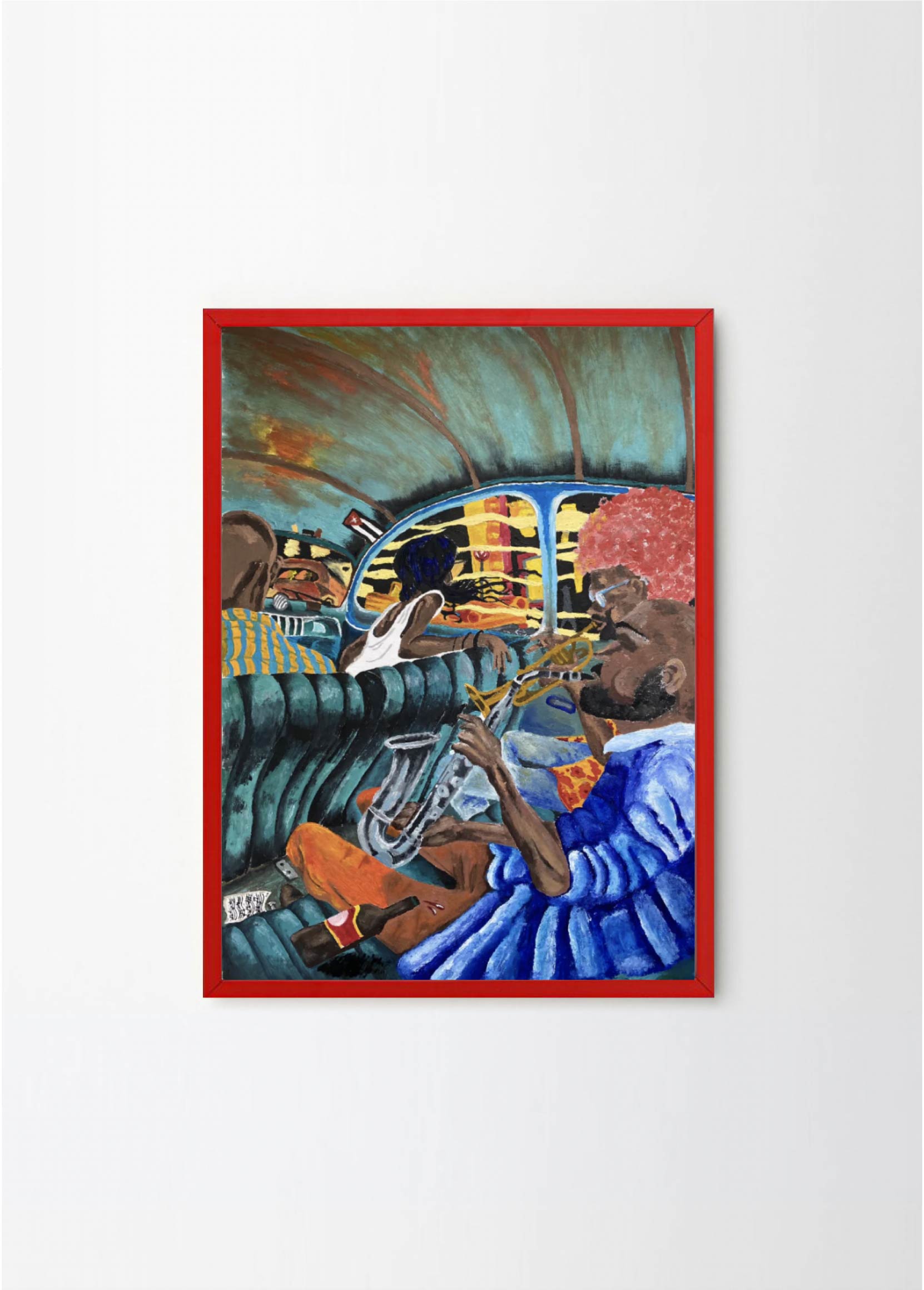 The artwork Jazz Ride by Minja Ajo depicts a blue, red and brown illustration of musicians playing in the back seat of a car.. The colors makes it perfect for a walnut or blue colored frame, with or without passepartout.