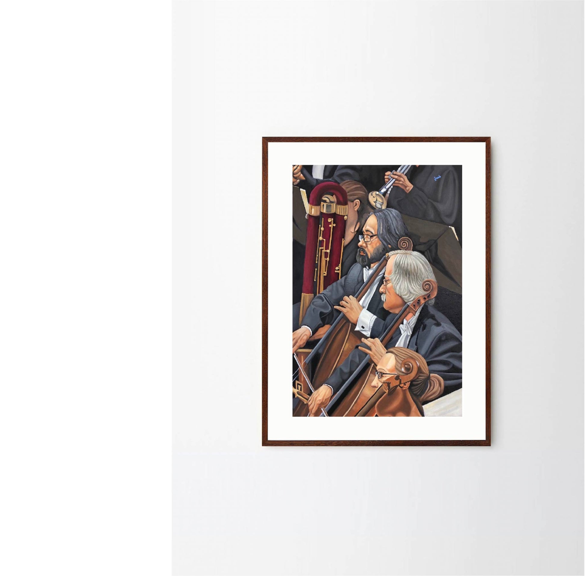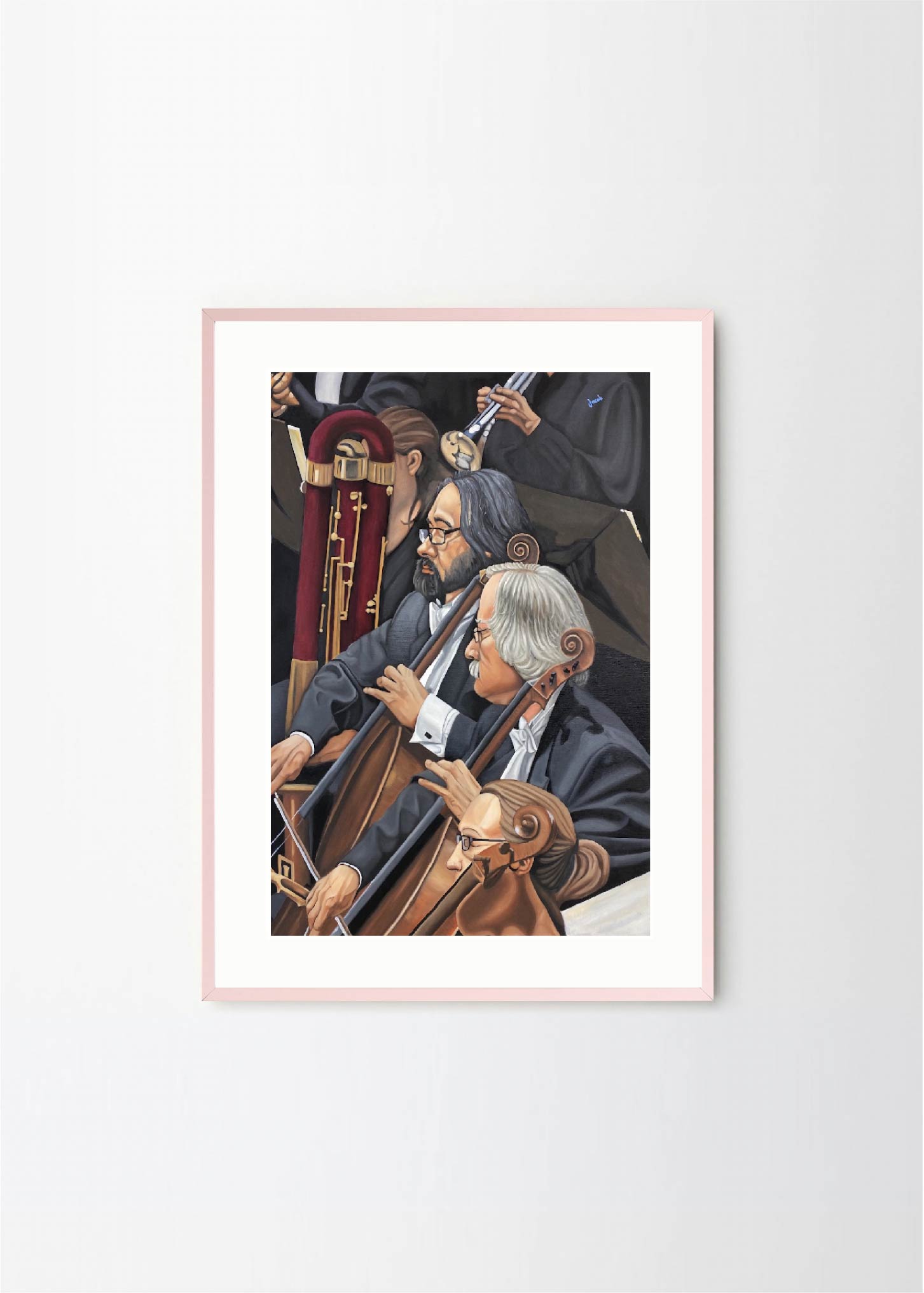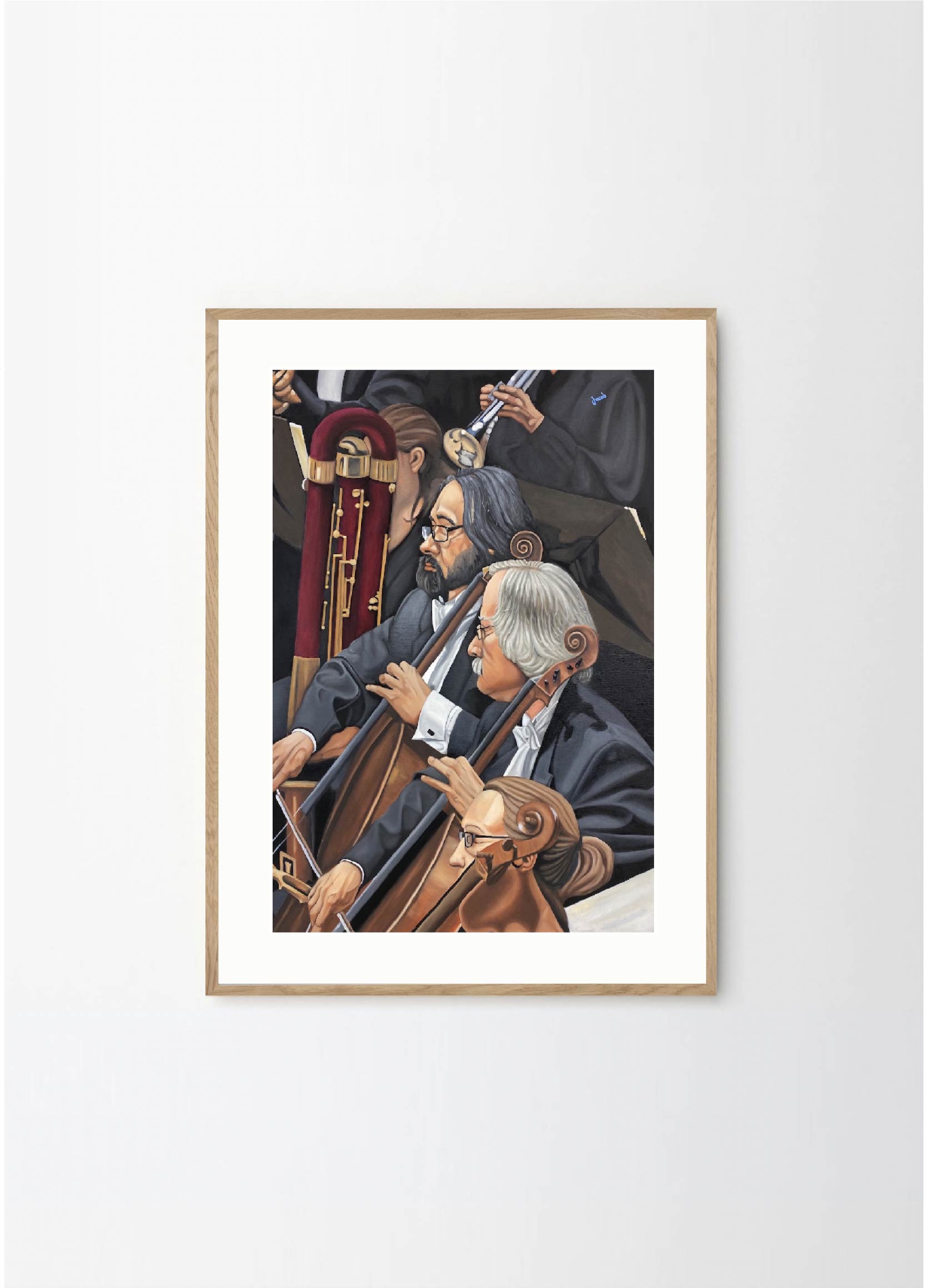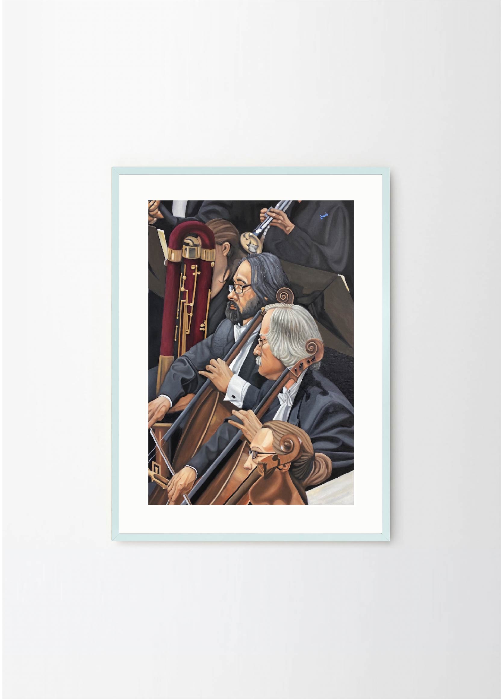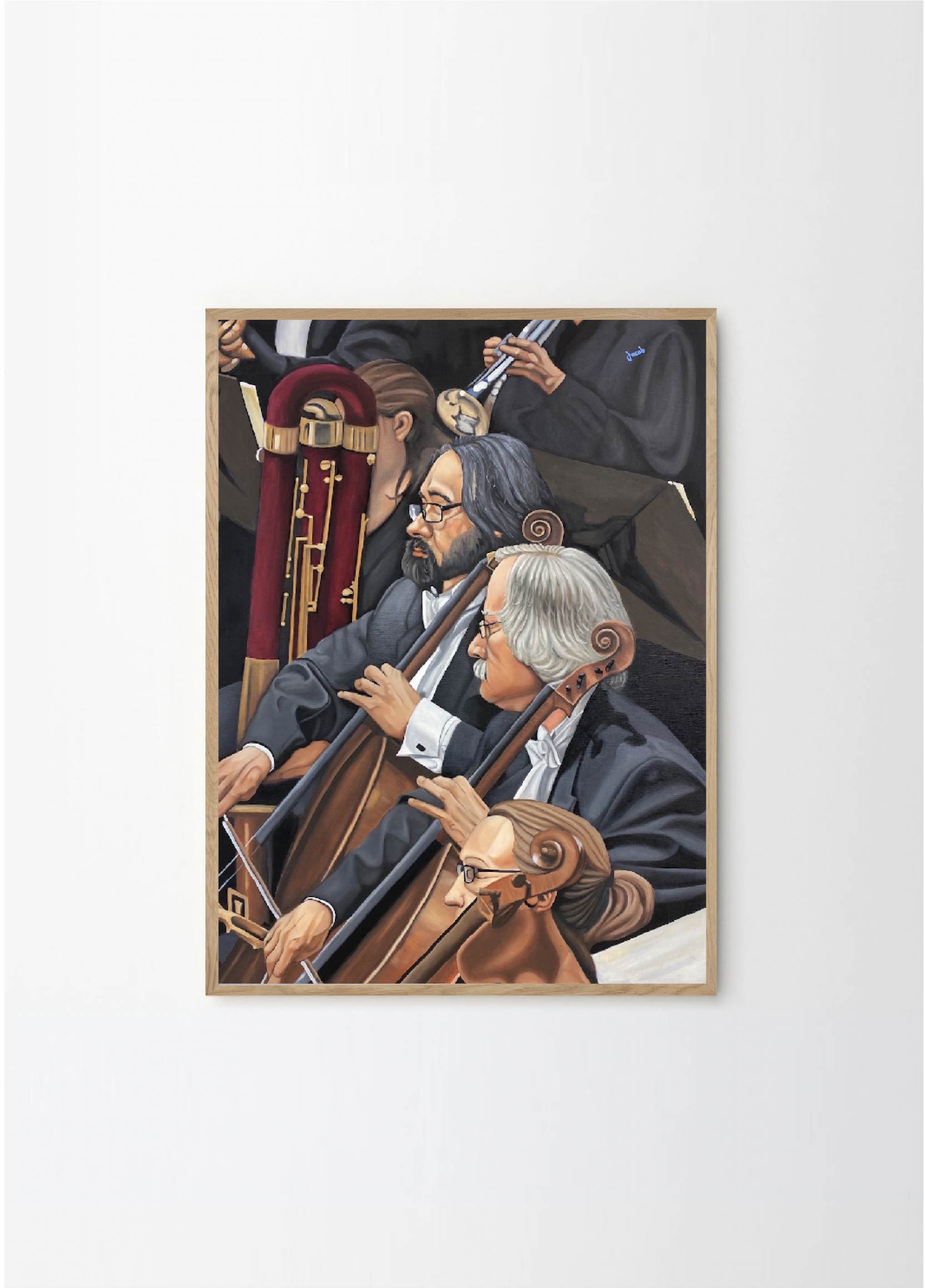The artwork Konsert depicts a group of musicians playing their orchestra. The blue and brown colors make Konsert perfect for a black colored frame, with or without passepartout.