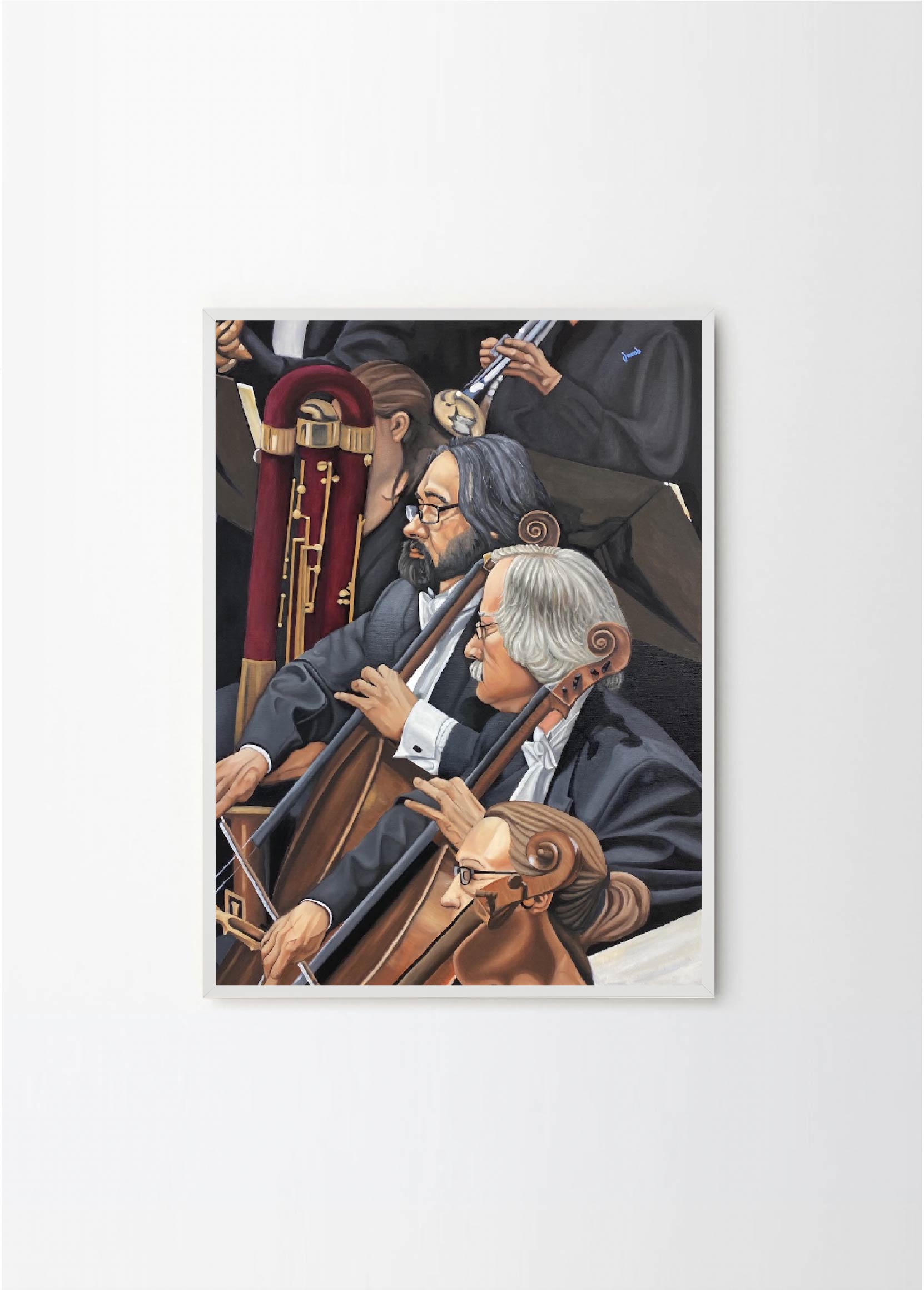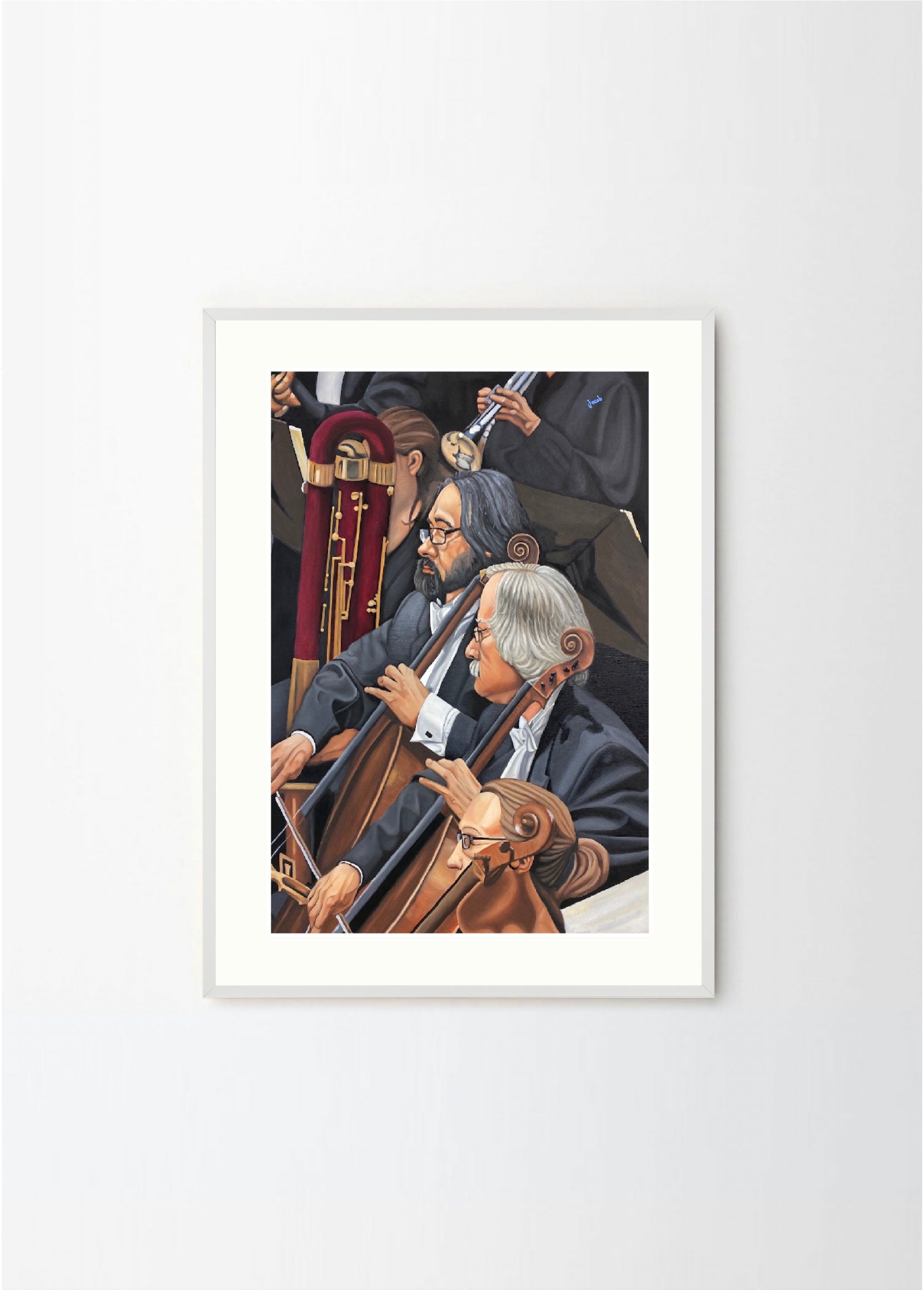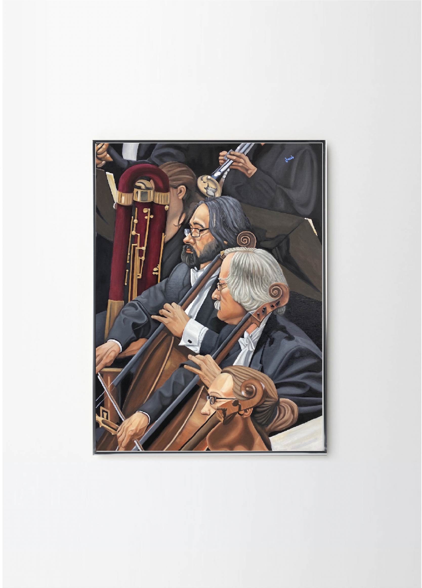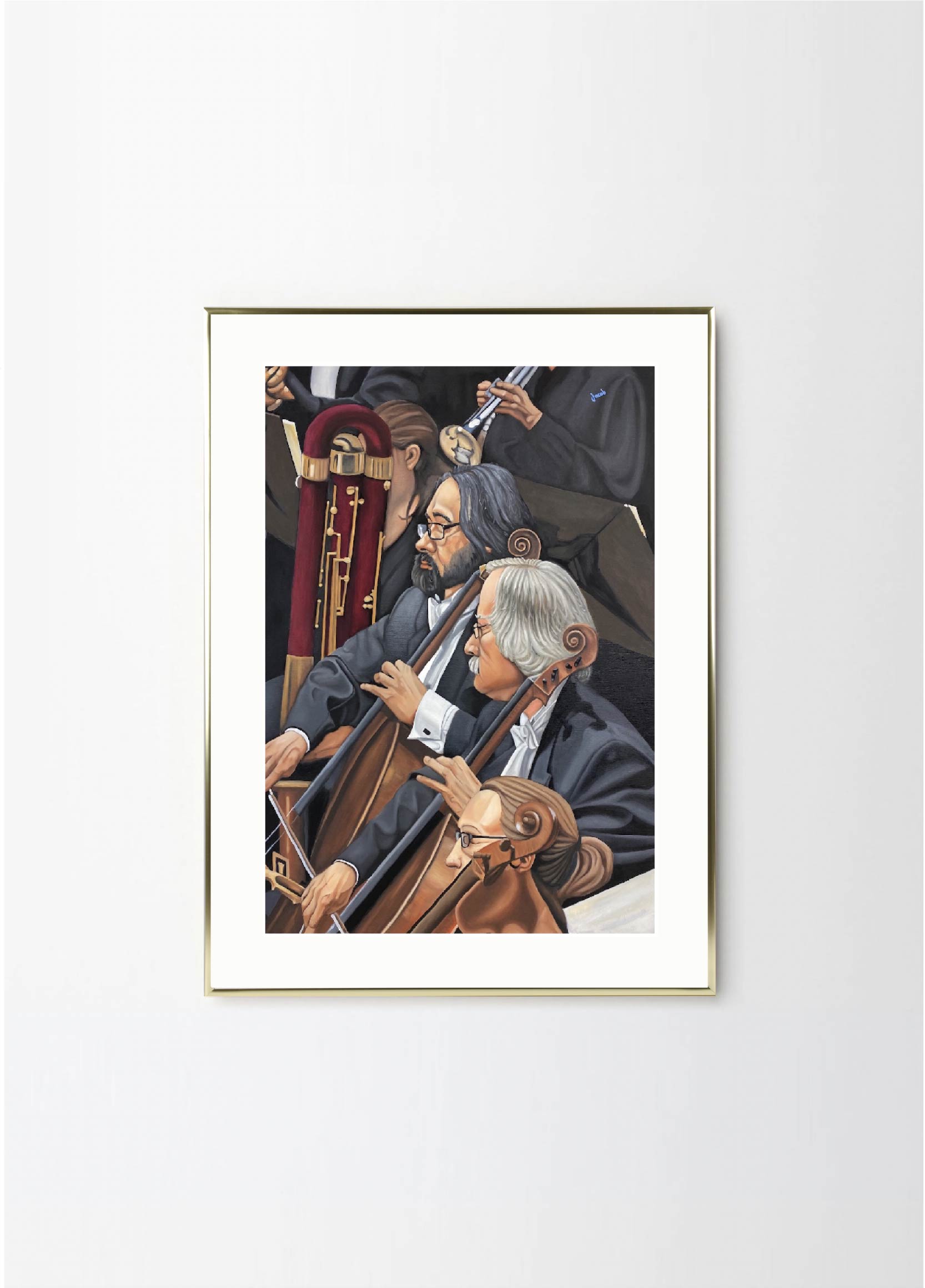 The artwork Konsert depicts a group of musicians playing their orchestra. The blue and brown colors make Konsert perfect for a black colored frame, with or without passepartout.