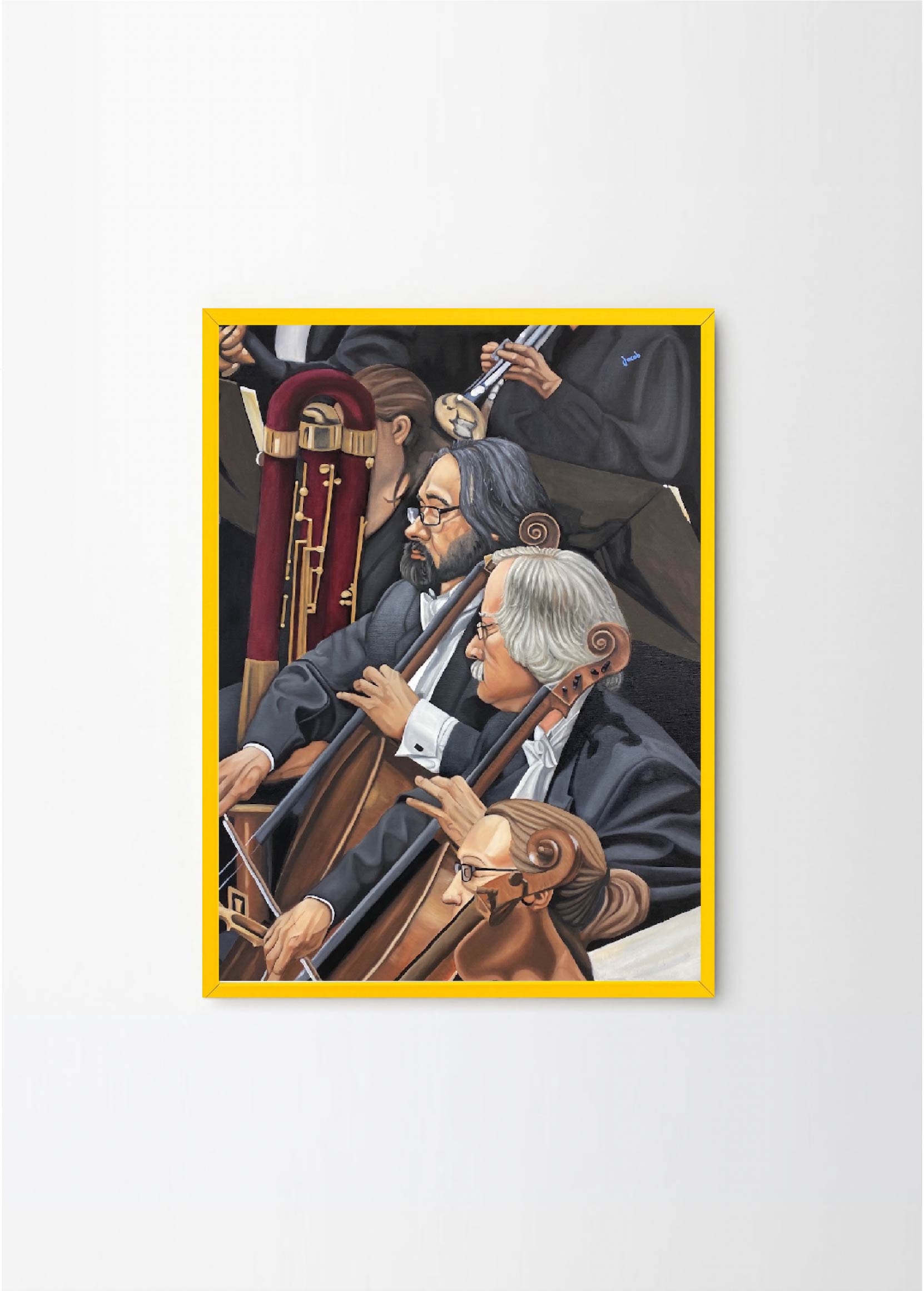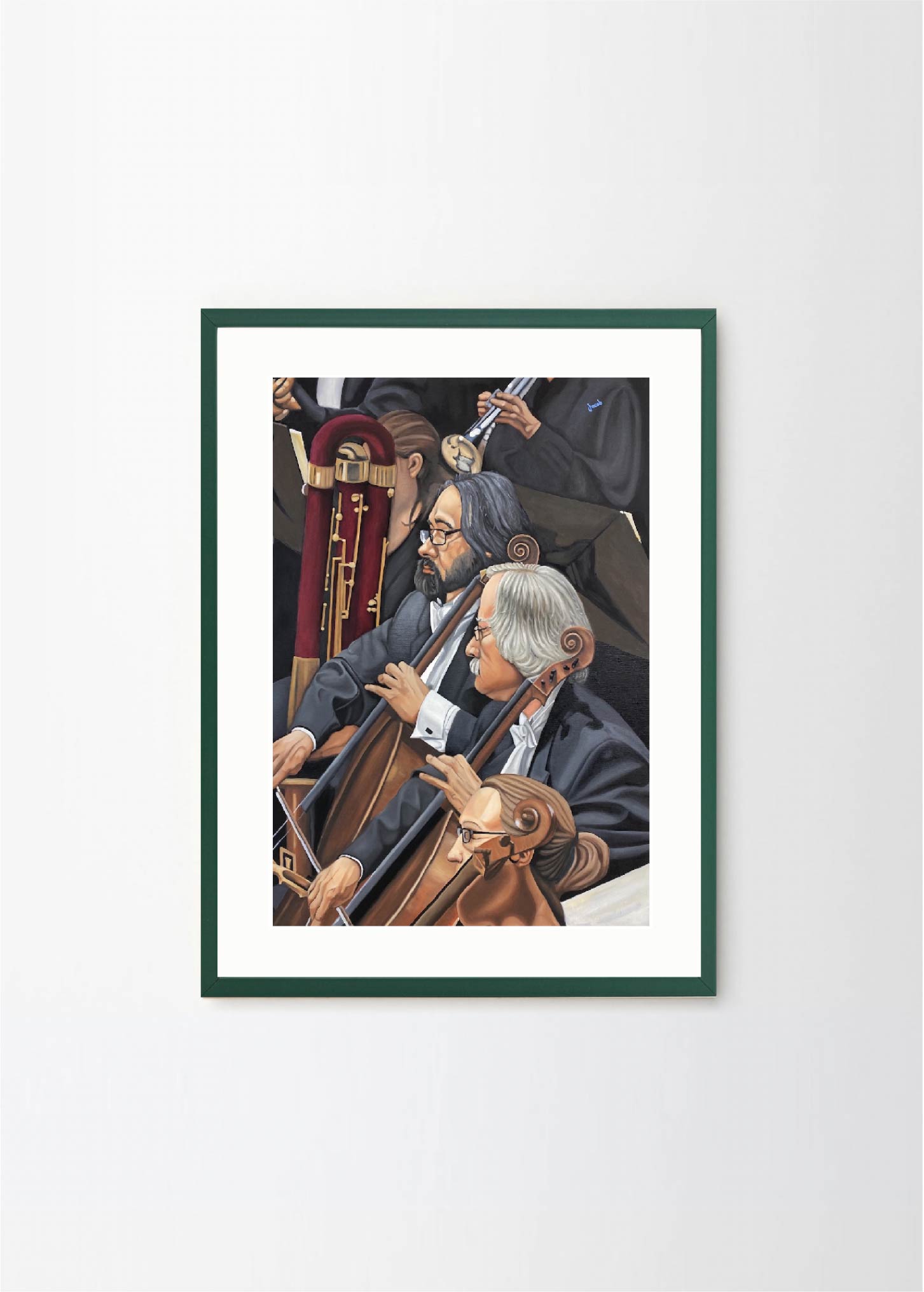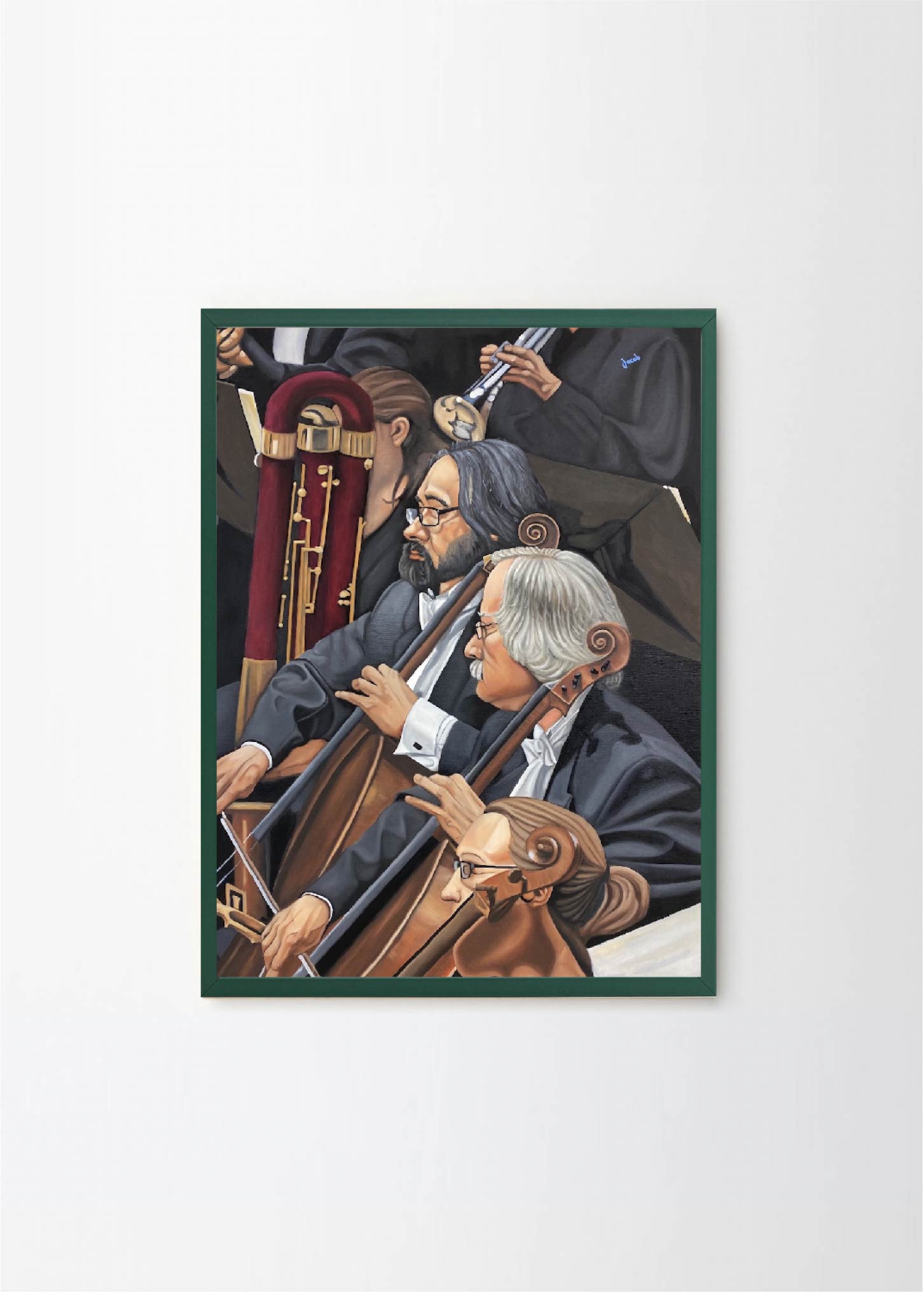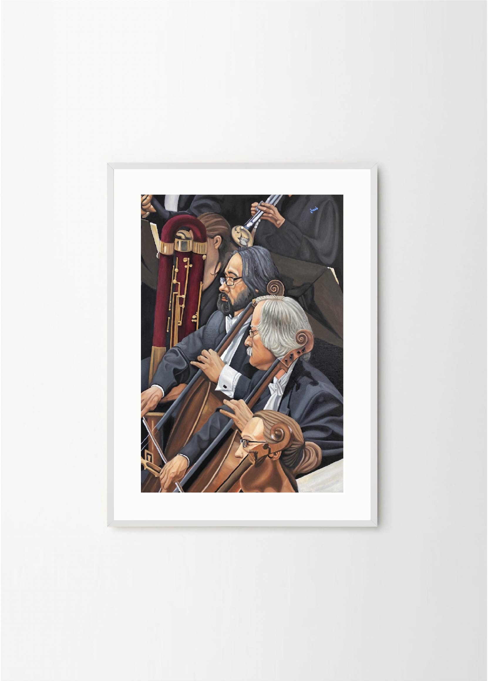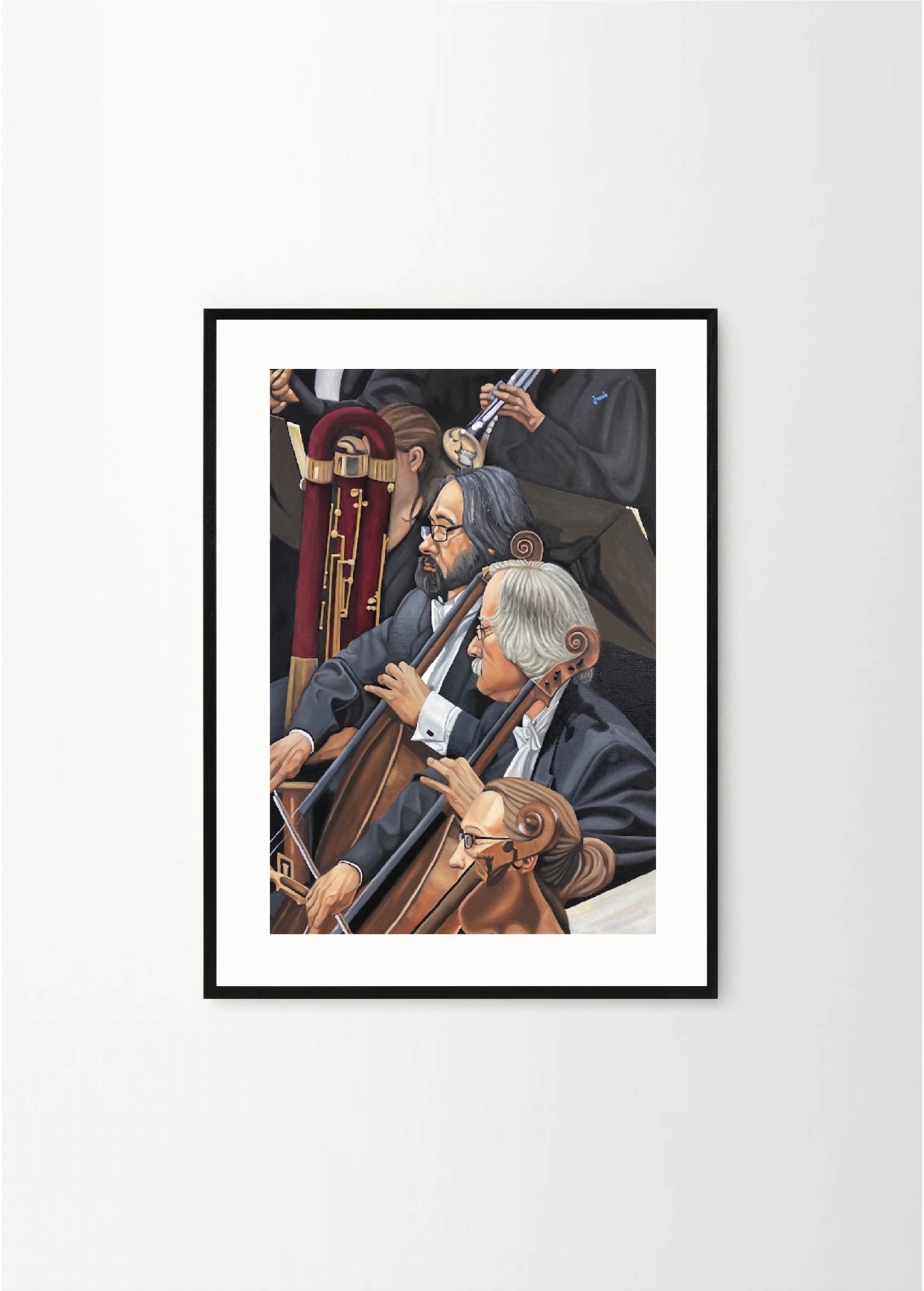 The artwork Konsert depicts a group of musicians playing their orchestra. The blue and brown colors make Konsert perfect for a black colored frame, with or without passepartout.