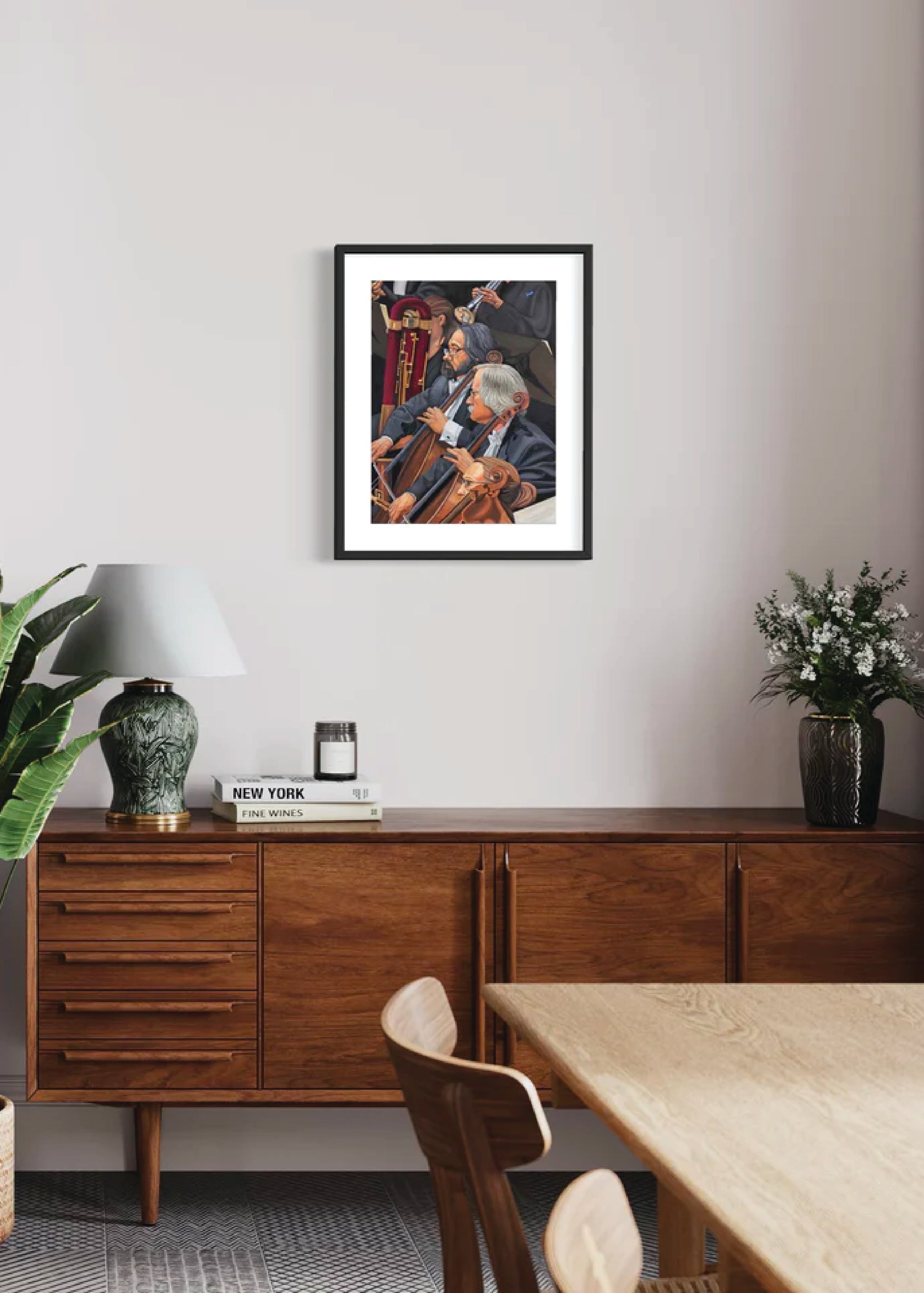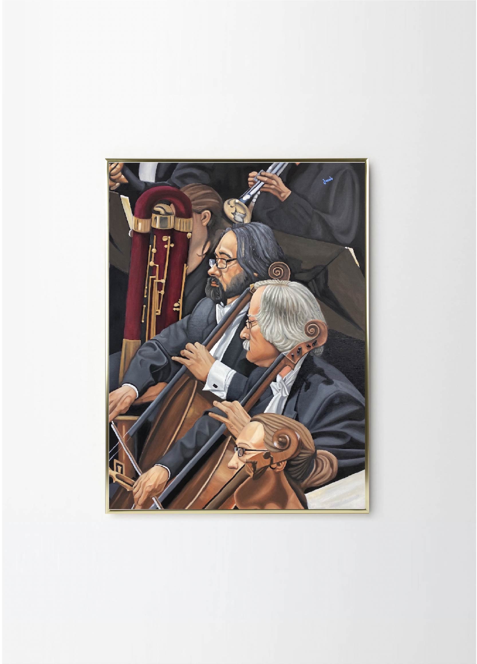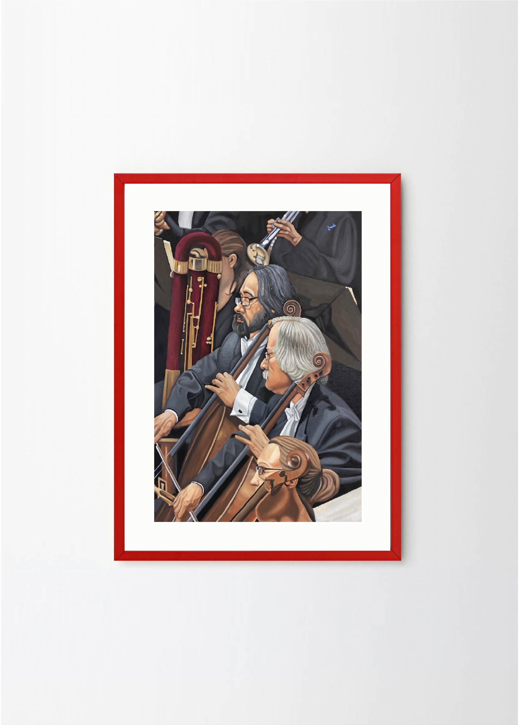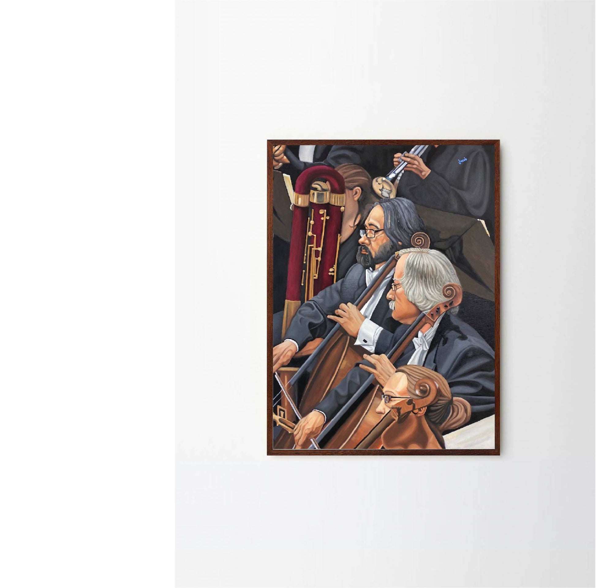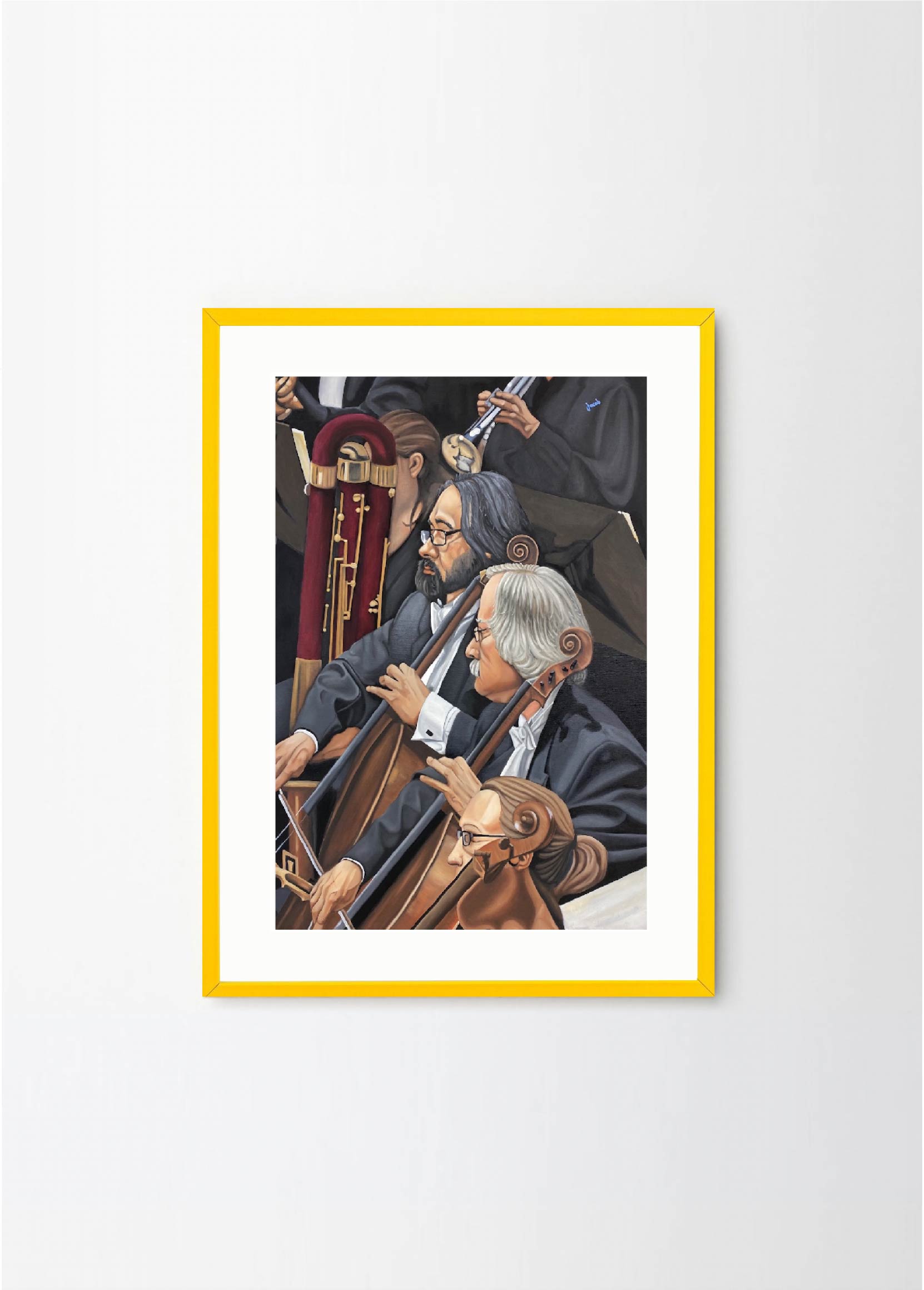 The artwork Konsert depicts a group of musicians playing their orchestra. The blue and brown colors make Konsert perfect for a black colored frame, with or without passepartout.