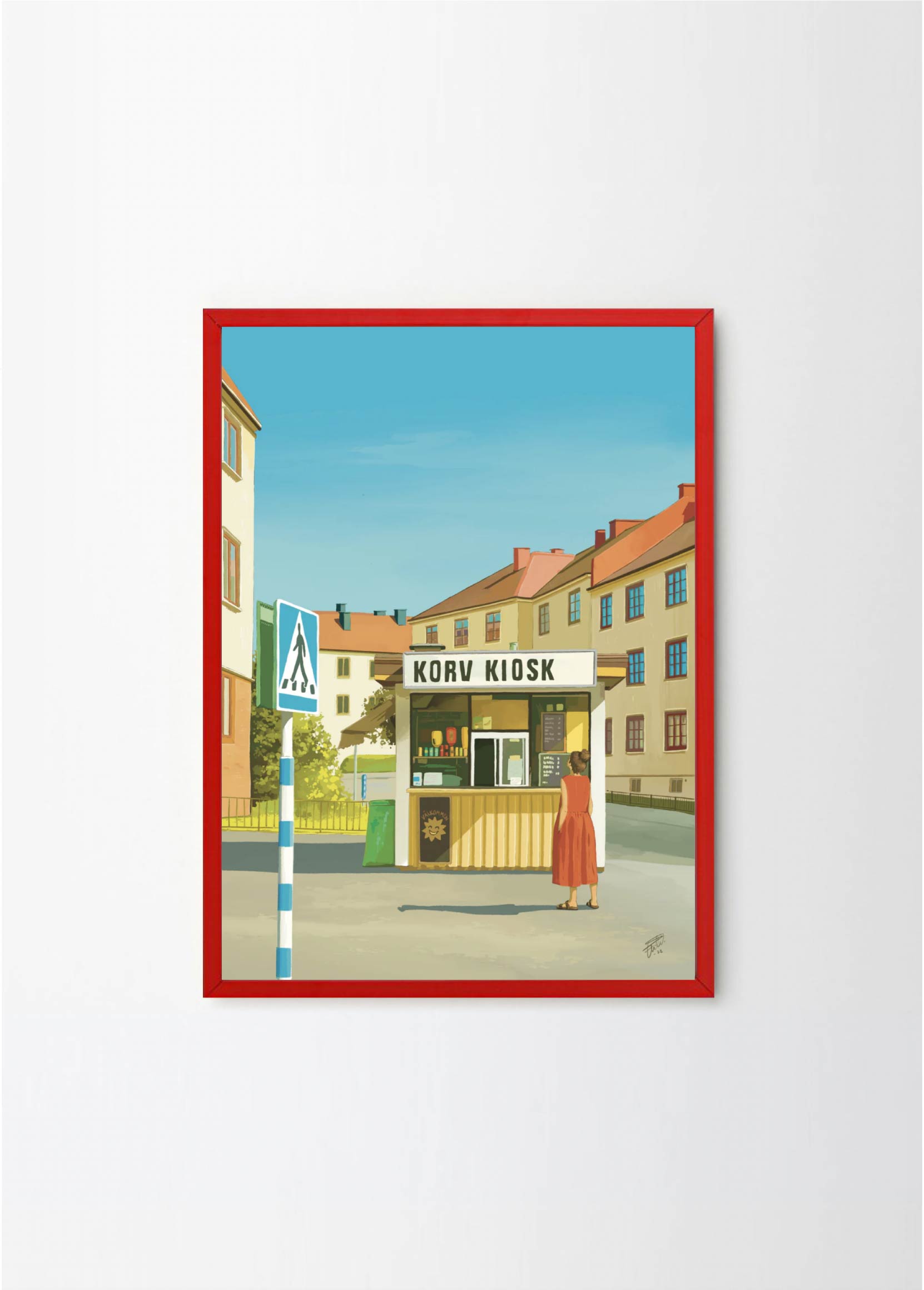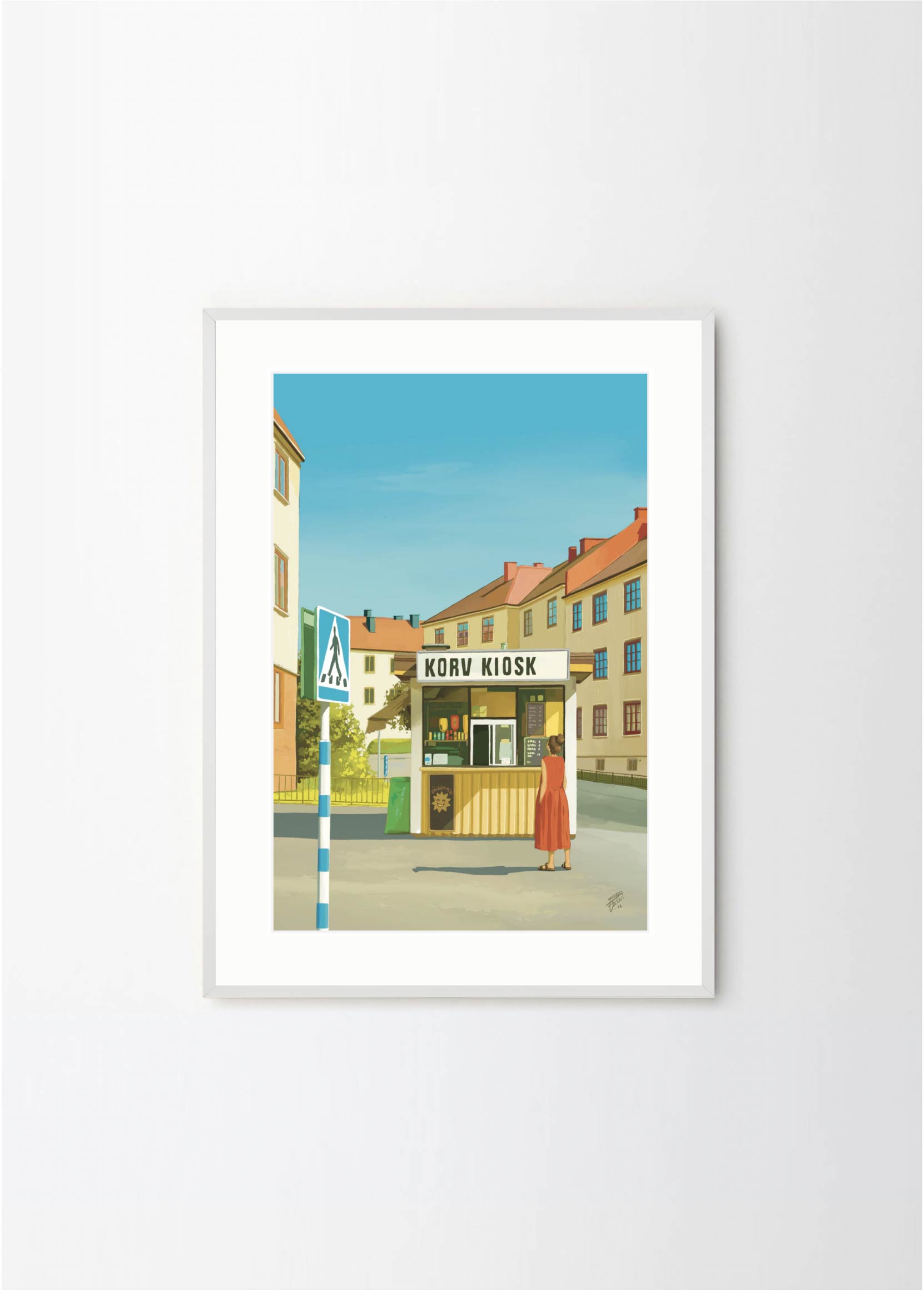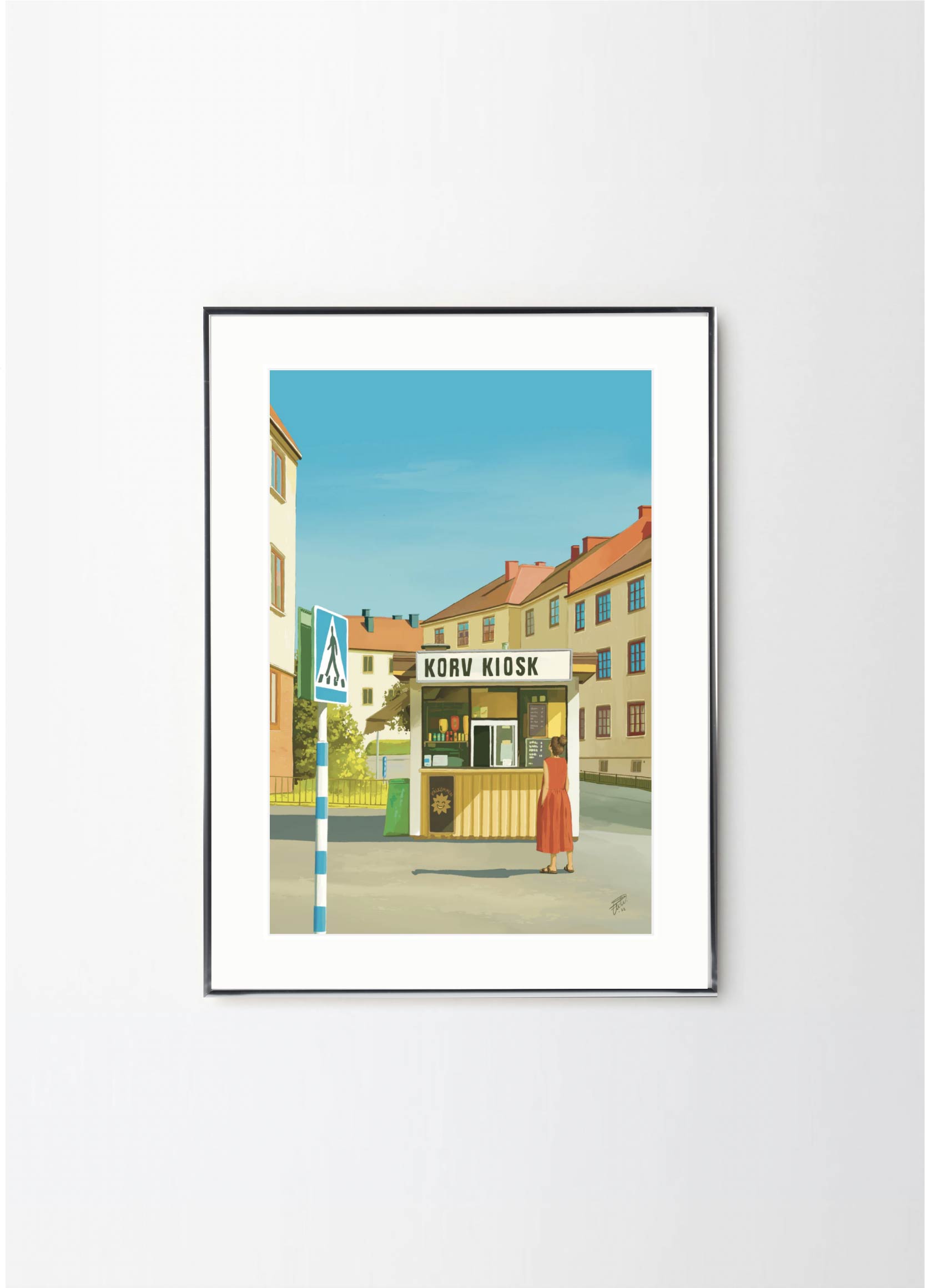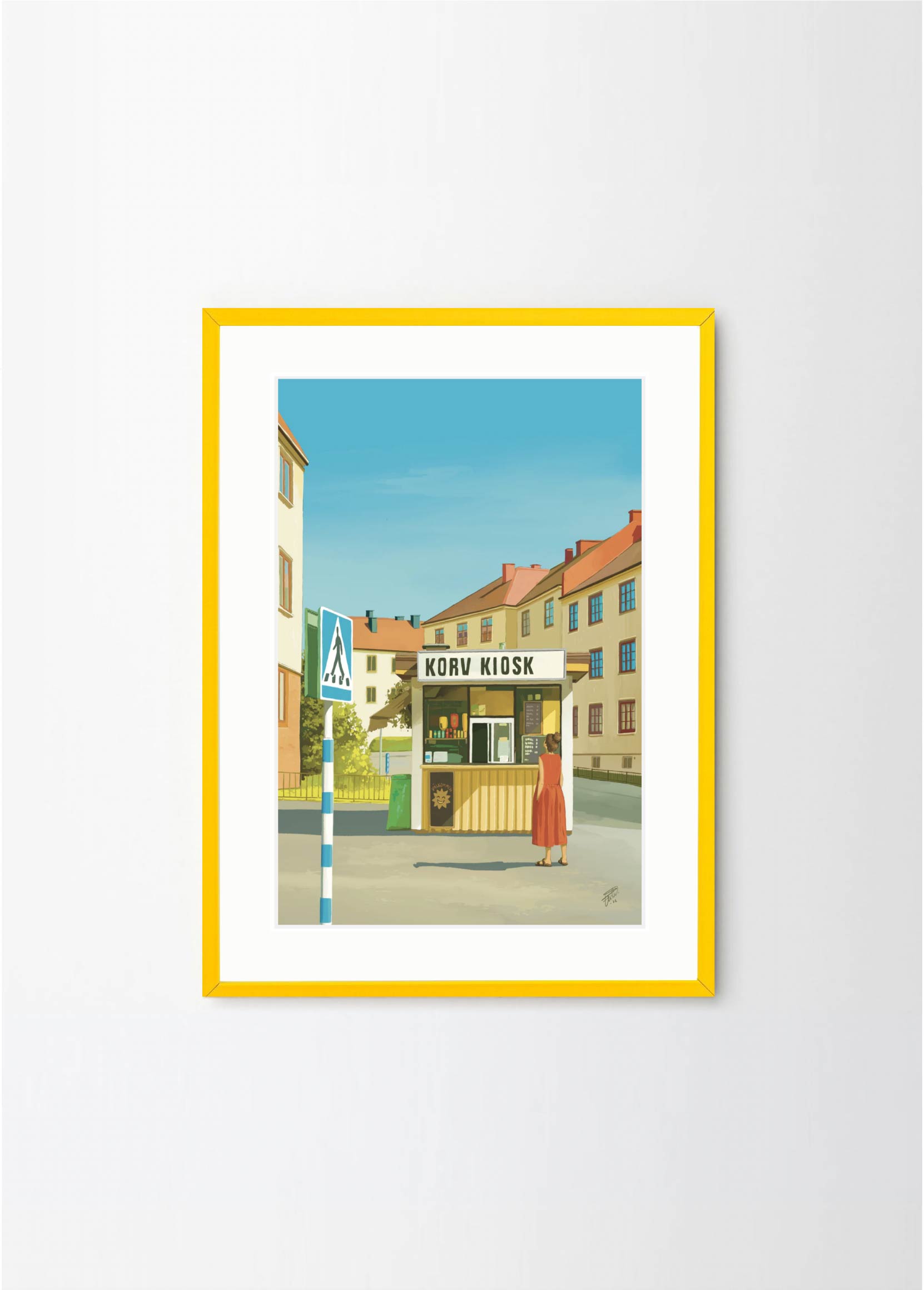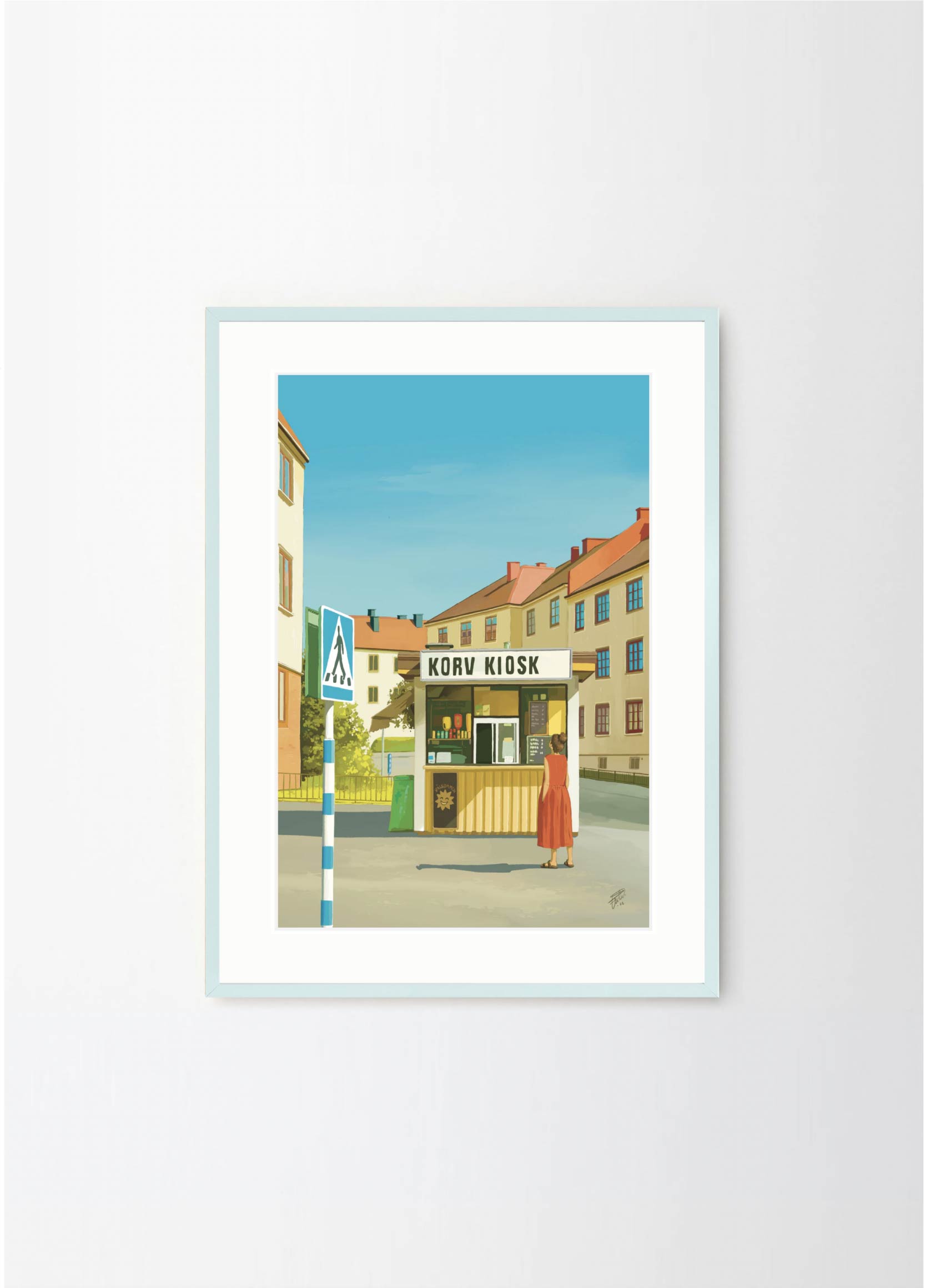 This artwork depicts the classic landmark at Mariaplan in Majorna, Gothenburg. The lovely yellow, red and blue colors makes it perfect for a pink, walnut or purple frame, with or without a passepartout.