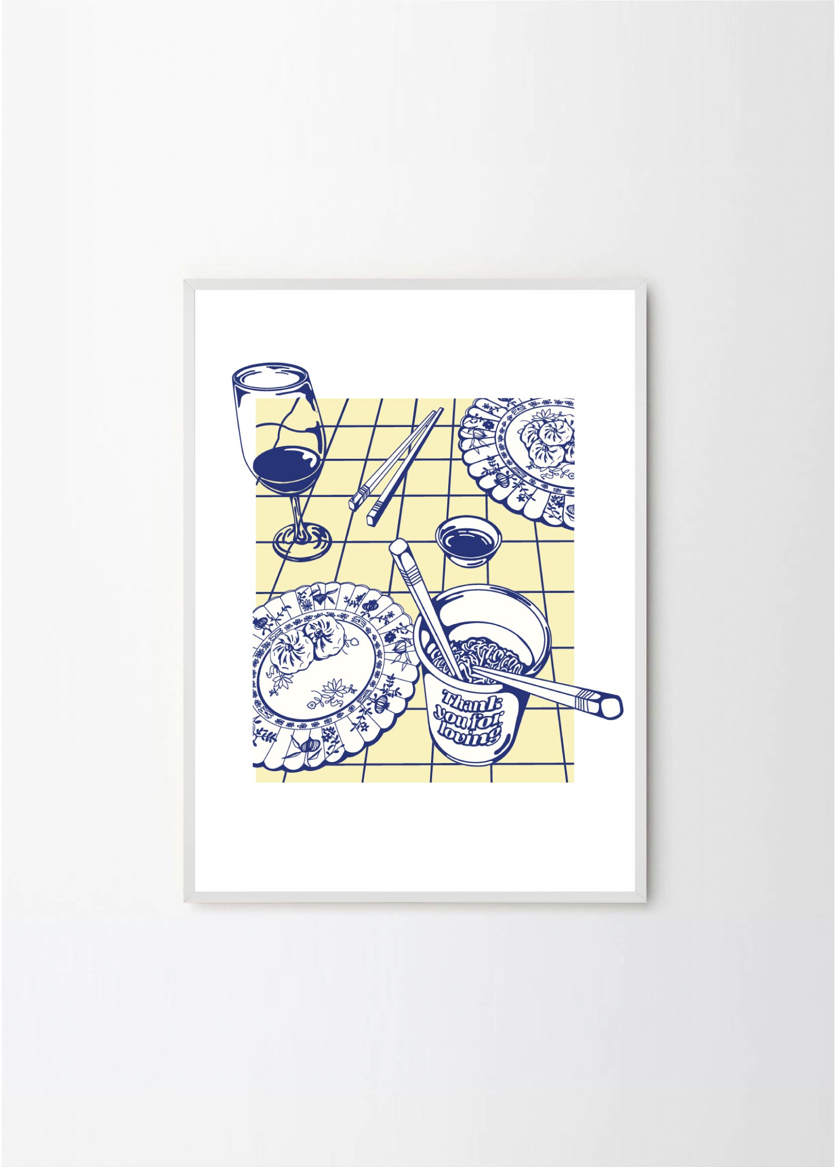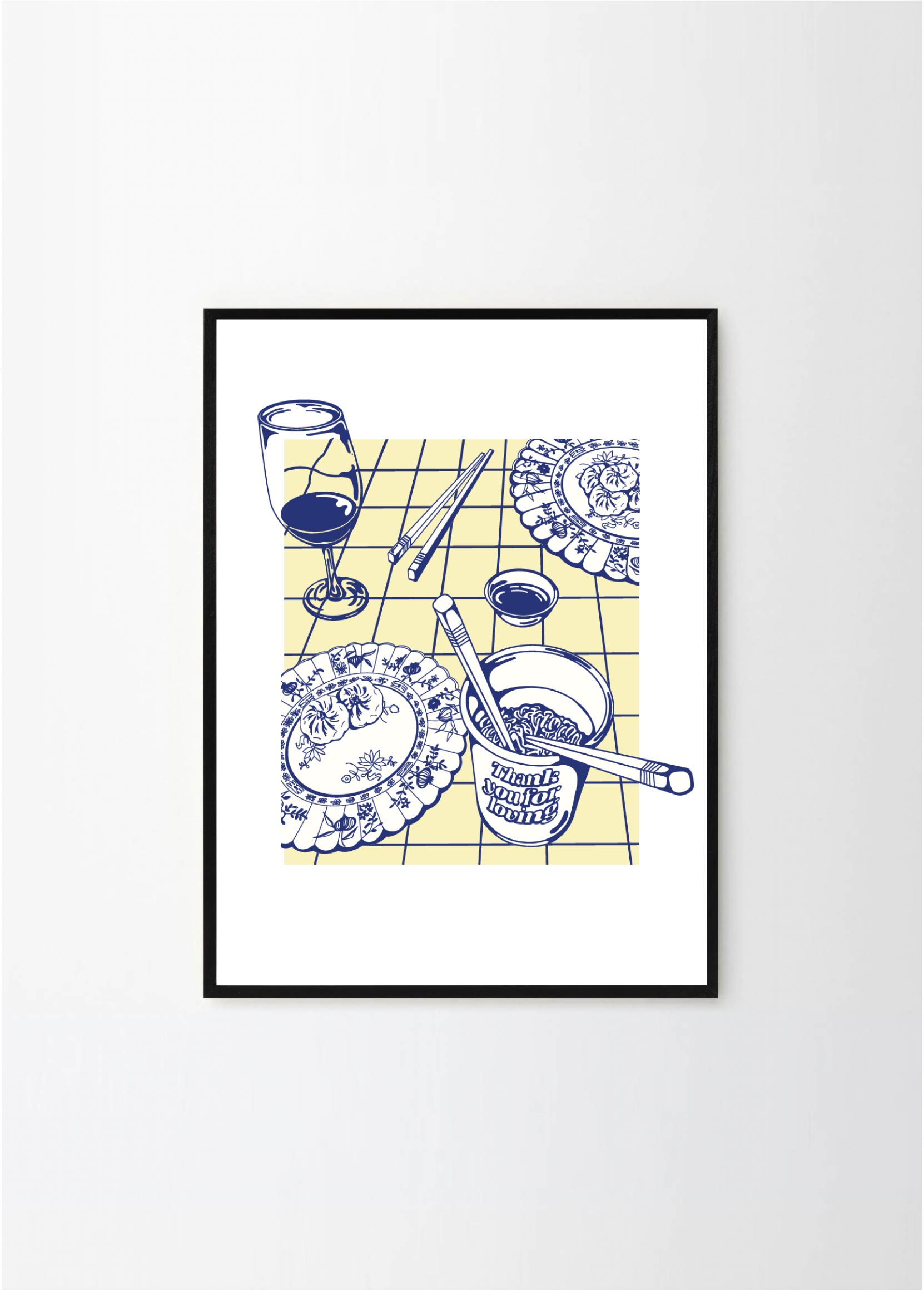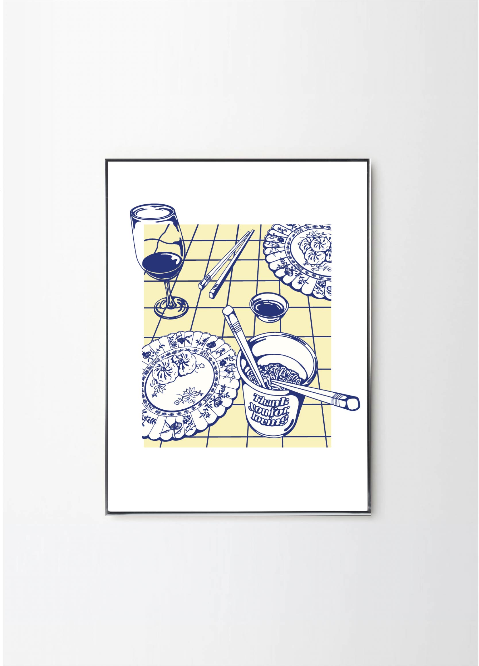 The artwork Lunch Club depicts an asian inspired lunch with boxes and chopsticks. The blue and white colors make Lunch Box perfect for a blue, white or walnut colored frame, with or without passepartout.