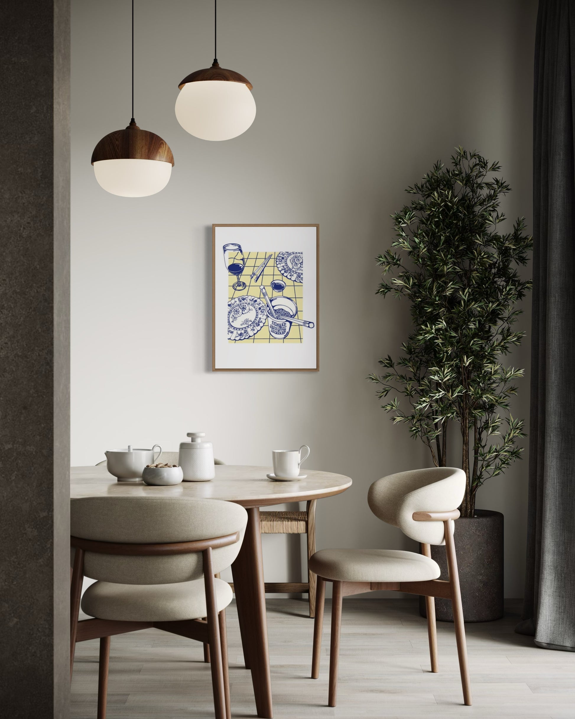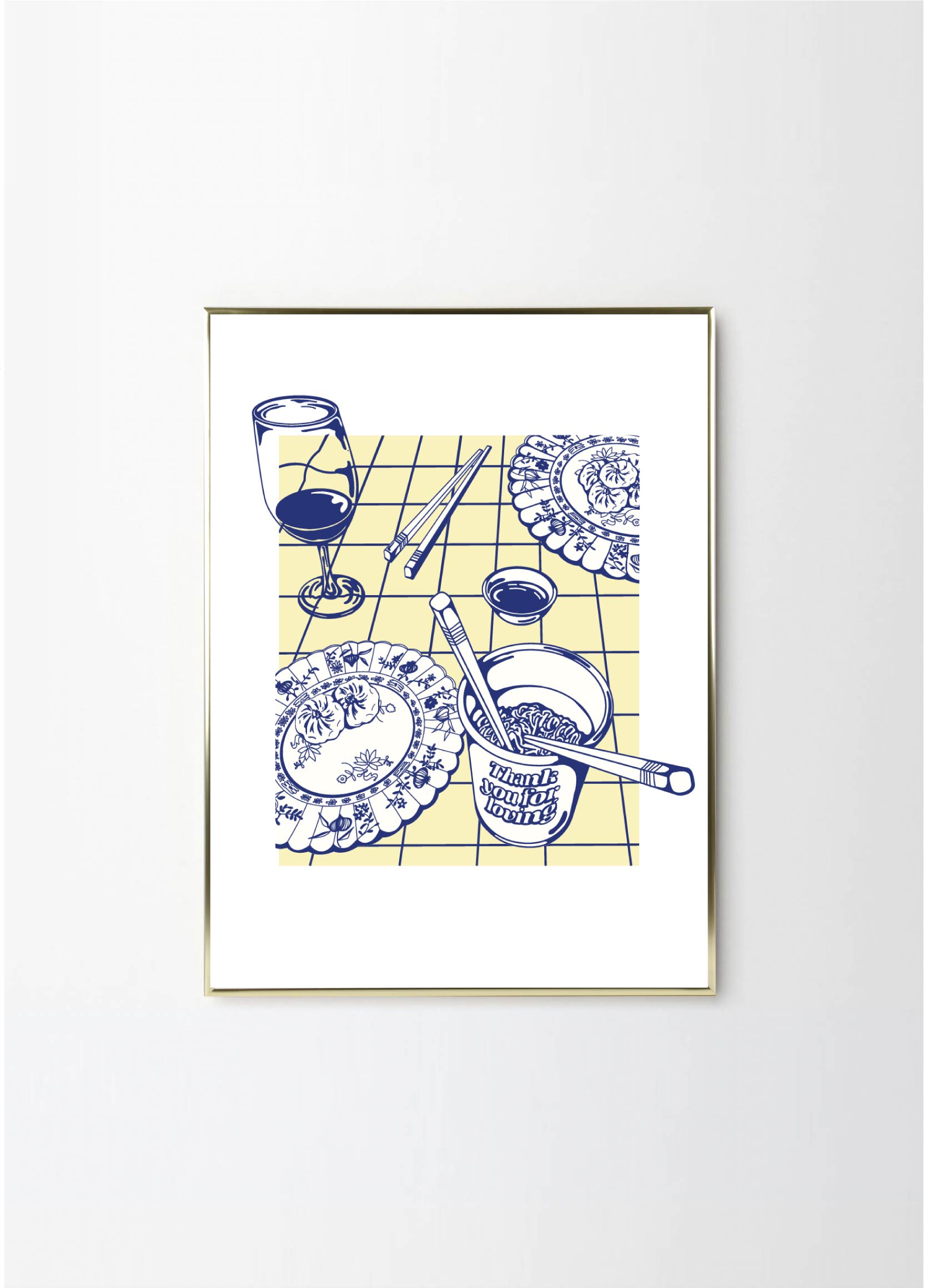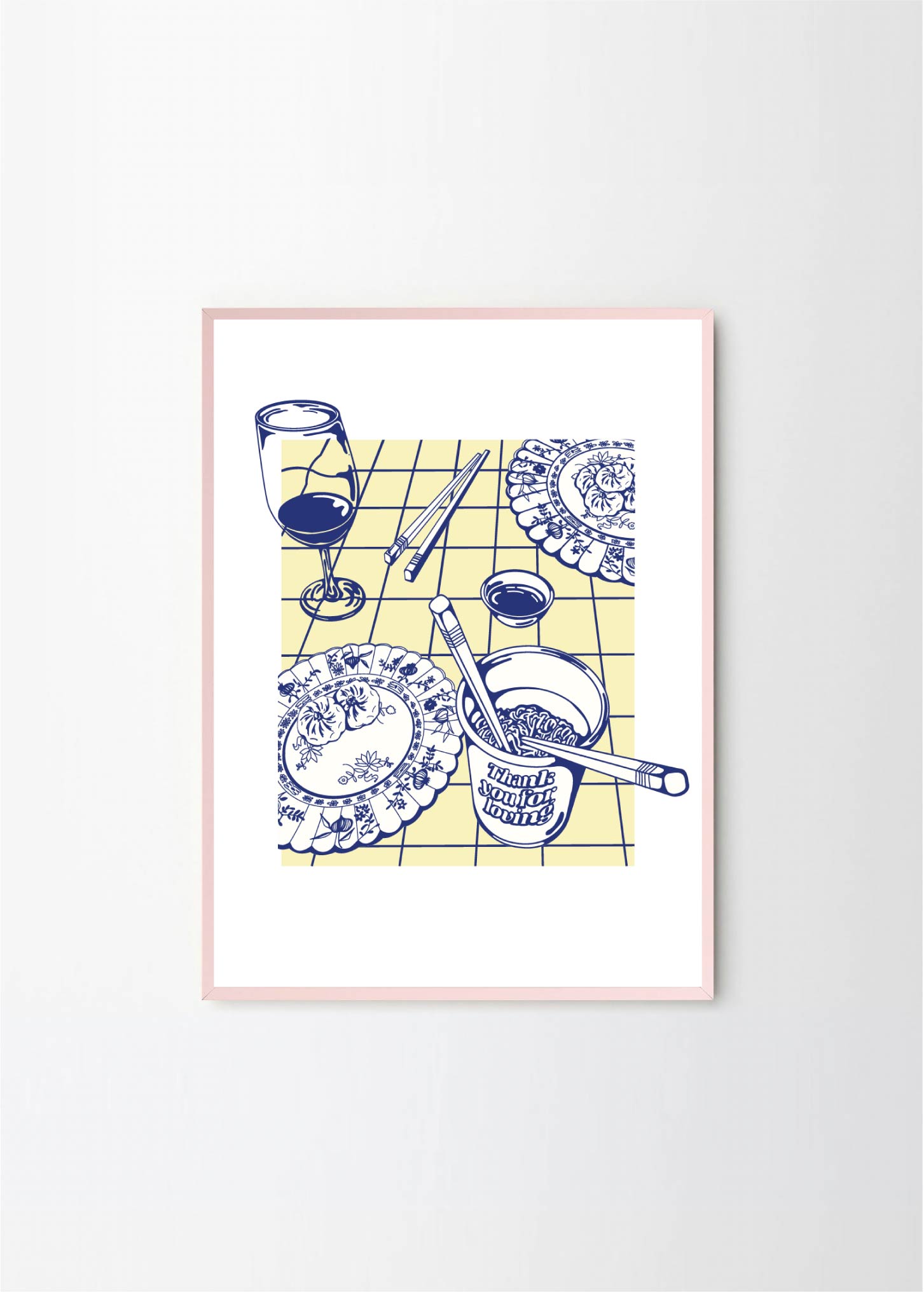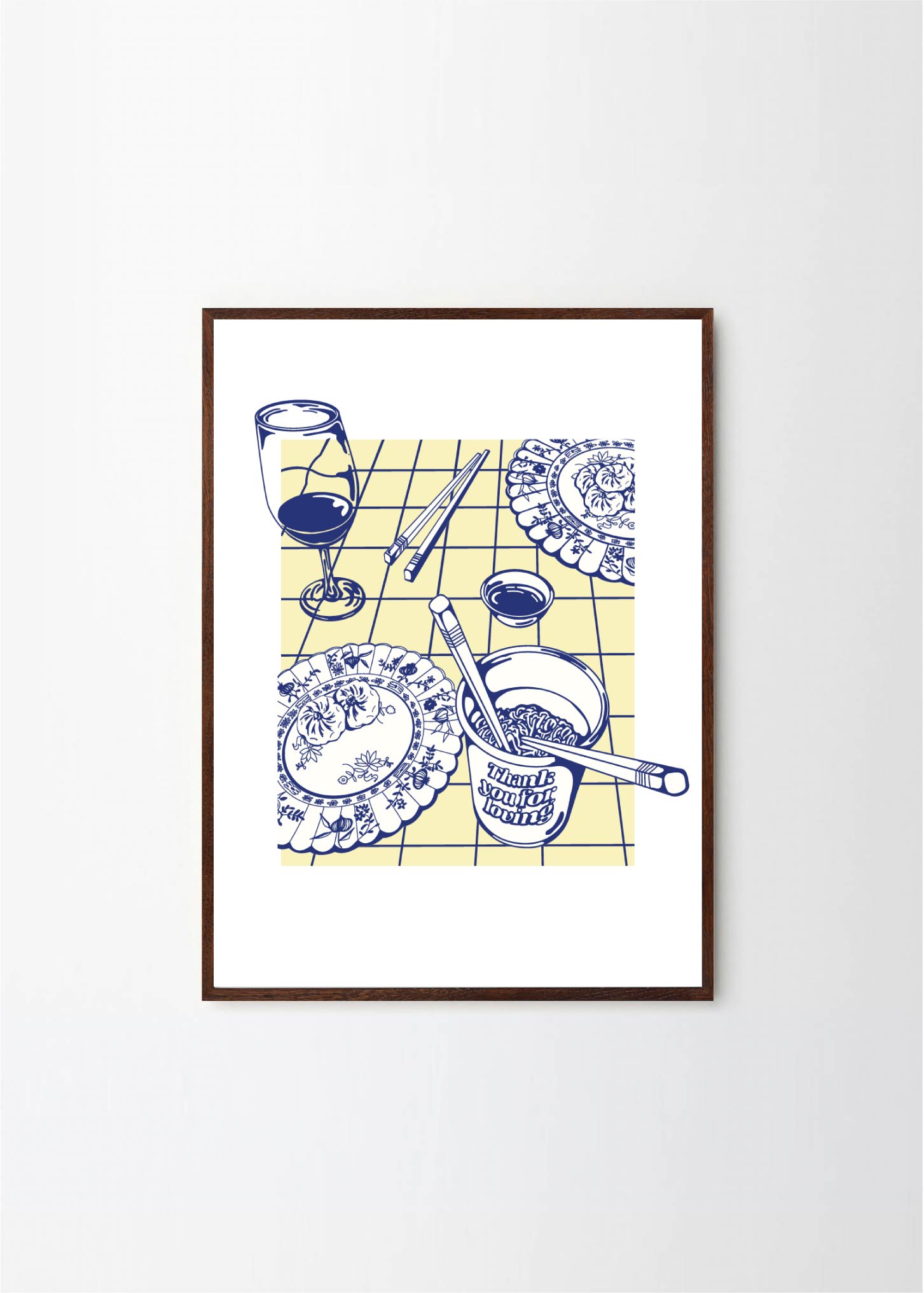 The artwork Lunch Club depicts an asian inspired lunch with boxes and chopsticks. The blue and white colors make Lunch Box perfect for a blue, white or walnut colored frame, with or without passepartout.