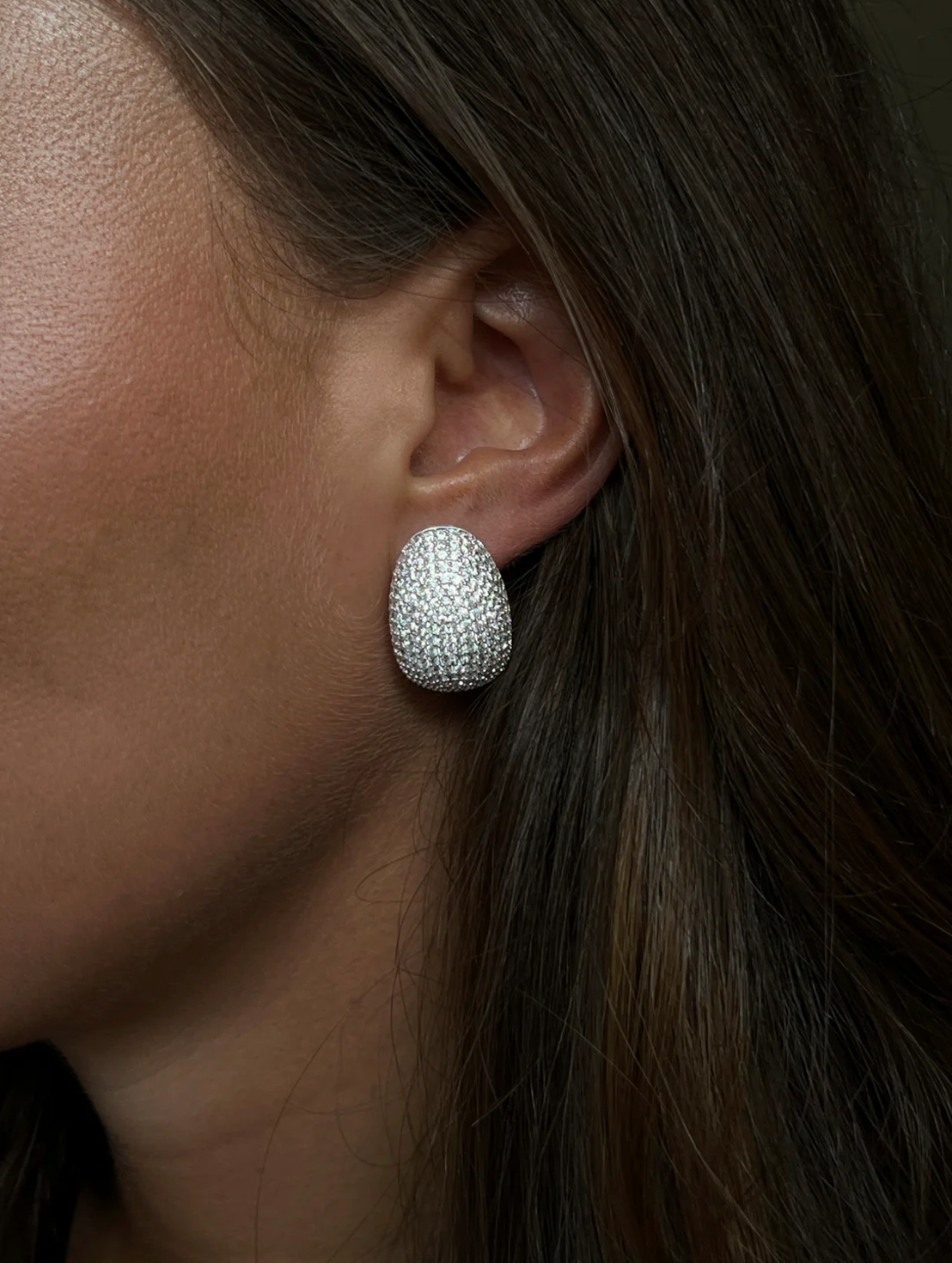 Our Luxe Chunky Earrings Silver have a bold design with white zirconias that add a bit of sparkle. The earrings are thicker and have a chunky style, making them stand out. The white zirconias are set along the surface, giving them a polished look. These earrings are great for adding some shine to any outfit and can be worn for different occasions.