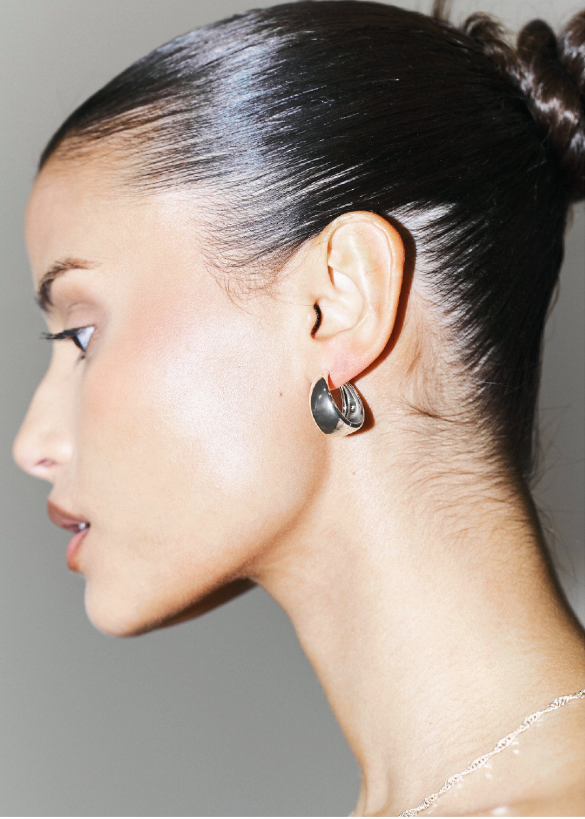 Our Midi Dome Hoops Silver are made of 925 silver plated brass and have a width of 10mm and a length of 20mm. They are also available in gold.
