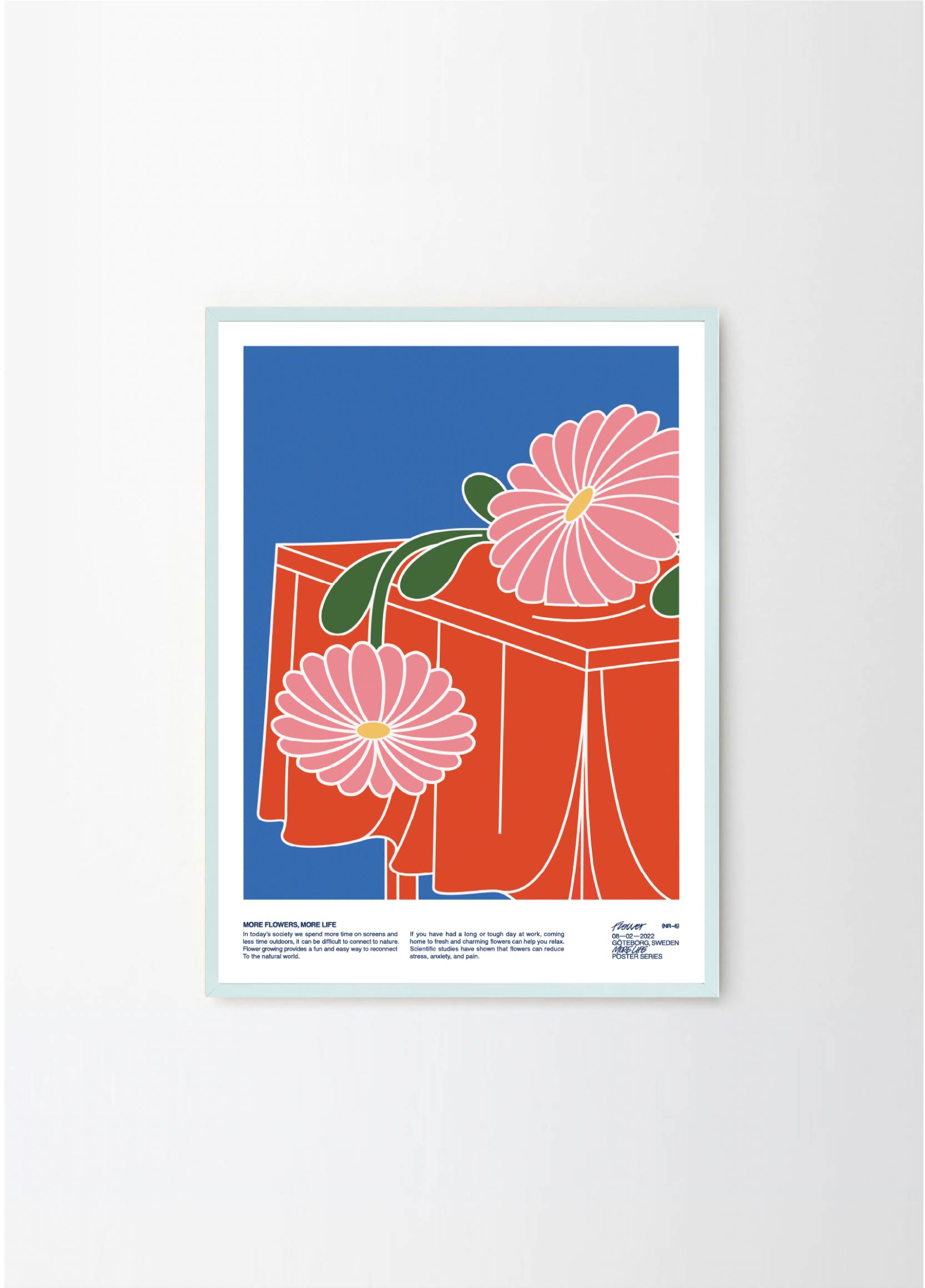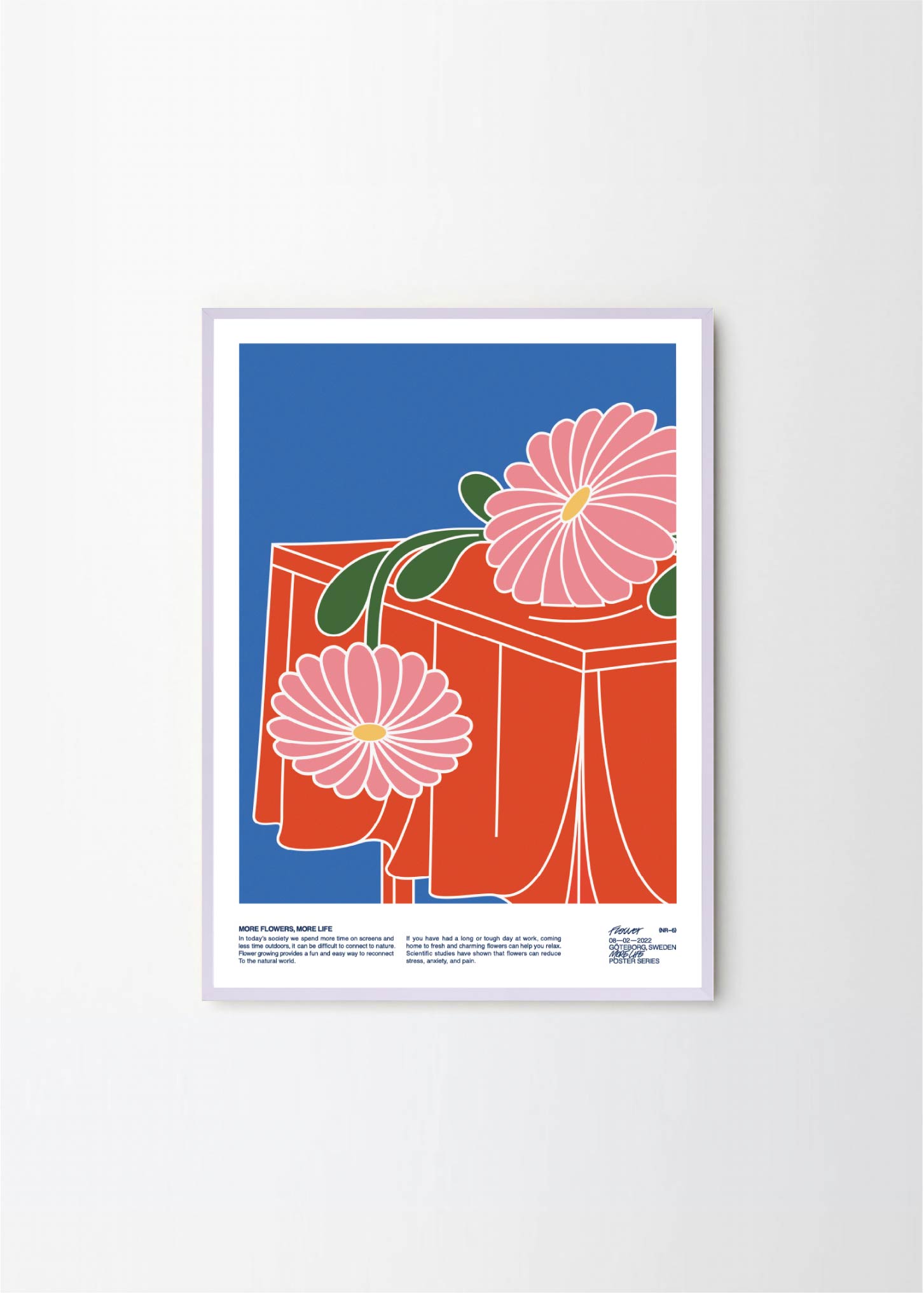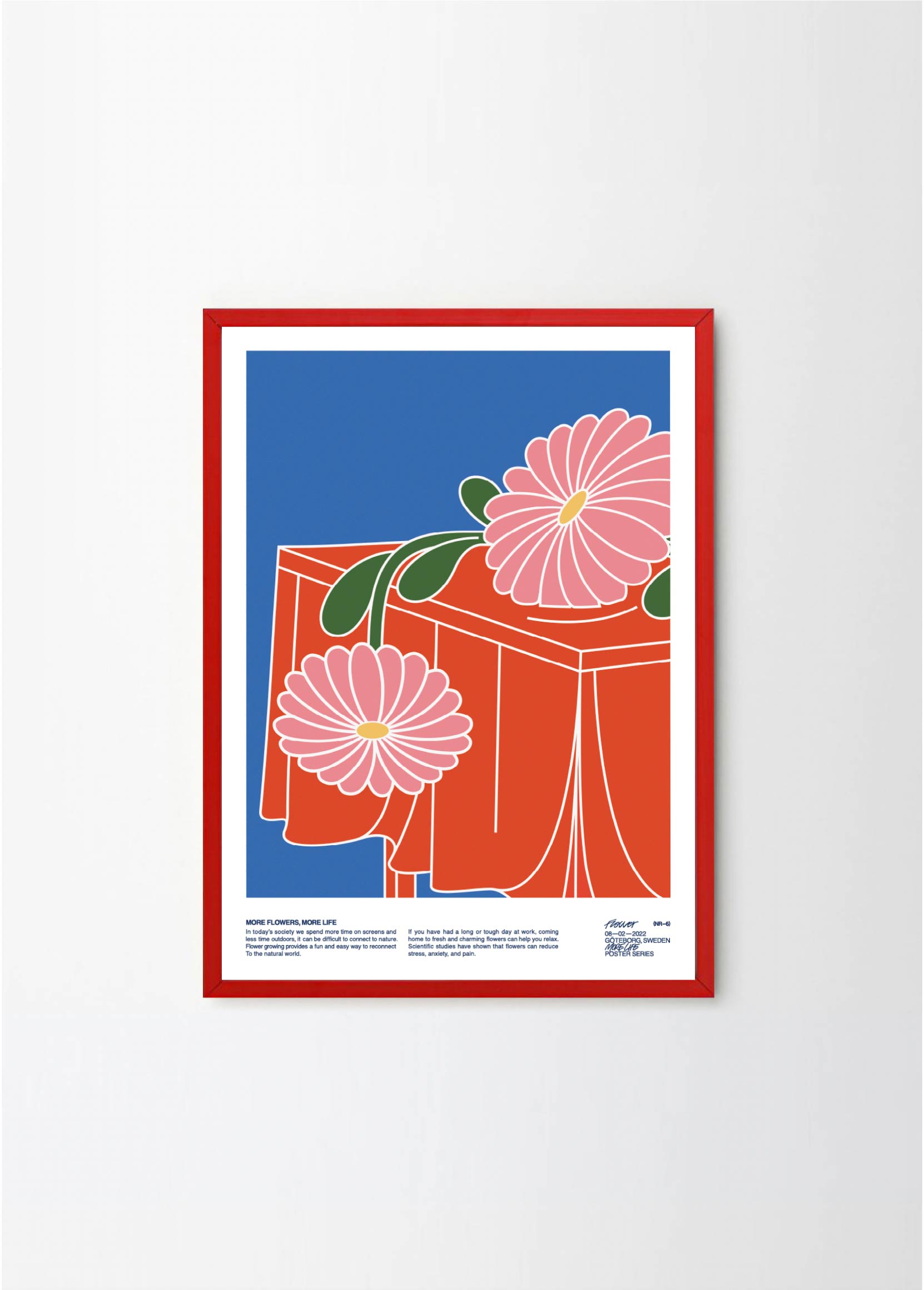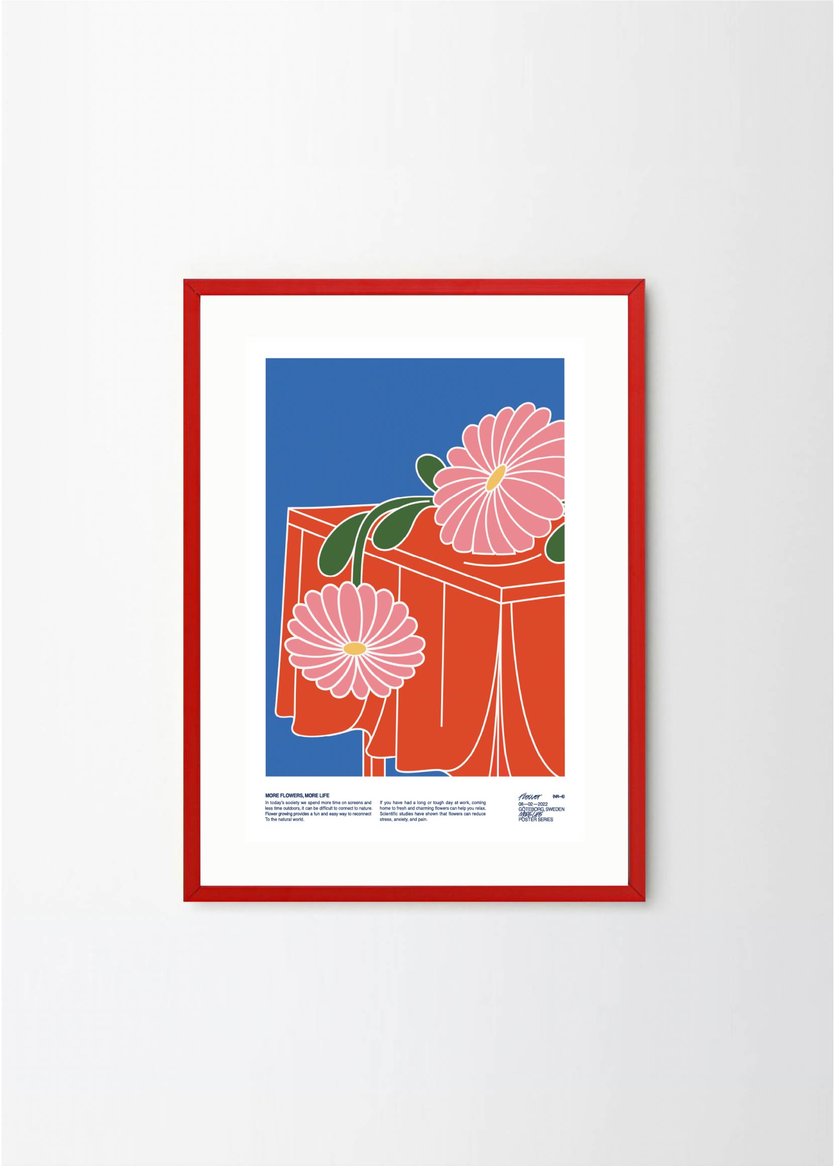 The artwork More Life 3 depicts pink flower on a red table with blue background in a portrait format.The Pink, Red and Blue colors make More Life 3 perfect for a green, walnut or pink colored frame, with or without passepartout.