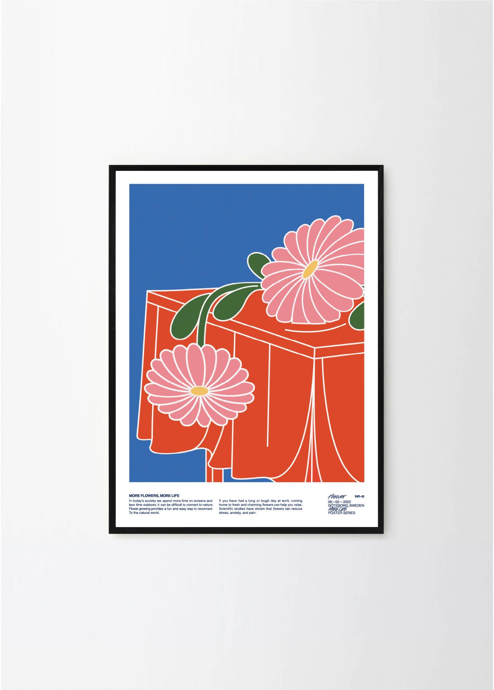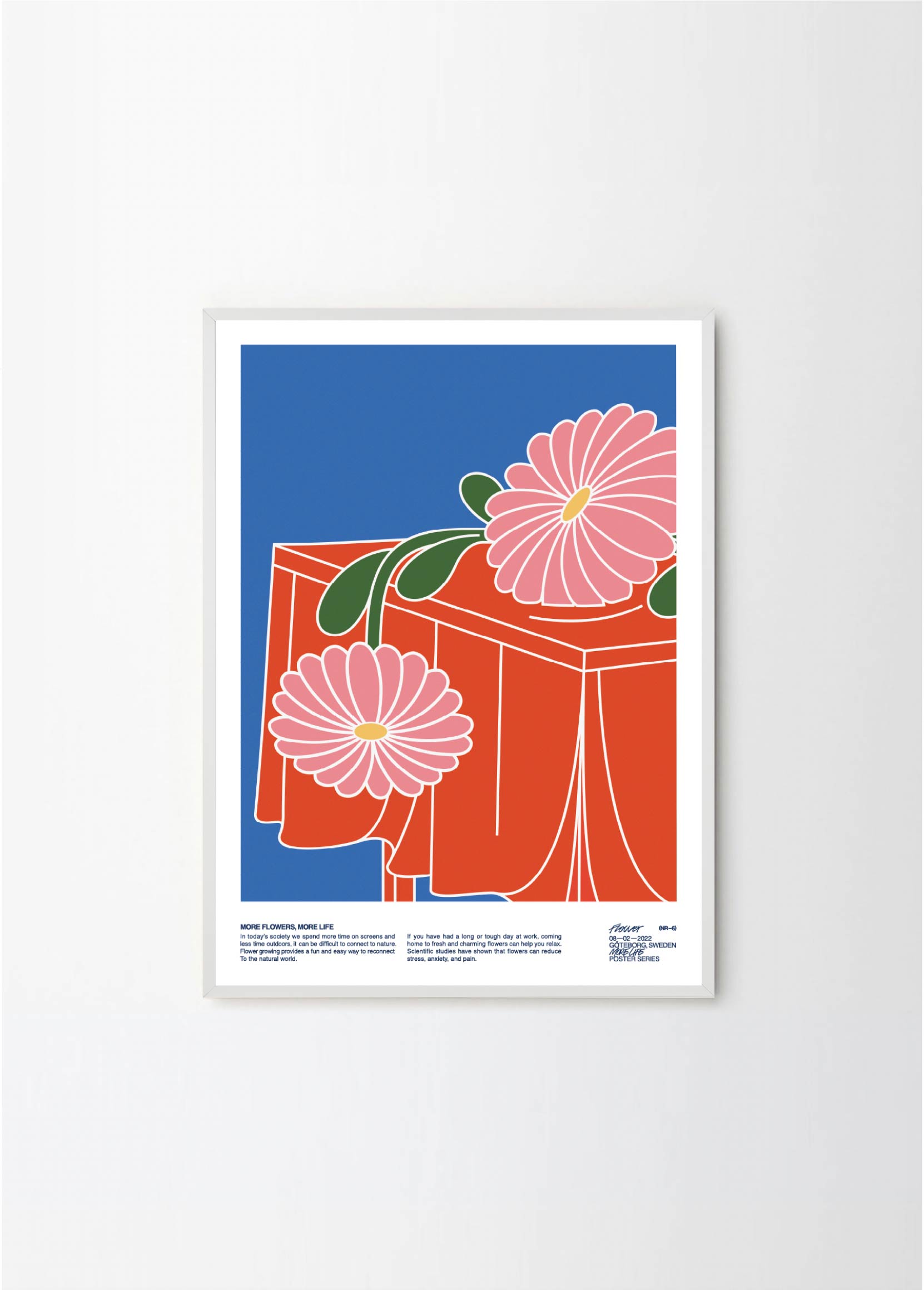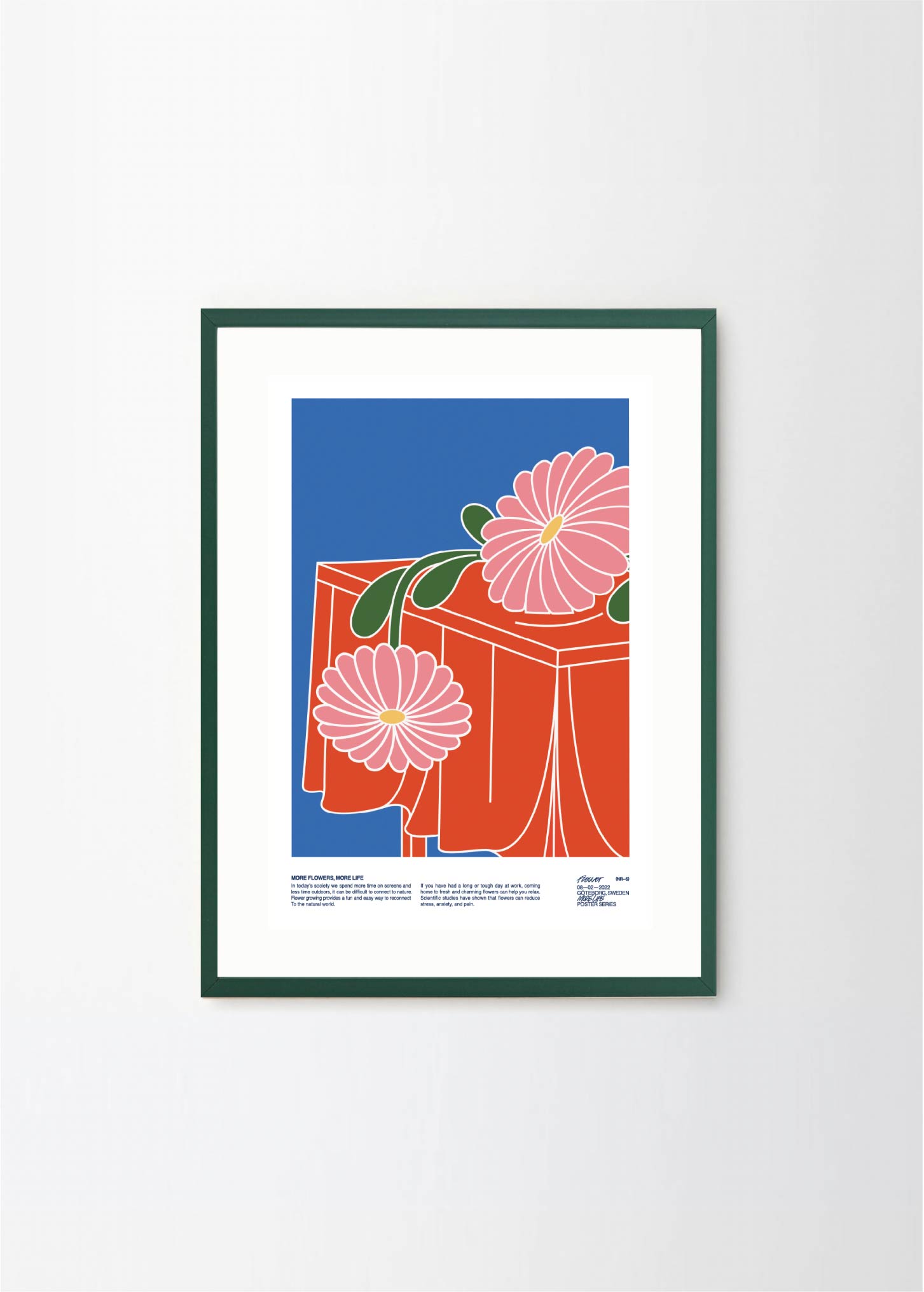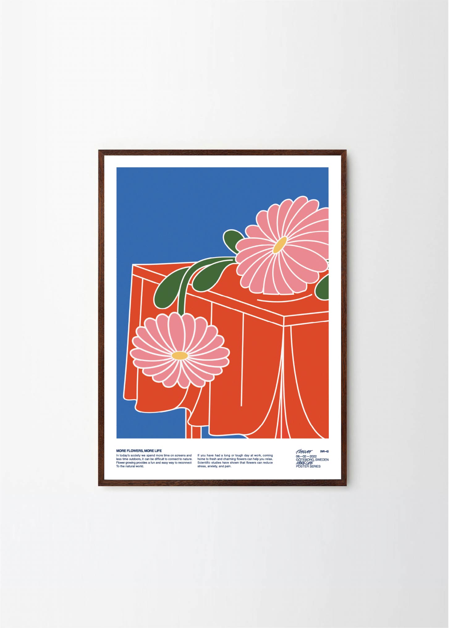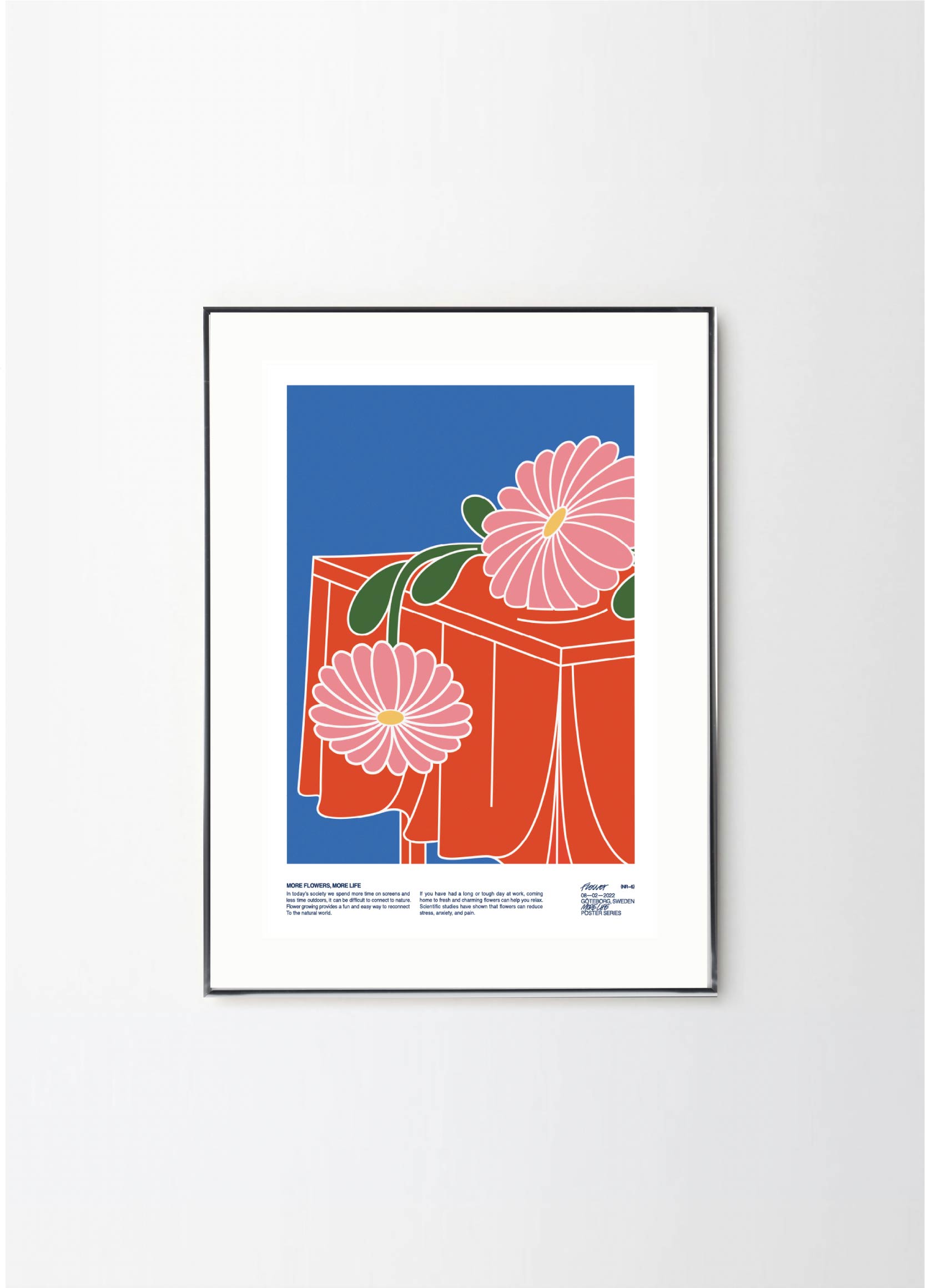 The artwork More Life 3 depicts pink flower on a red table with blue background in a portrait format.The Pink, Red and Blue colors make More Life 3 perfect for a green, walnut or pink colored frame, with or without passepartout.