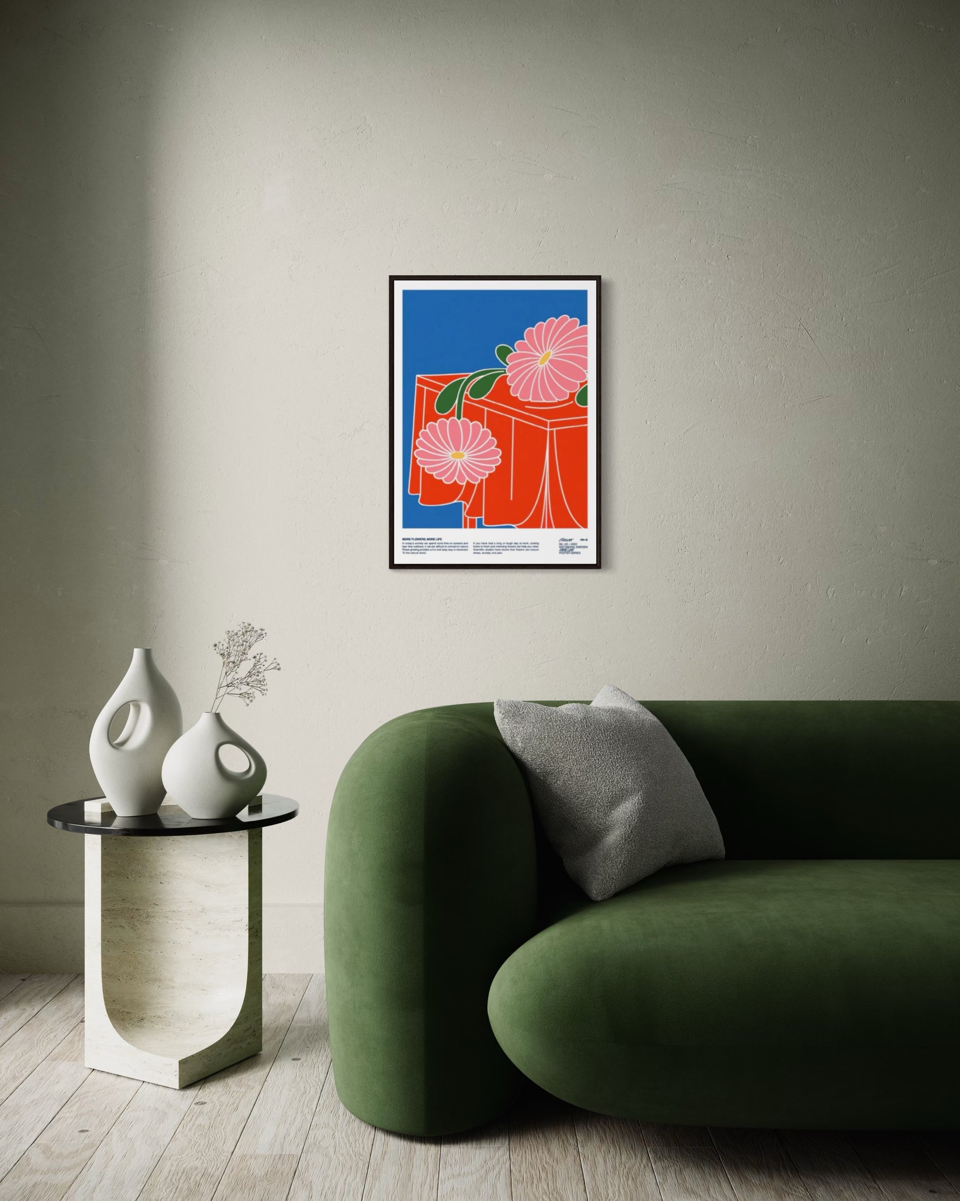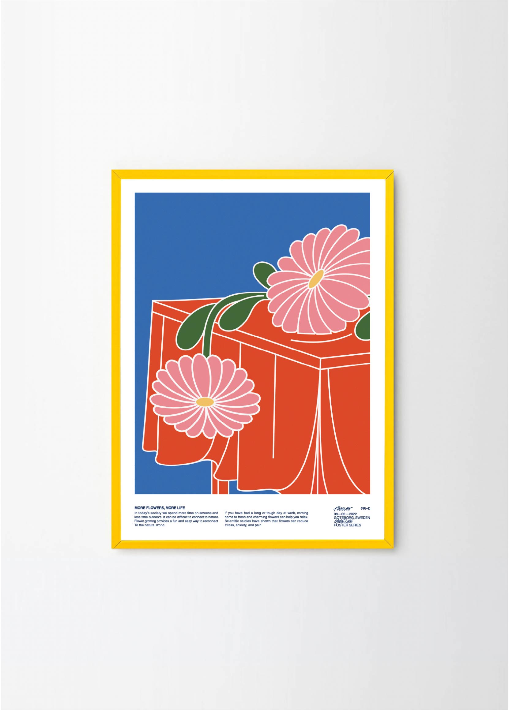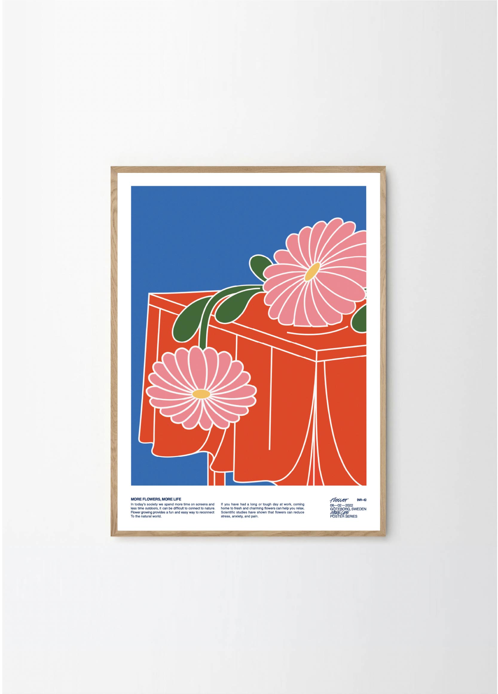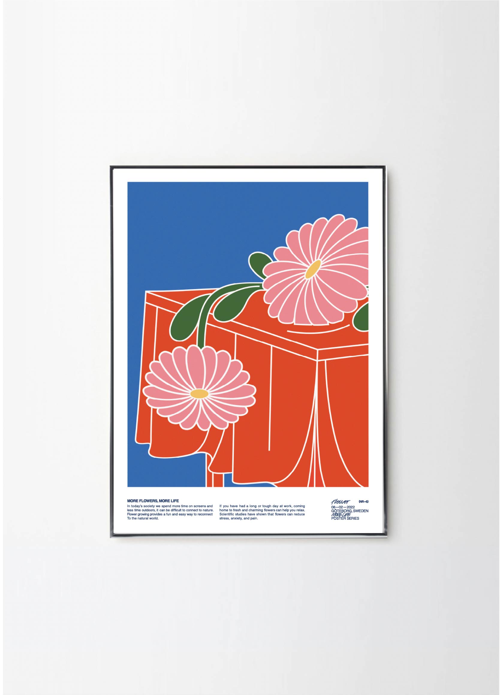 The artwork More Life 3 depicts pink flower on a red table with blue background in a portrait format.The Pink, Red and Blue colors make More Life 3 perfect for a green, walnut or pink colored frame, with or without passepartout.