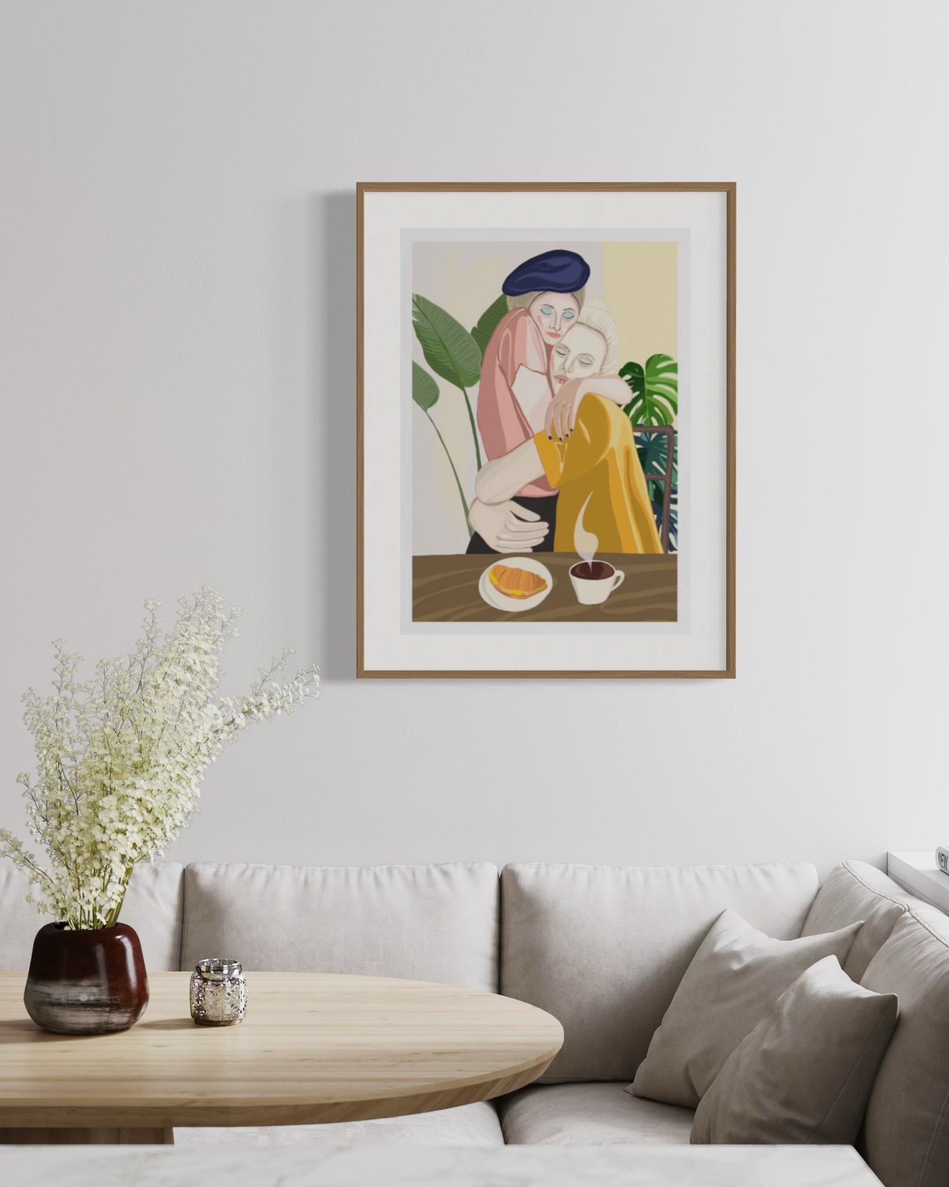 This portrait format poster depicts a floral vase. The delightful purple, green and red, yellow and red colors makes Morgonstund perfect for a pink or purple frame, with or without a passepartout.