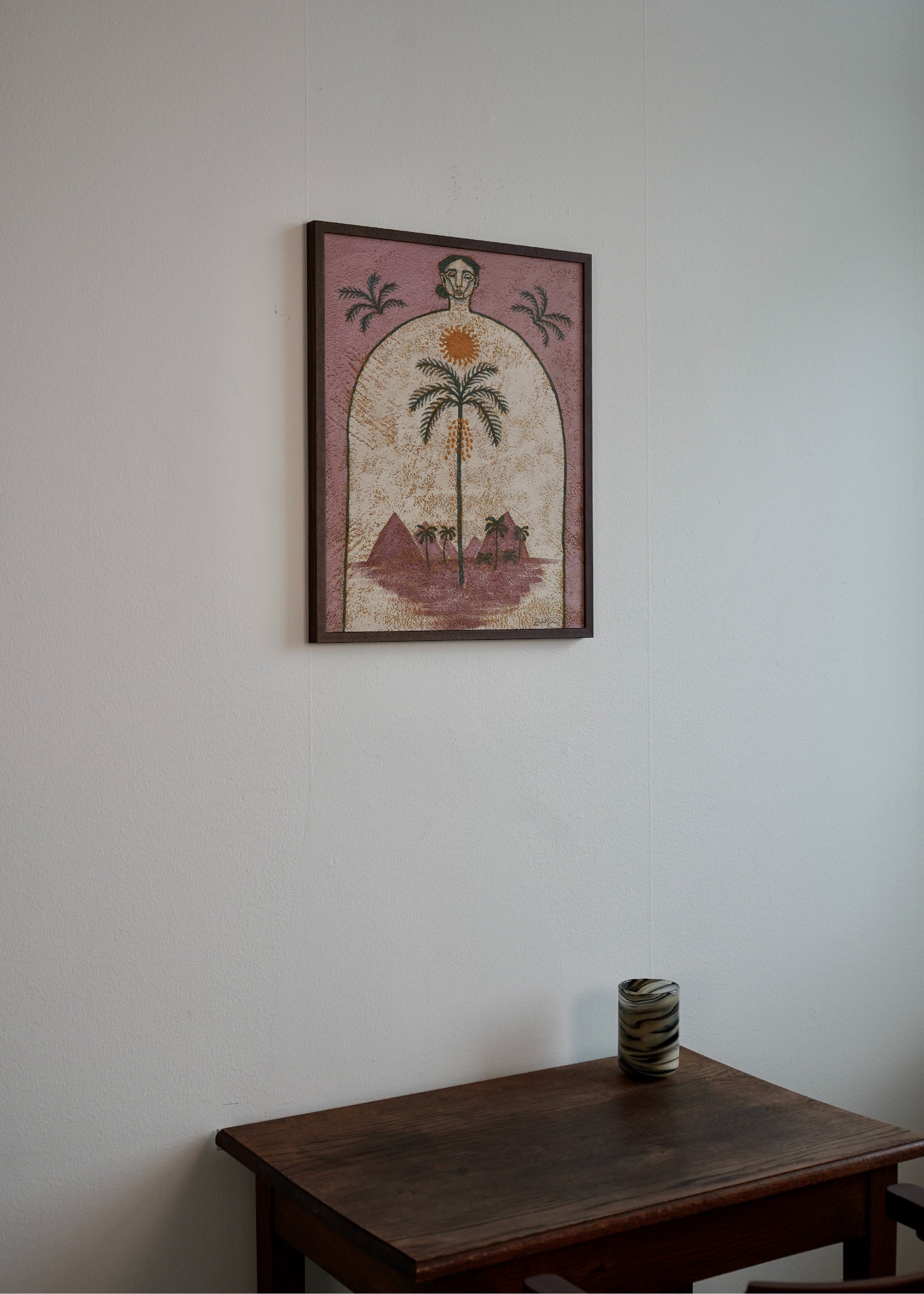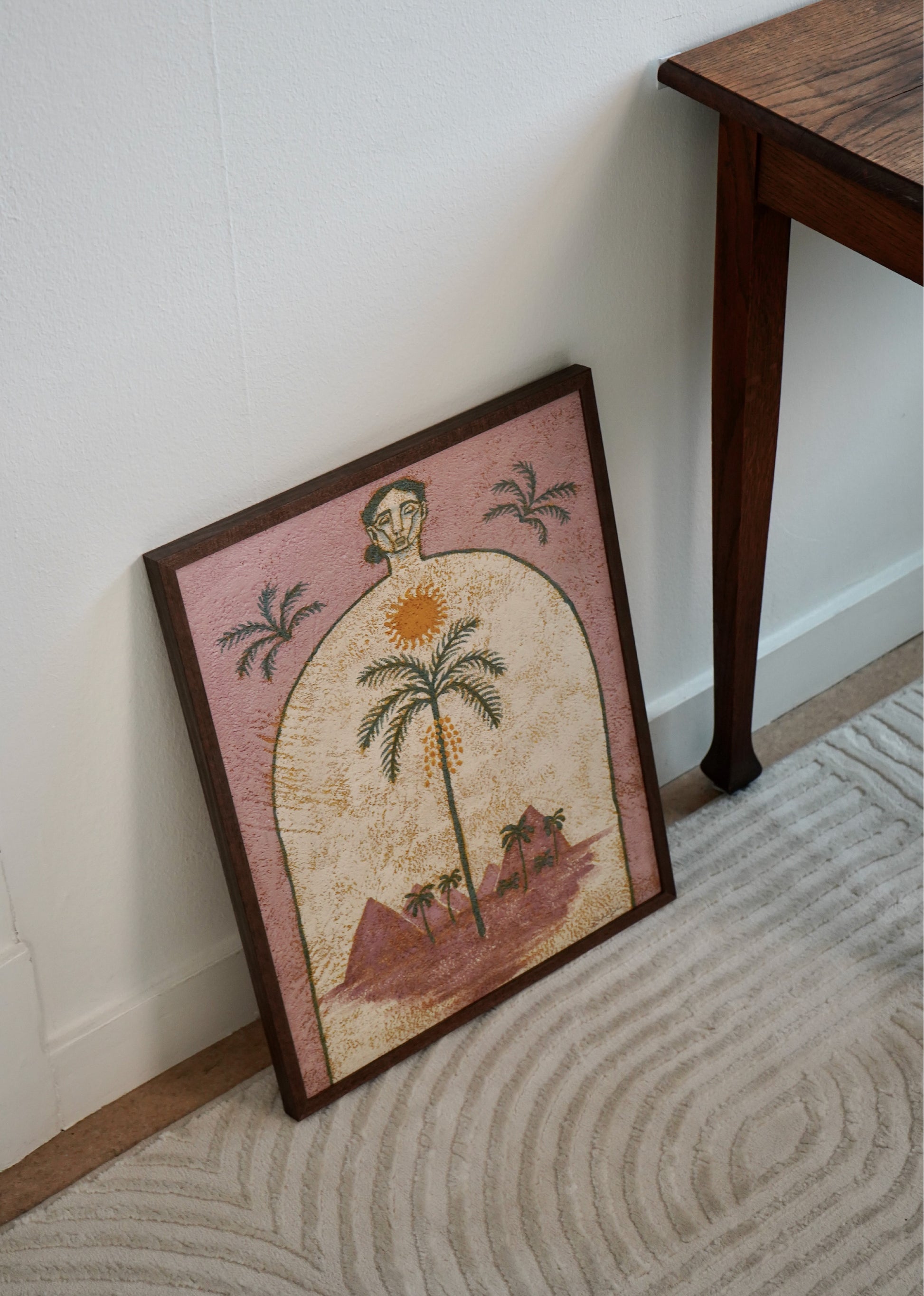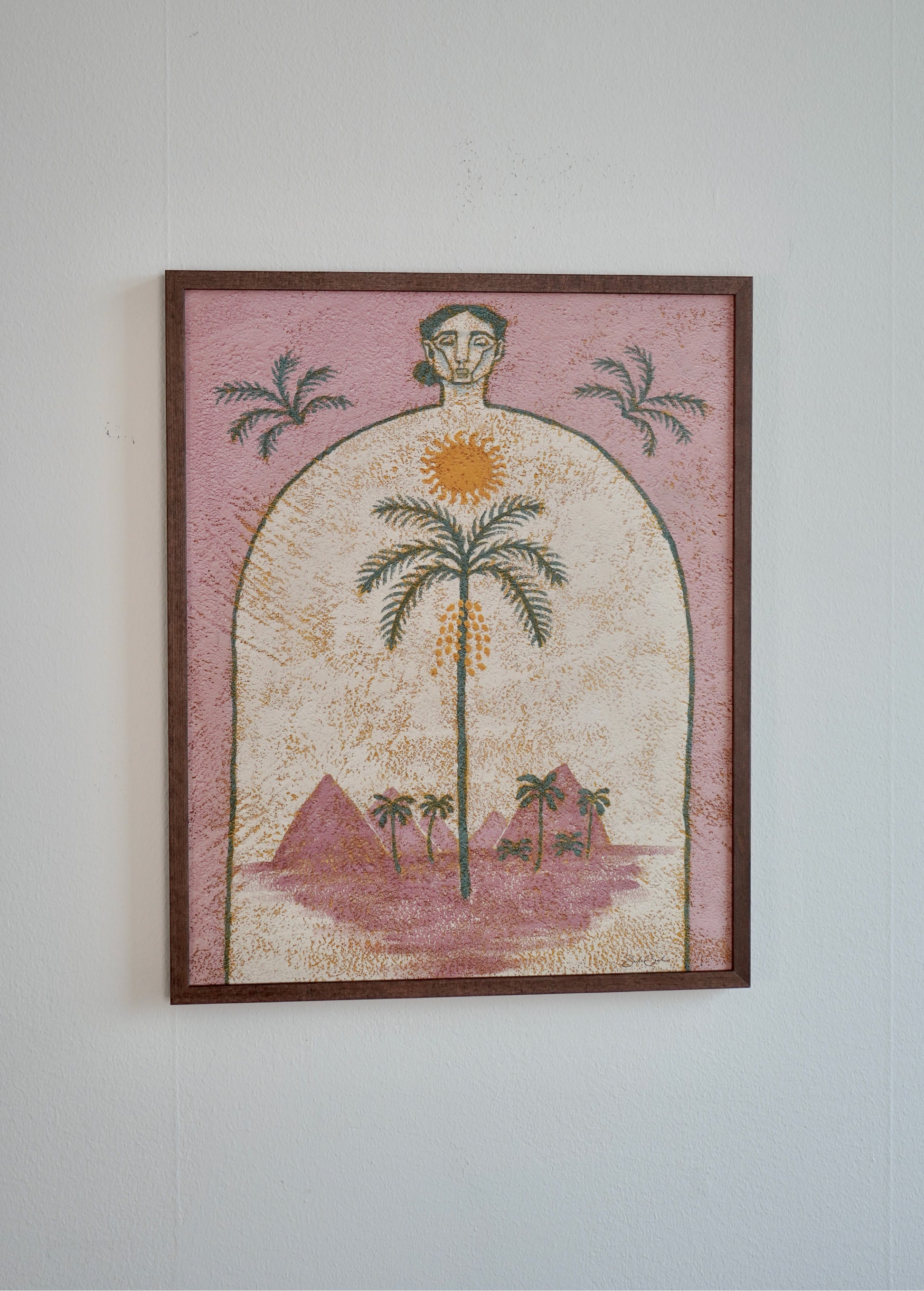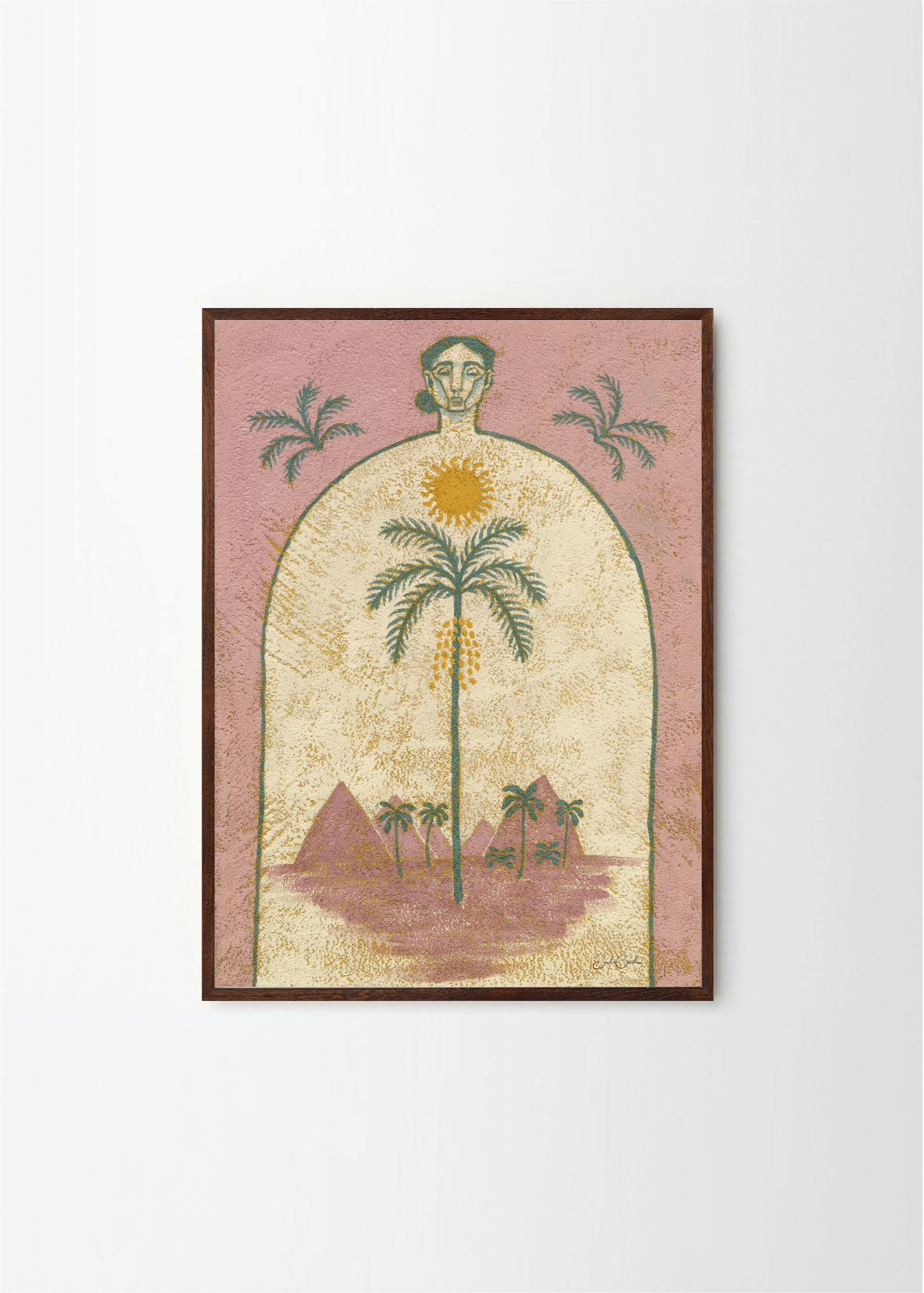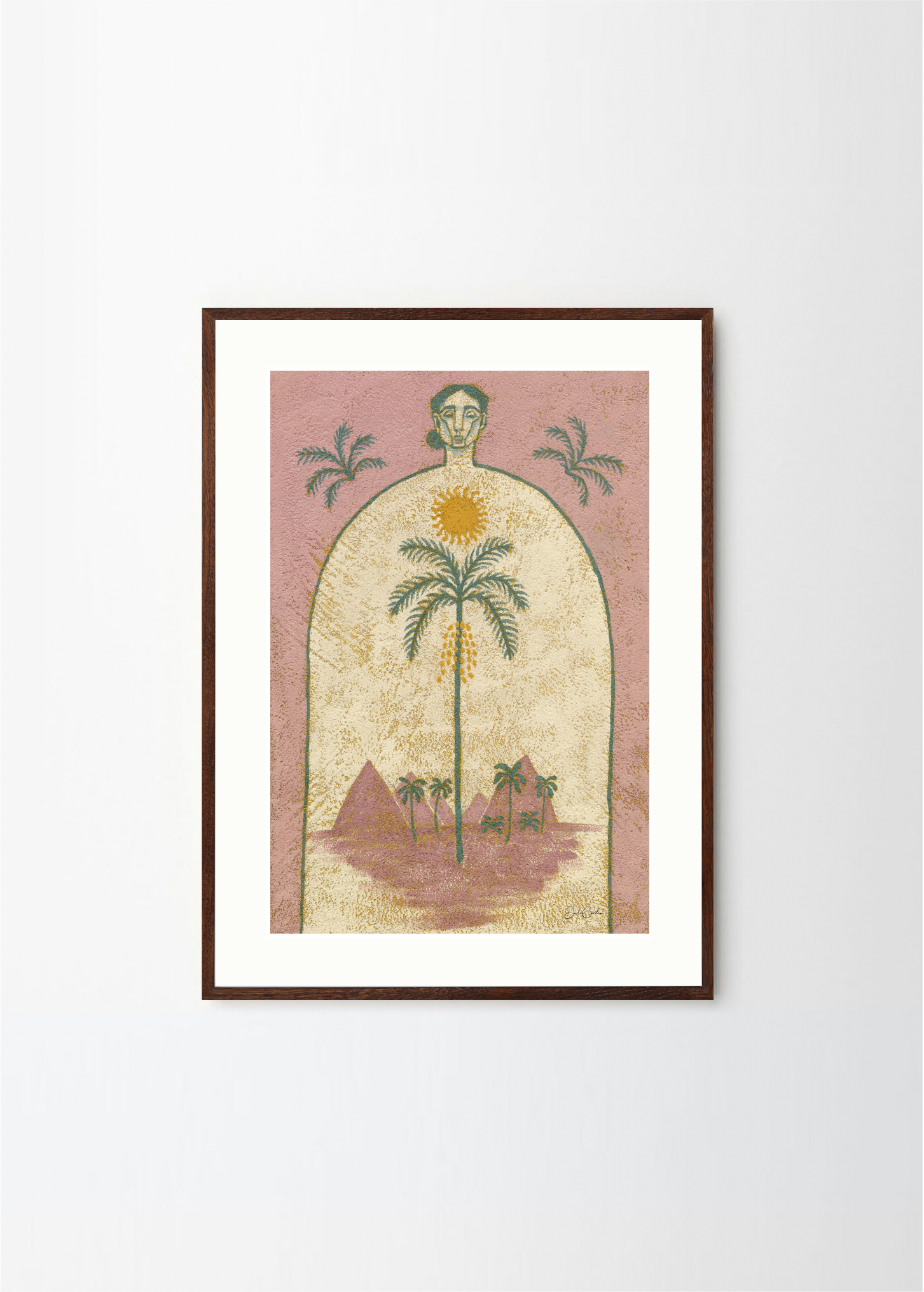 Mother of Dates blends mythology and landscape into a surreal visual poem. A tall date palm rises from a female figure, enclosing pyramids and desert flora within her form. With hues of soft rose, sand, and green, Julie Celina evokes themes of fertility, memory, and the sacred power of nature.