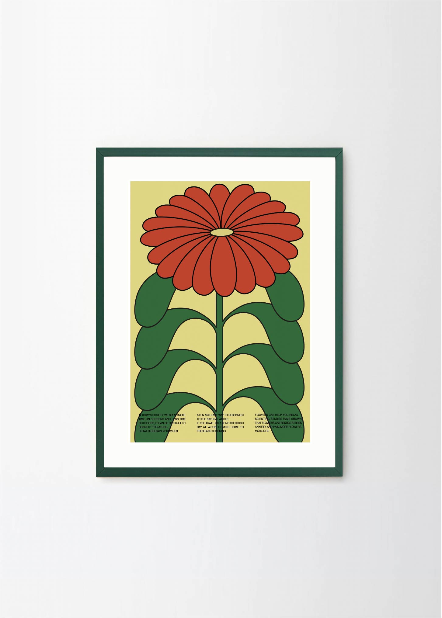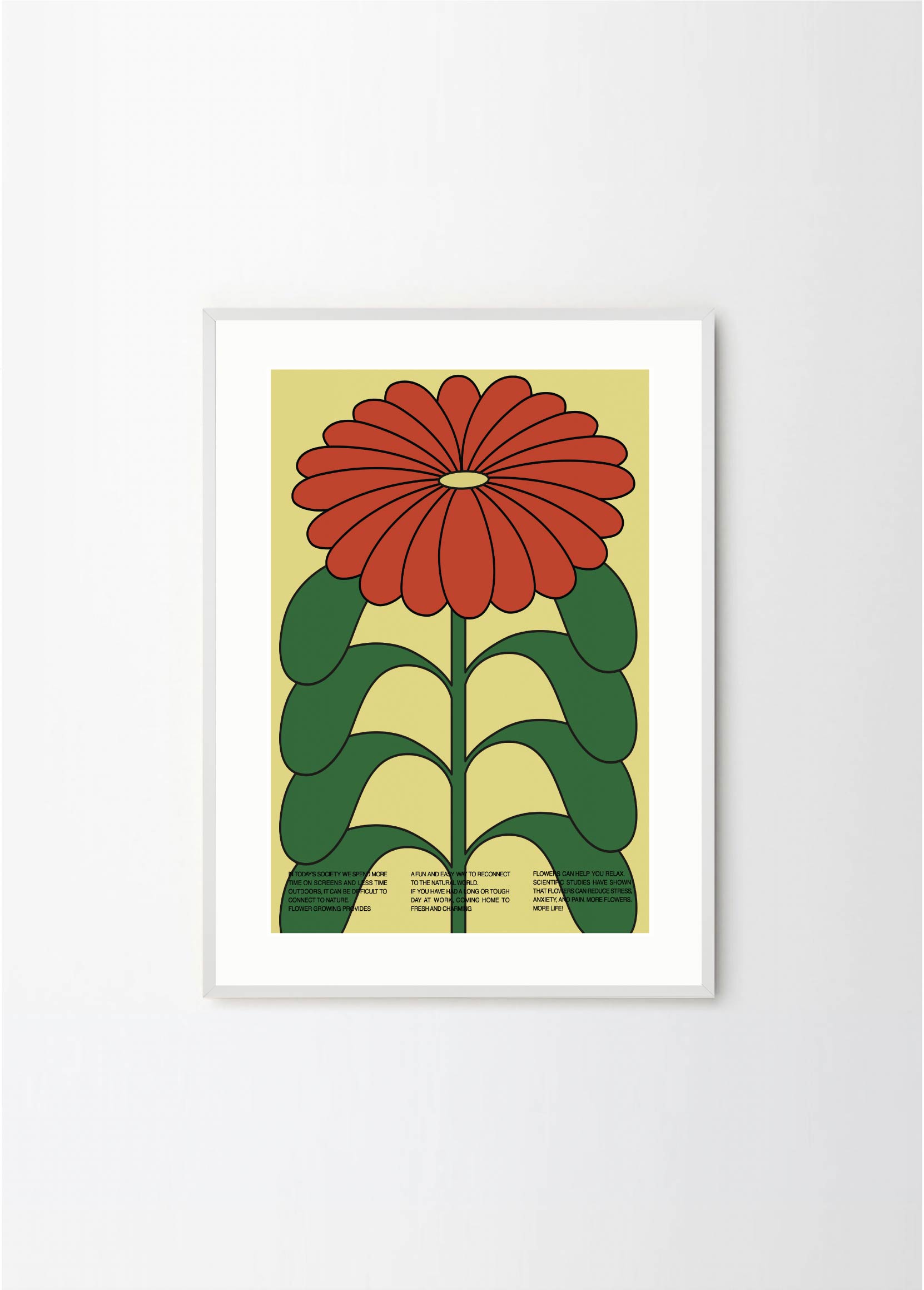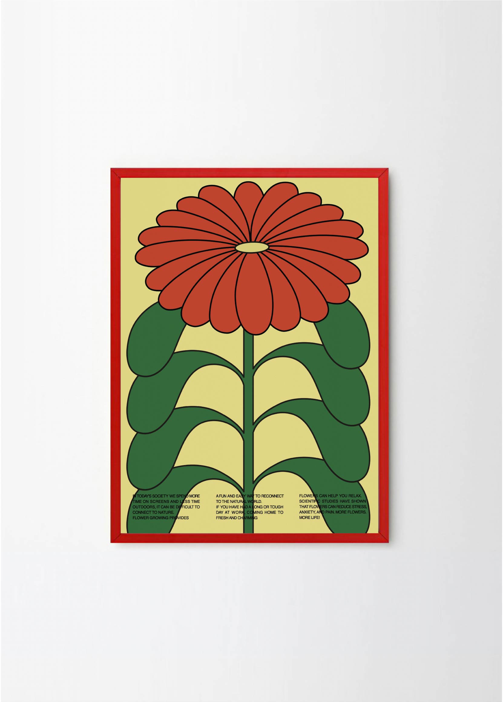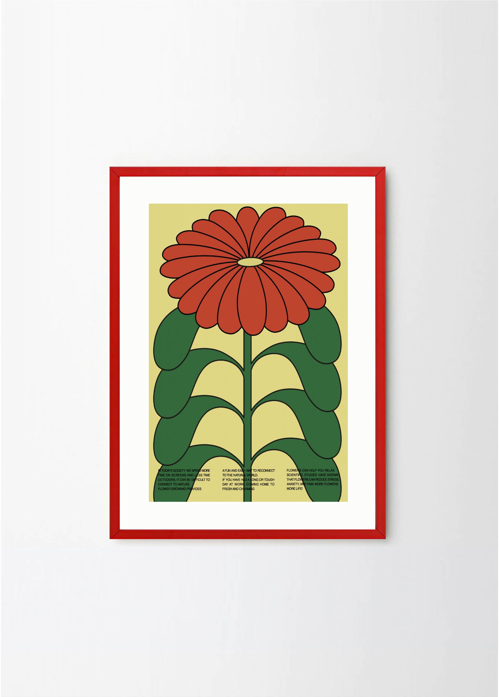 The artwork Big Flower depicts a red flower with a green stem and a yellow background in a portrait format. The red, yellow and green colors make Big Flower perfect for green, yellow or walnut colored frame, with or without passepartout.