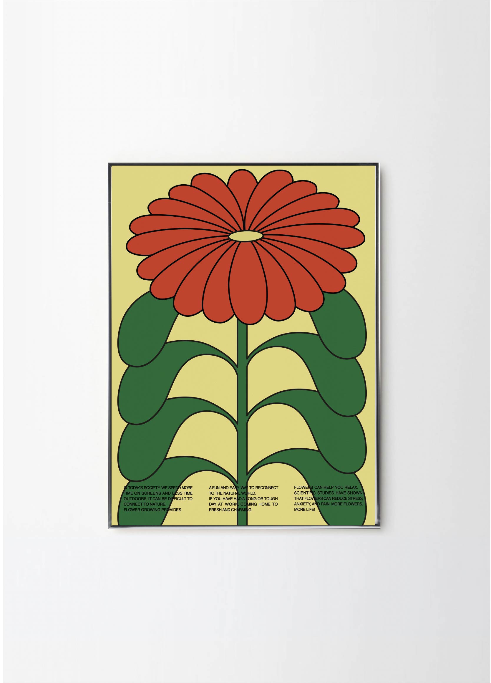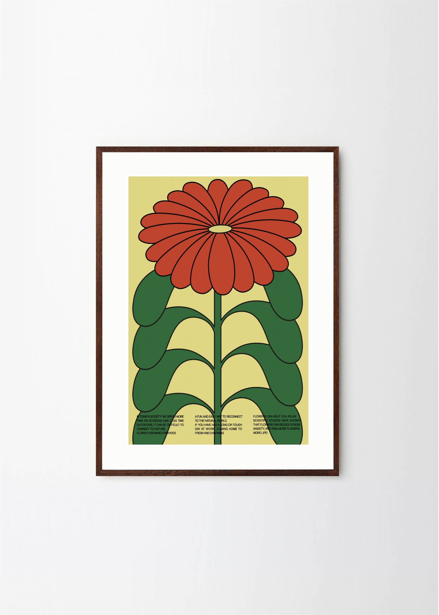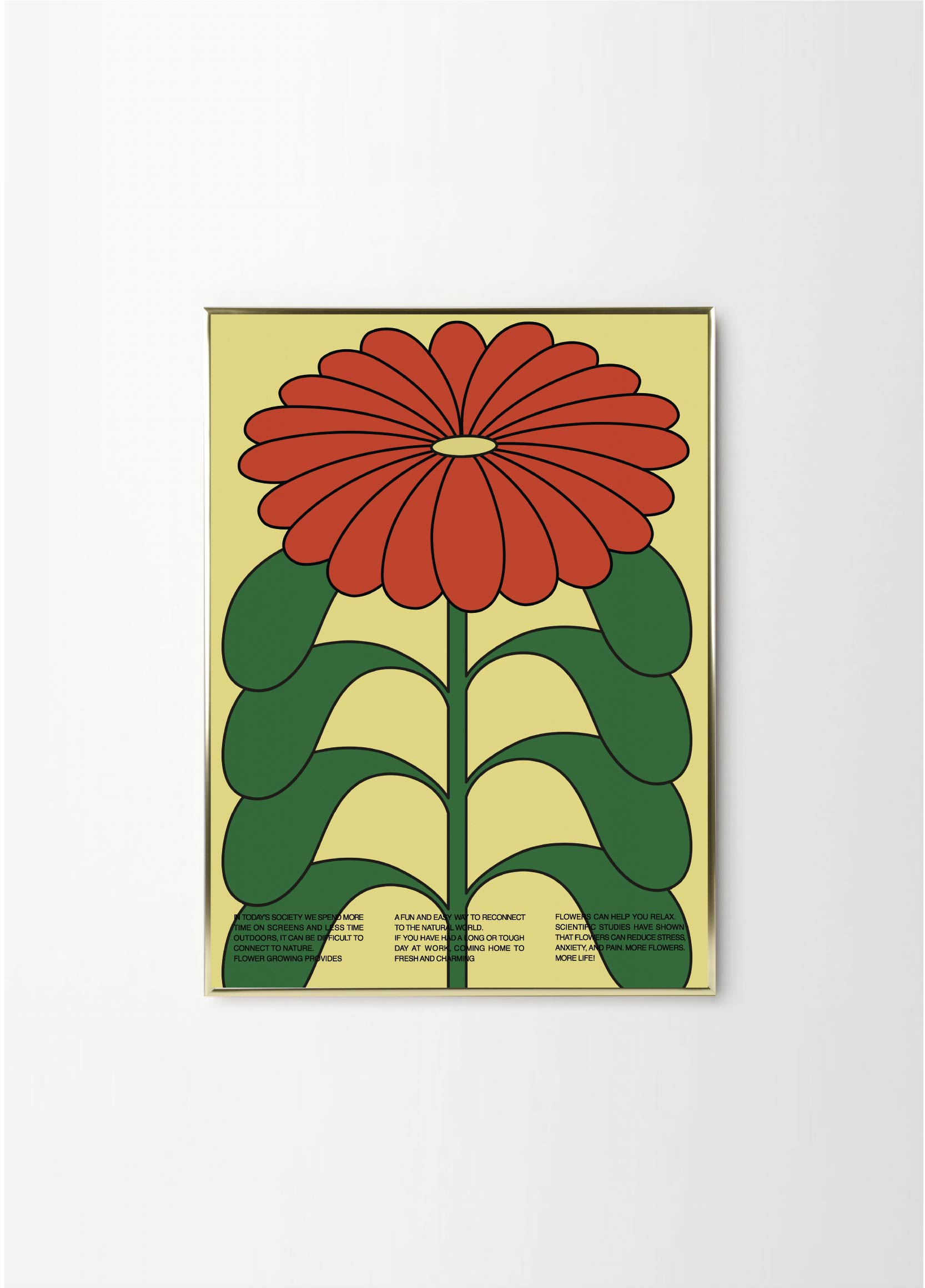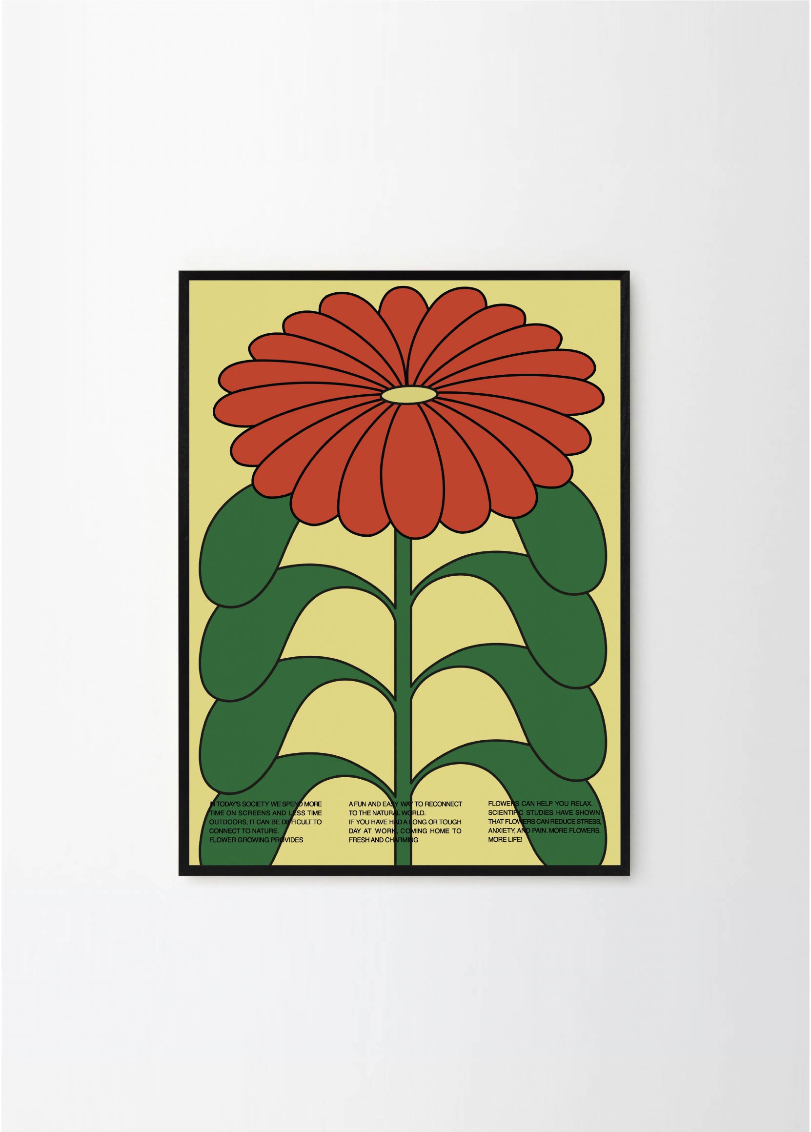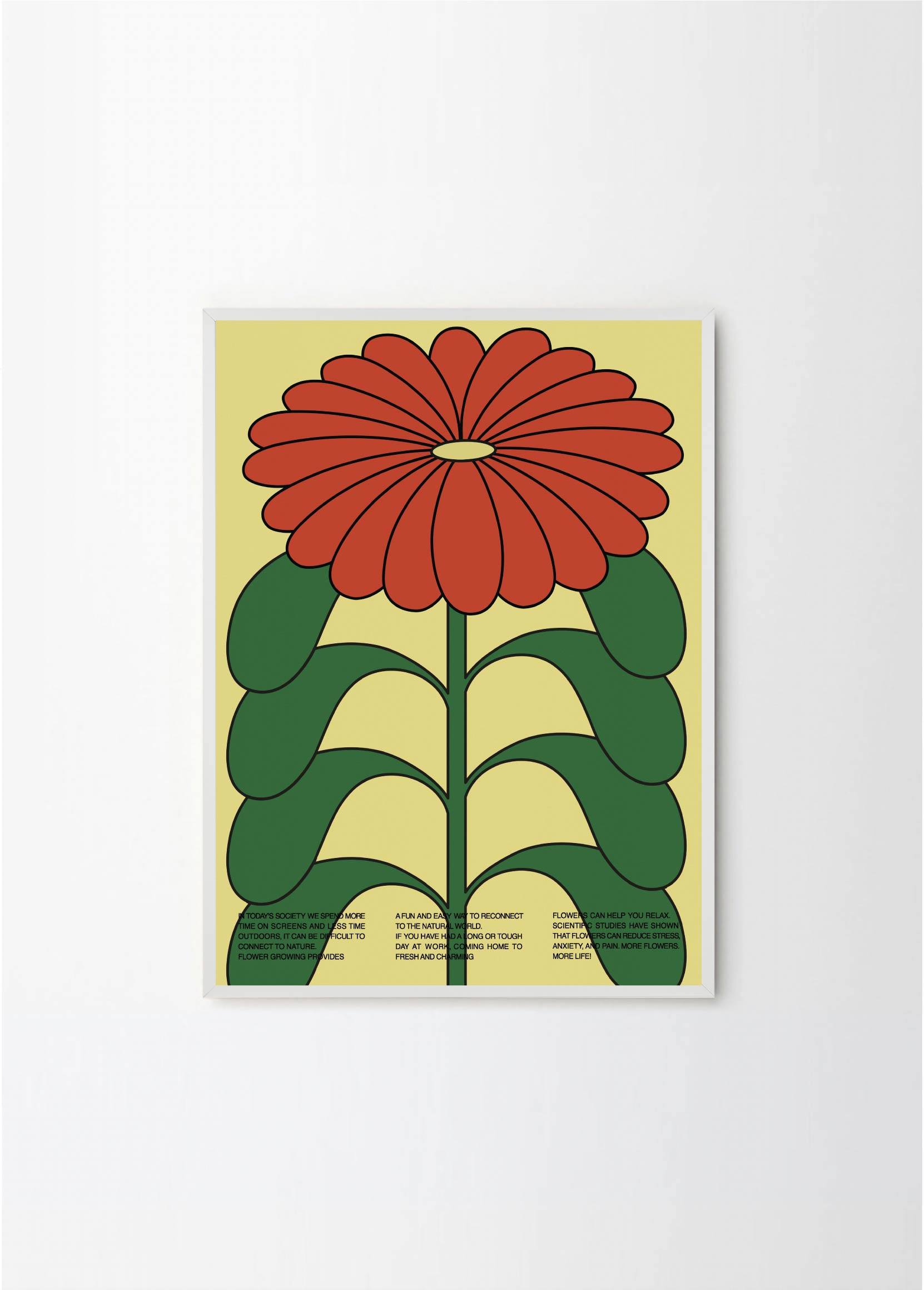 The artwork Big Flower depicts a red flower with a green stem and a yellow background in a portrait format. The red, yellow and green colors make Big Flower perfect for green, yellow or walnut colored frame, with or without passepartout.