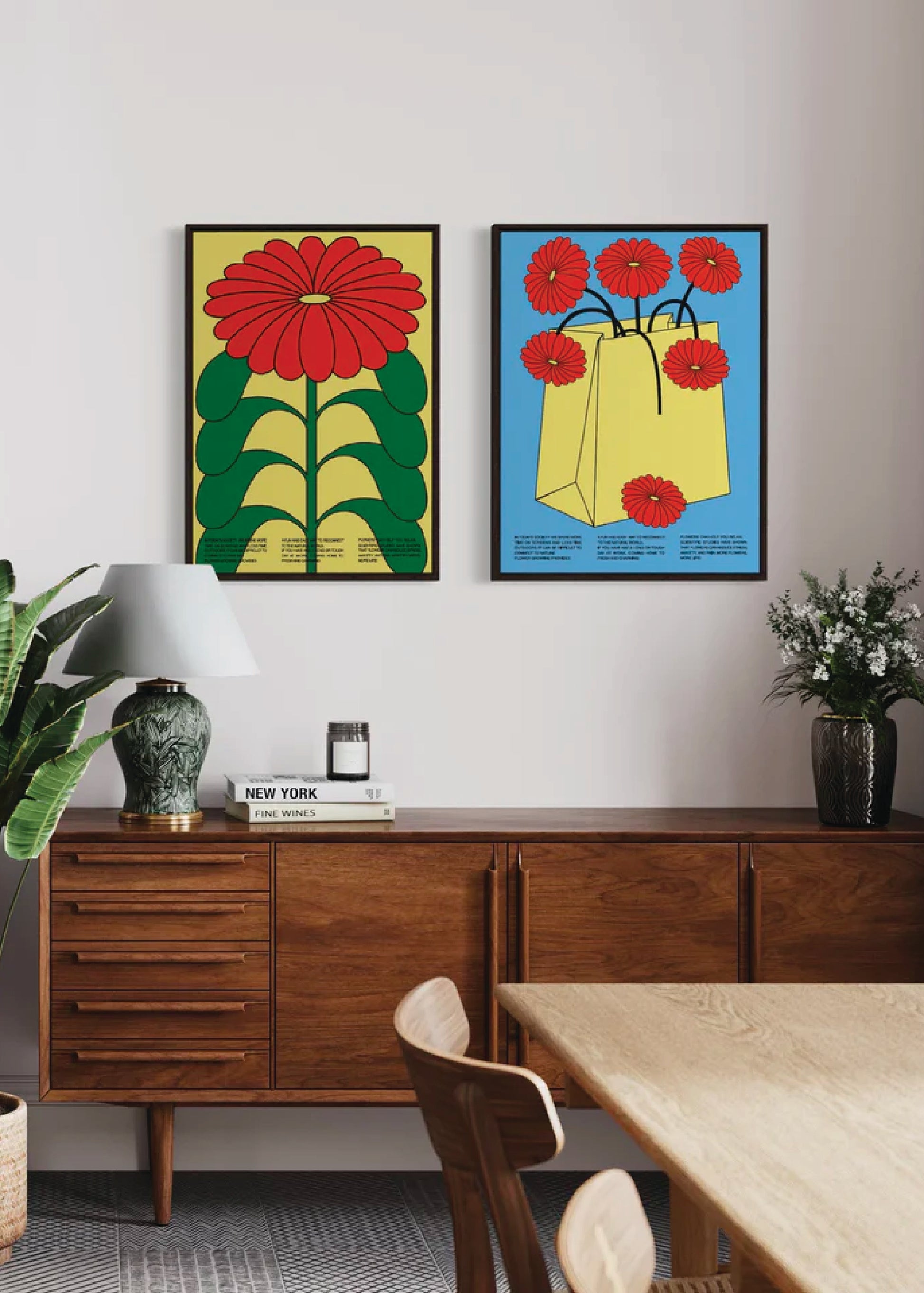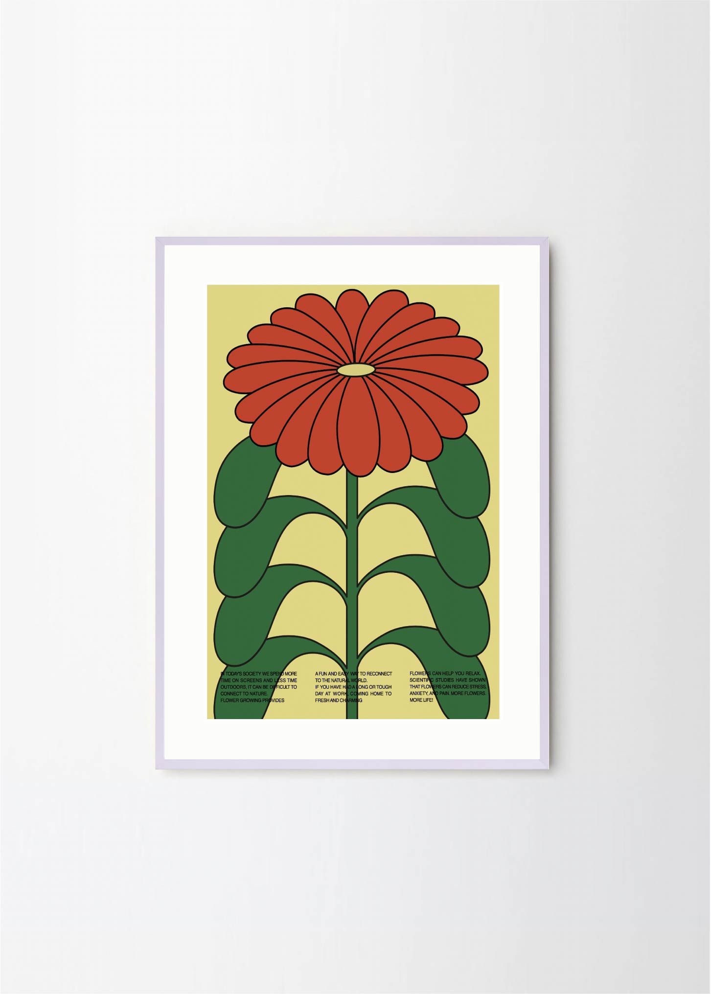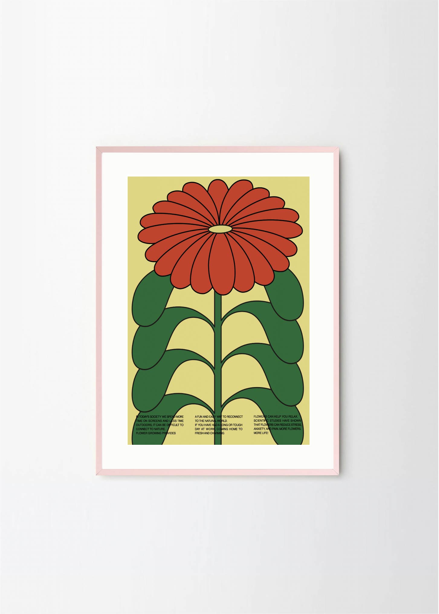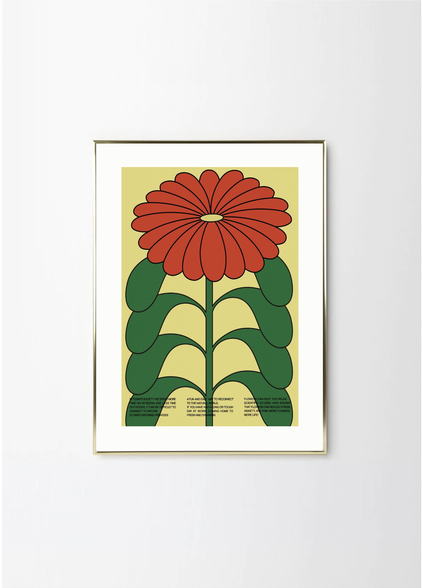 The artwork Big Flower depicts a red flower with a green stem and a yellow background in a portrait format. The red, yellow and green colors make Big Flower perfect for green, yellow or walnut colored frame, with or without passepartout.