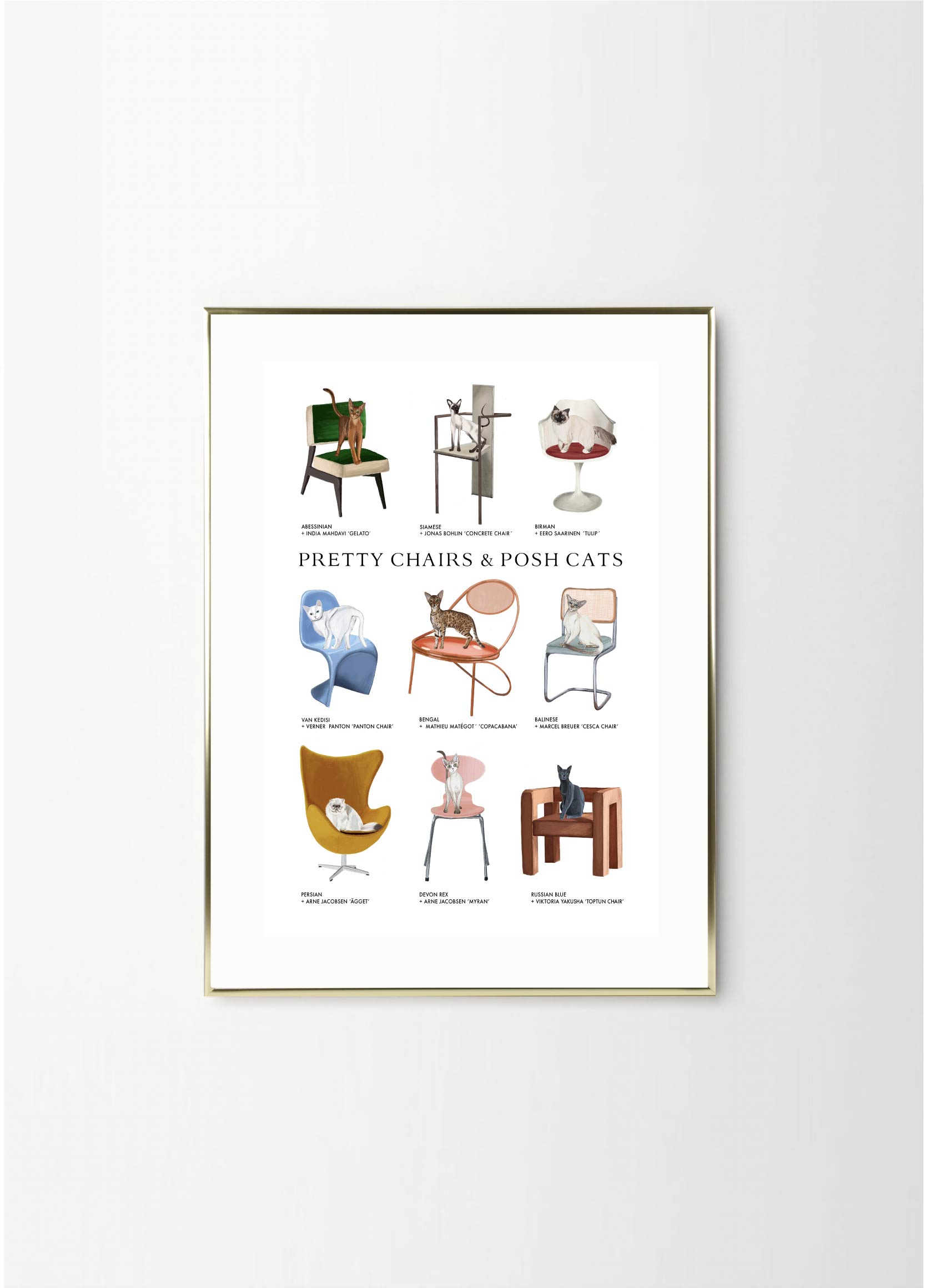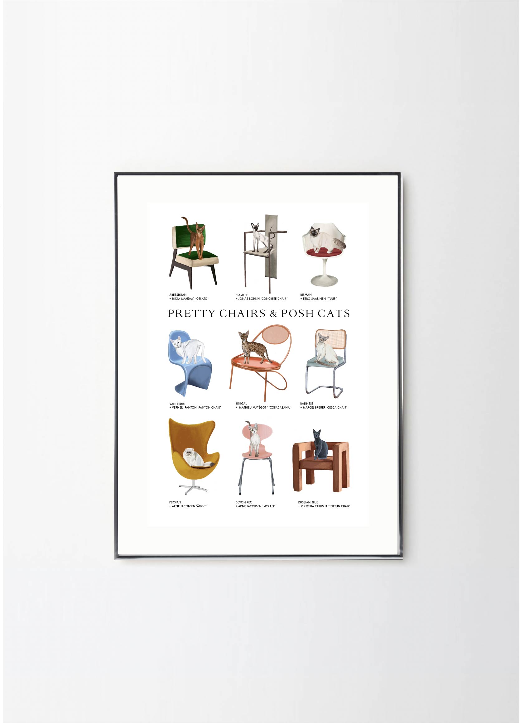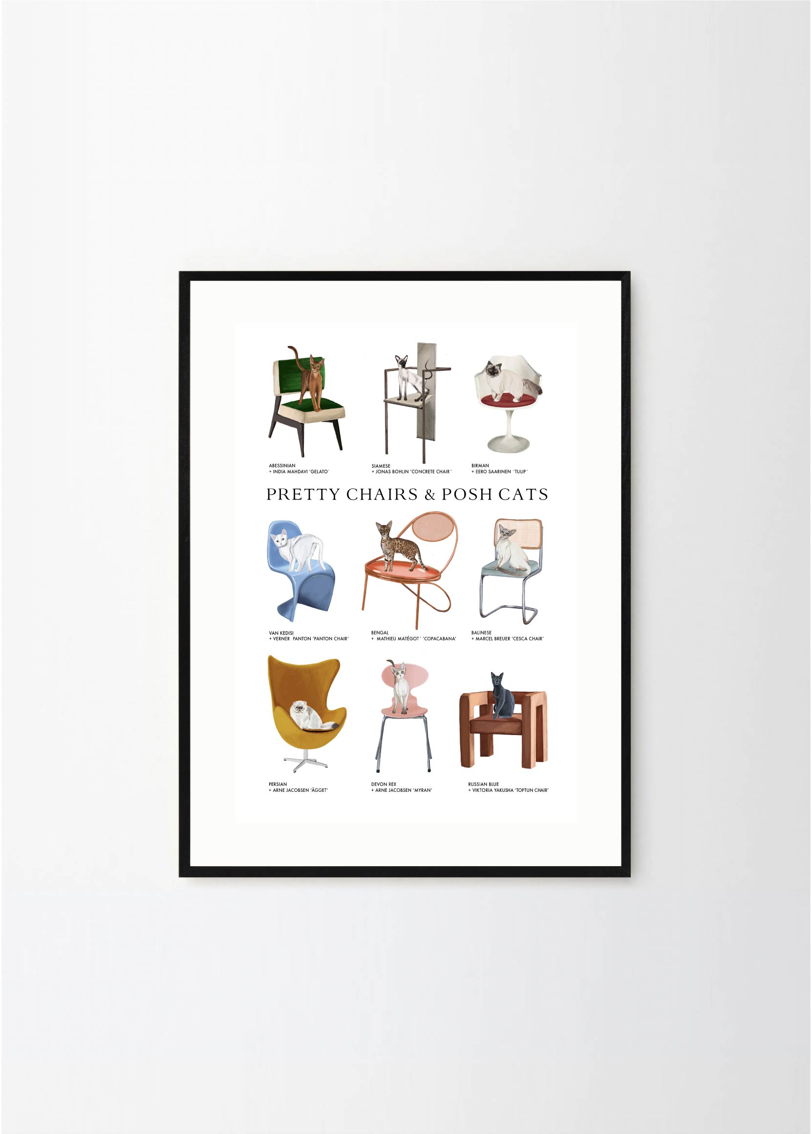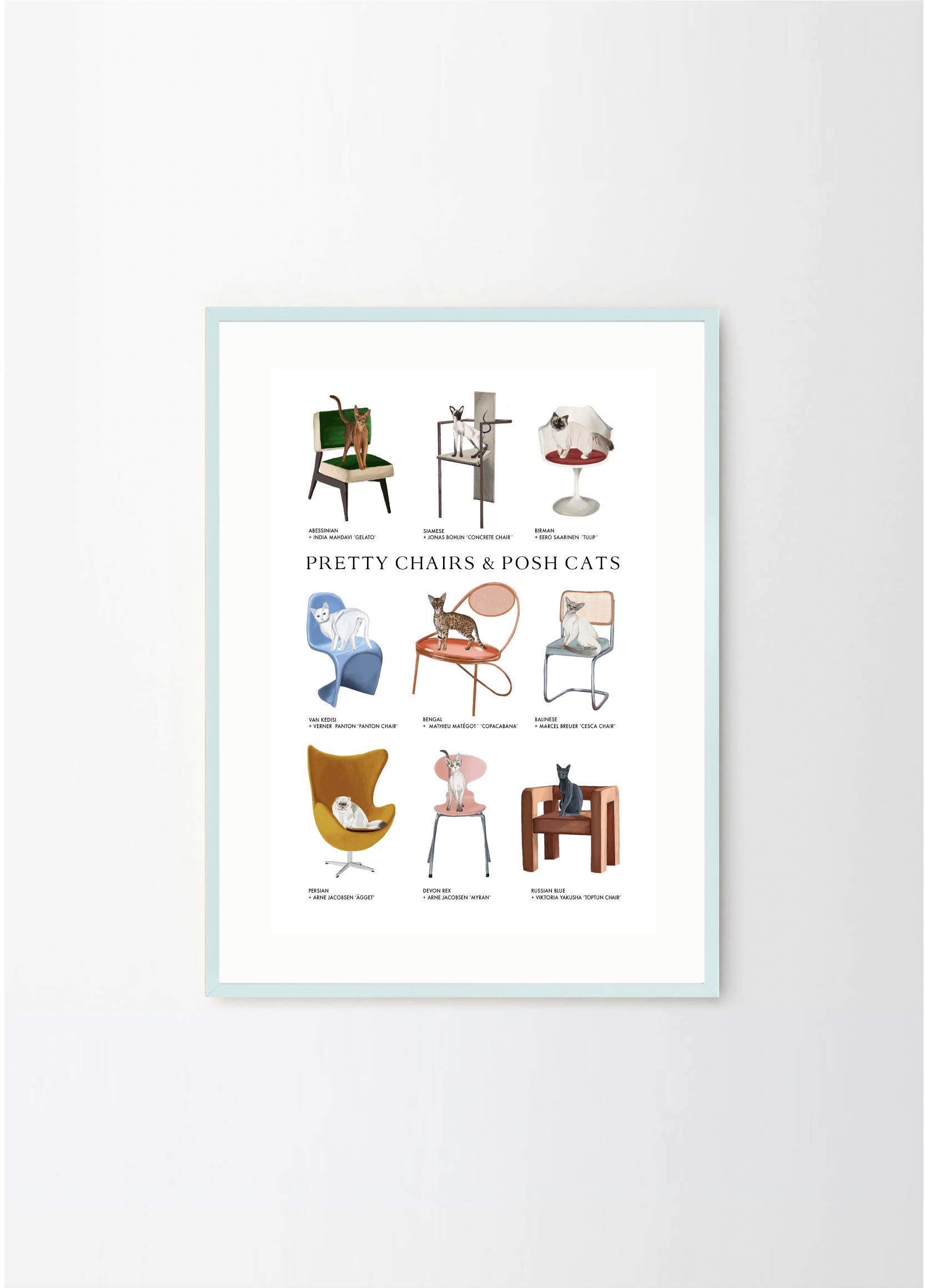This portrait format poster depicts a colorful illustration of pretty cats in posh chairs. The artworks many colors makes it perfect for almost all frames, with or without a passepartout.