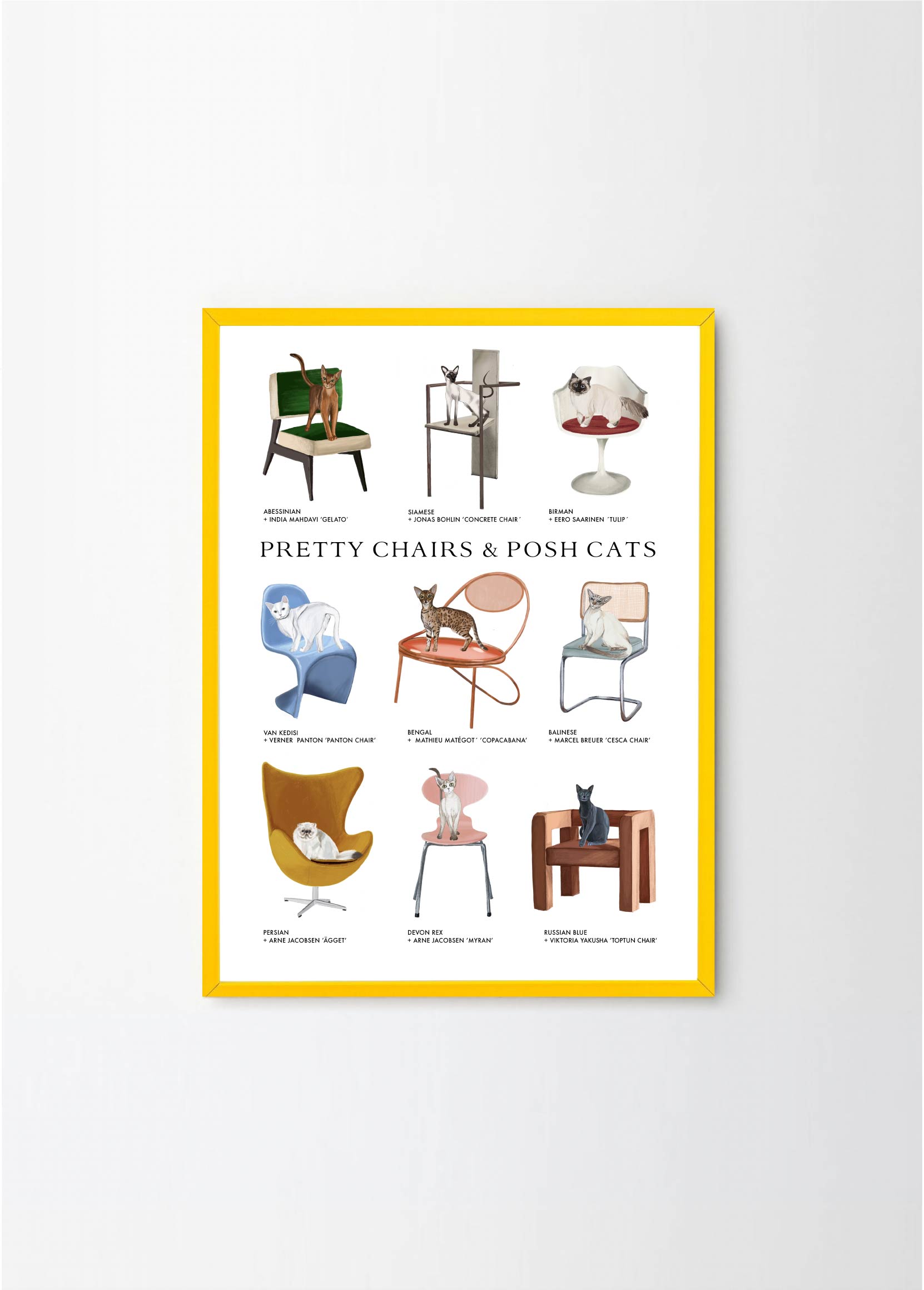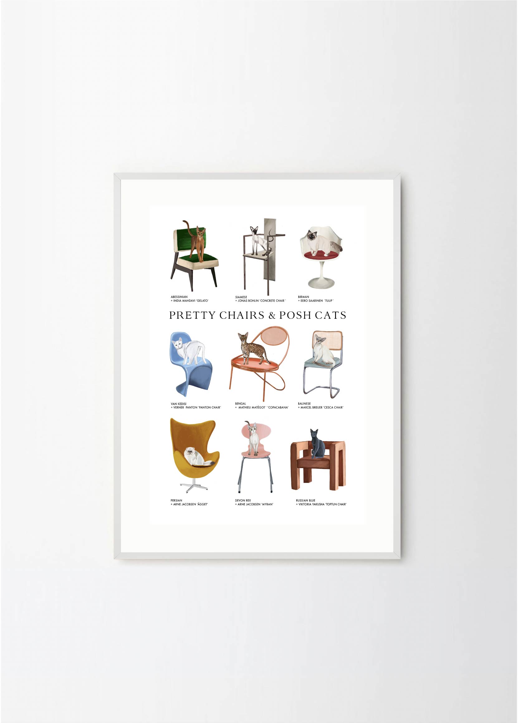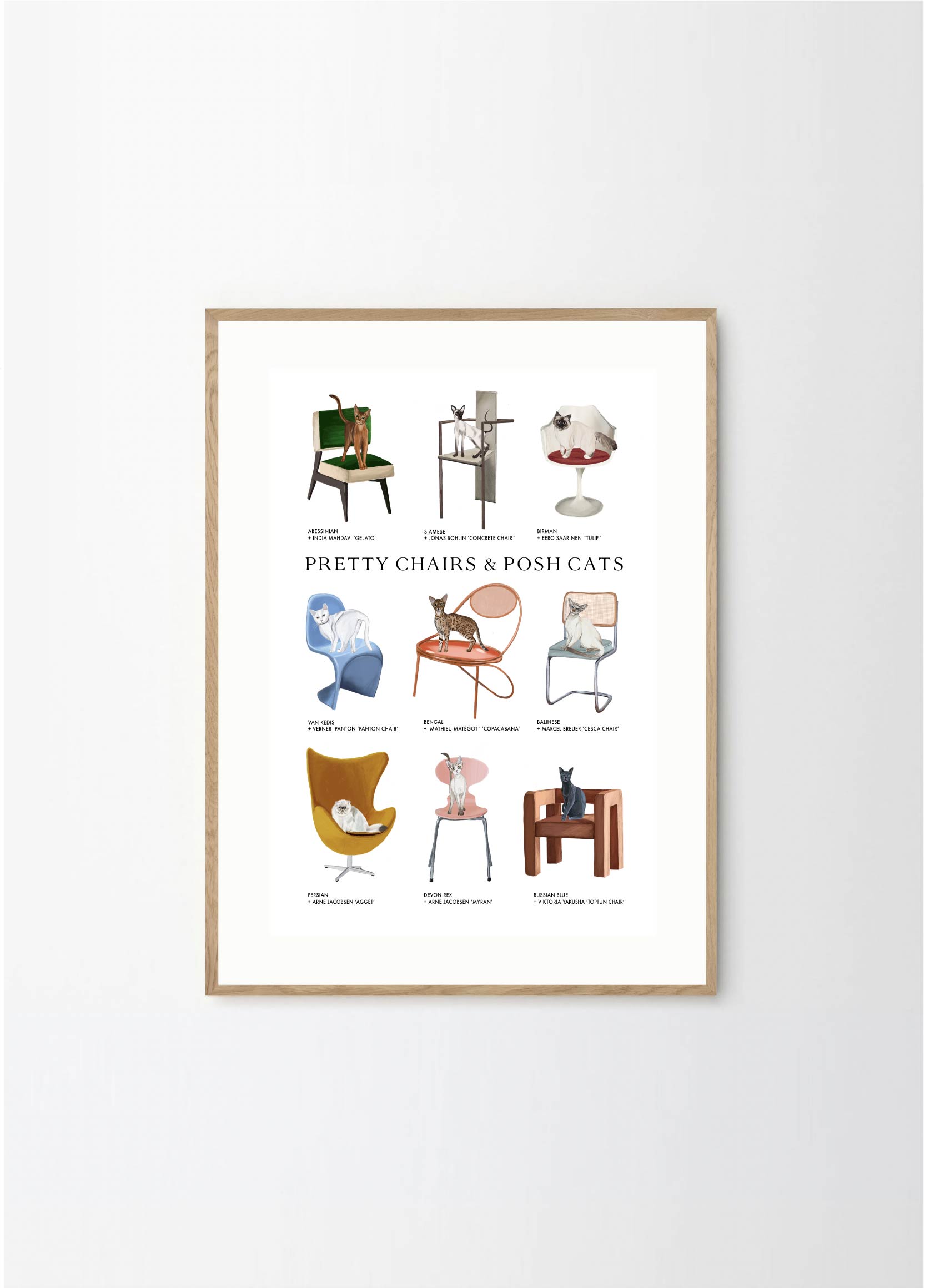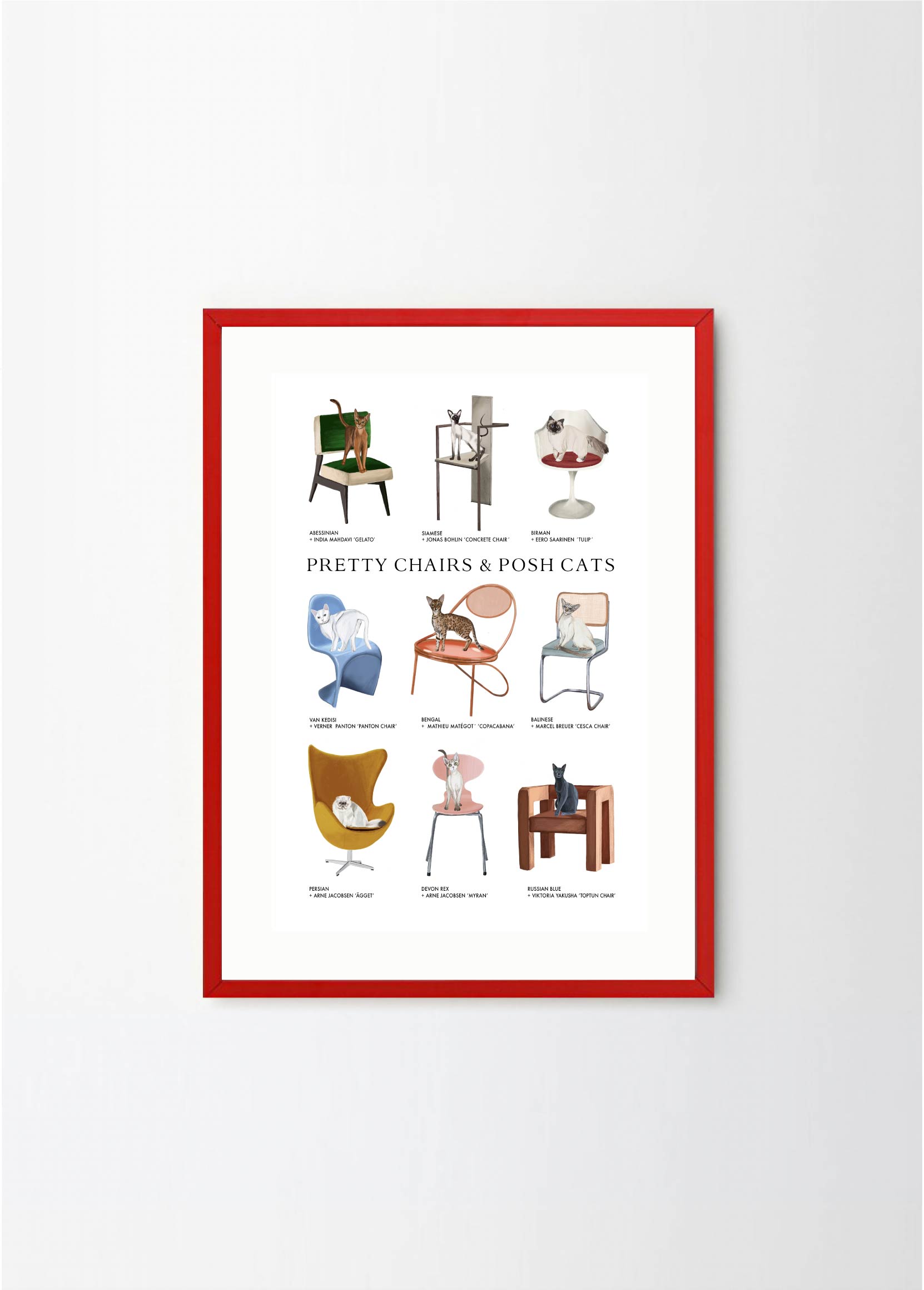 This portrait format poster depicts a colorful illustration of pretty cats in posh chairs. The artworks many colors makes it perfect for almost all frames, with or without a passepartout.