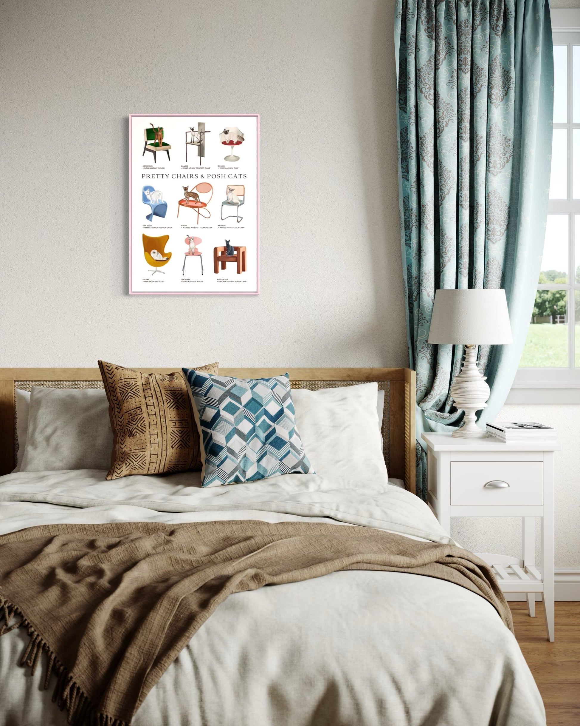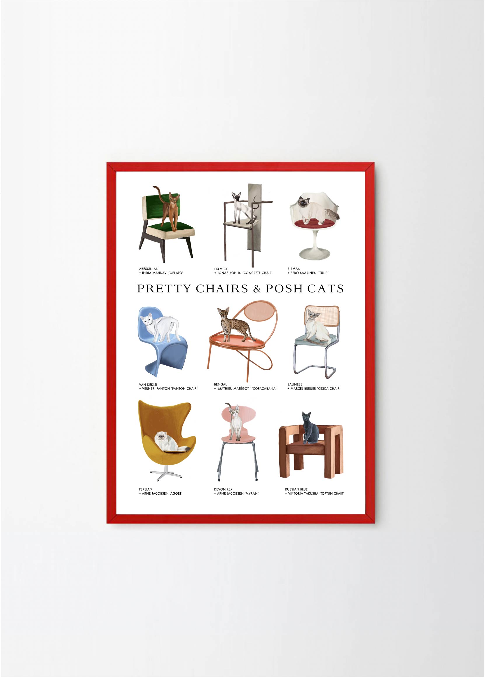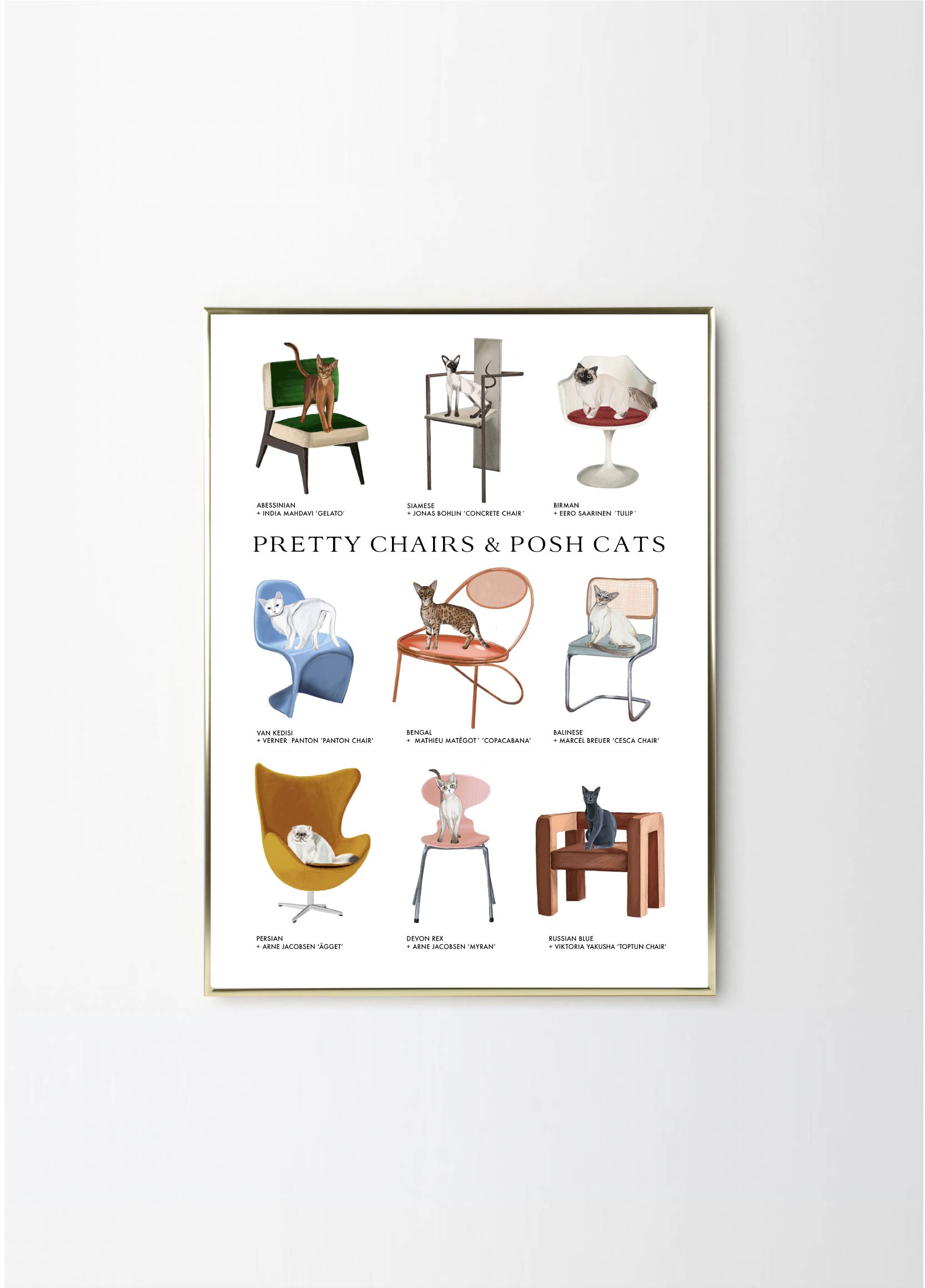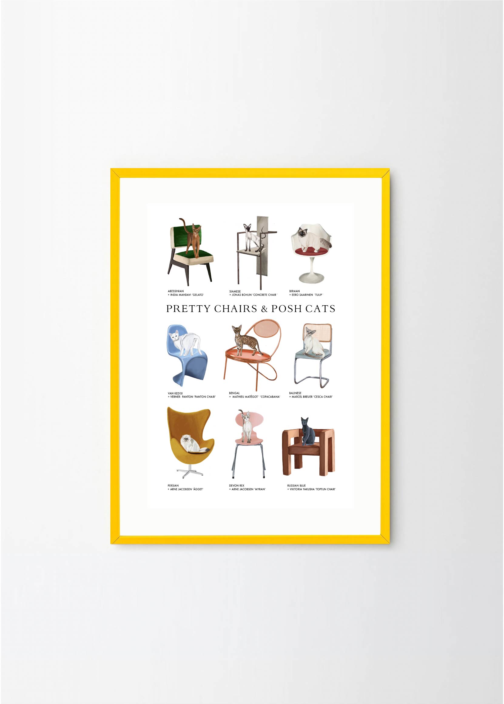 This portrait format poster depicts a colorful illustration of pretty cats in posh chairs. The artworks many colors makes it perfect for almost all frames, with or without a passepartout.