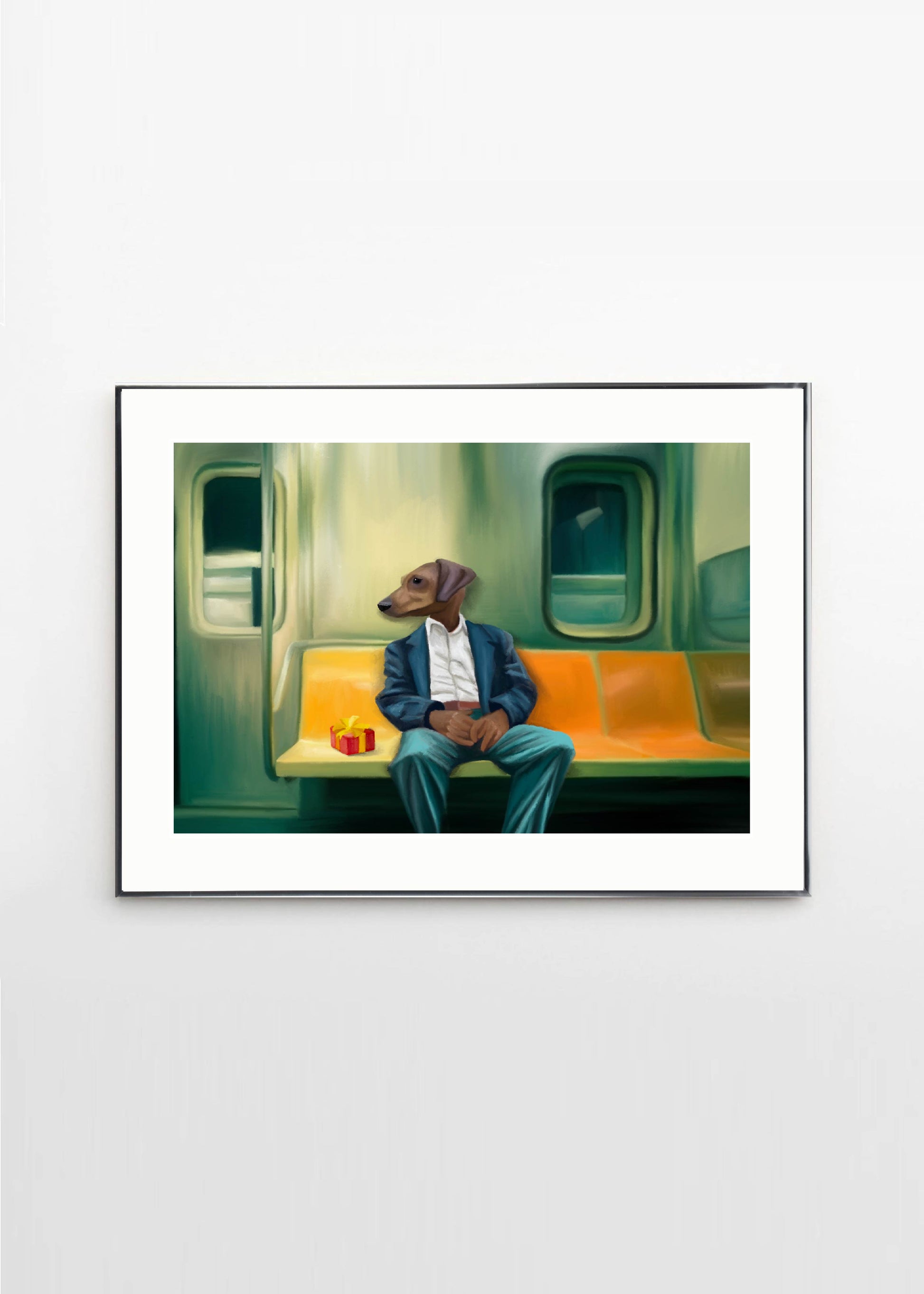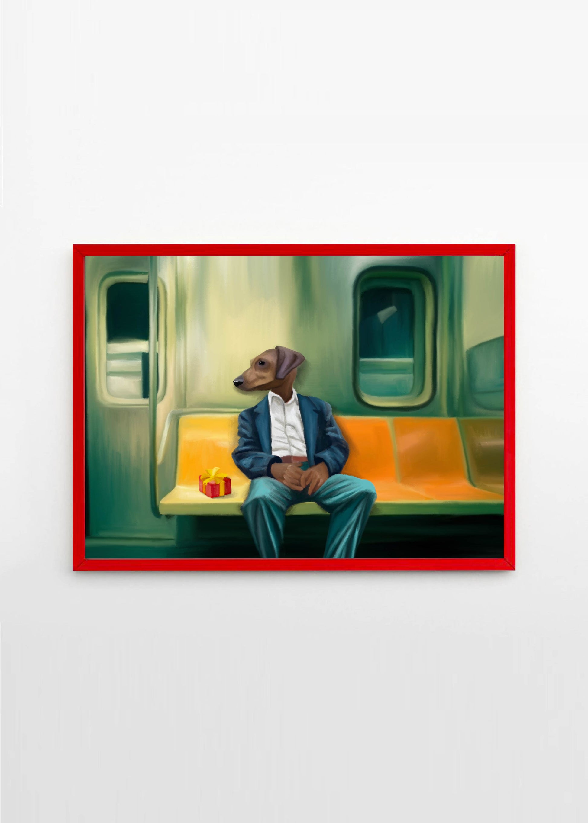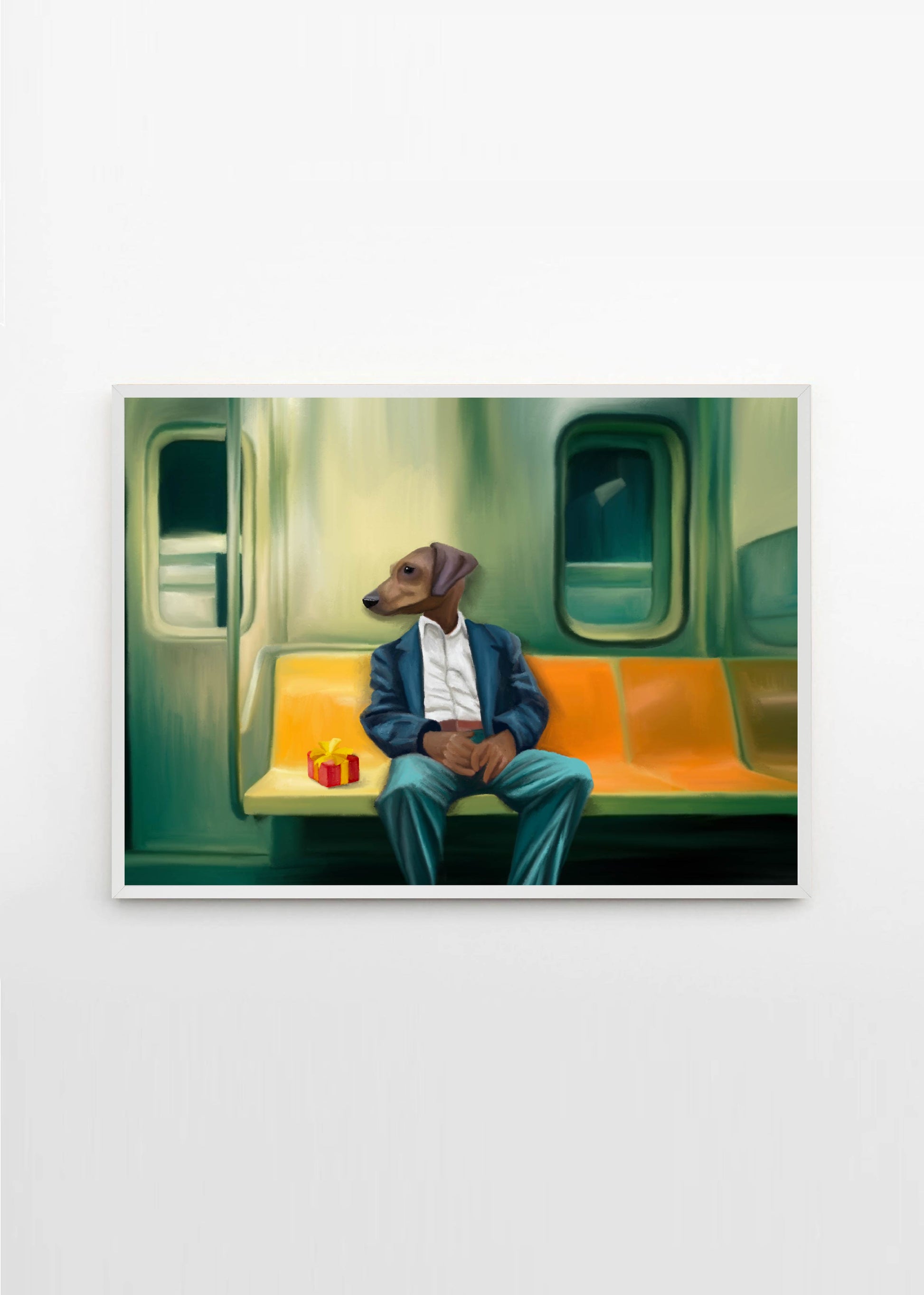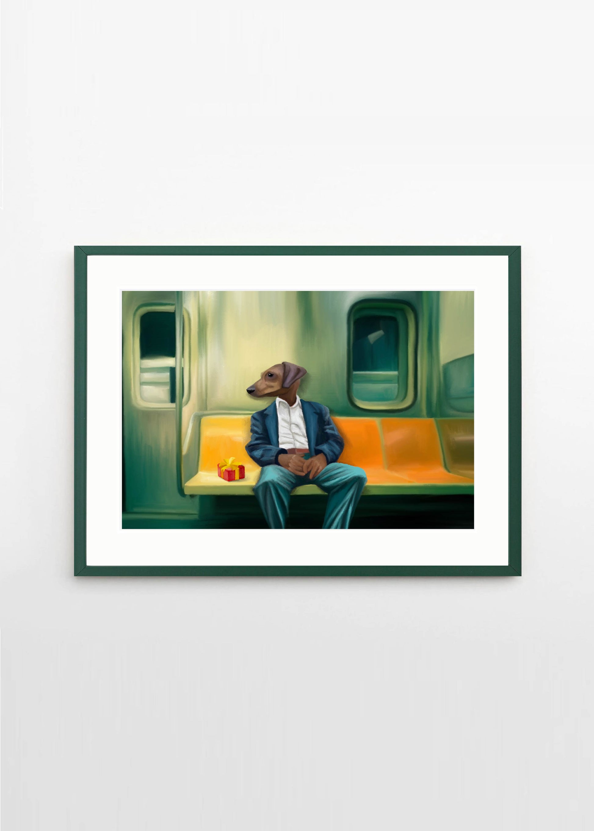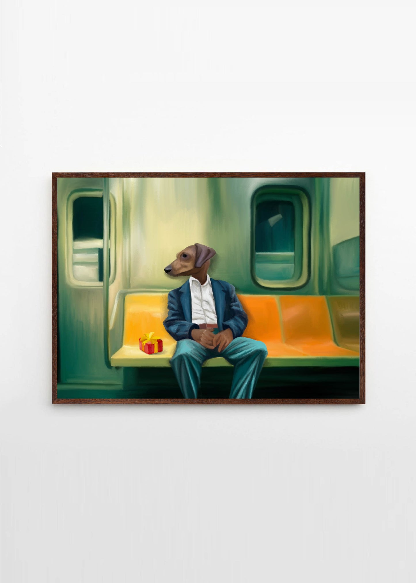 This unique poster in a landscpace format depicts Noah with a present in the Stockholm subway. The green and brown colors makes Noah perfect for a green or walnut frame. A significant characteristic of Estelle Graf's work is that she almost always works with satire.