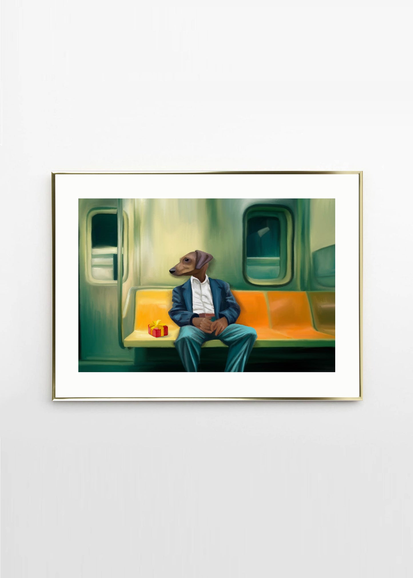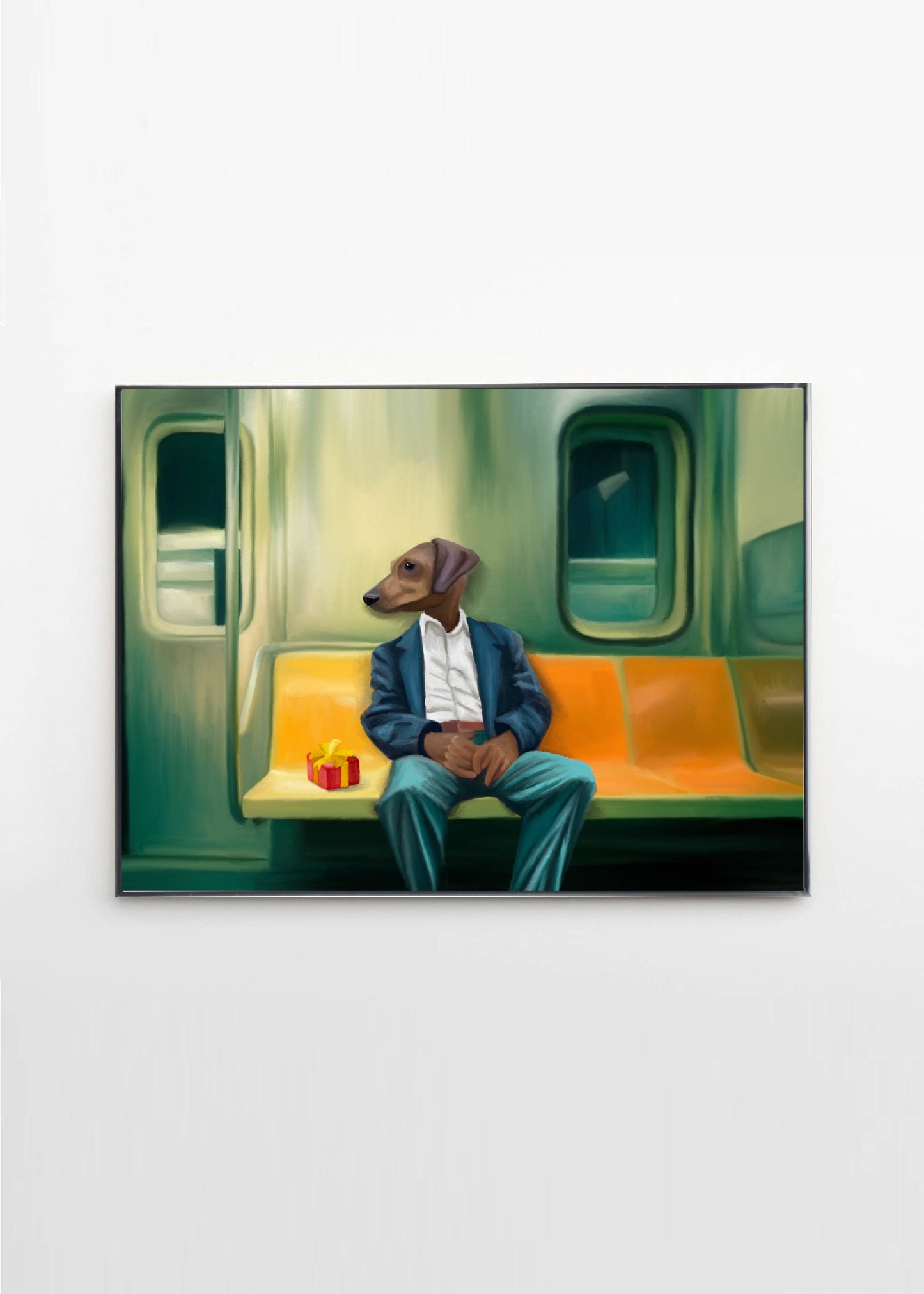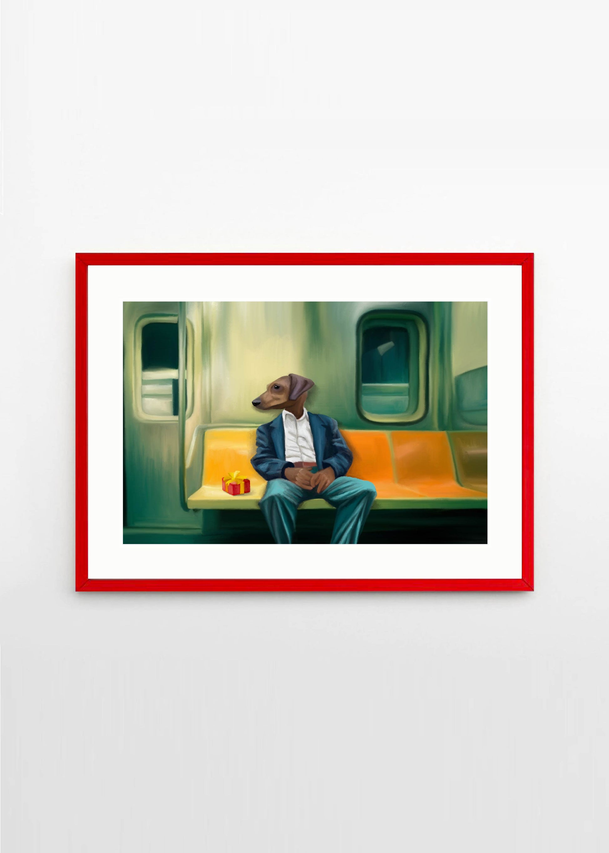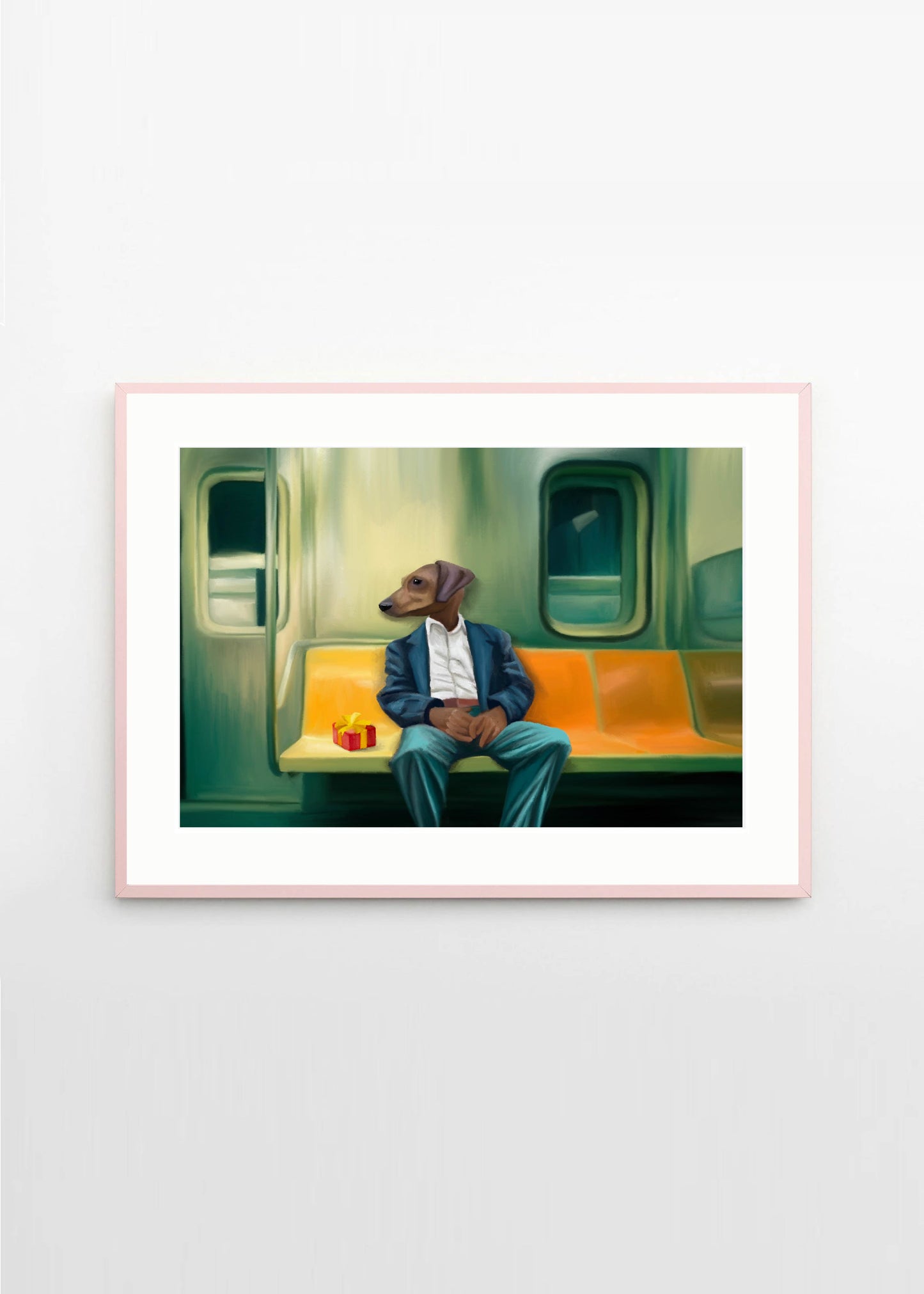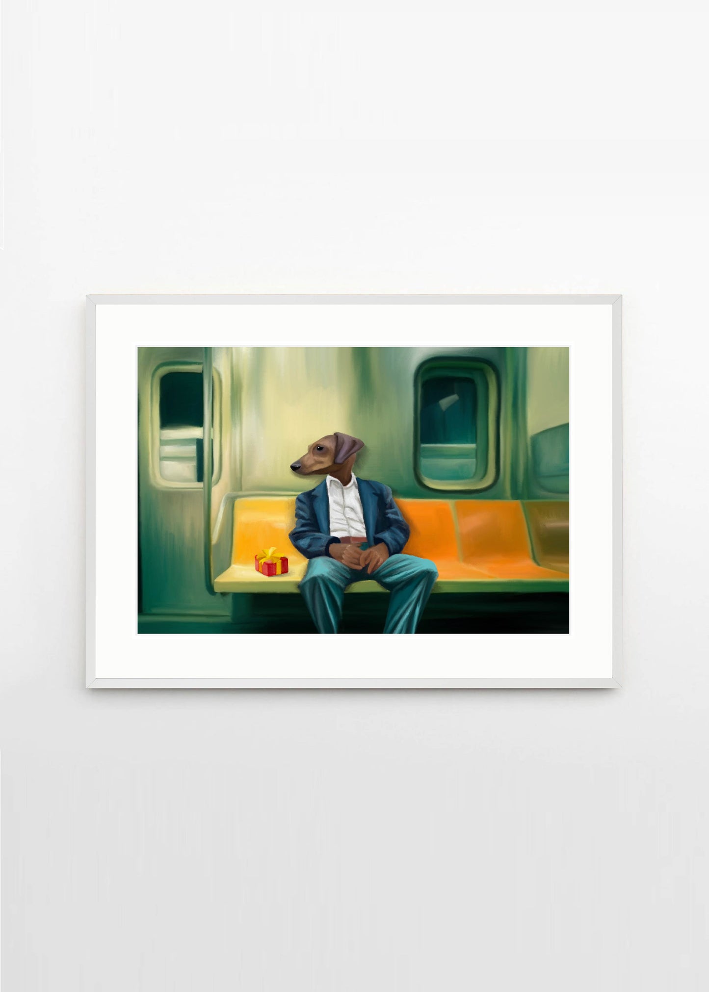This unique poster in a landscpace format depicts Noah with a present in the Stockholm subway. The green and brown colors makes Noah perfect for a green or walnut frame. A significant characteristic of Estelle Graf's work is that she almost always works with satire.