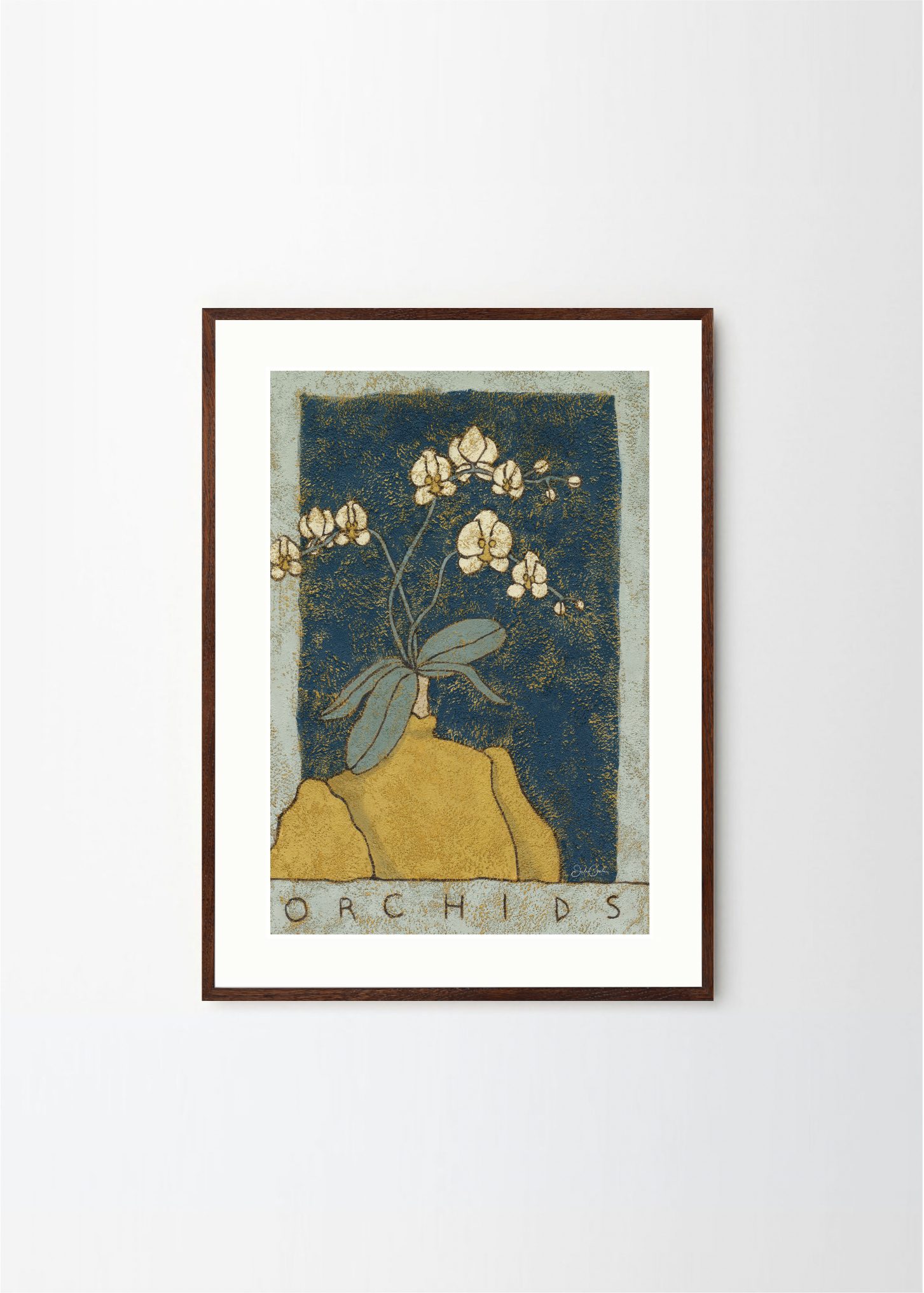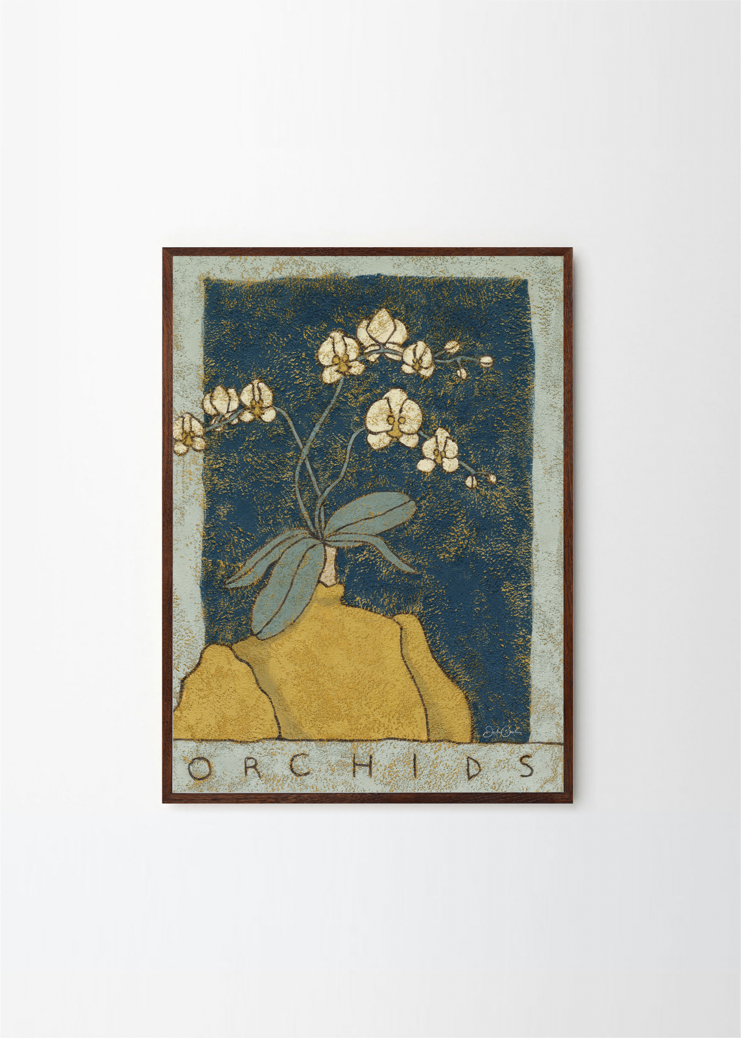 A delicate orchid stands rooted on warm ochre stone, framed by deep indigo and soft neutral tones. In Orchids, Julie Celina offers a serene botanical composition that balances strength and fragility—echoing the timeless resilience of nature.