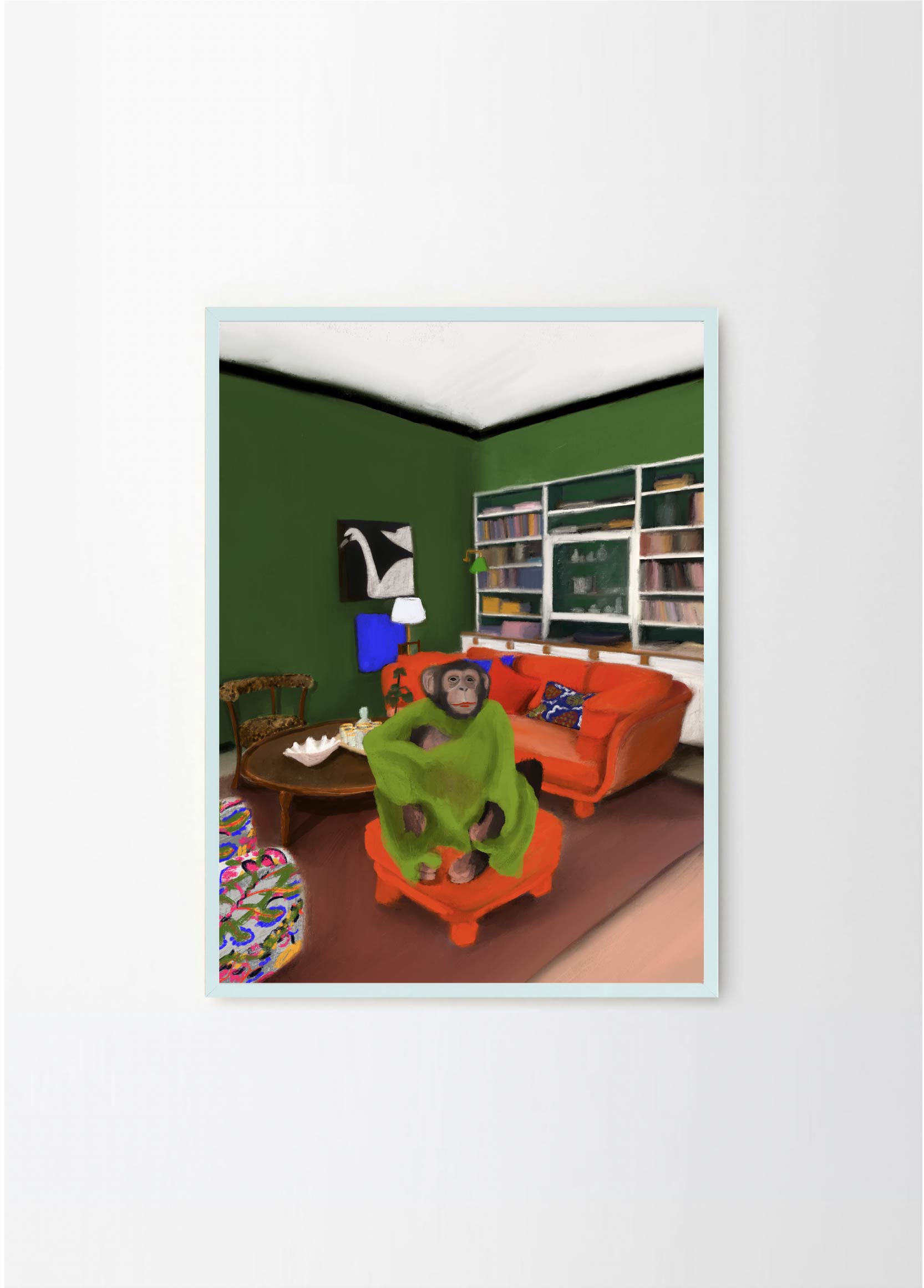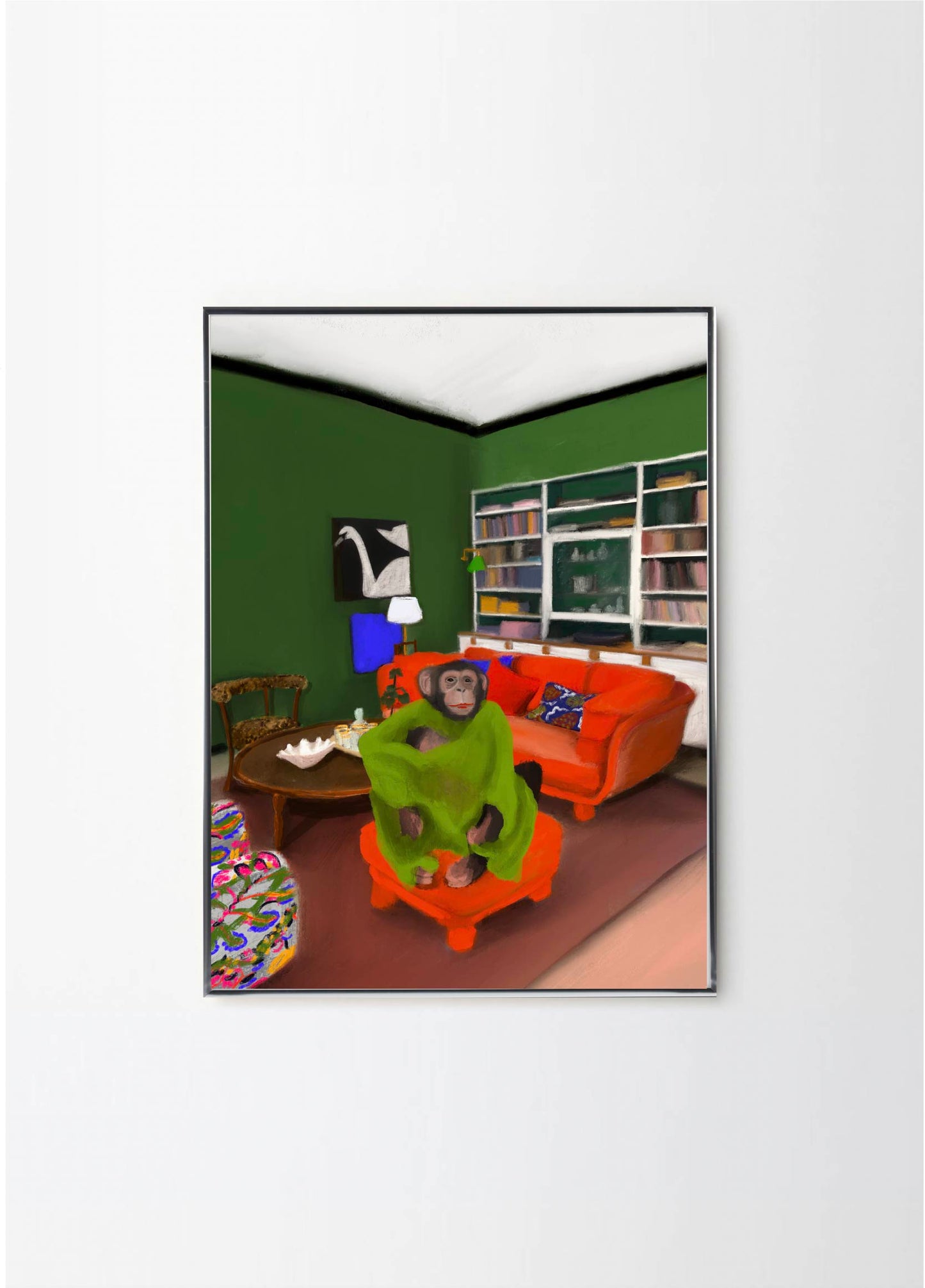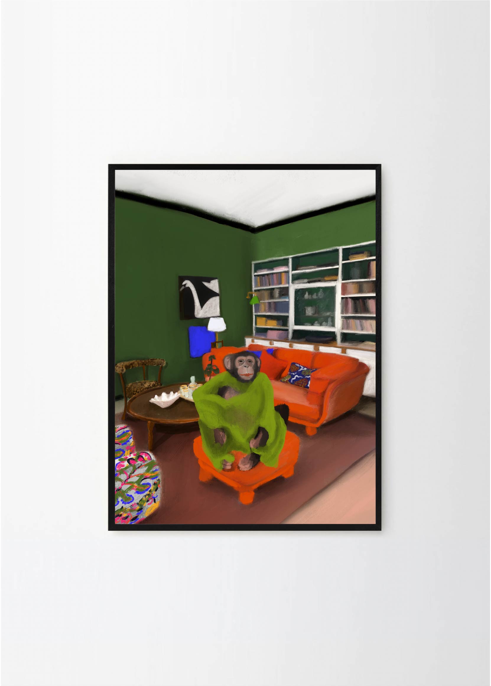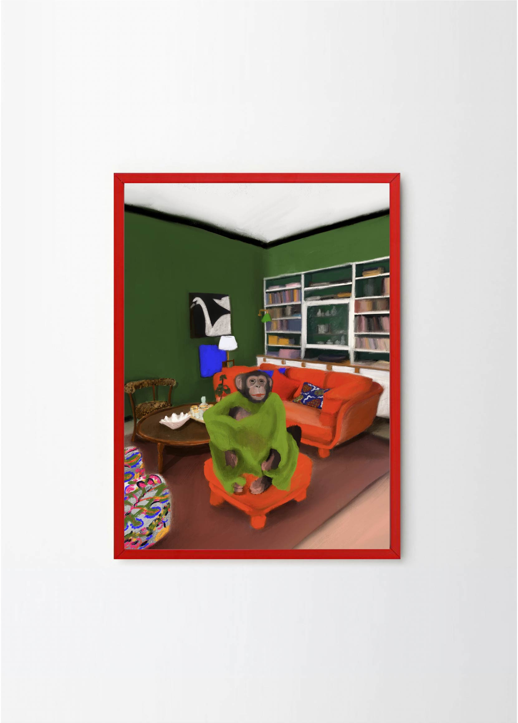 This poster in a portrait format depicts a money in his Stockholm apartment. The red, green and black colors makes Oväntad förbindelse perfect for a green or walnut frame. A significant characteristic of Estelle Graf's work is that she almost always works with satire.