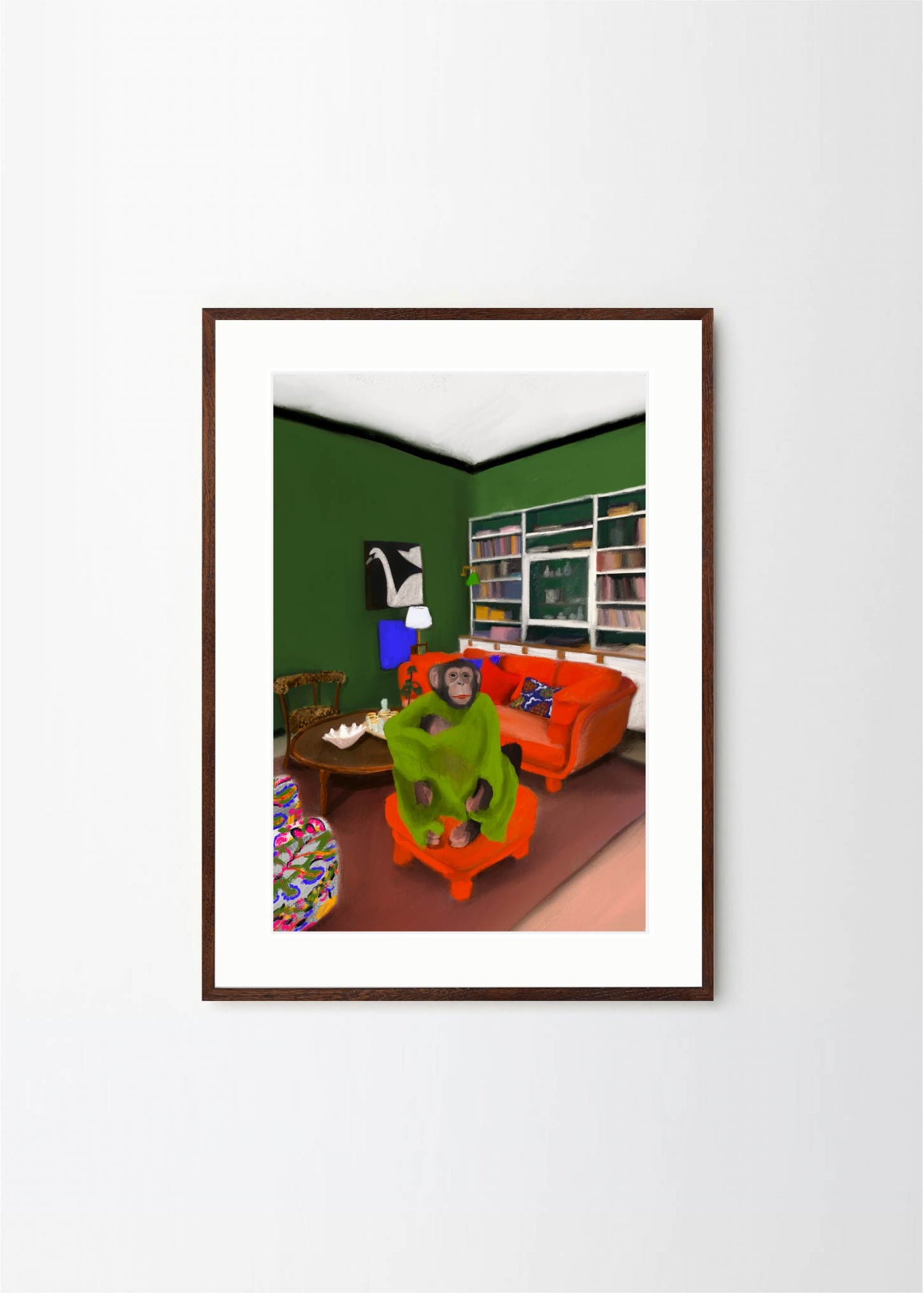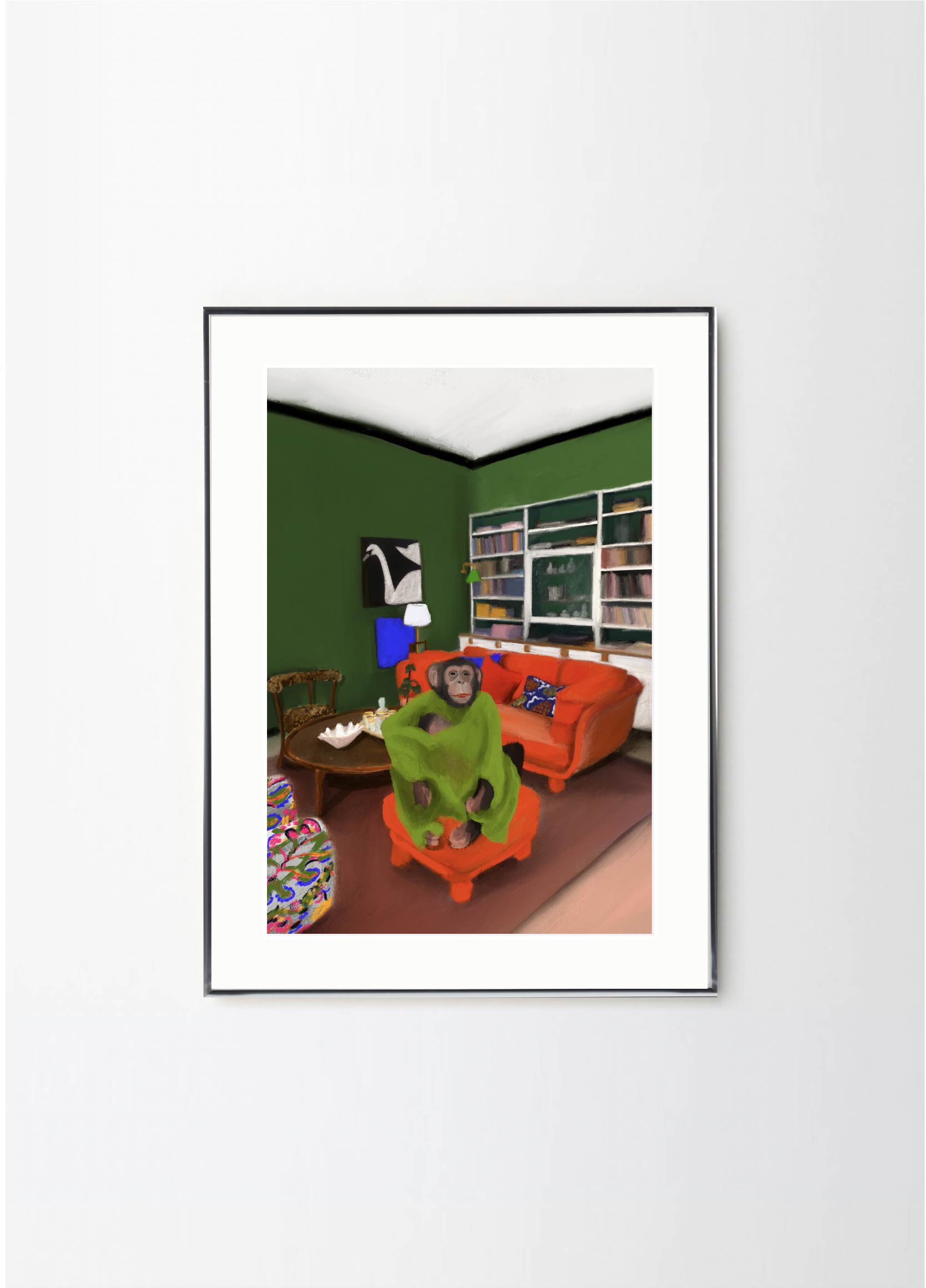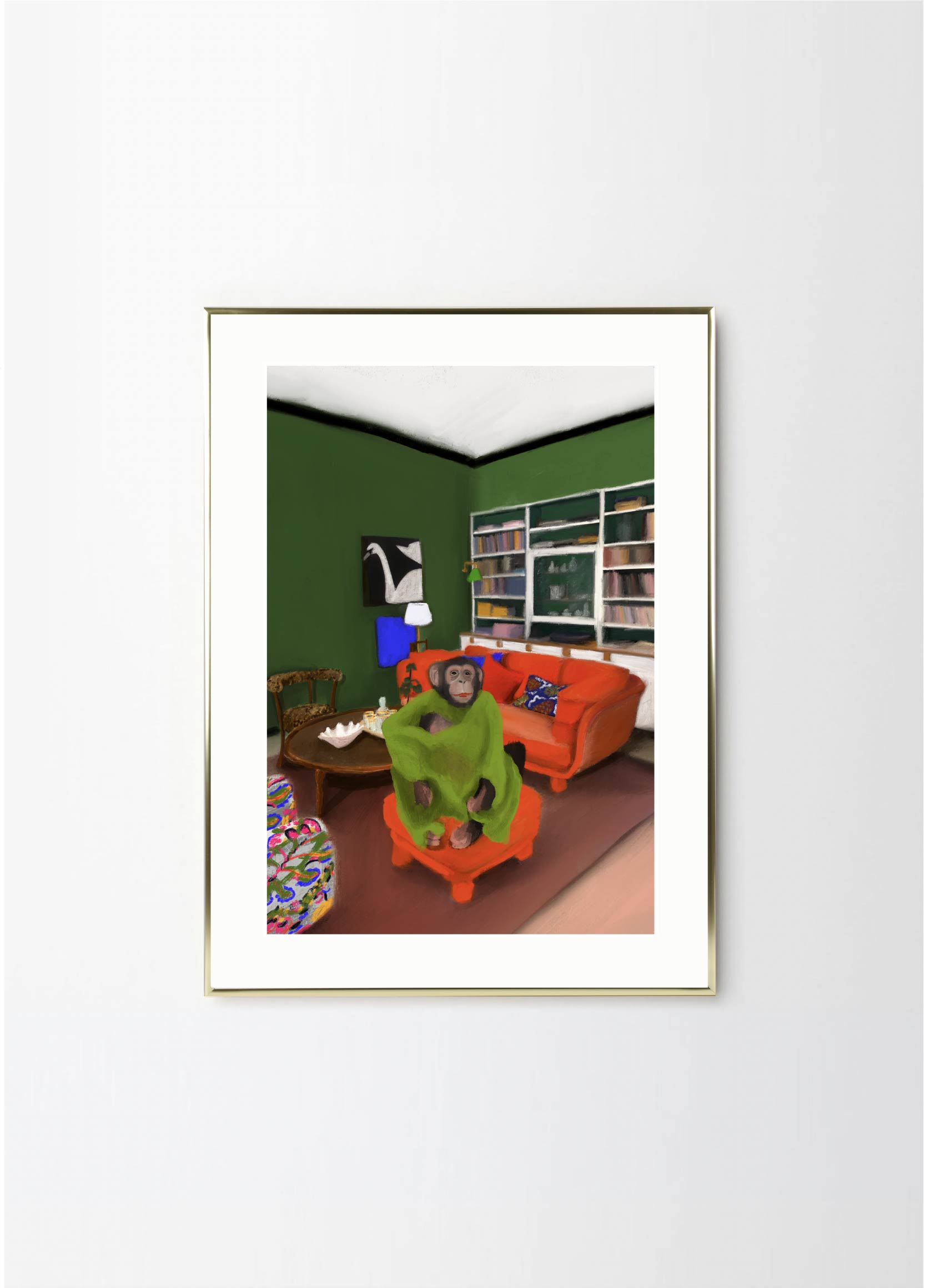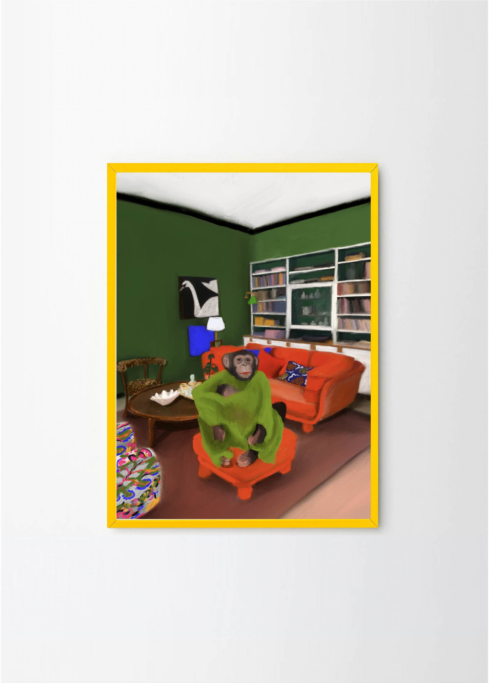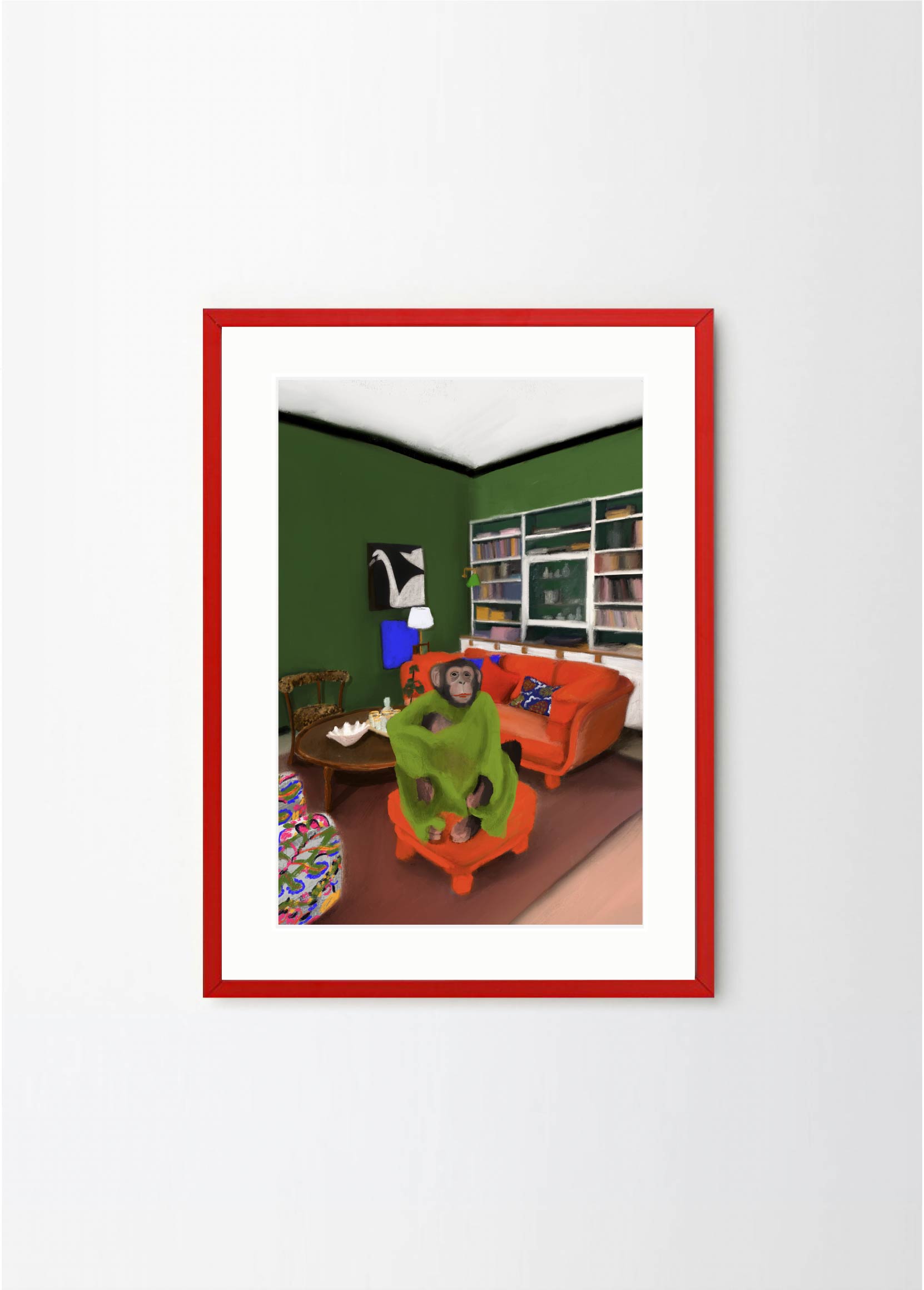 This poster in a portrait format depicts a money in his Stockholm apartment. The red, green and black colors makes Oväntad förbindelse perfect for a green or walnut frame. A significant characteristic of Estelle Graf's work is that she almost always works with satire.
