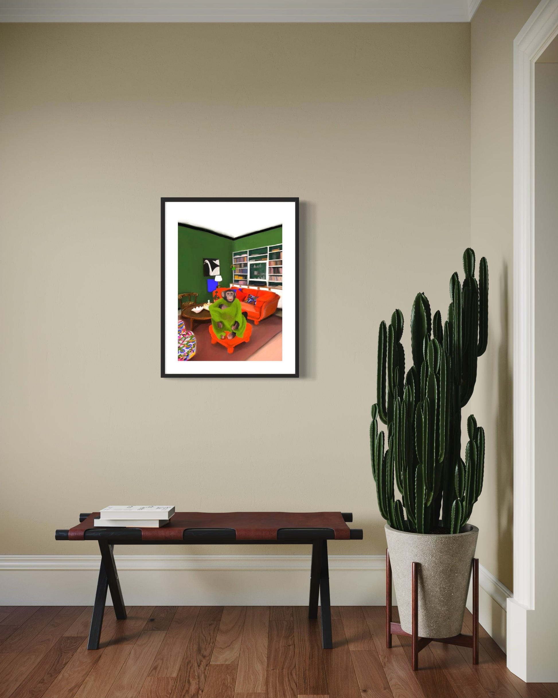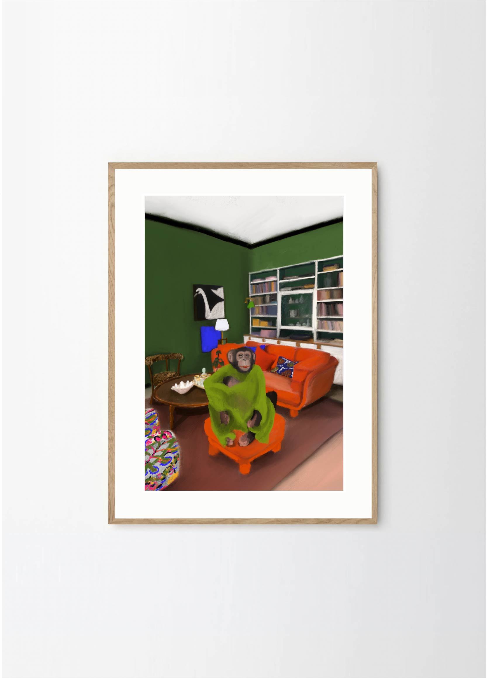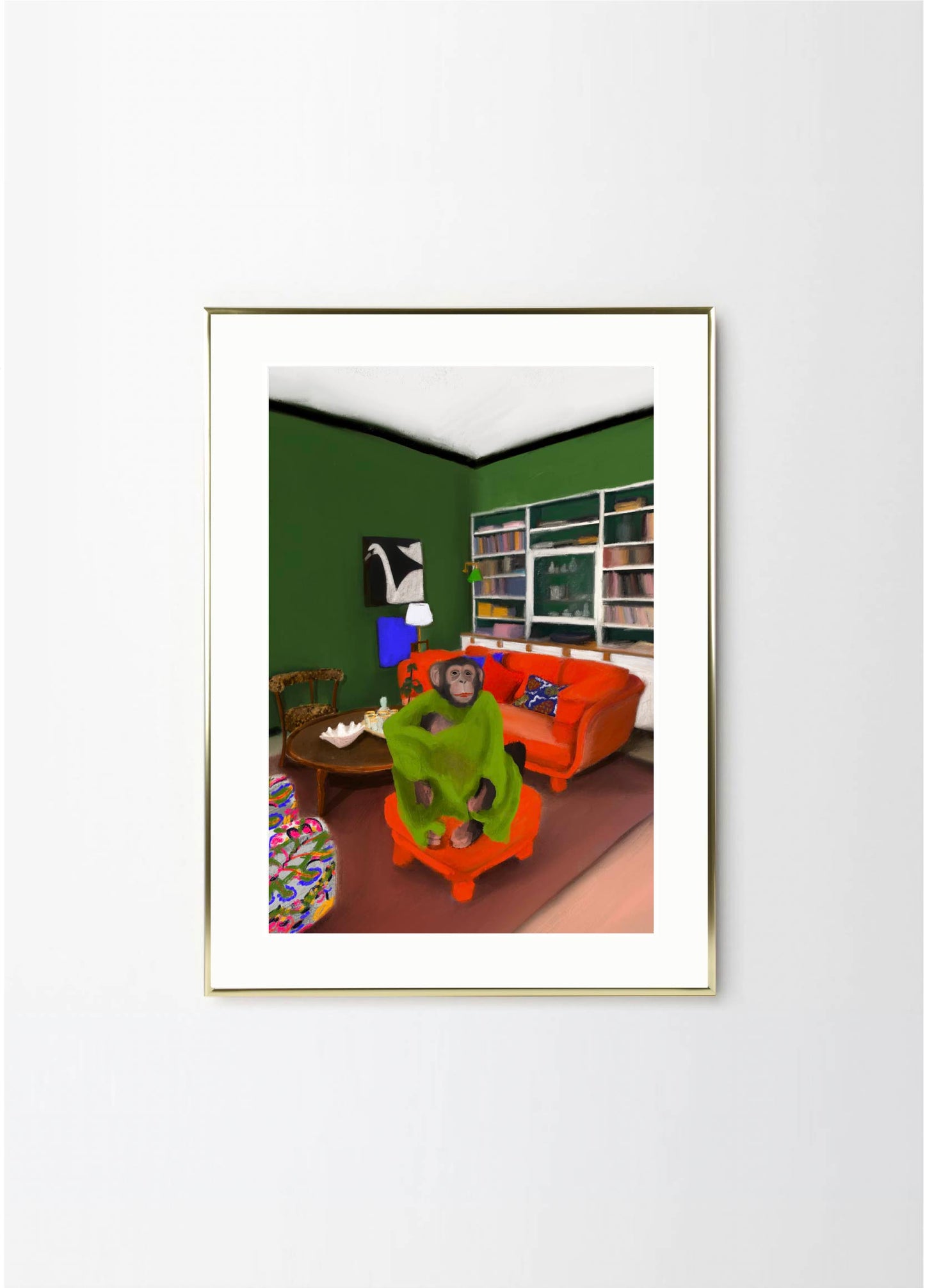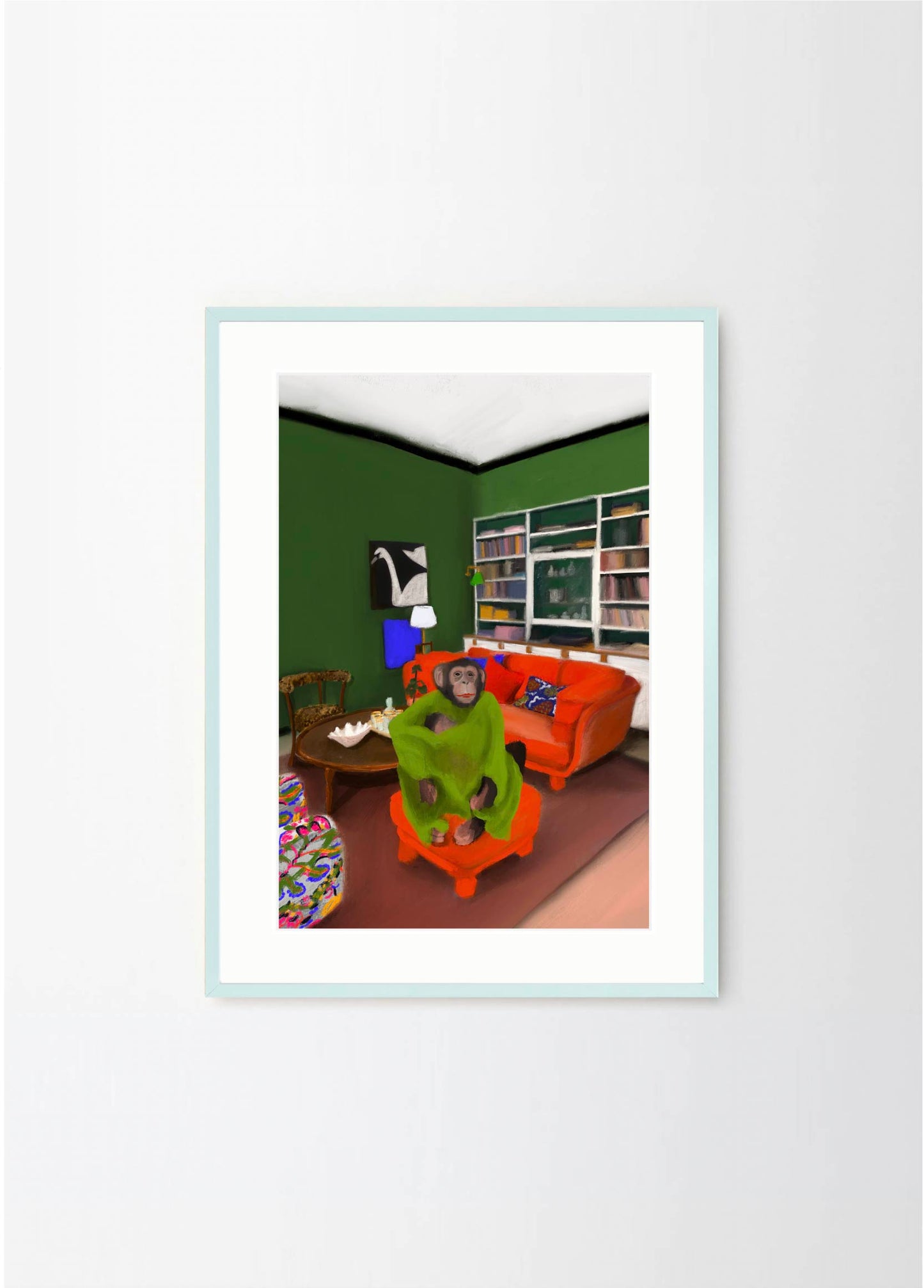 This poster in a portrait format depicts a money in his Stockholm apartment. The red, green and black colors makes Oväntad förbindelse perfect for a green or walnut frame. A significant characteristic of Estelle Graf's work is that she almost always works with satire.