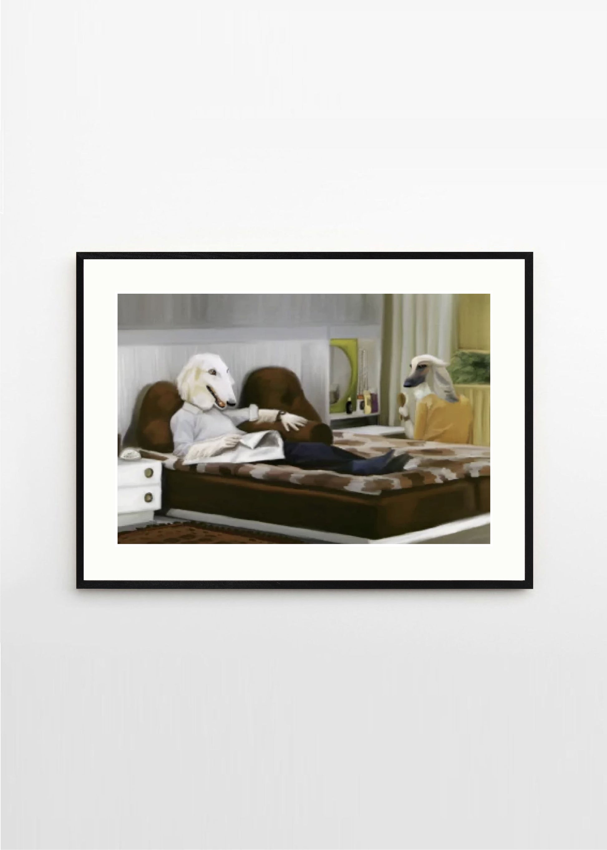 This poster in a portrait format depicts a couple of greyhounds, it could almost be an Ikea commercial too. The beige, yellow and earthy tones makes it perfect for an oak frame. A significant characteristic of Estelle Graf's work is that she almost always works with satire.