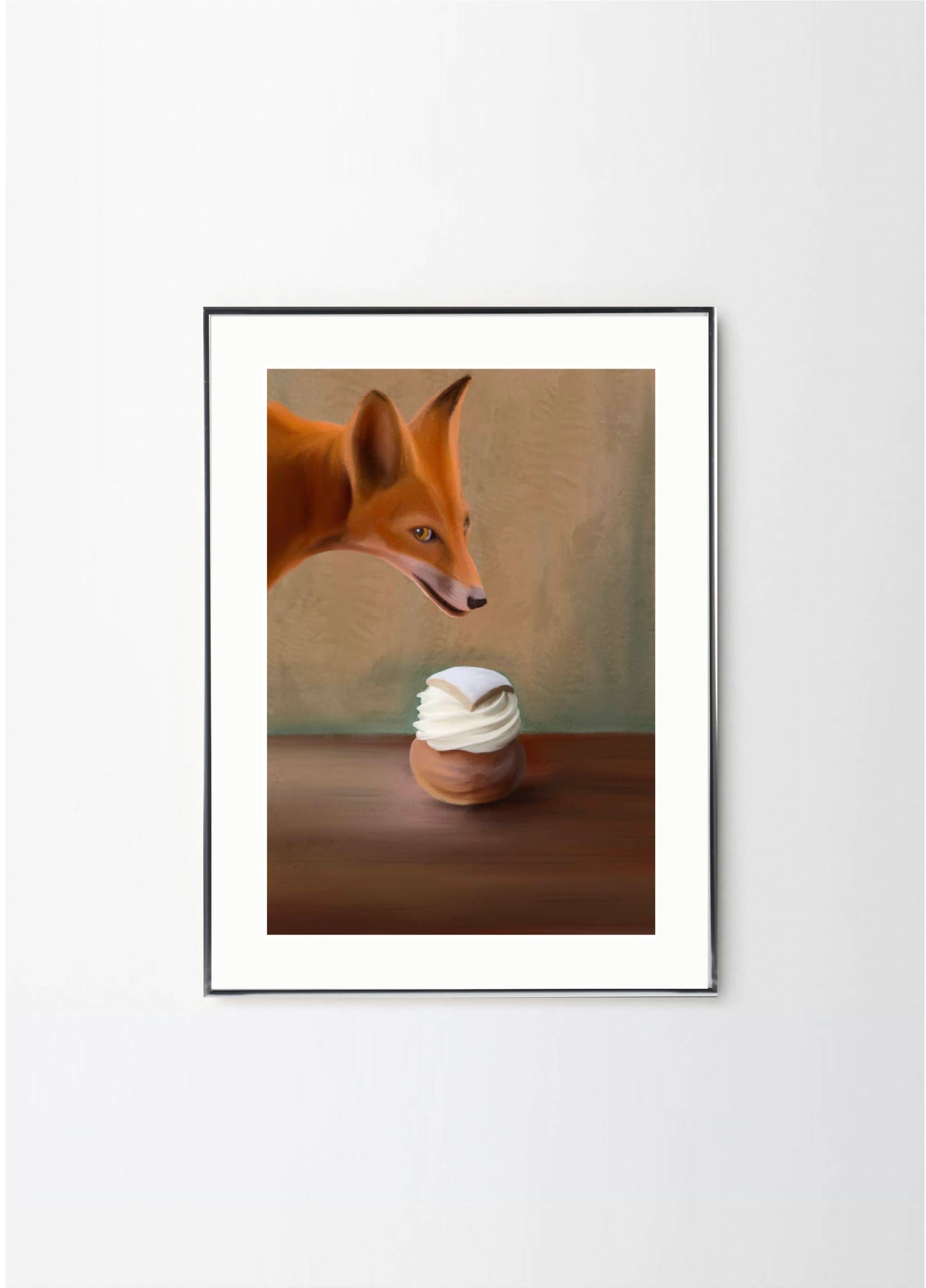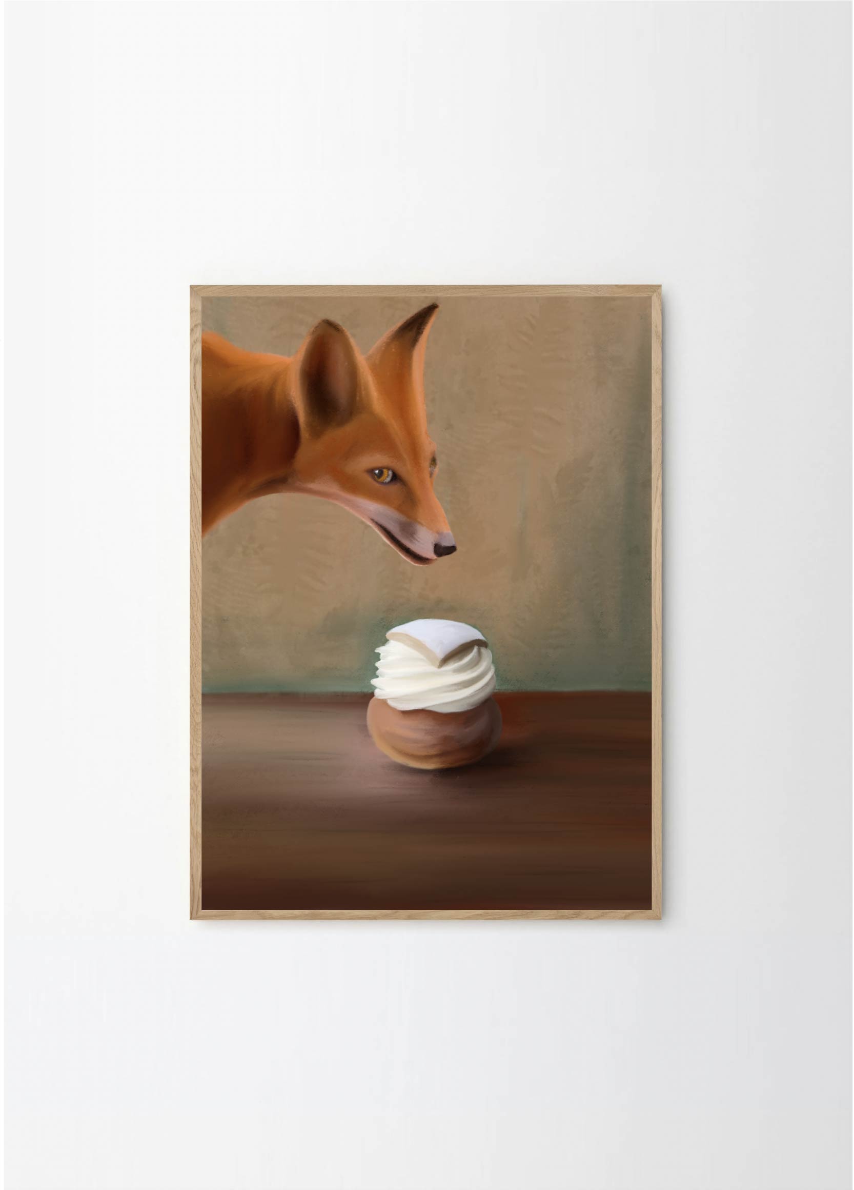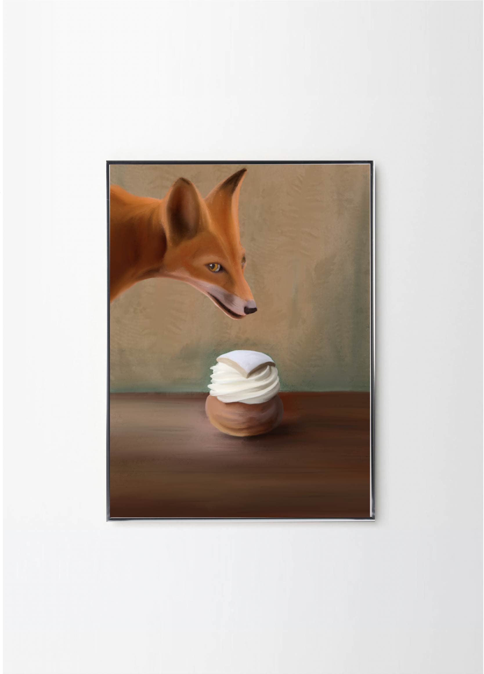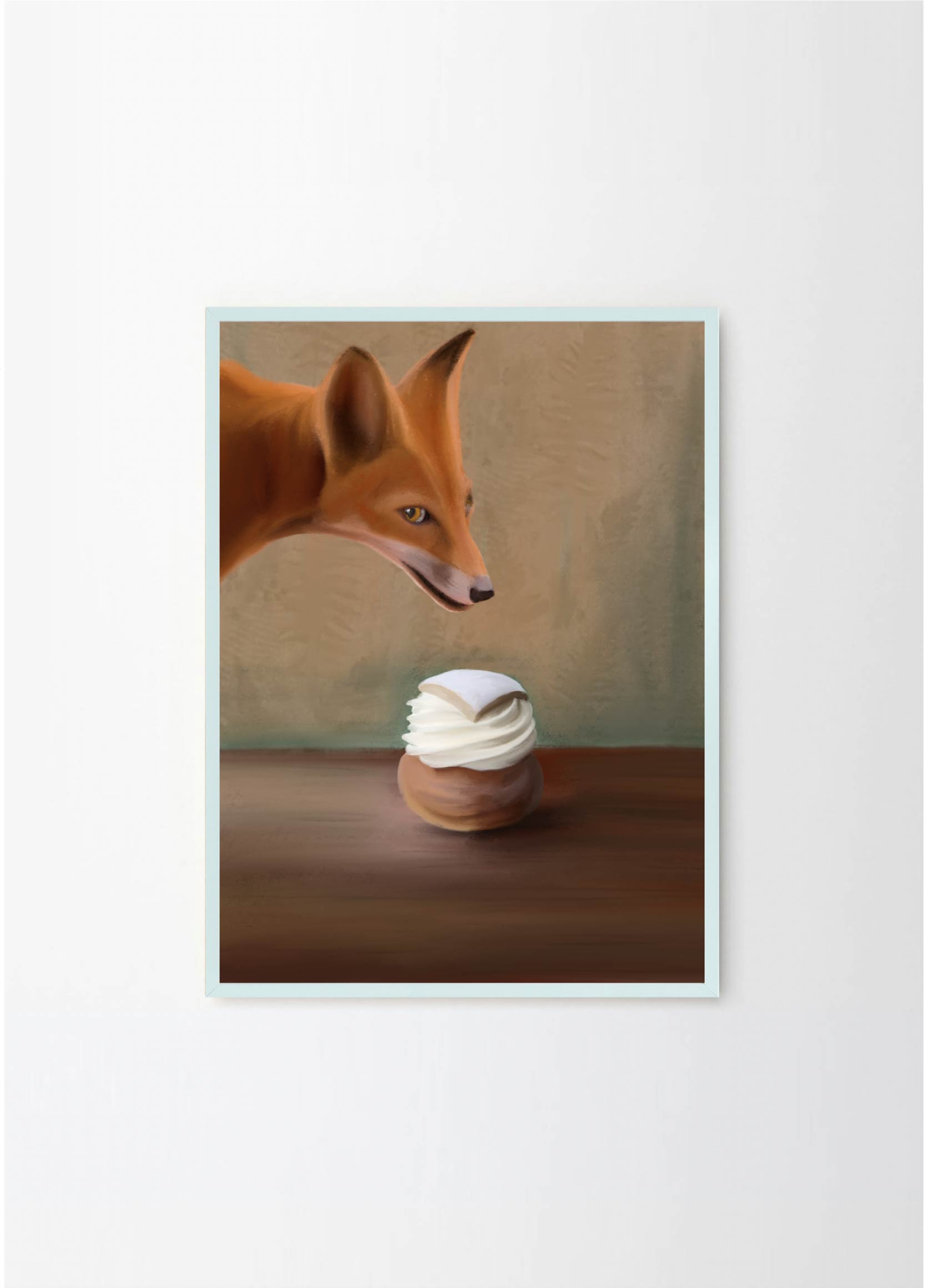 This poster in a portrait format depicts a fox on his way to prey on a Semla, a traditional Swedish bake goods. The beige, brown and orange tones makes it perfect for a walnut frame. A significant characteristic of Estelle Graf's work is that she almost always works with satire.