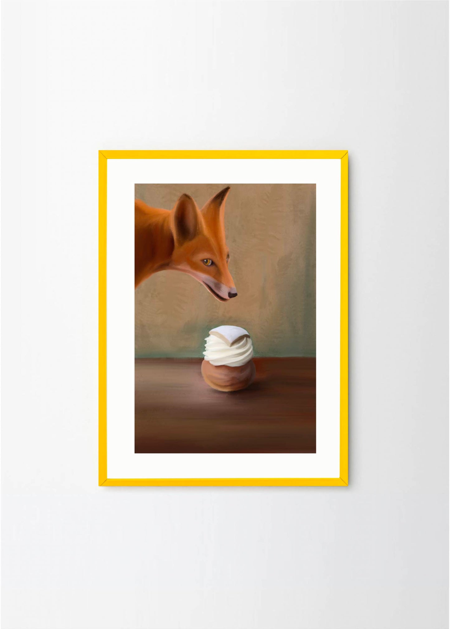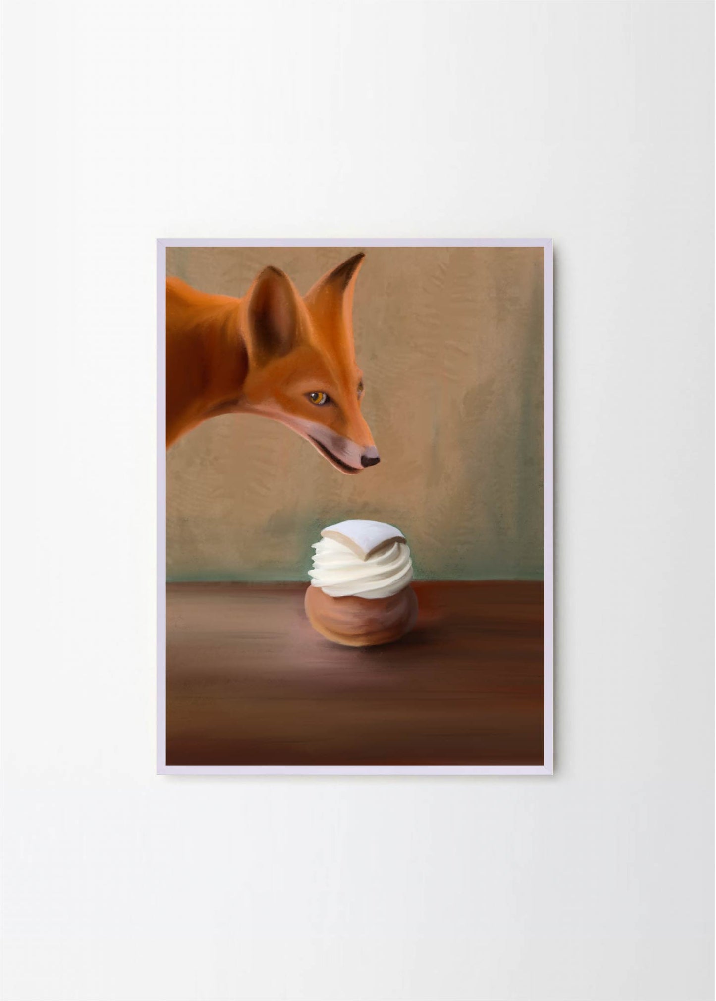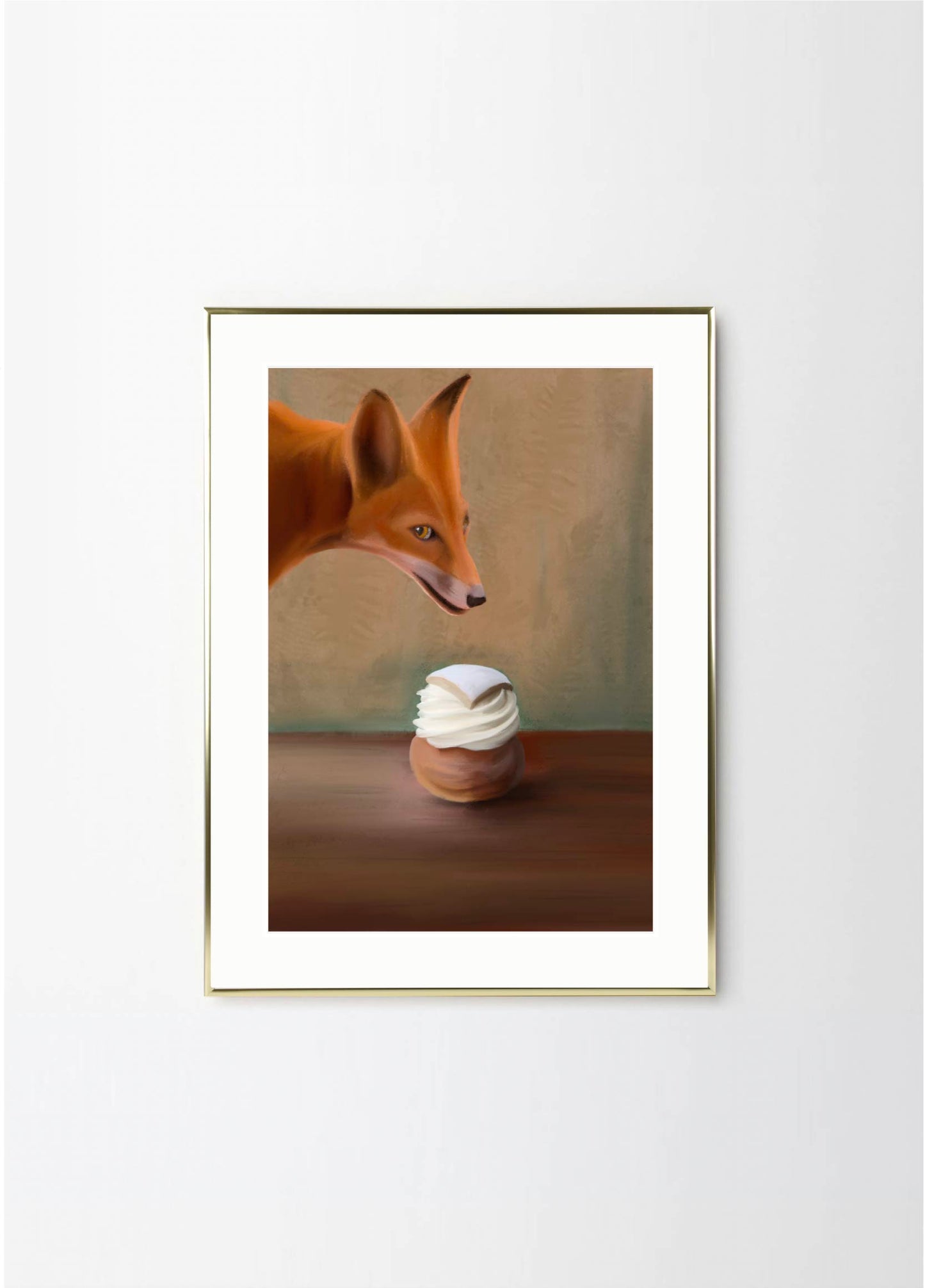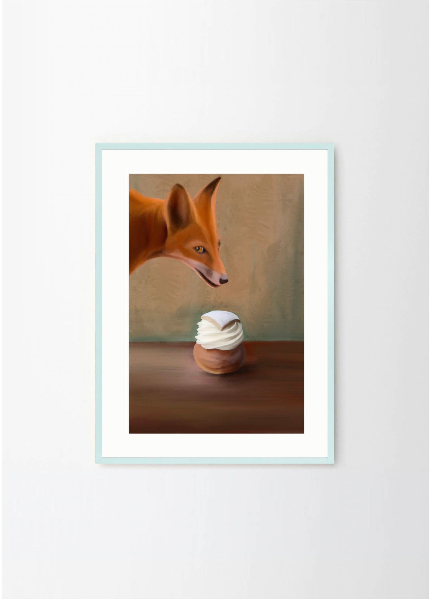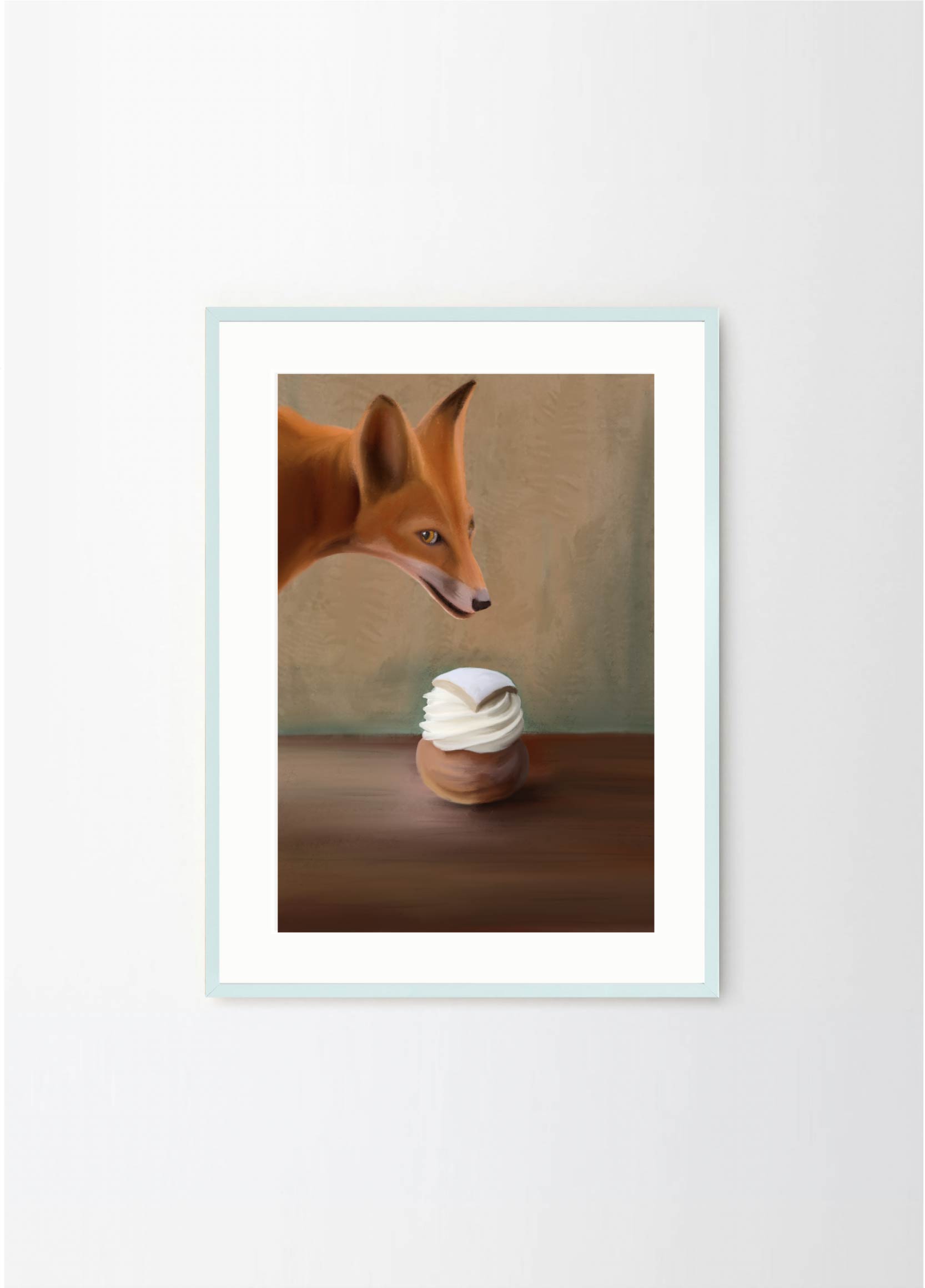 This poster in a portrait format depicts a fox on his way to prey on a Semla, a traditional Swedish bake goods. The beige, brown and orange tones makes it perfect for a walnut frame. A significant characteristic of Estelle Graf's work is that she almost always works with satire.