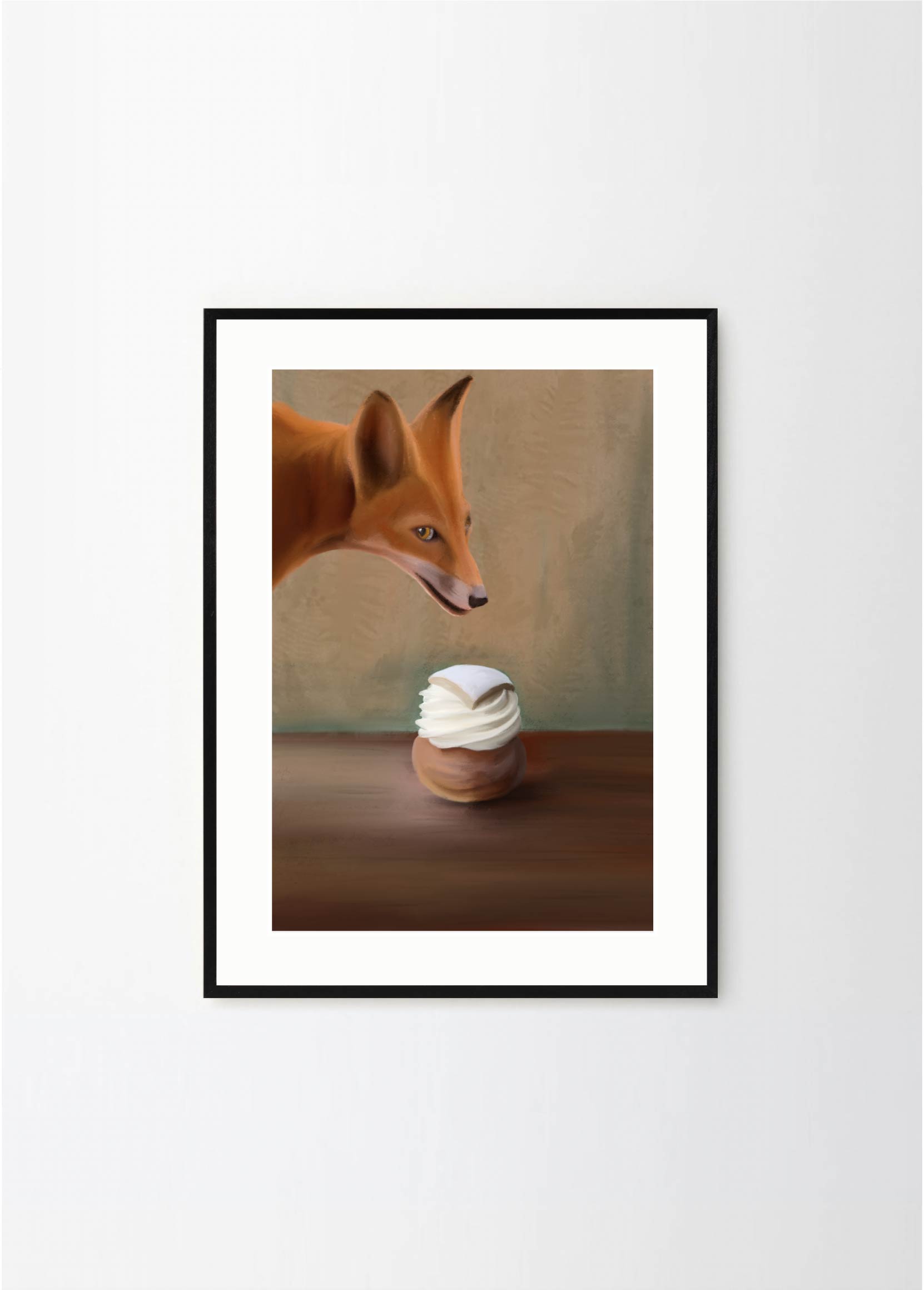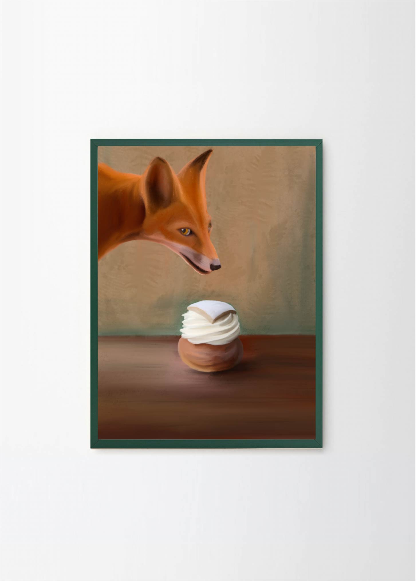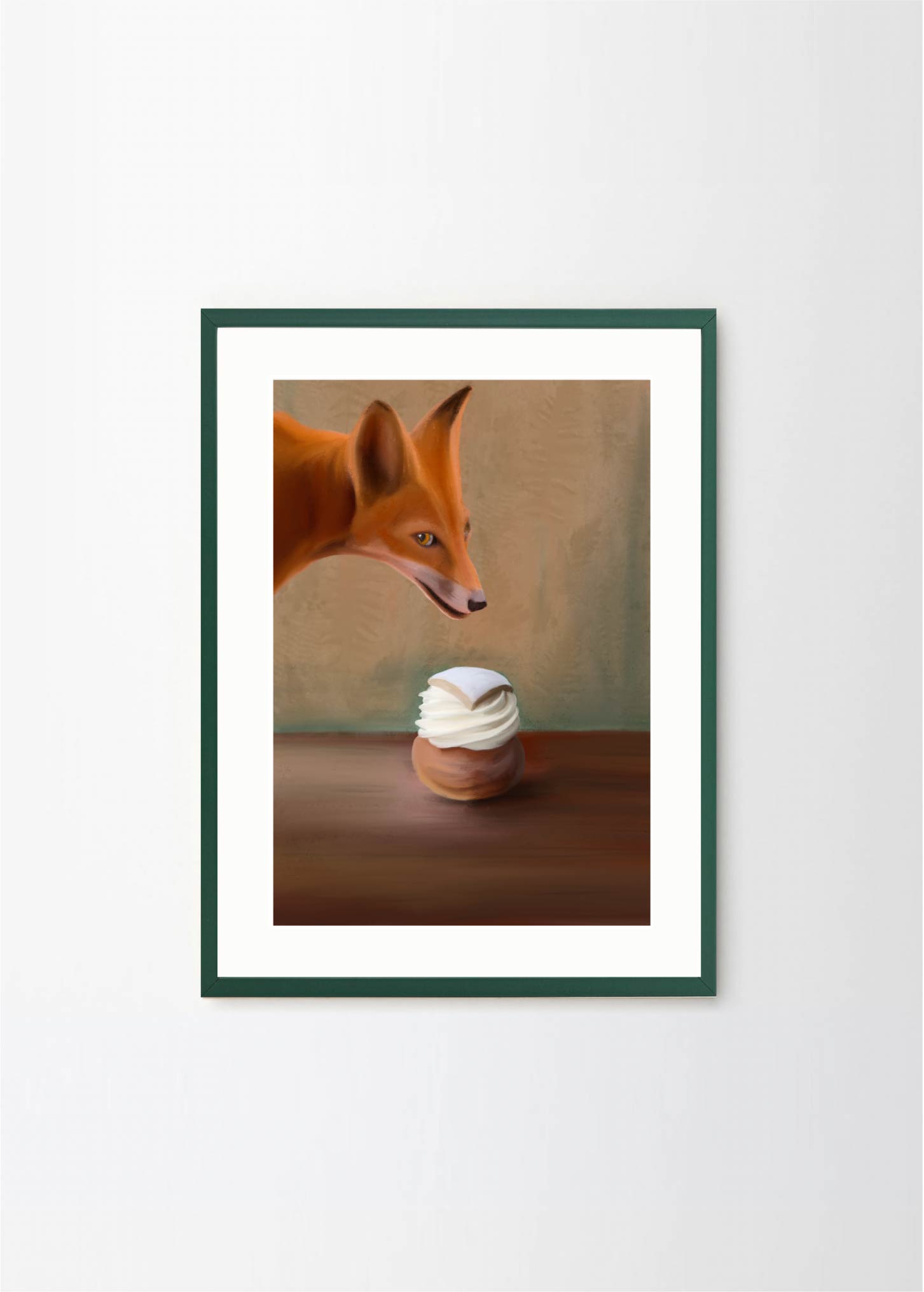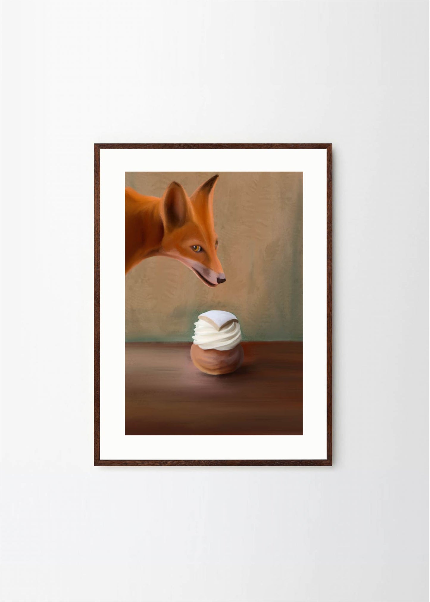 This poster in a portrait format depicts a fox on his way to prey on a Semla, a traditional Swedish bake goods. The beige, brown and orange tones makes it perfect for a walnut frame. A significant characteristic of Estelle Graf's work is that she almost always works with satire.