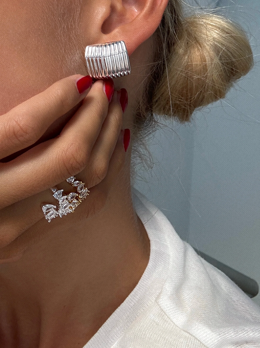 Our Ribbed Earrings Silver have a length of 2 cm and a width of 1,8 cm. They are made of 925 silver plated brass and is also available in gold.