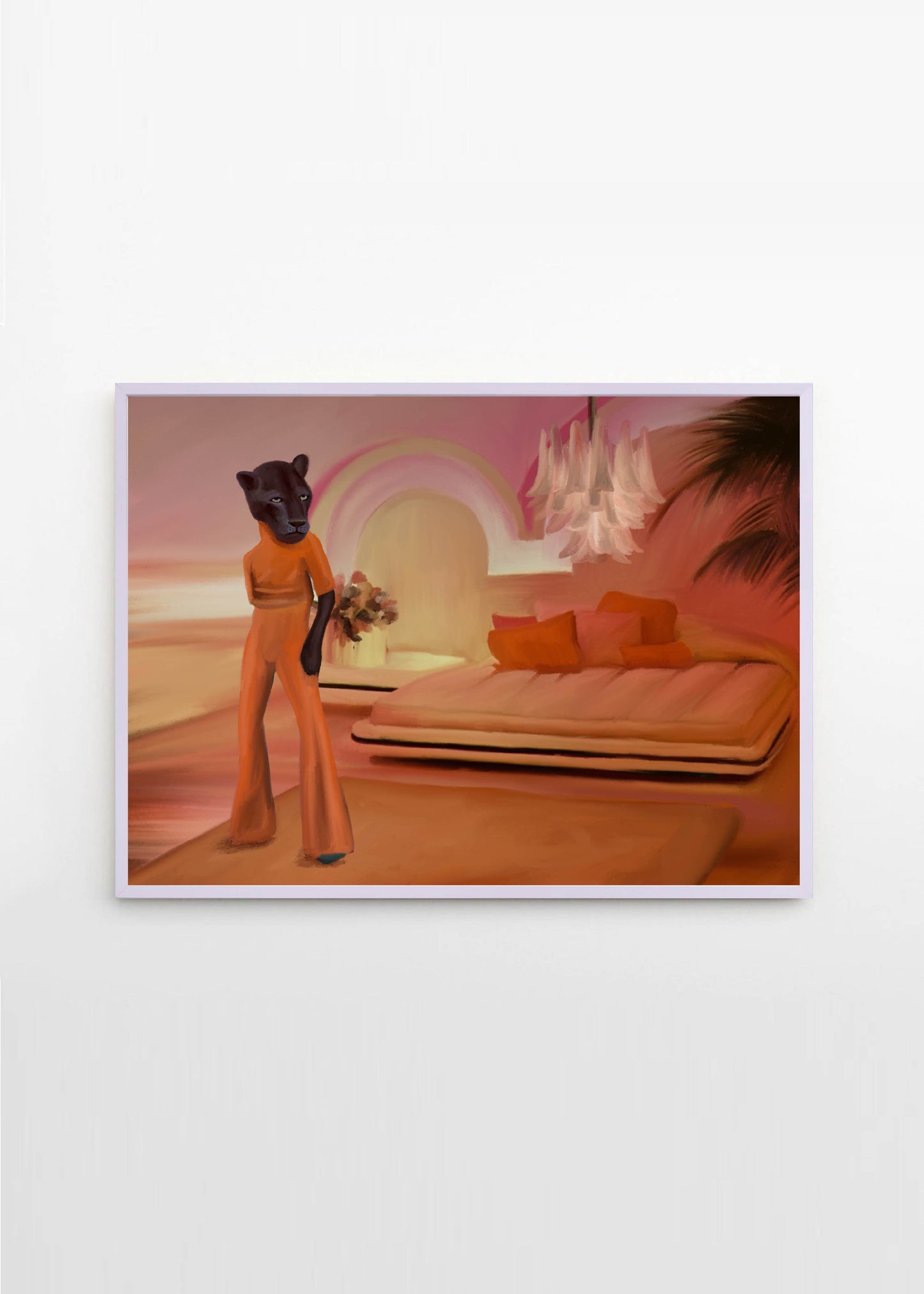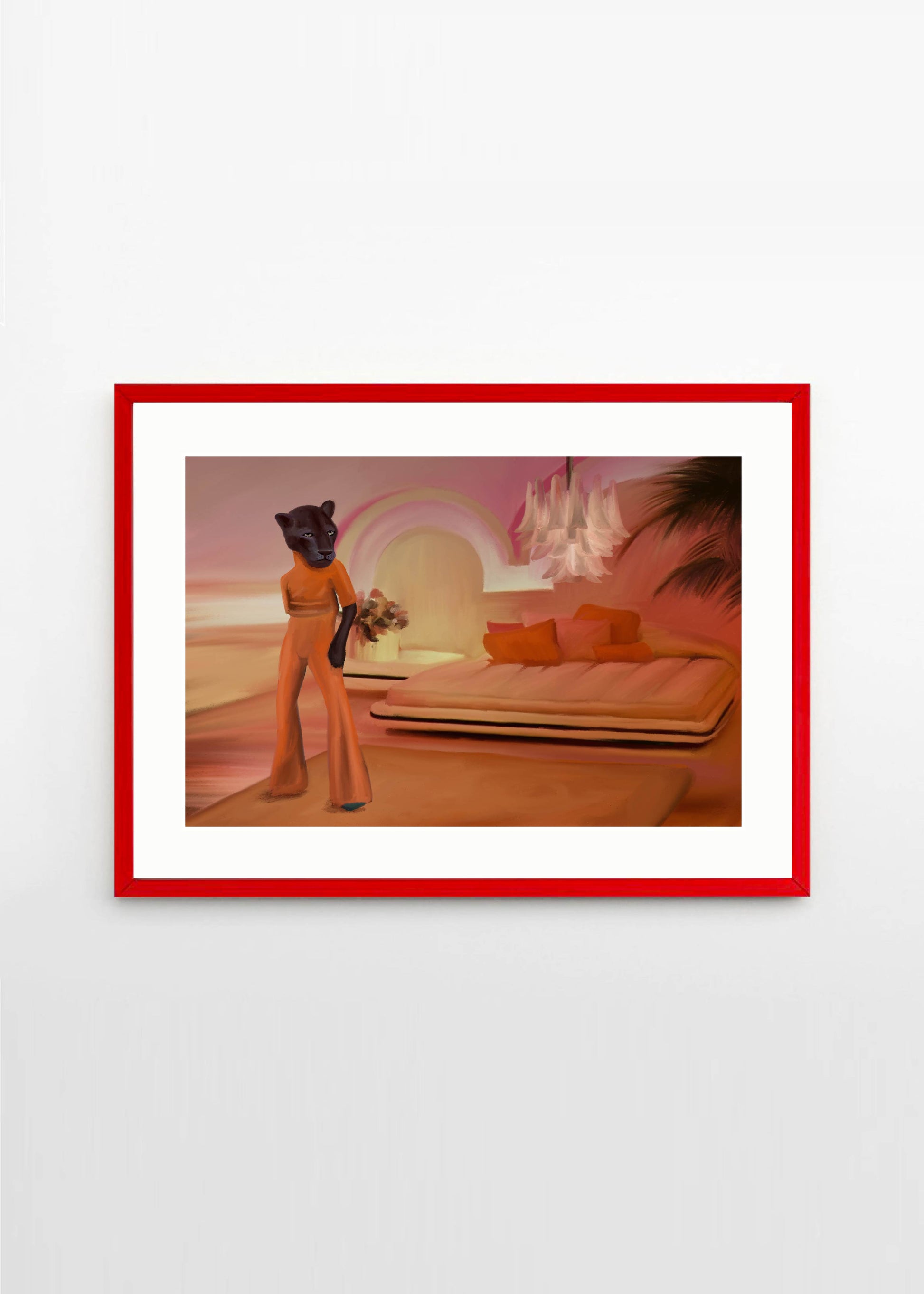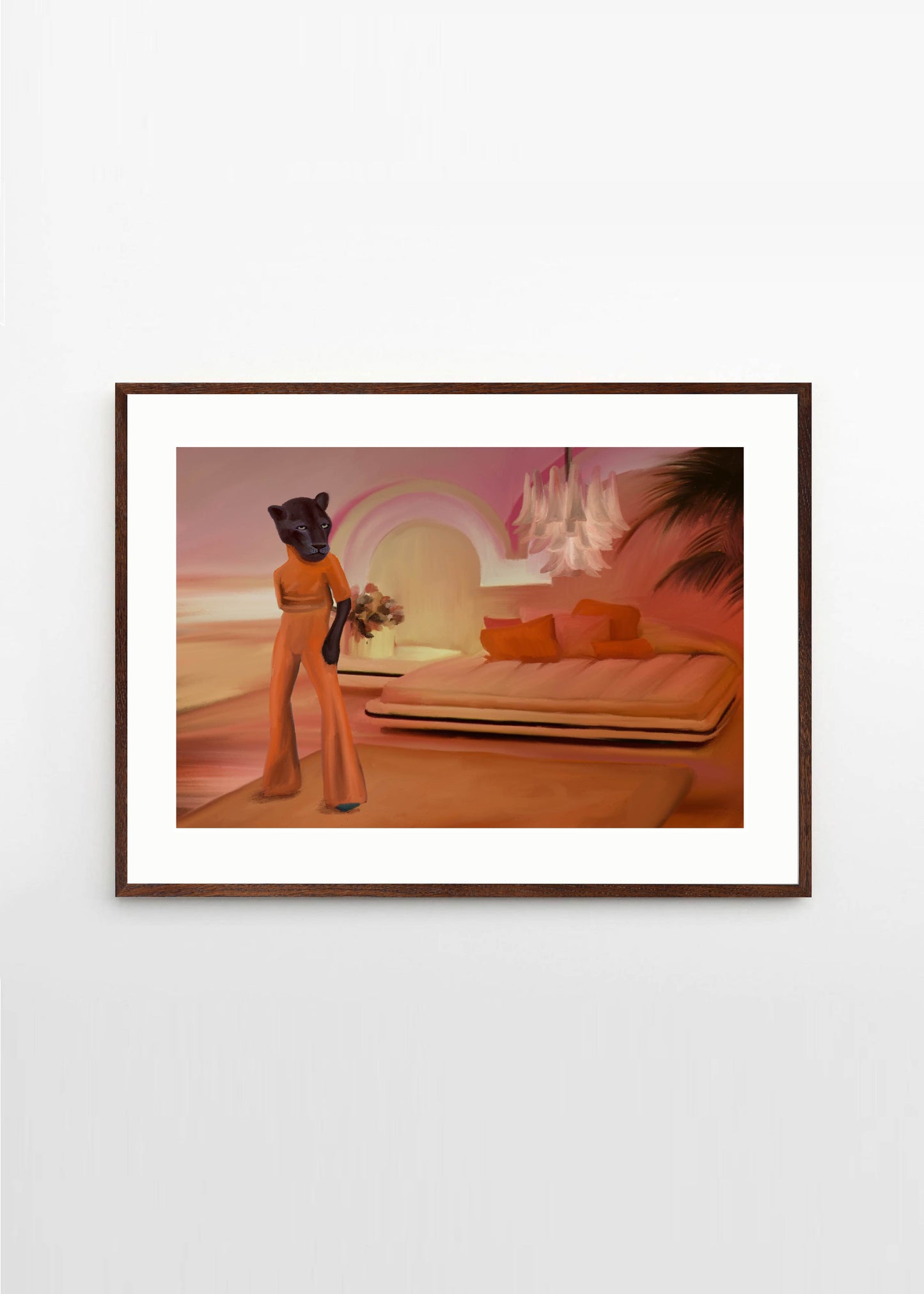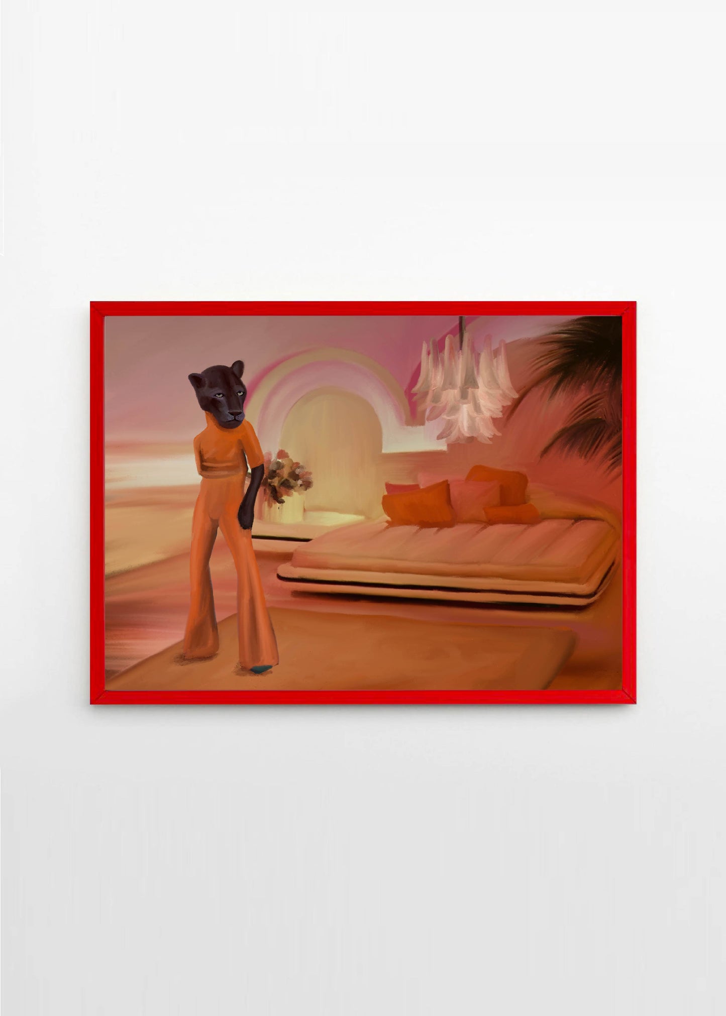 This poster in a landscape format depicts Romantic Robert the panther, in his cologne smelling bedroom waiting for his date. The red and brown colors makes it perfect for a walnut frame with a passepartout. A significant characteristic of Estelle Graf's work is that she almost always works with satire.