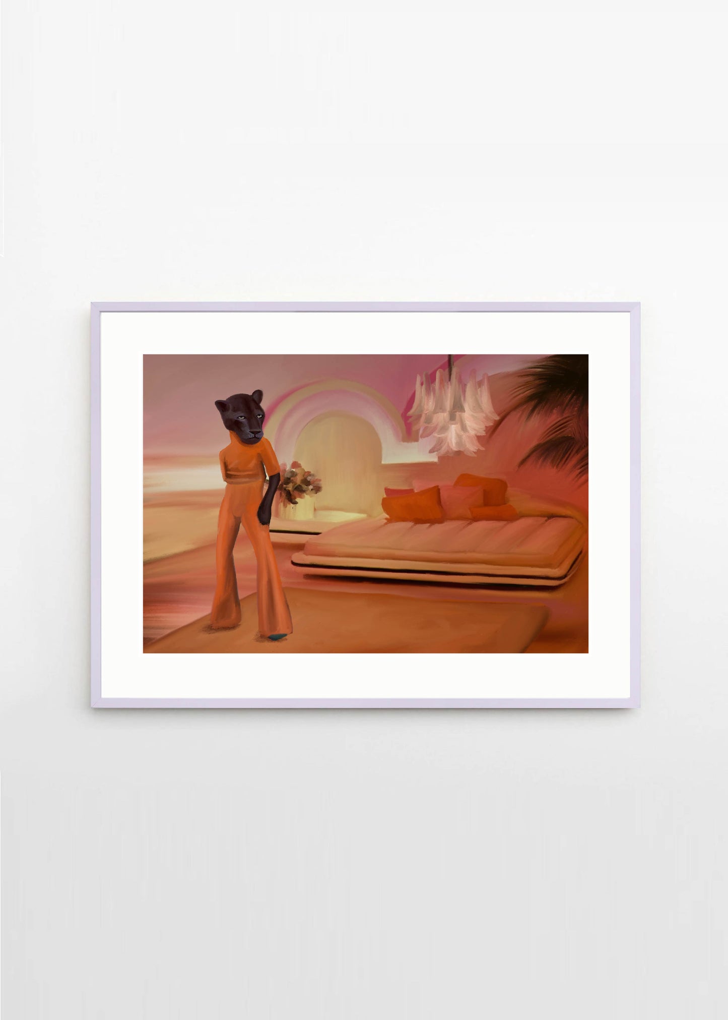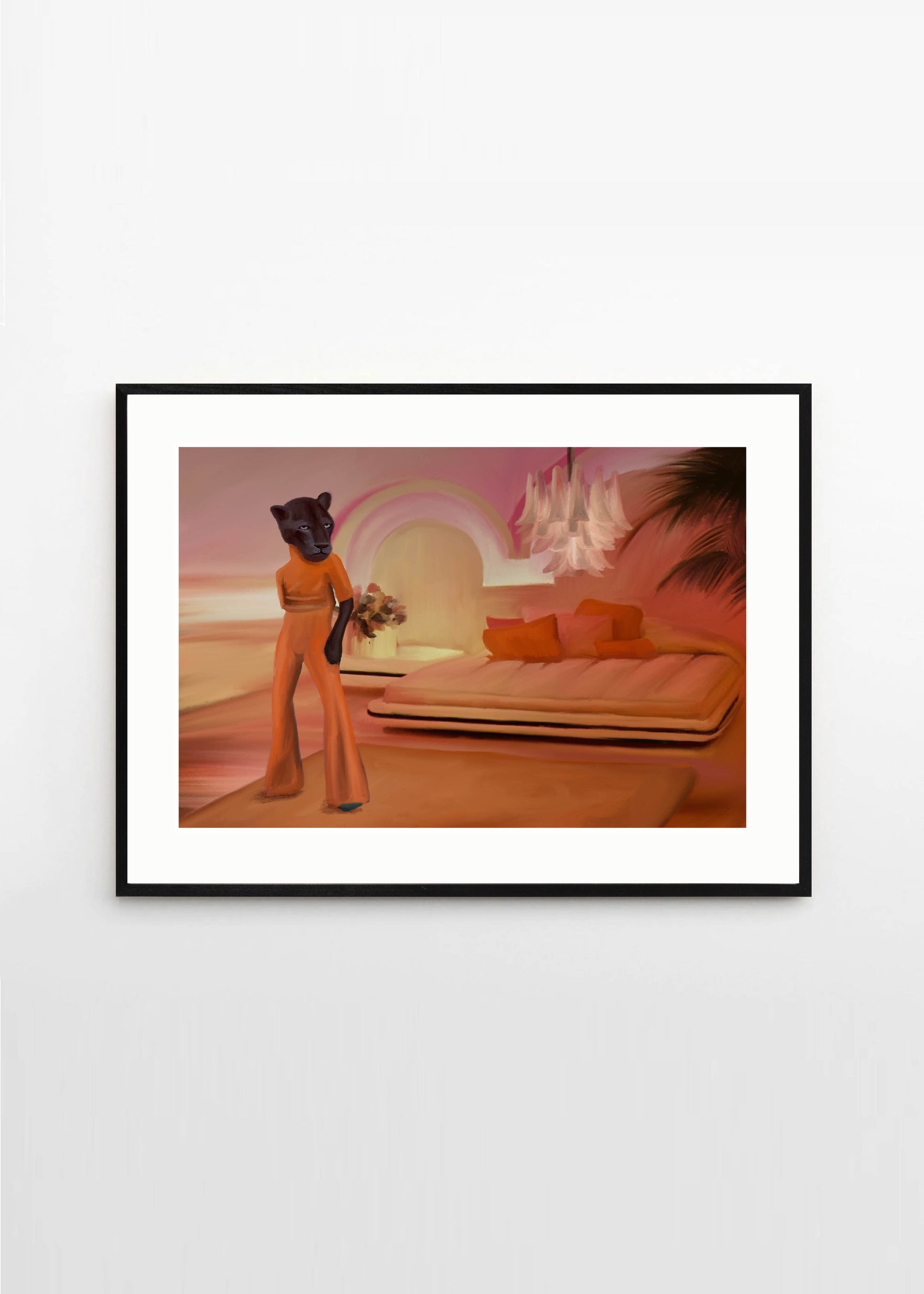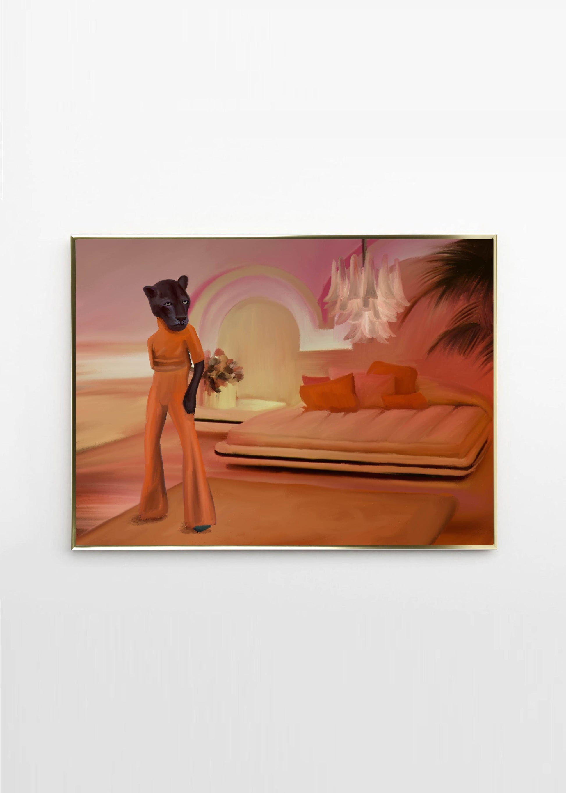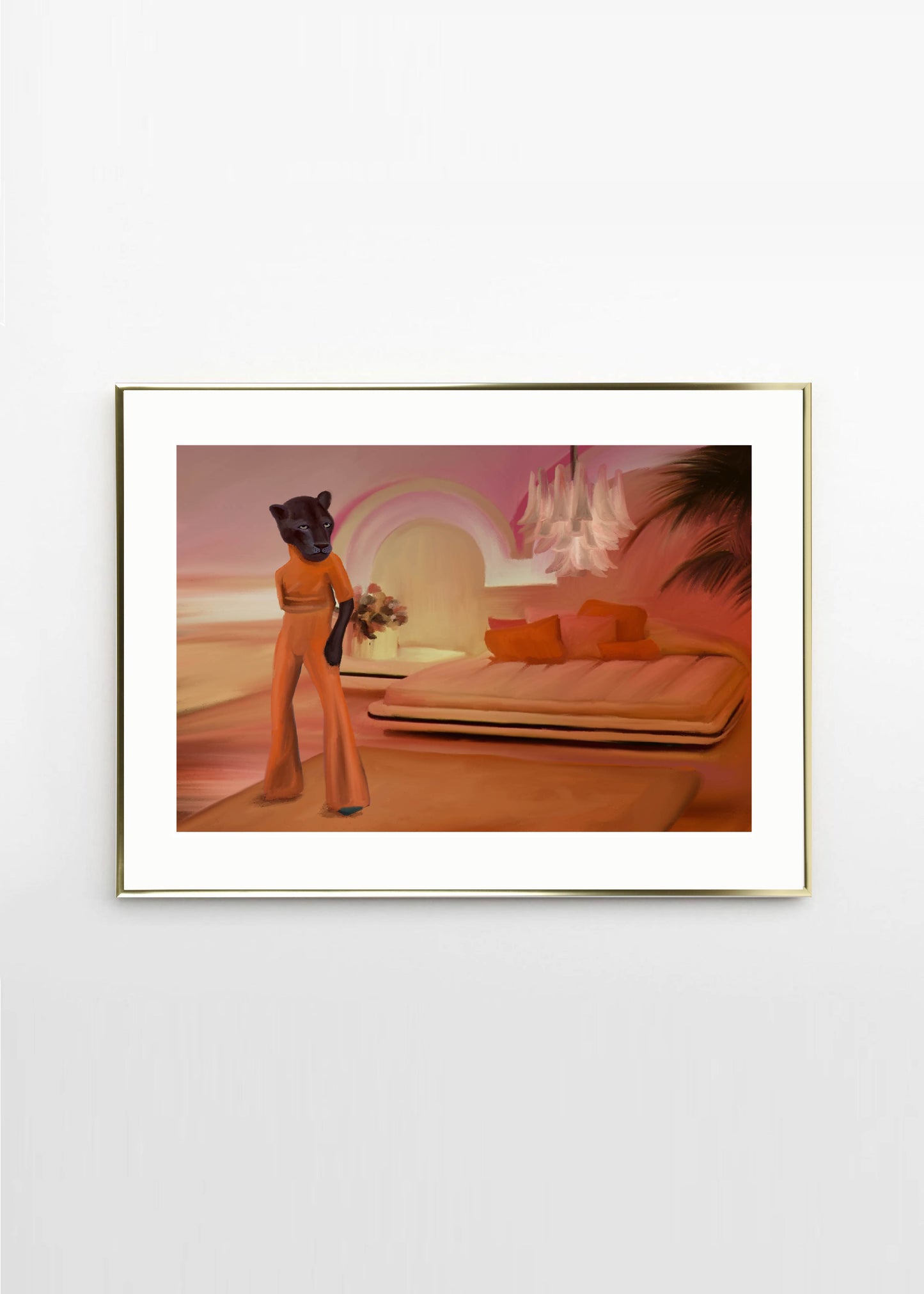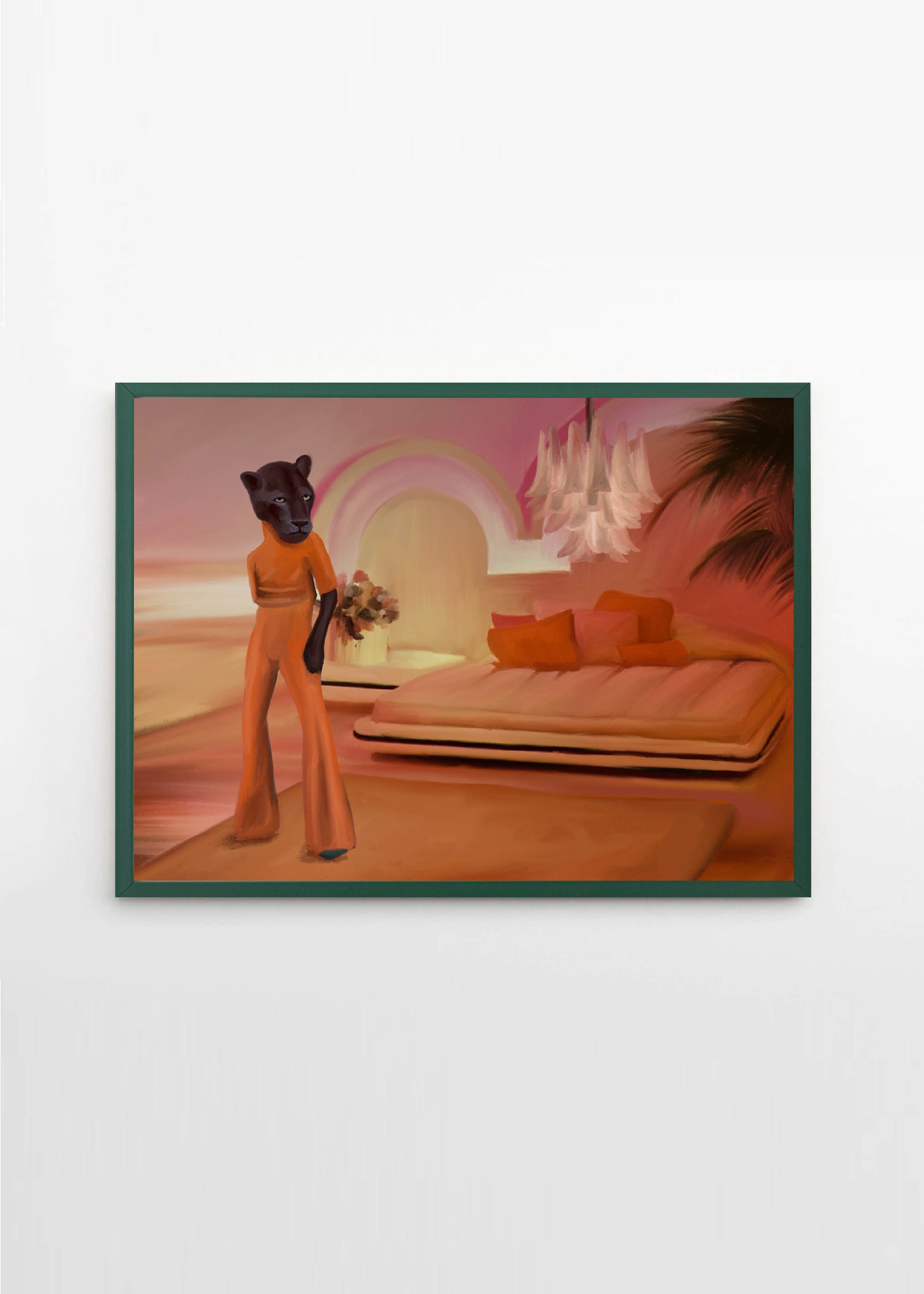 This poster in a landscape format depicts Romantic Robert the panther, in his cologne smelling bedroom waiting for his date. The red and brown colors makes it perfect for a walnut frame with a passepartout. A significant characteristic of Estelle Graf's work is that she almost always works with satire.