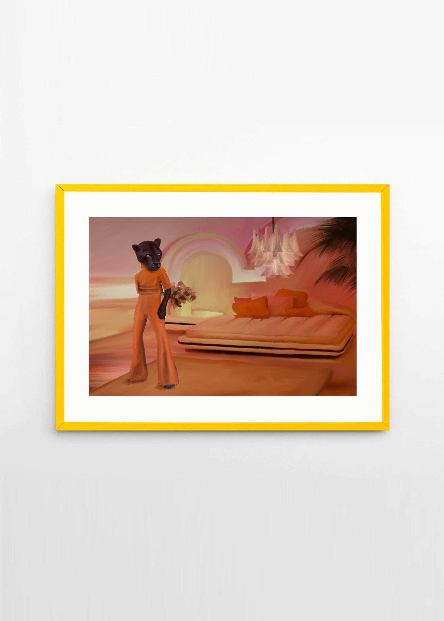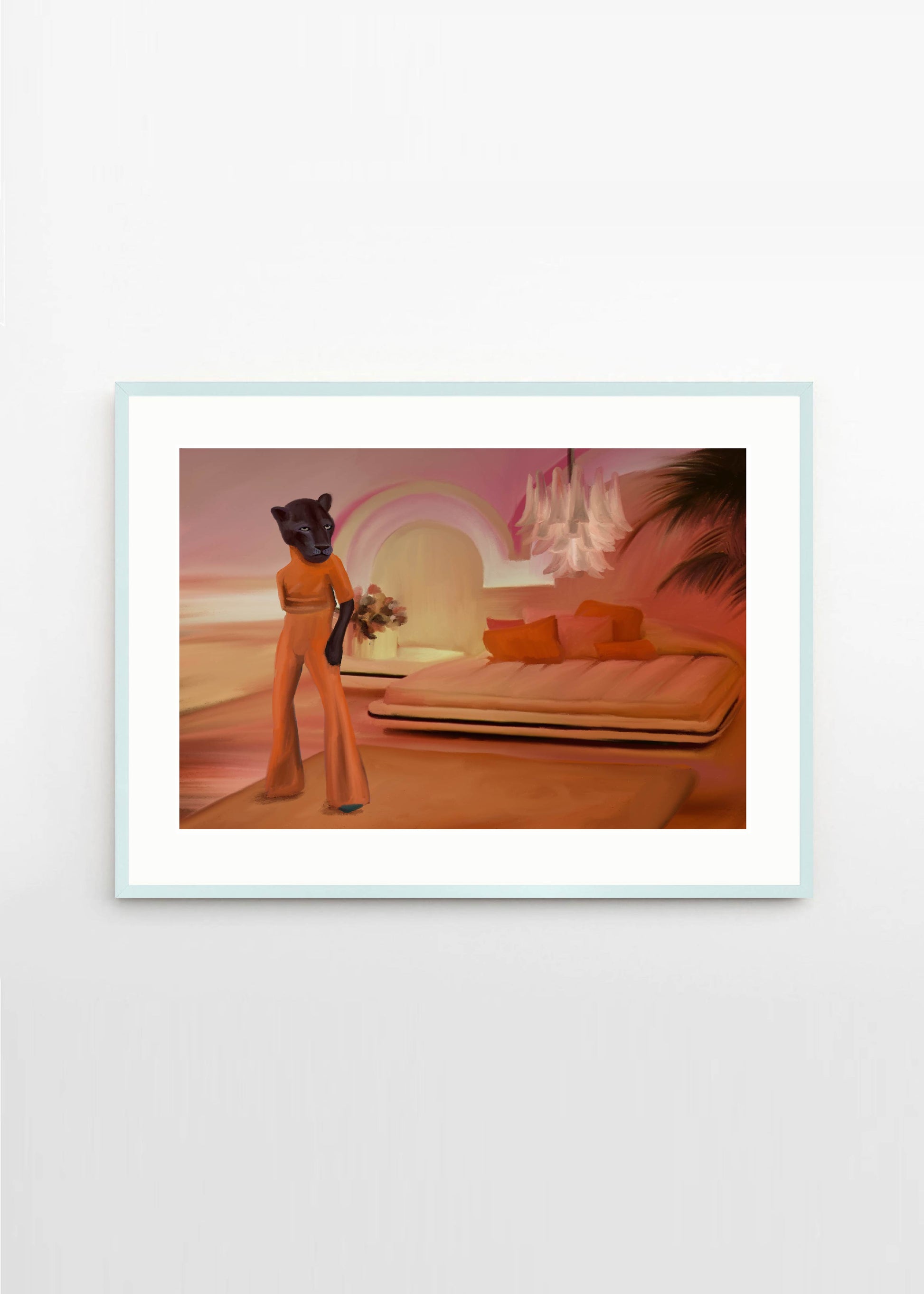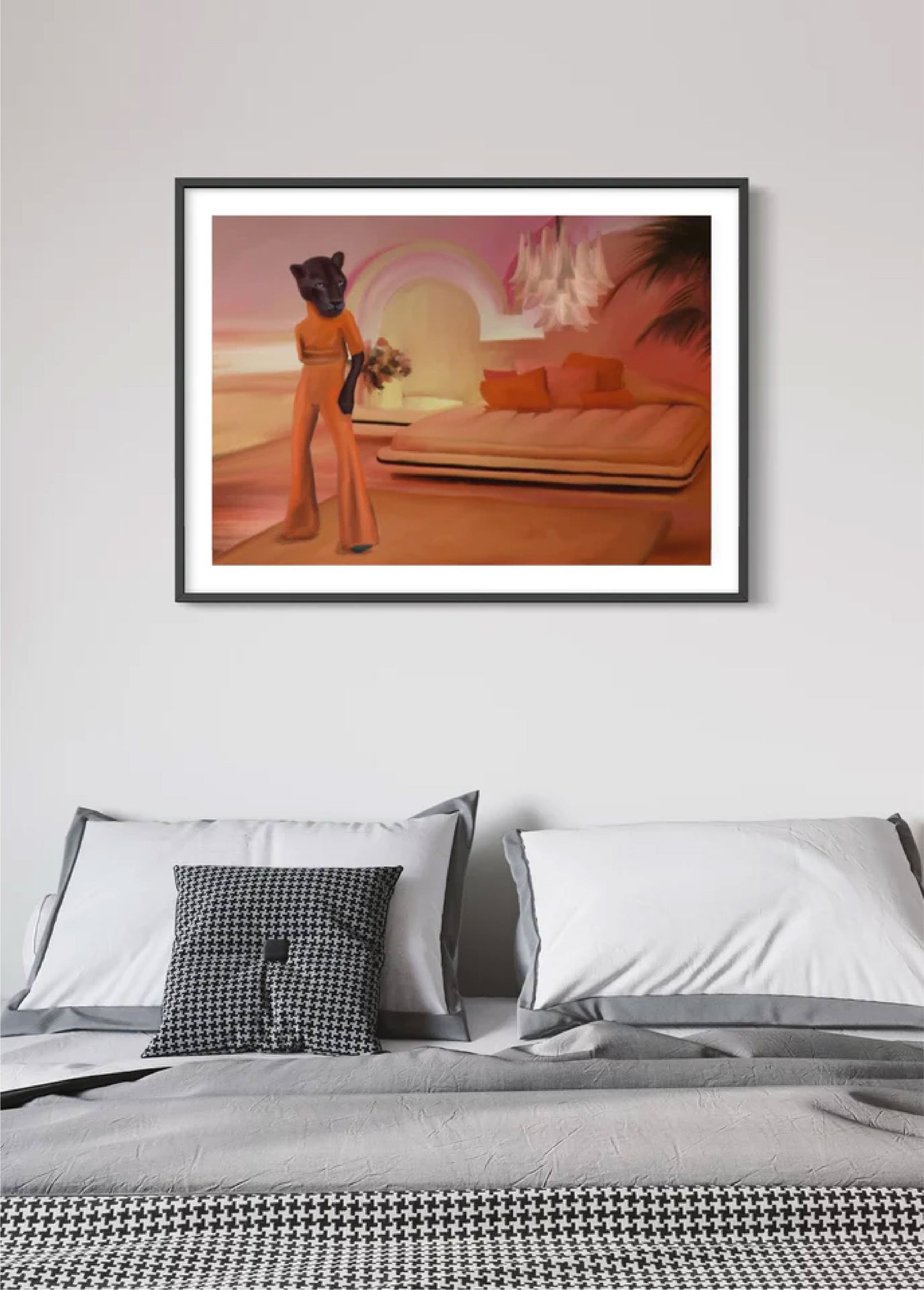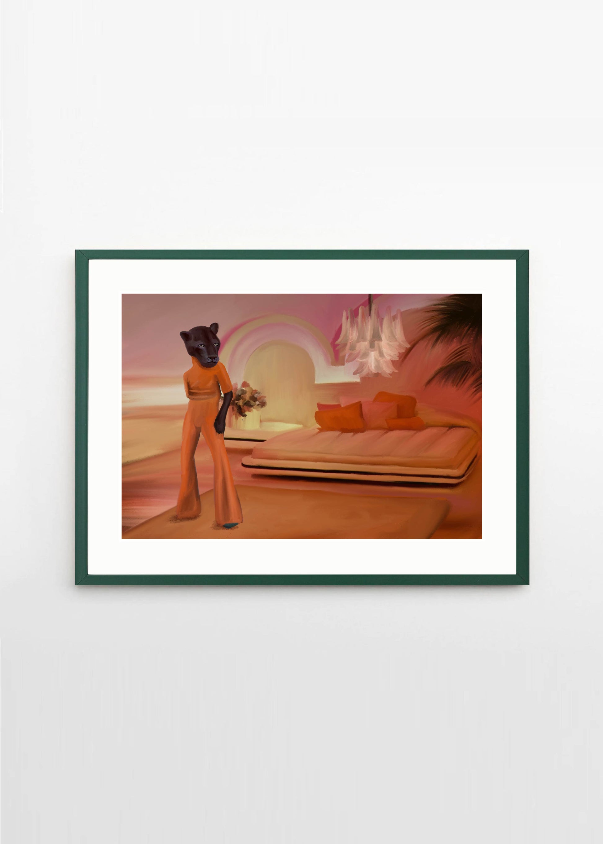 This poster in a landscape format depicts Romantic Robert the panther, in his cologne smelling bedroom waiting for his date. The red and brown colors makes it perfect for a walnut frame with a passepartout. A significant characteristic of Estelle Graf's work is that she almost always works with satire.