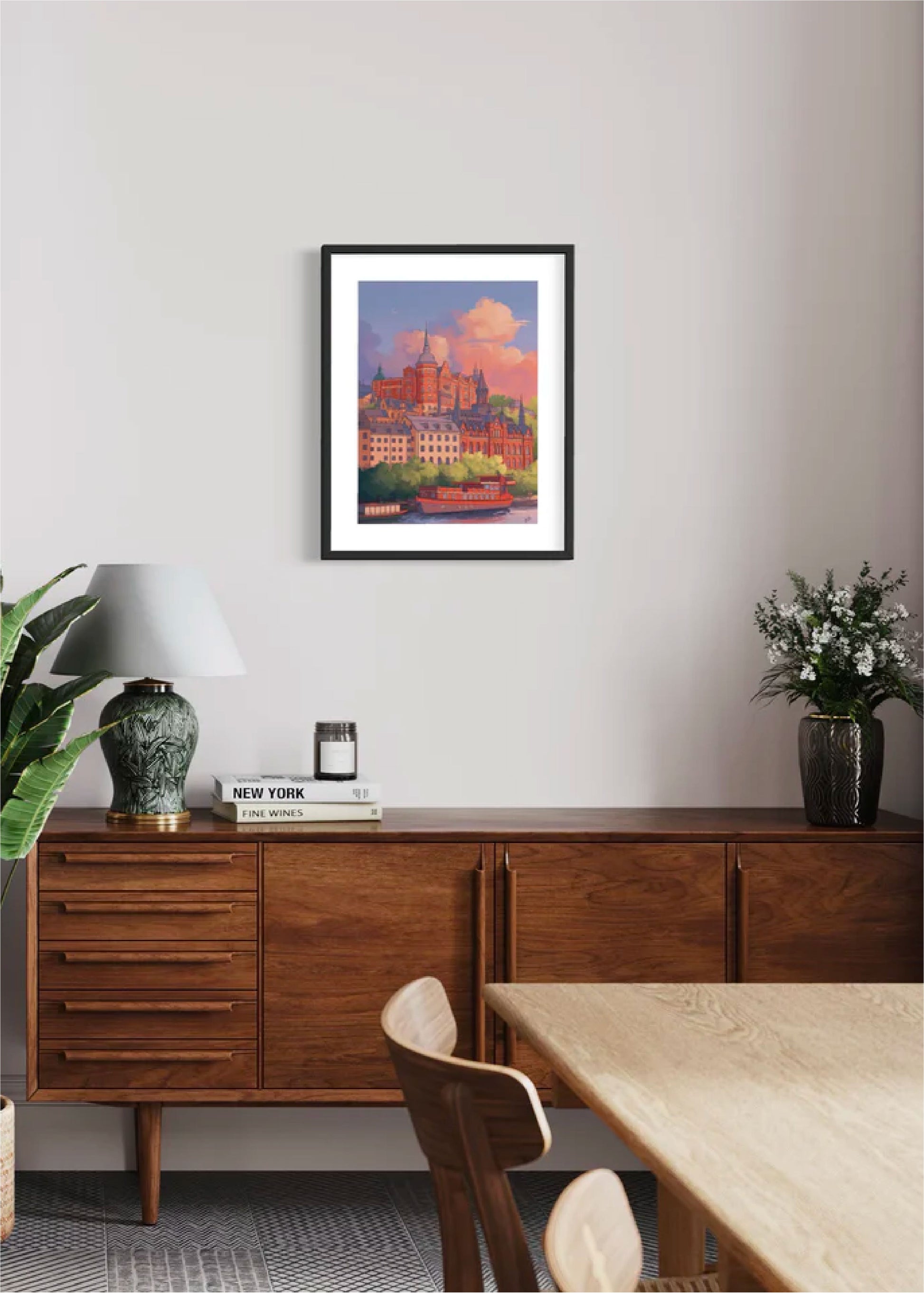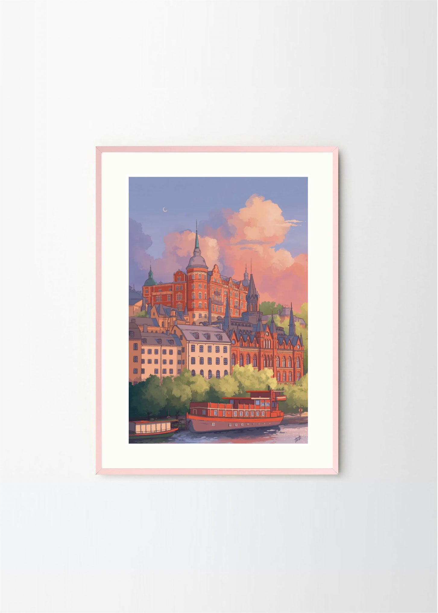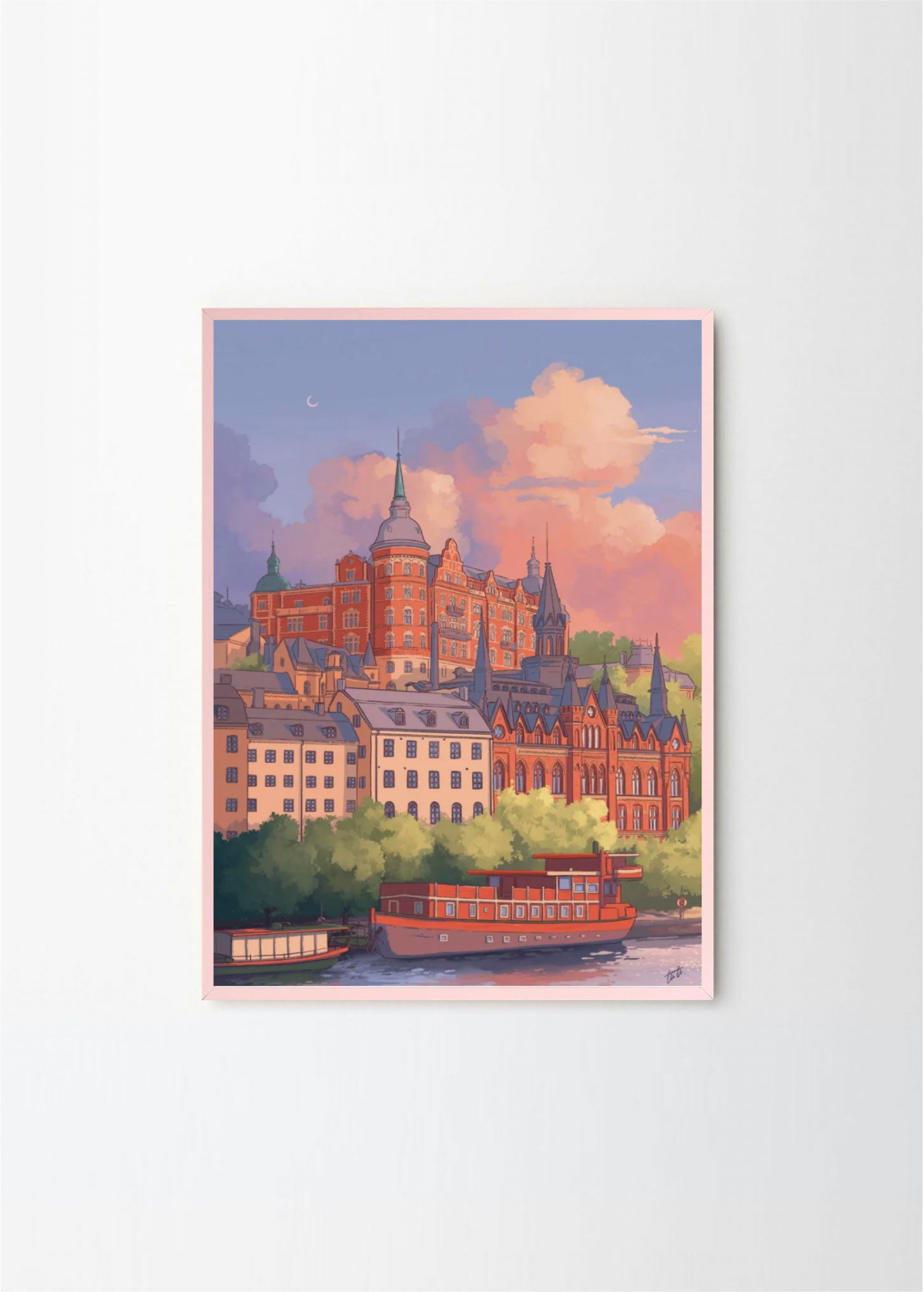 This artwork depicts the stunning building on Södermalarstrand on Södermalm, Stockholm. The bright pink and blue colors makes it perfect for a blue or pink frame with or without a passepartout.