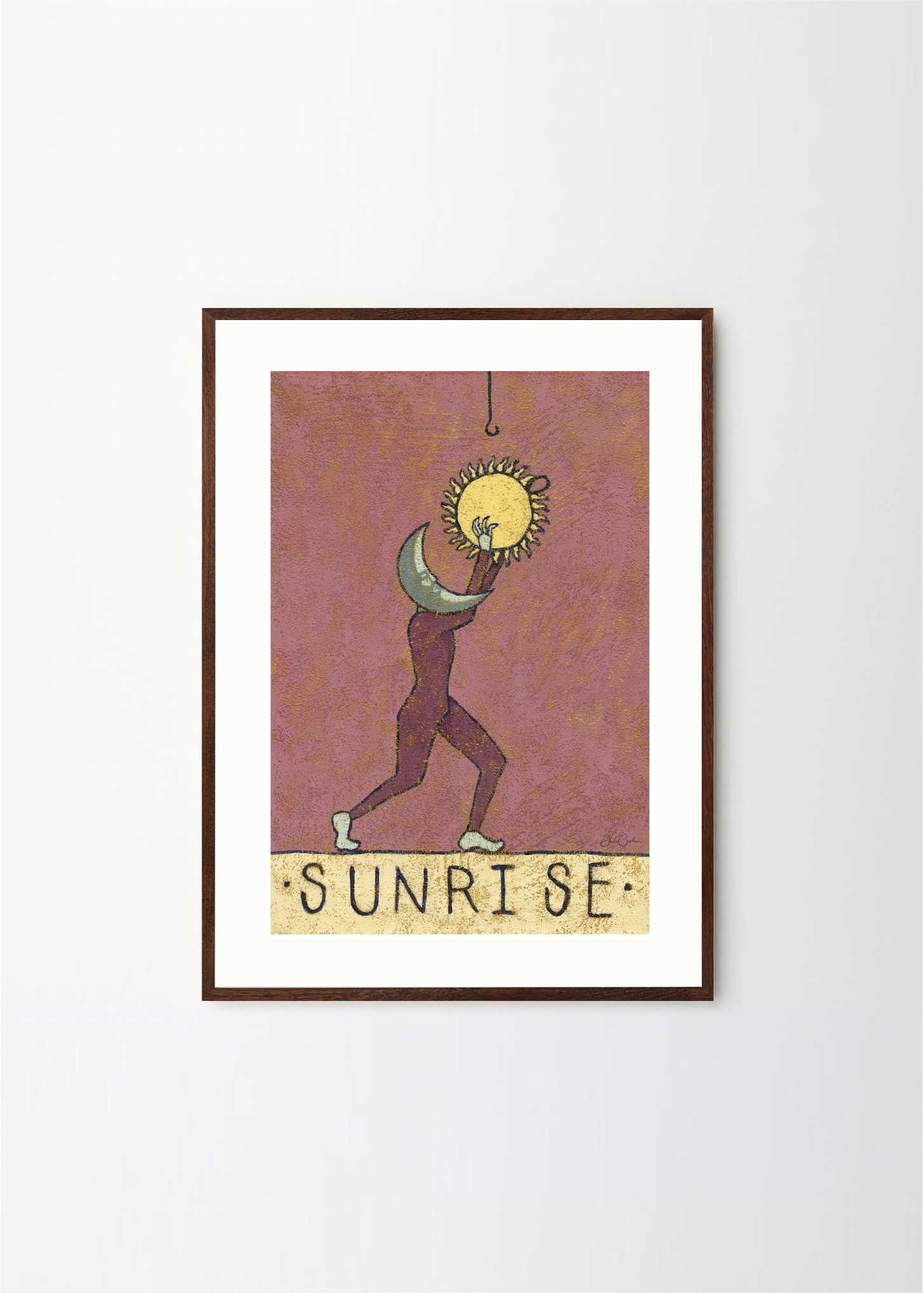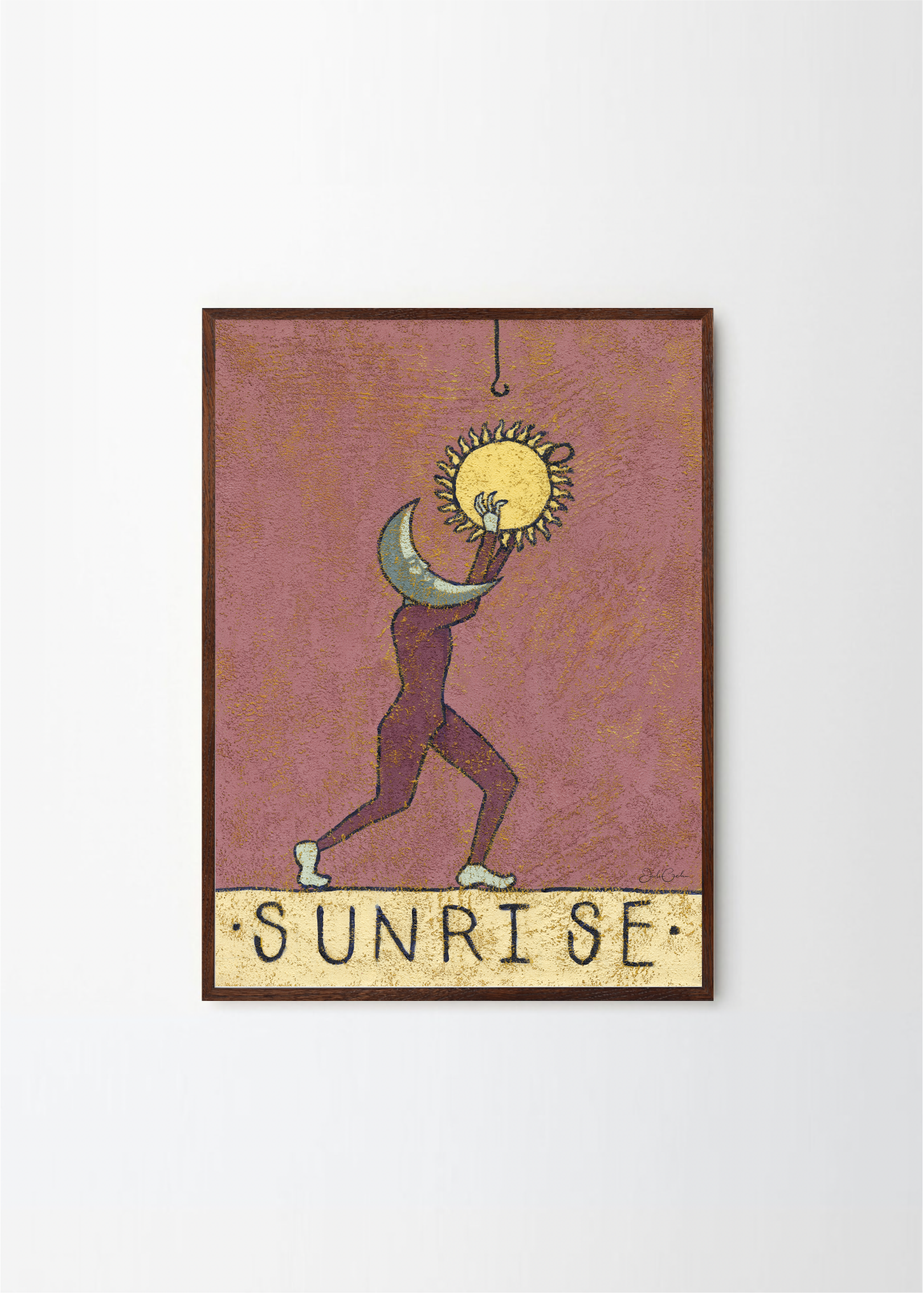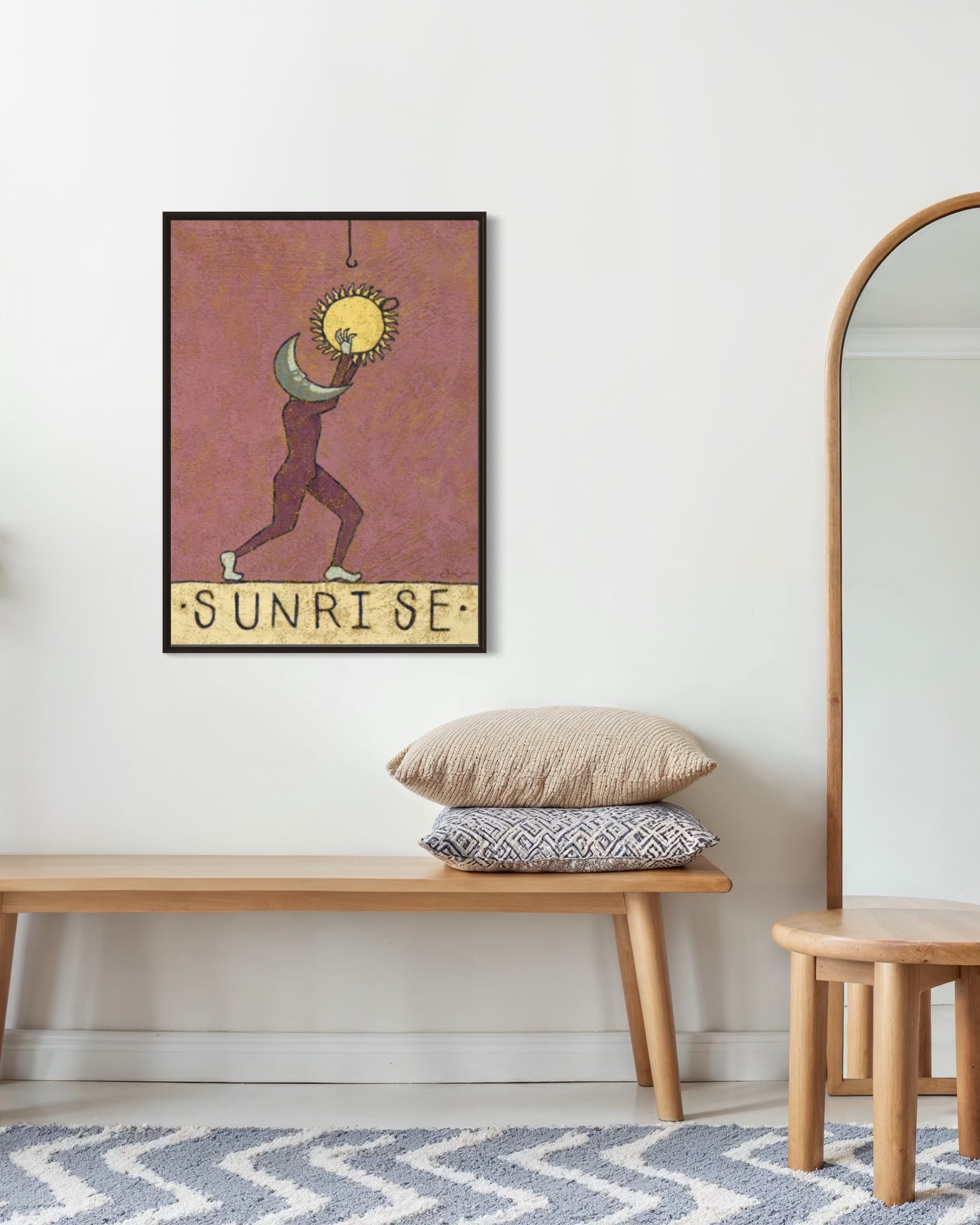 In Sunrise, the night releases its hold. A crescent moon-faced figure gently lifts the sun toward the sky — the mirrored gesture of Sunset. Julie Celina’s warm, hand-textured palette of dusty rose and gold brings depth and movement to this symbolic ritual of beginnings.