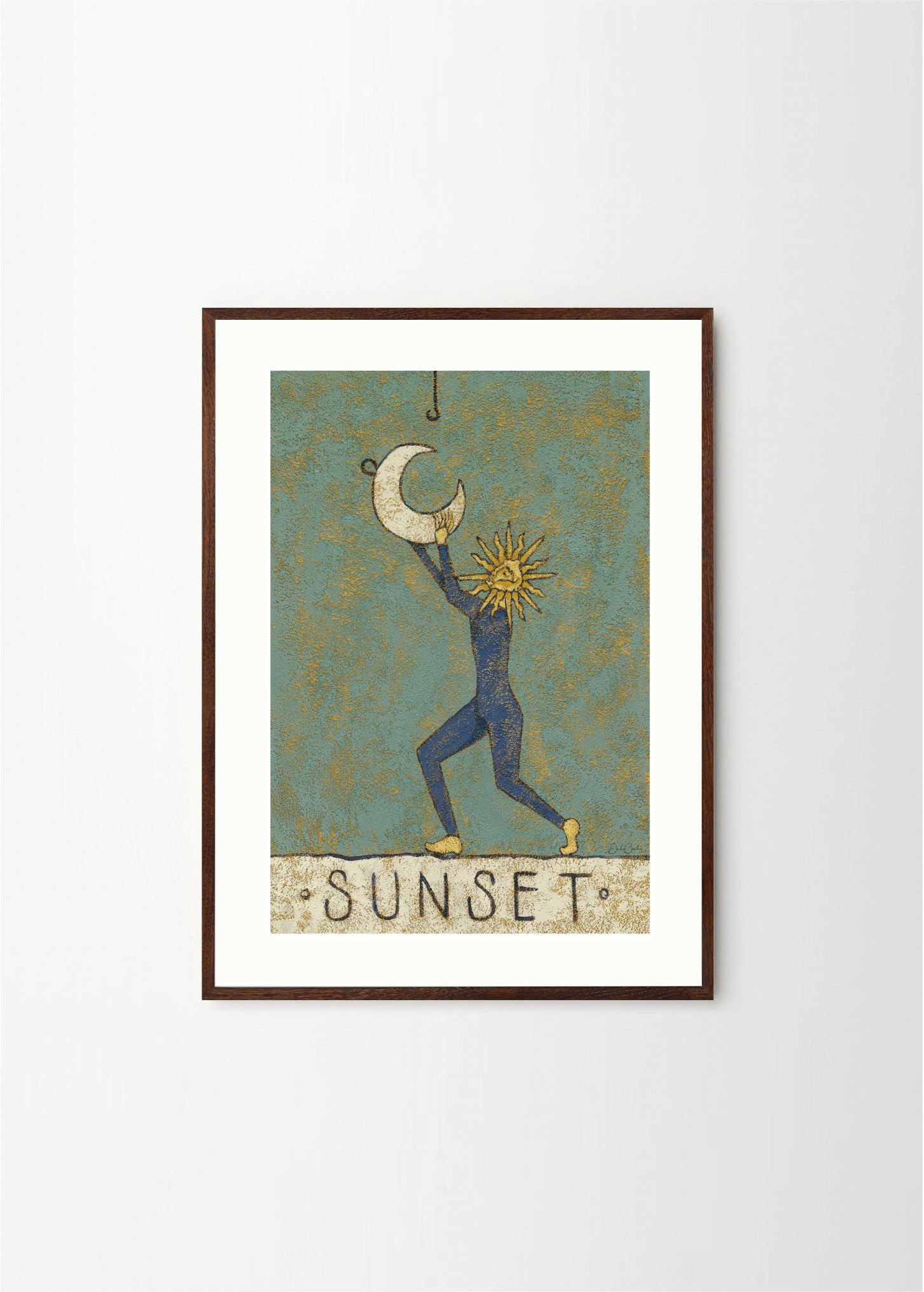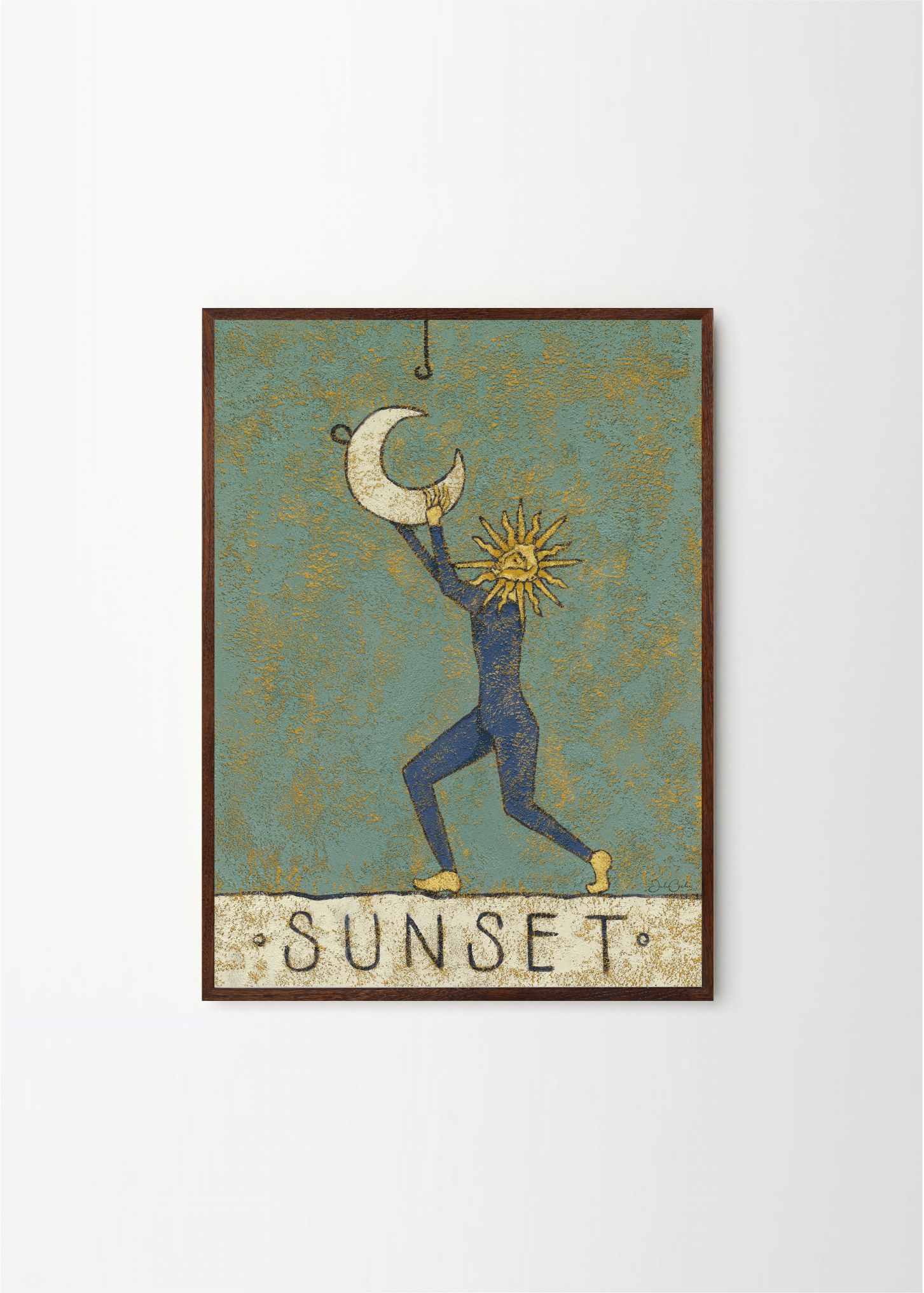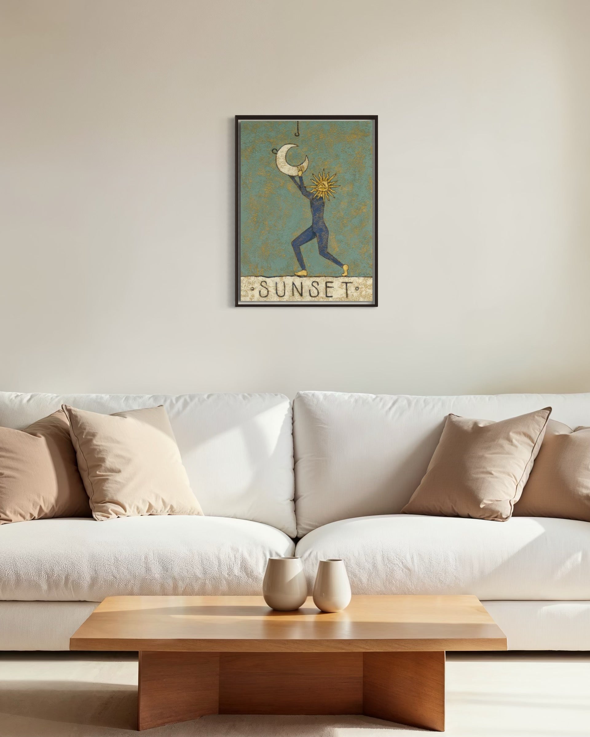 In Sunset, Julie Celina stages a surreal transition where the sun figure lifts the crescent moon into the sky — a symbolic handover between day and night. With her signature hand-textured palette of ochre, teal, and deep indigo, the artist transforms a celestial cycle into a quiet ritual.