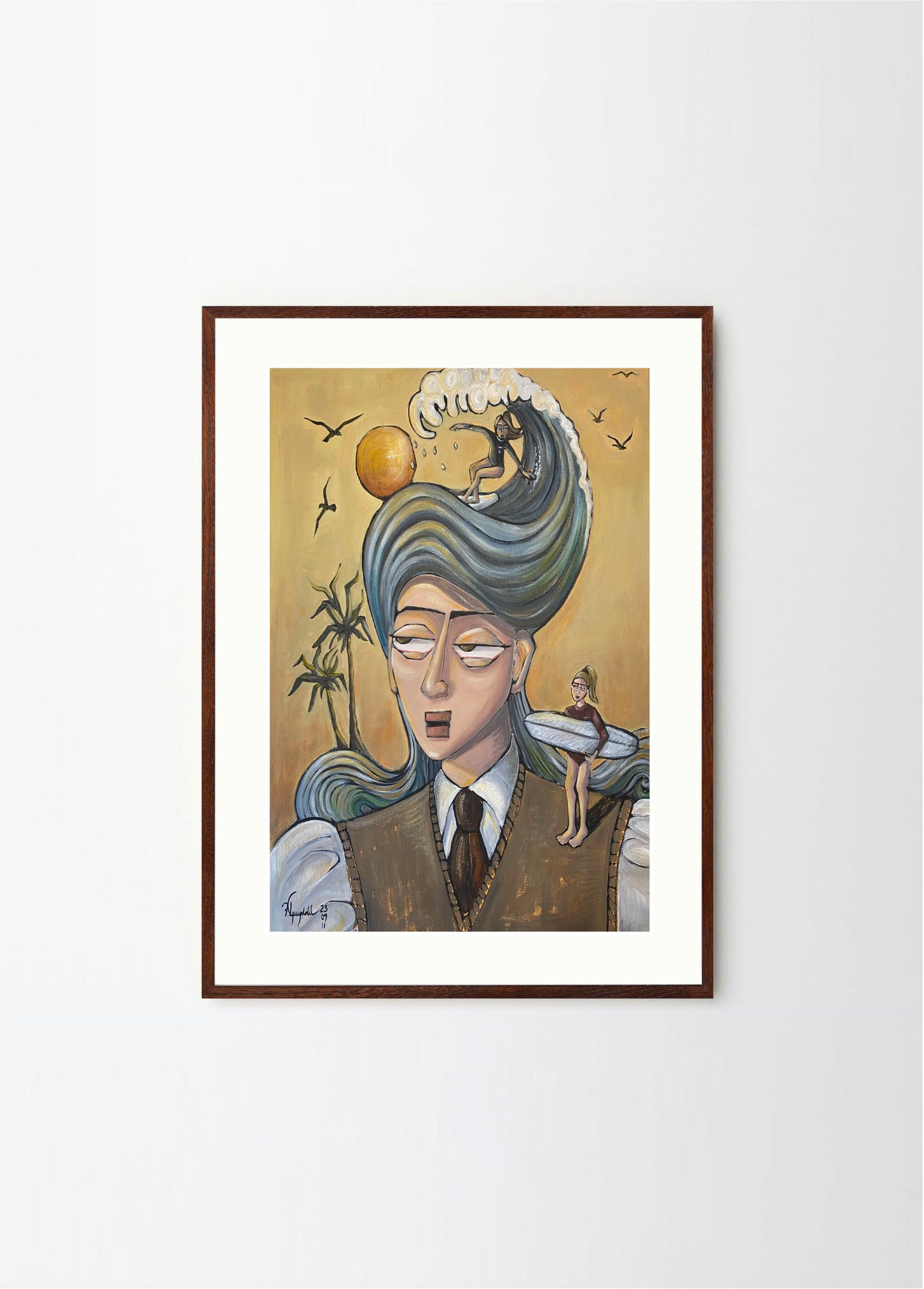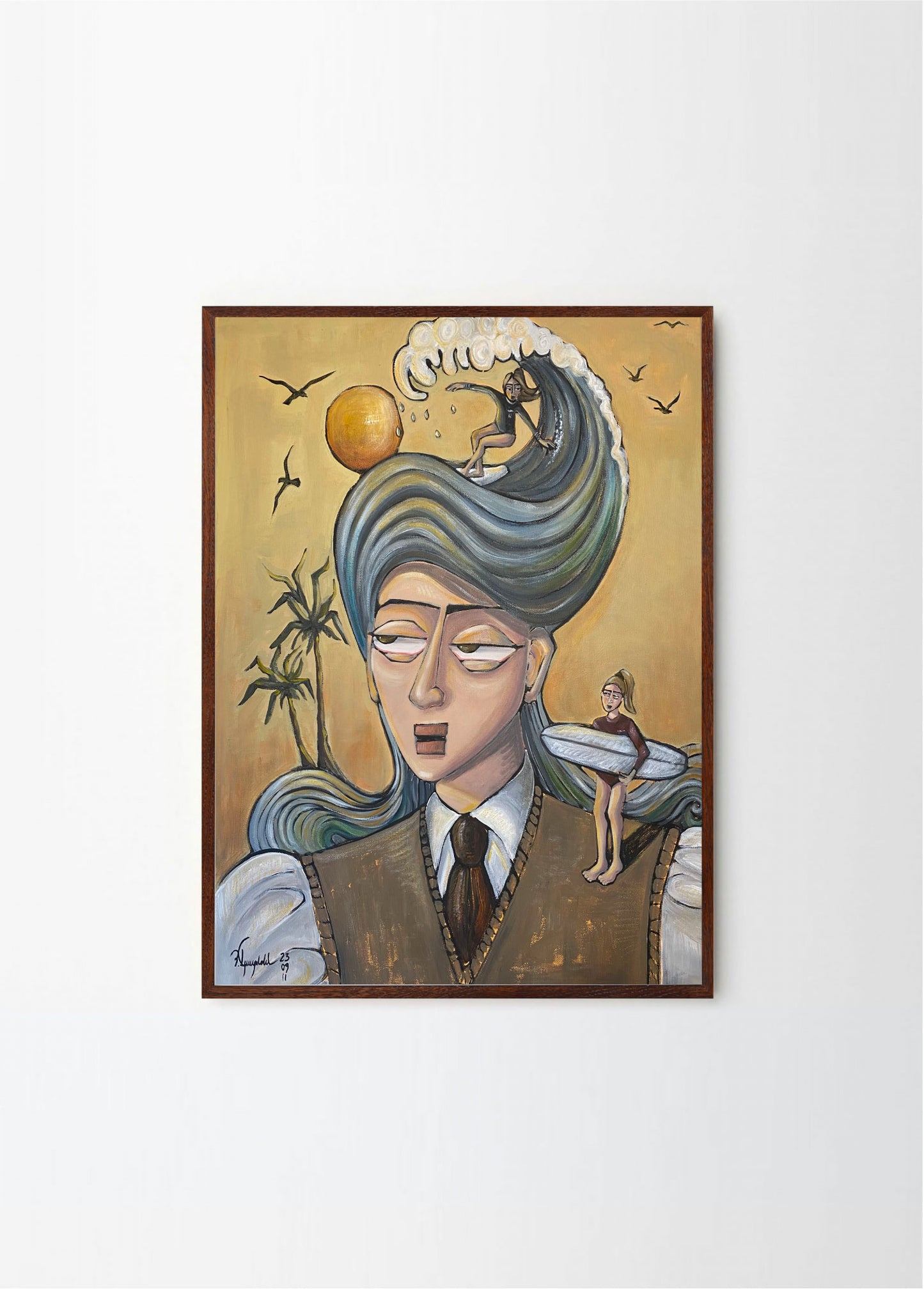 The portrait artwork Surfin by Petra Ljungdahl depicts a painting of a woman of success, allowing others riding her wave too . The grey, brown and yellow colors makes it perfect for a dark frame.
