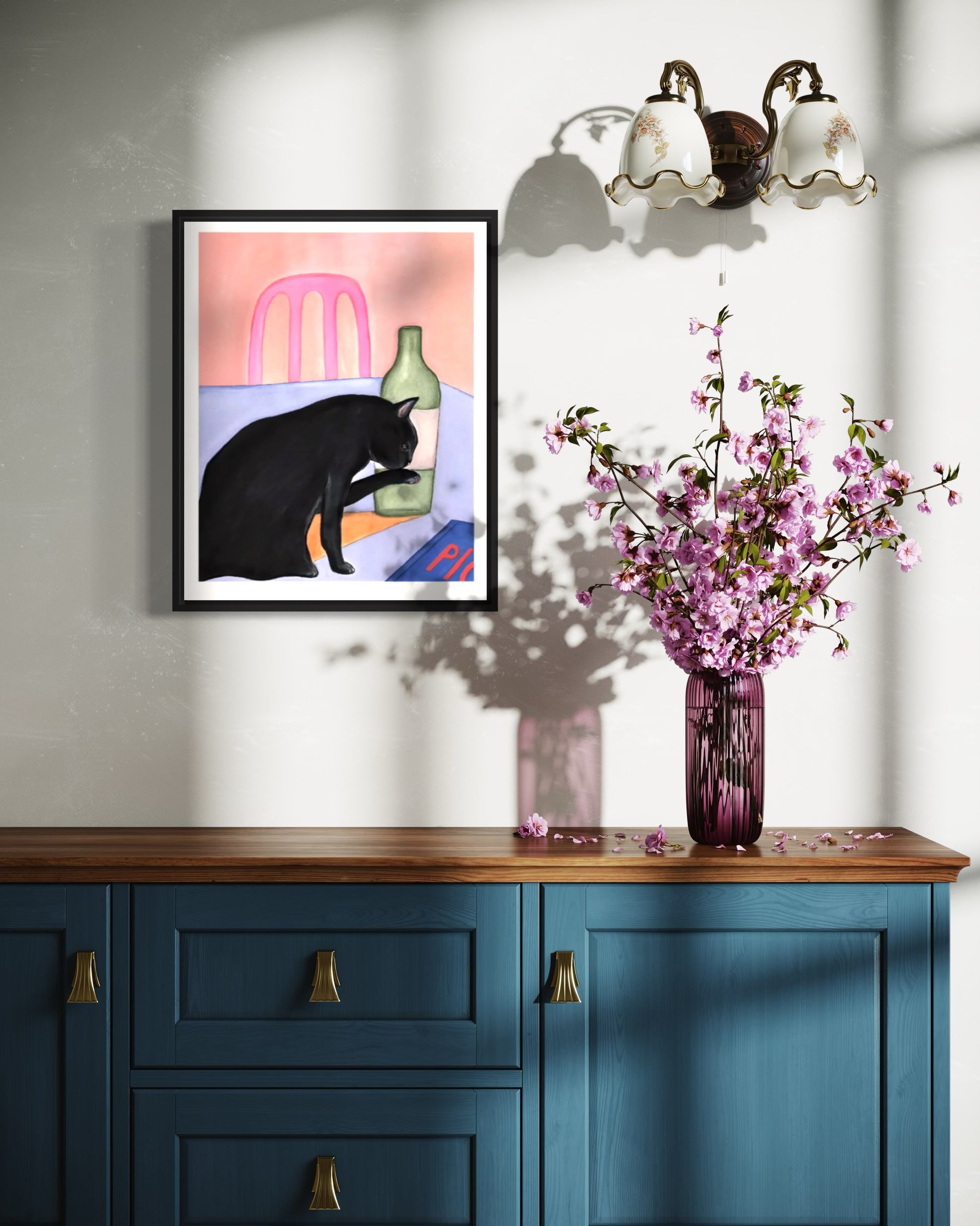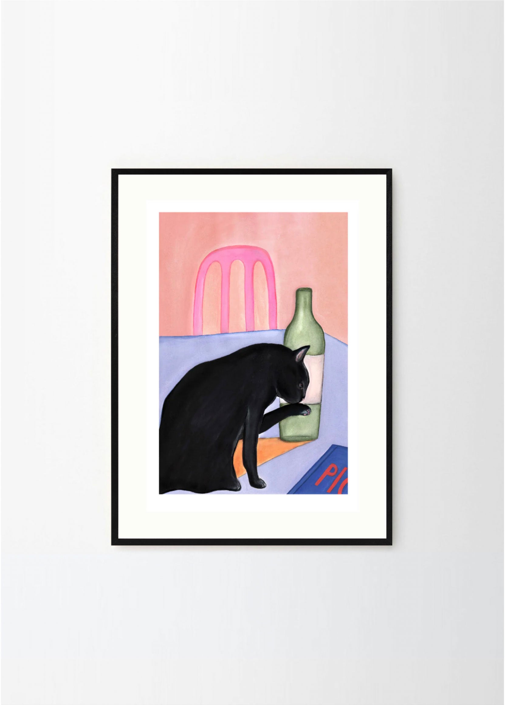 This portrait format poster depicts a colorful illustration of a cat. The colors makes Svart Katt perfect for a pink or pastelle blue frame, with or without a passepartout.