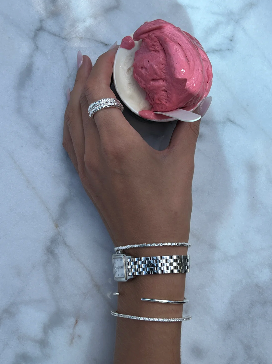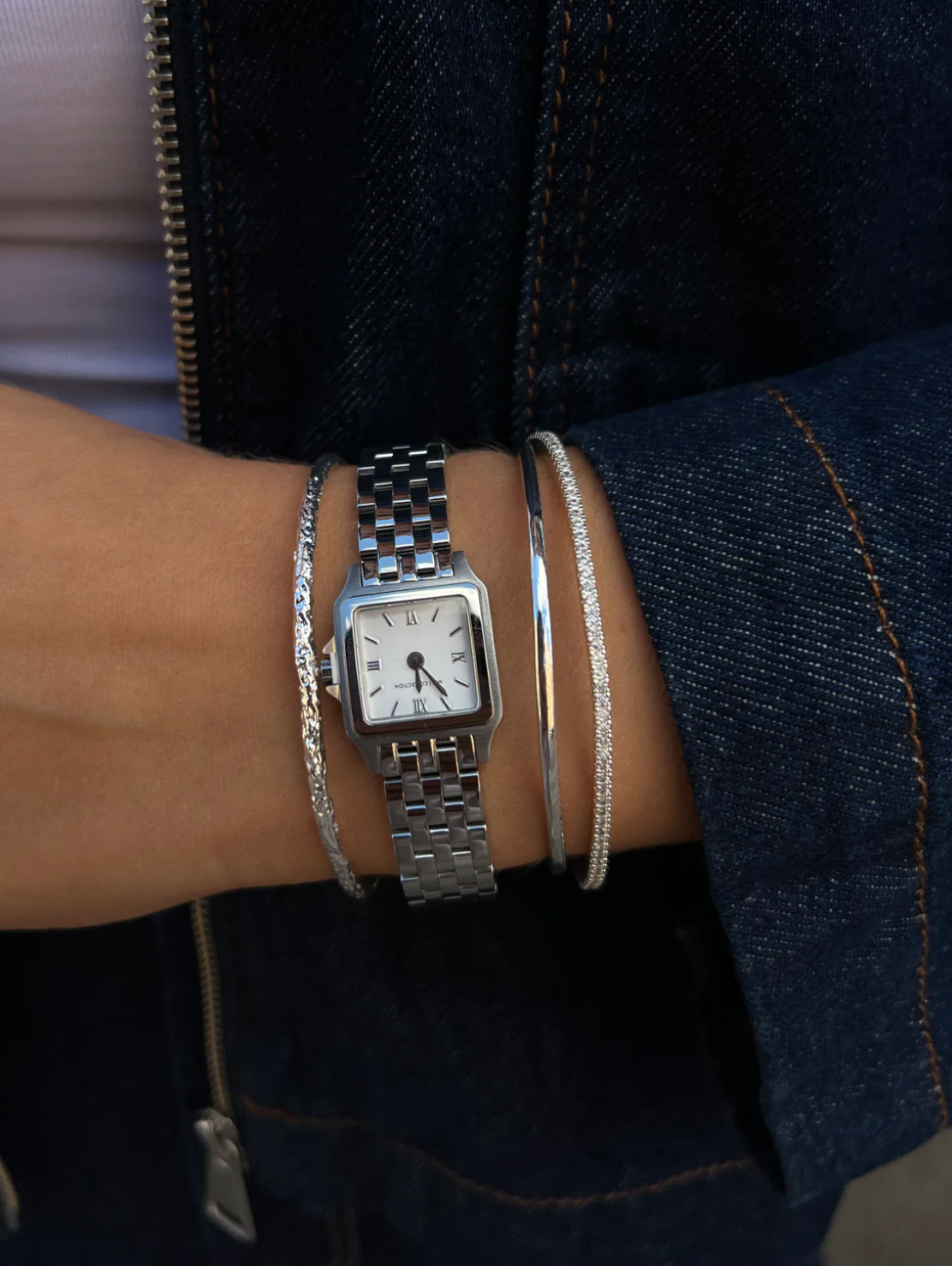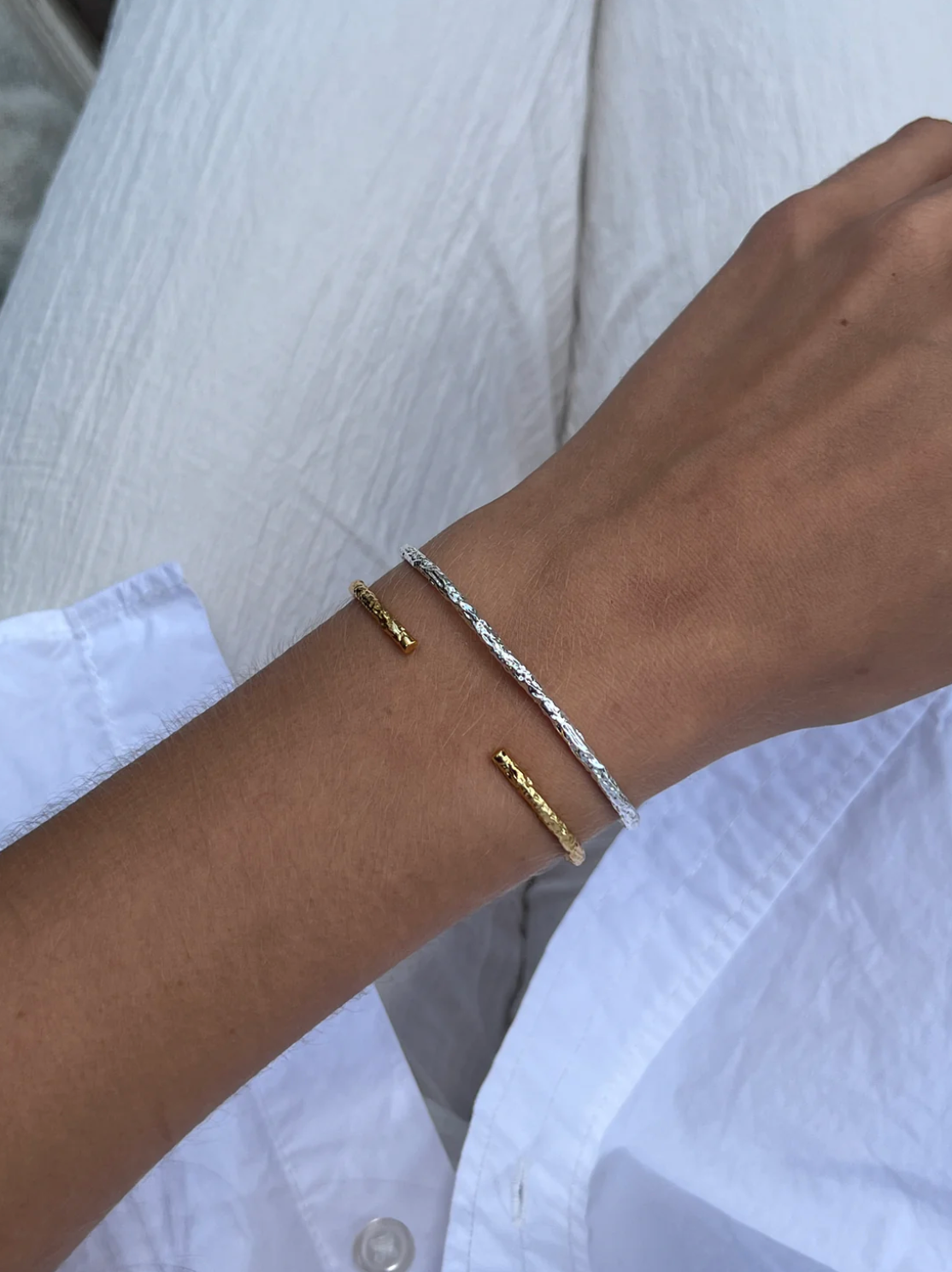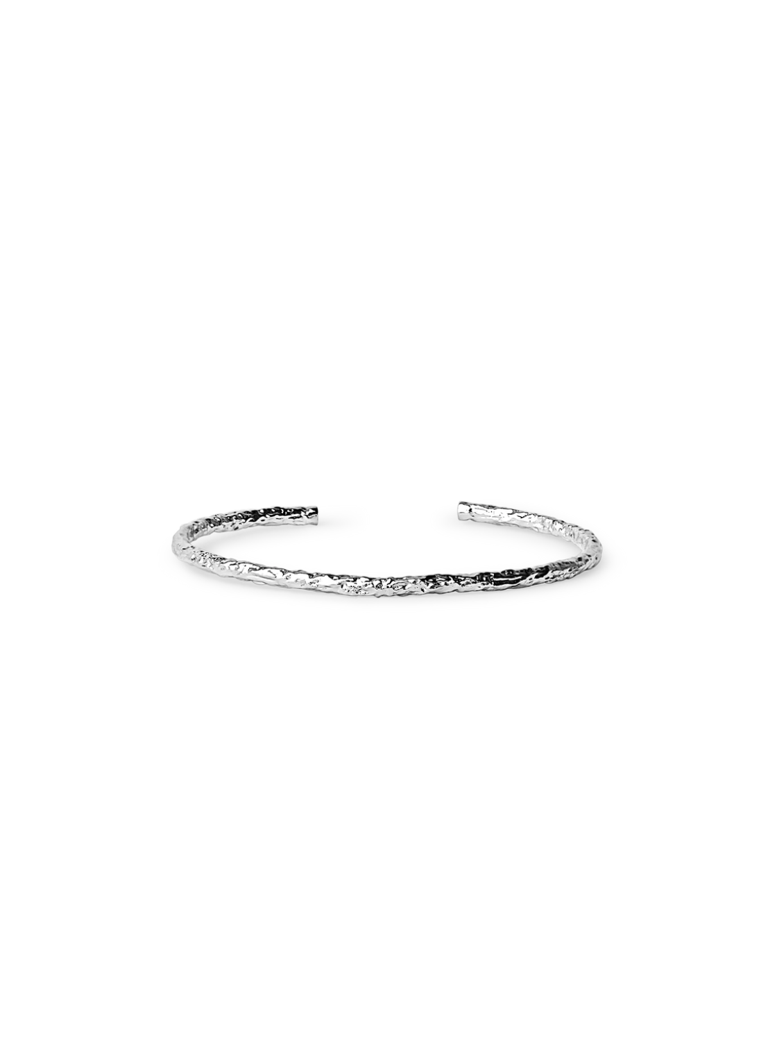Our Textured Bangle Bracelet Silver is made of 925 silver plated brass and has a width of 2mm and is also available in gold.