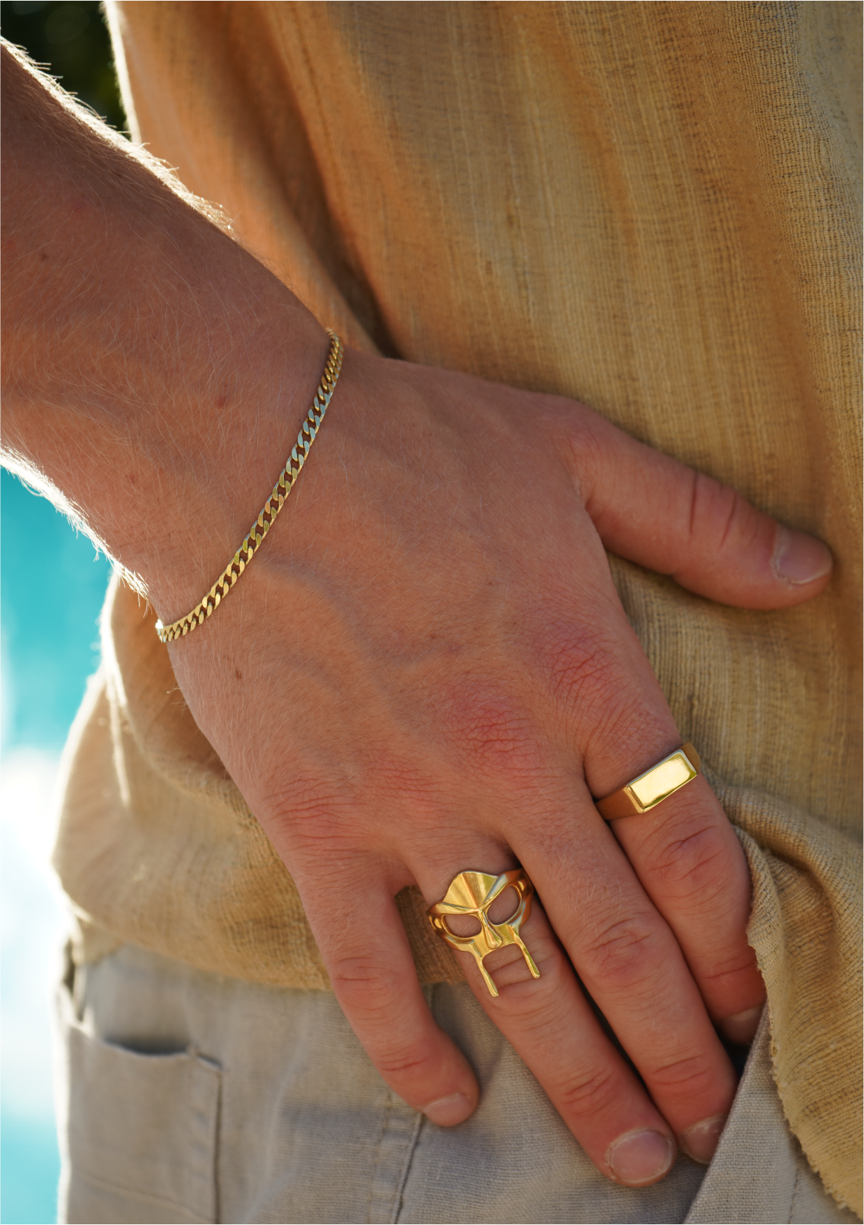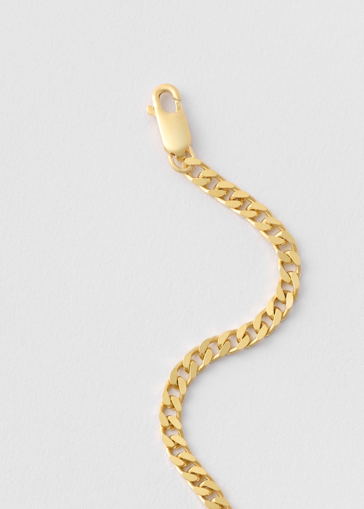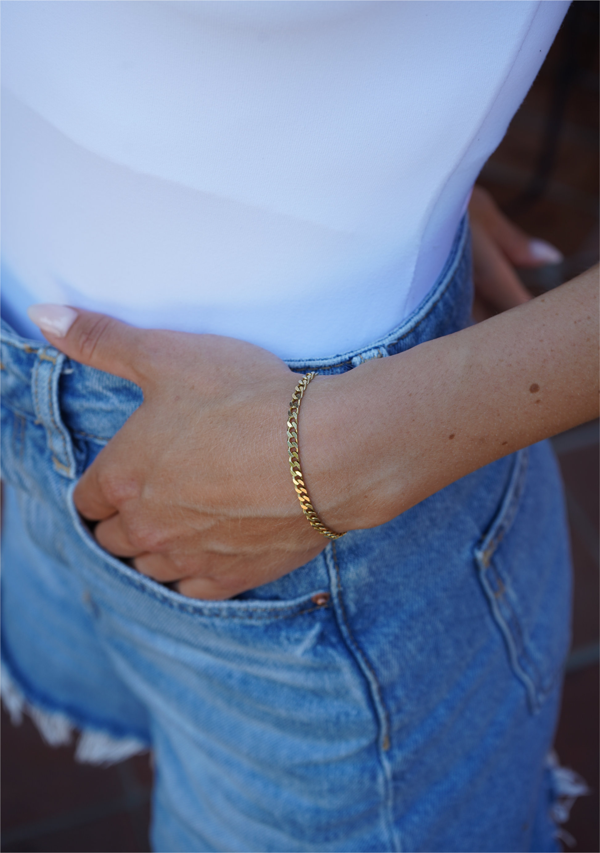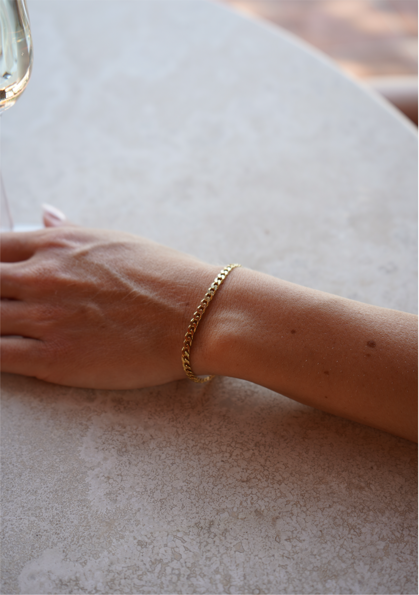 The bracelet is made of 18k gold plated 925 sterling silver and measures 3mm in width.