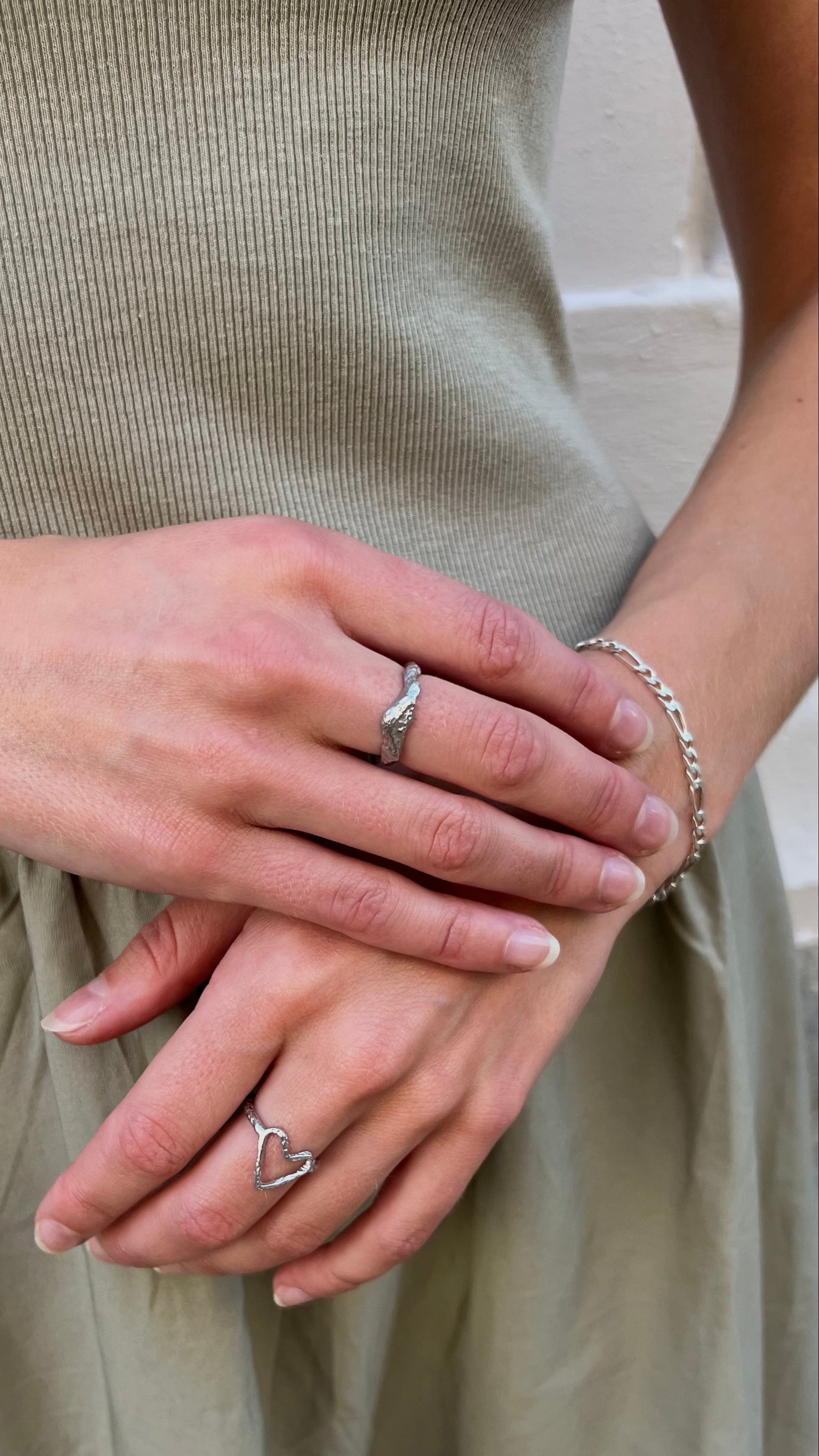 Our Thin Irregular Ring is made in sterling silver. This beautiful and water resistant silver ring is adjustable and therefore one size.