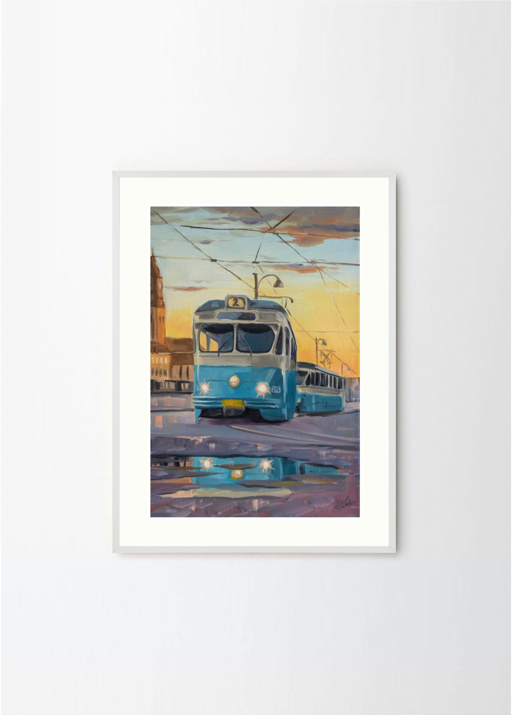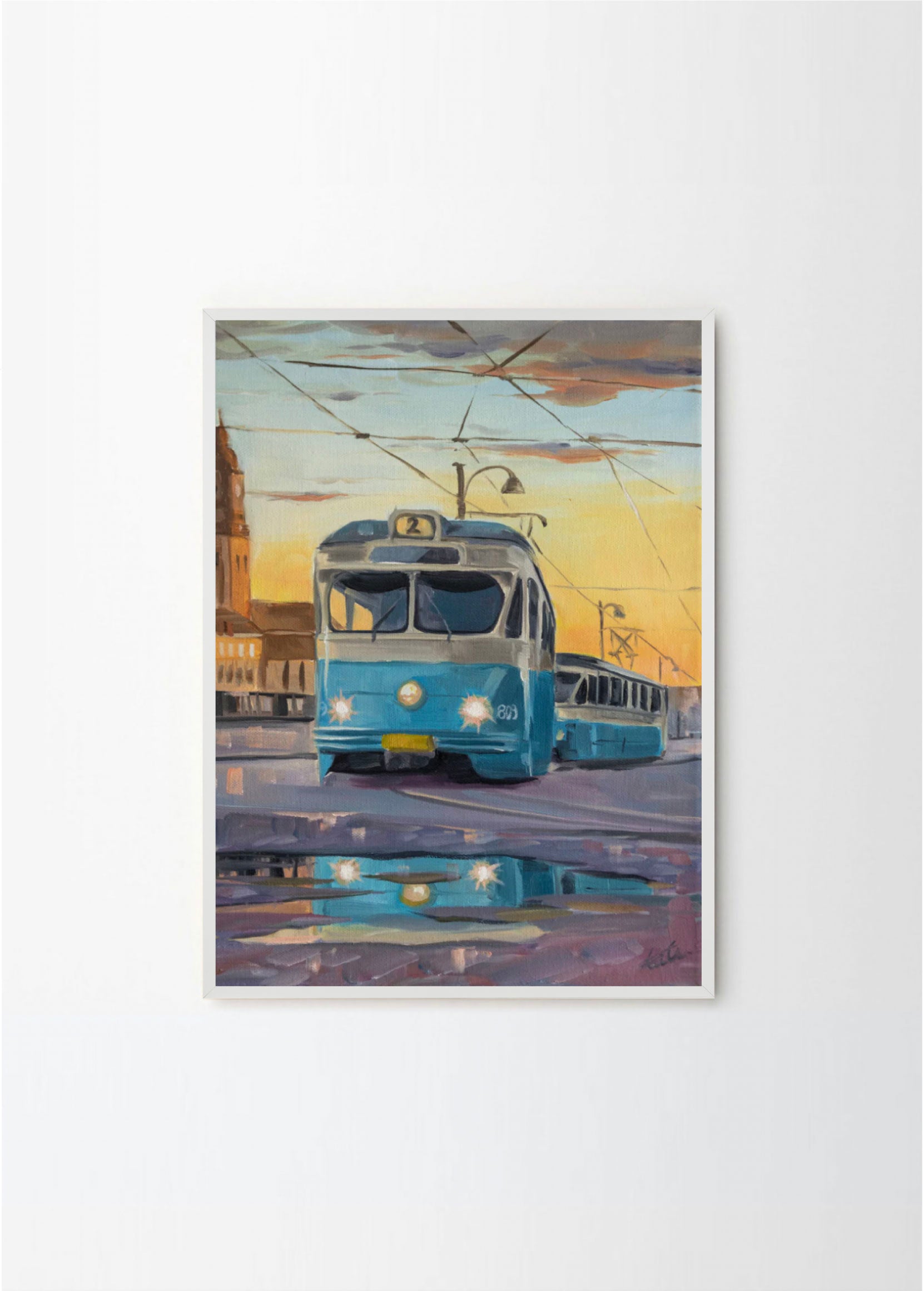 Originally an oil painting, this artwork depicts the old tram comming out from Brunnsparken in Gothenburg.. The blue, grey and yellow colors makes it perfect for a walnut frame with or without a passepartout.