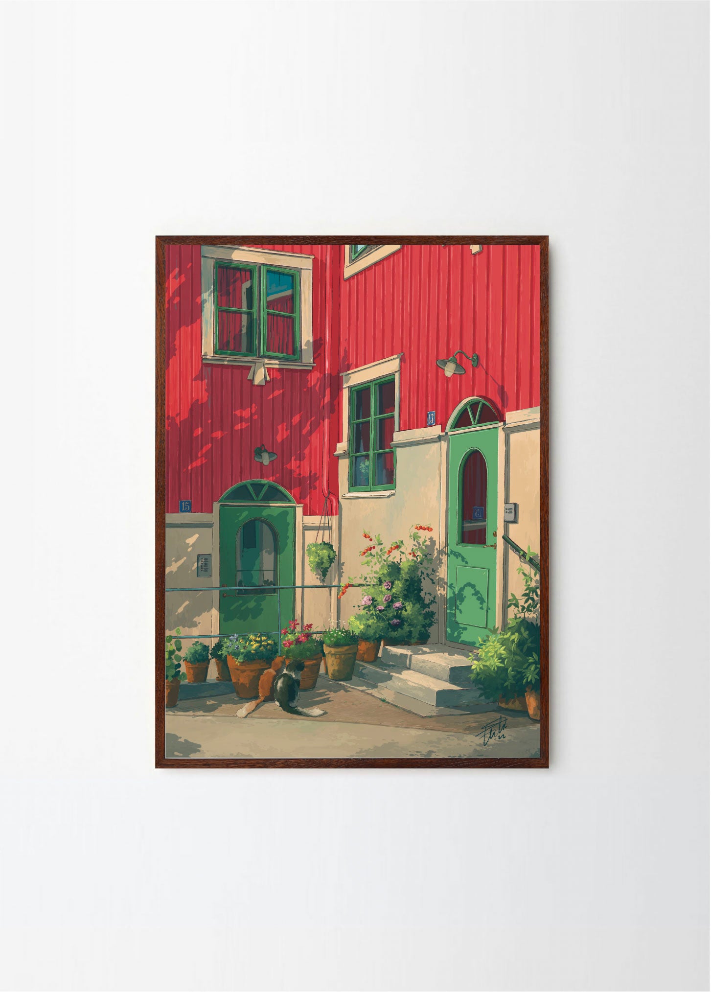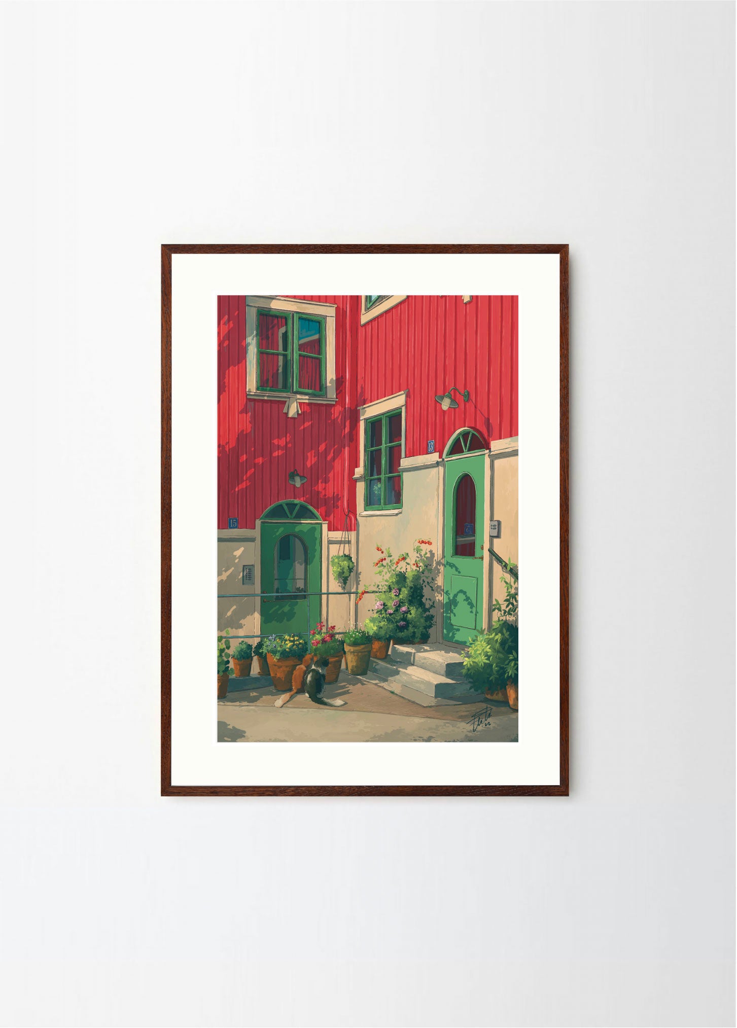 This artwork depicts two kittens on a traditional patio in the lovely old residential areas is Majorna, Gothenburg. The green, red and white colors makes it perfect for a walnut, white, green or red frame with or without a passepartout.