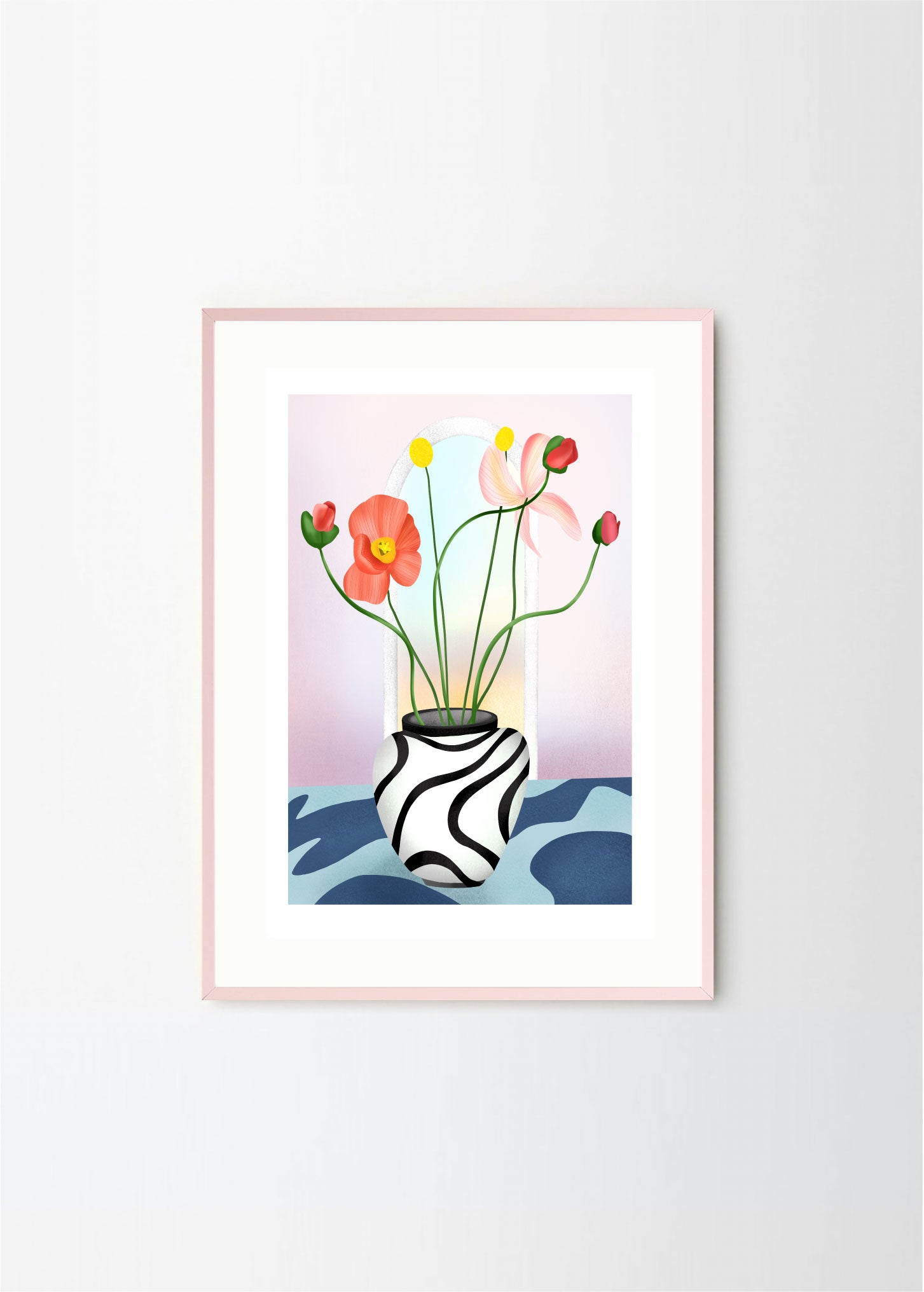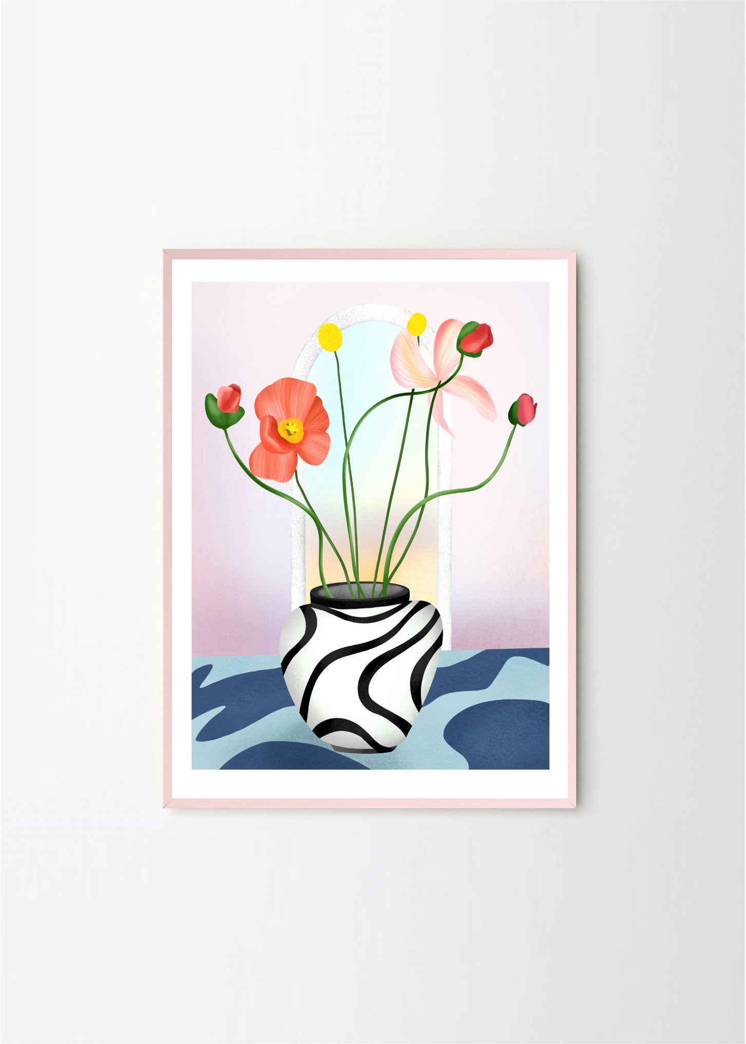 This portrait format poster depicts a colorful flower vase. The blue pink and red colors makes Vårljuset perfect for a pastelle pink or pastelle blue frame, with or without a passepartout.