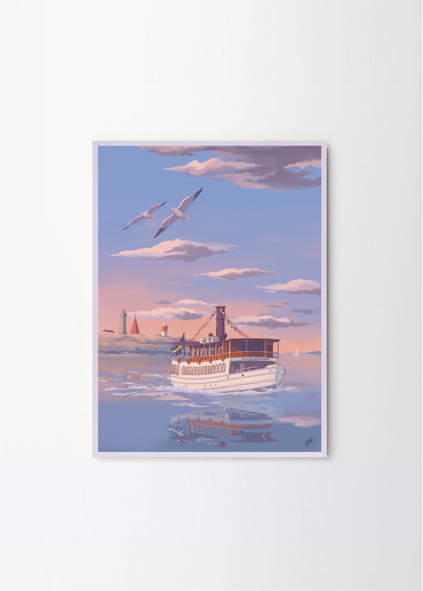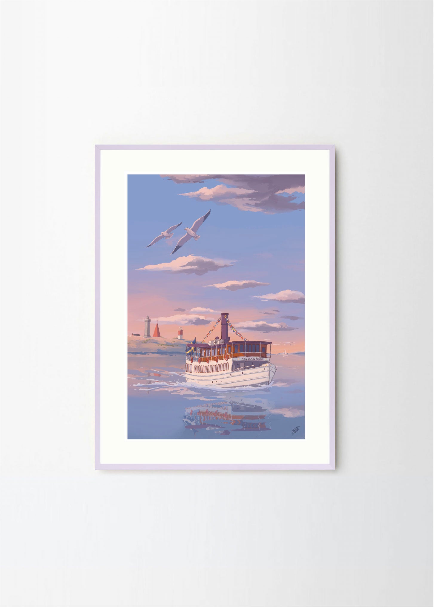 This artwork depicts a ferry on it's way to Gothenburg Archipellagios most famous and western little island called Vinga. The blue and pink colors makes it perfect for a walnut, blue, pink or black frame with or without a passepartout.