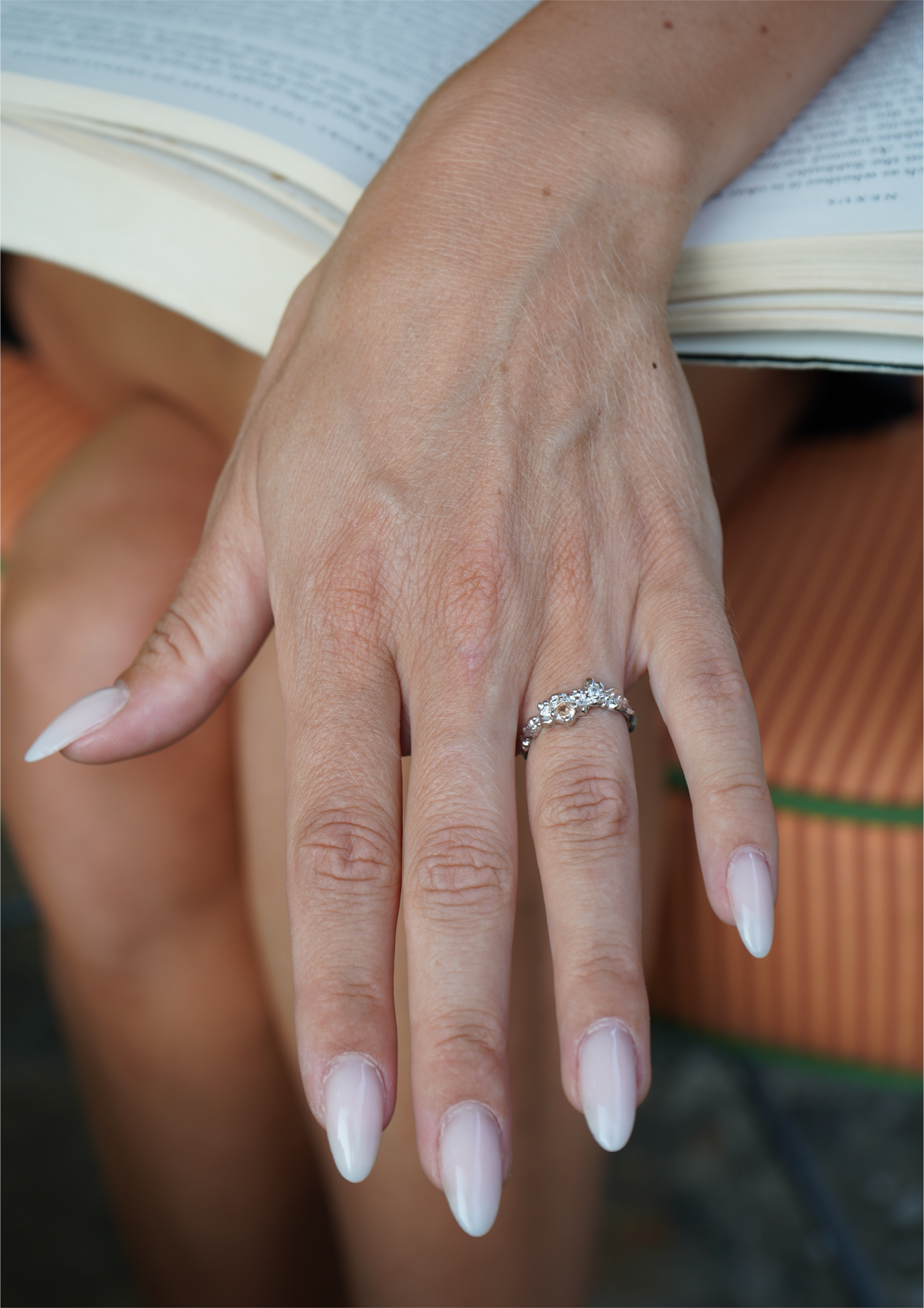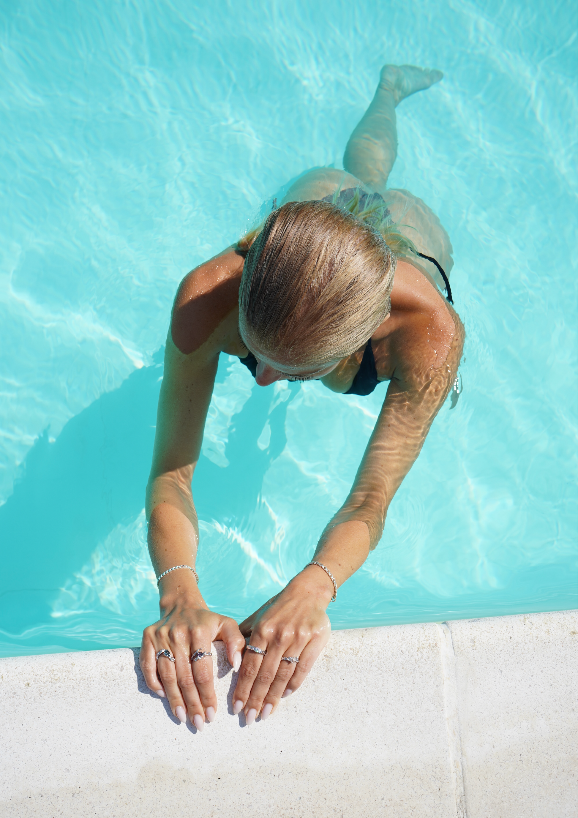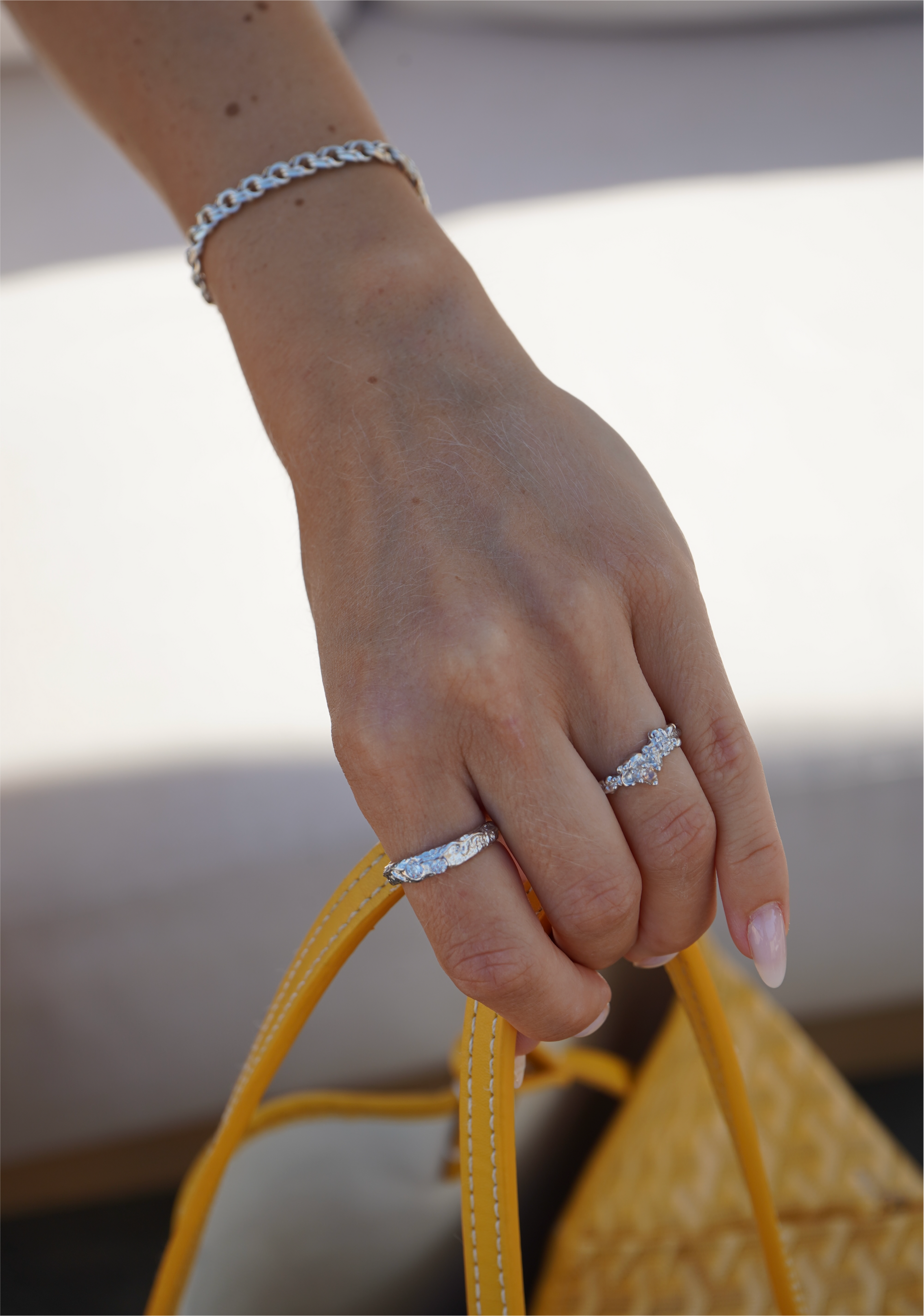 Our Warped Champagne Ring Silver is made in sterling silver. This beautiful and water resistant silver ring is adjustable and therefore one size.