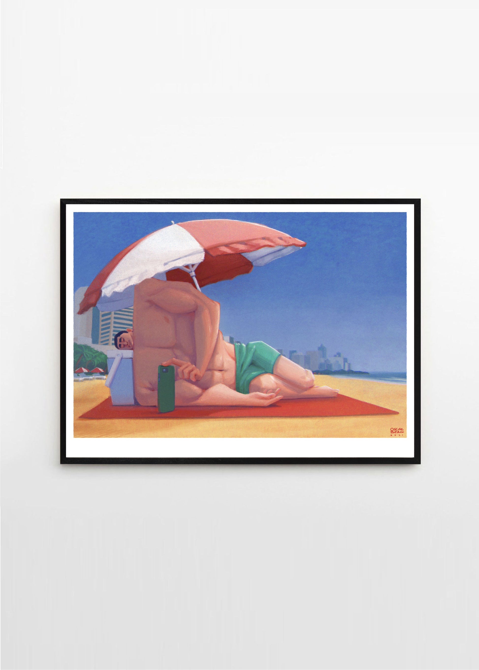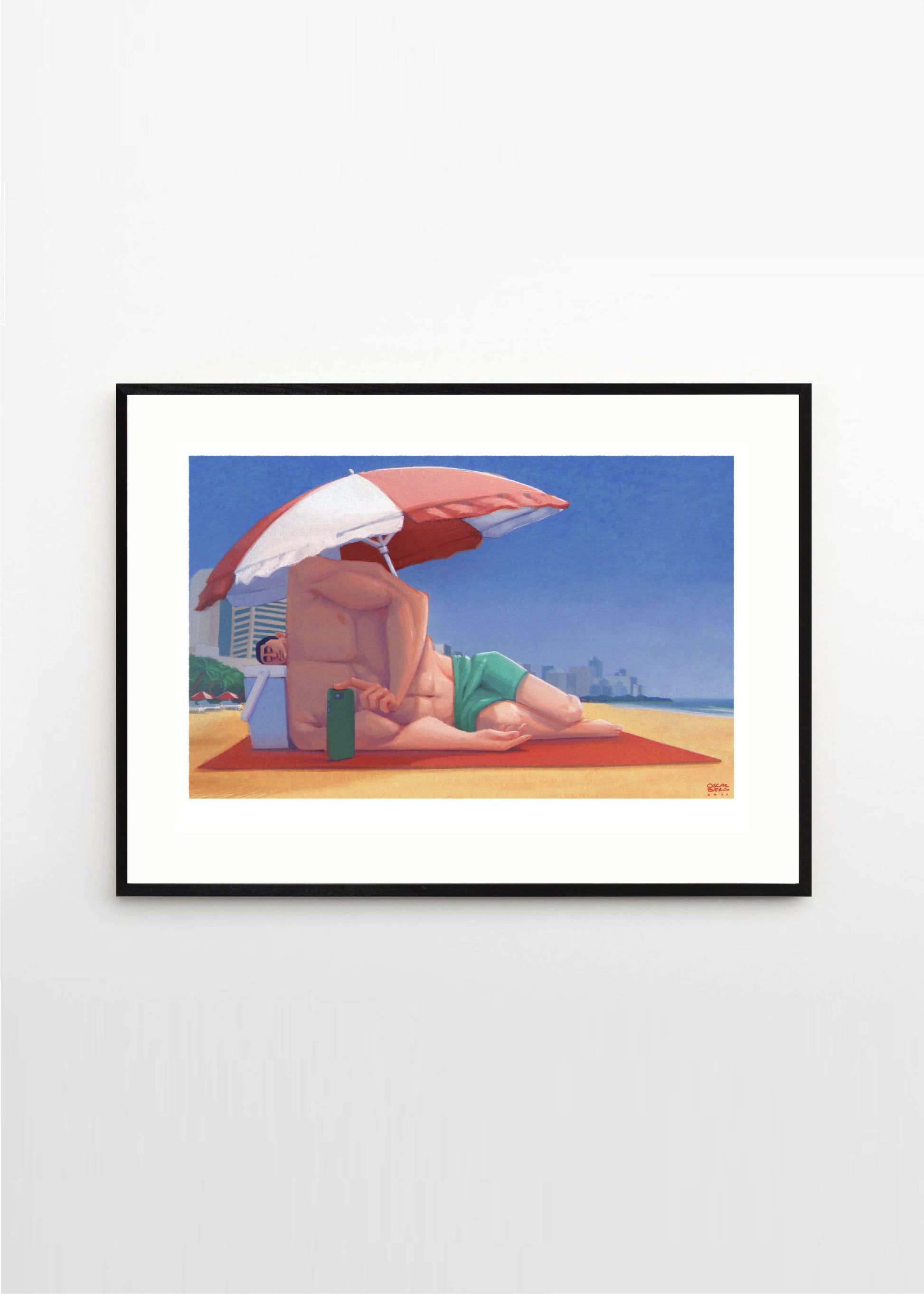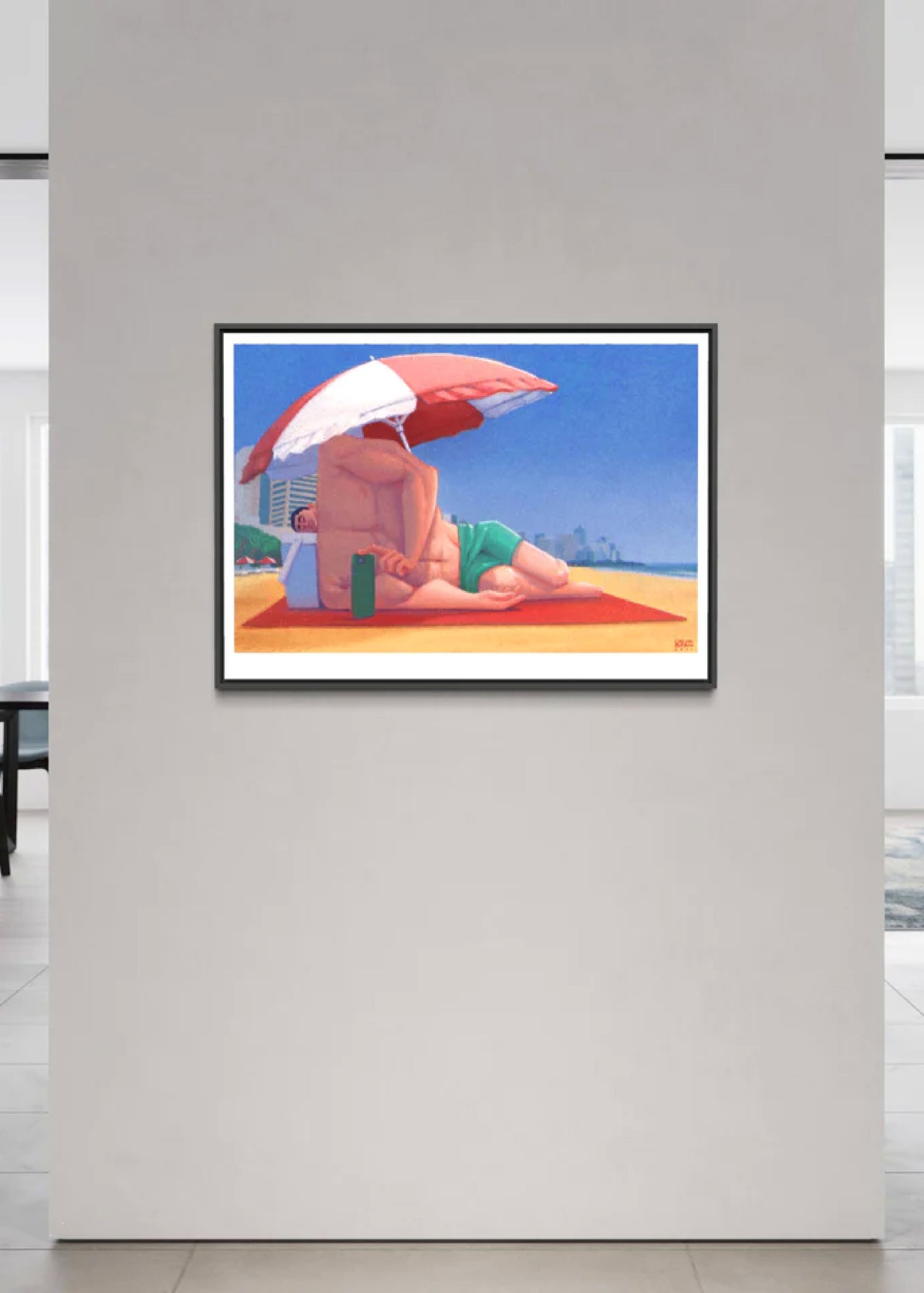 The landscape artwork Wide Screen by Oscar Berg depicts an illustration of a man tanning on his cool-box on Miami beach. The green, red, yellow, blue and white colors makes it perfect for a green, walnut, white or black frame.